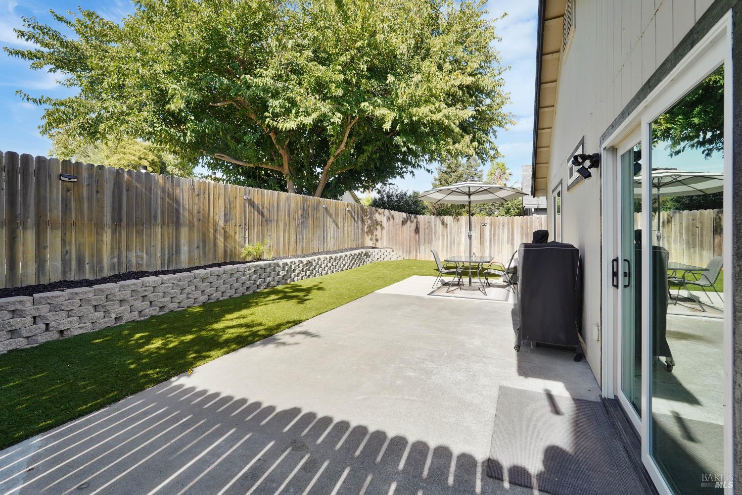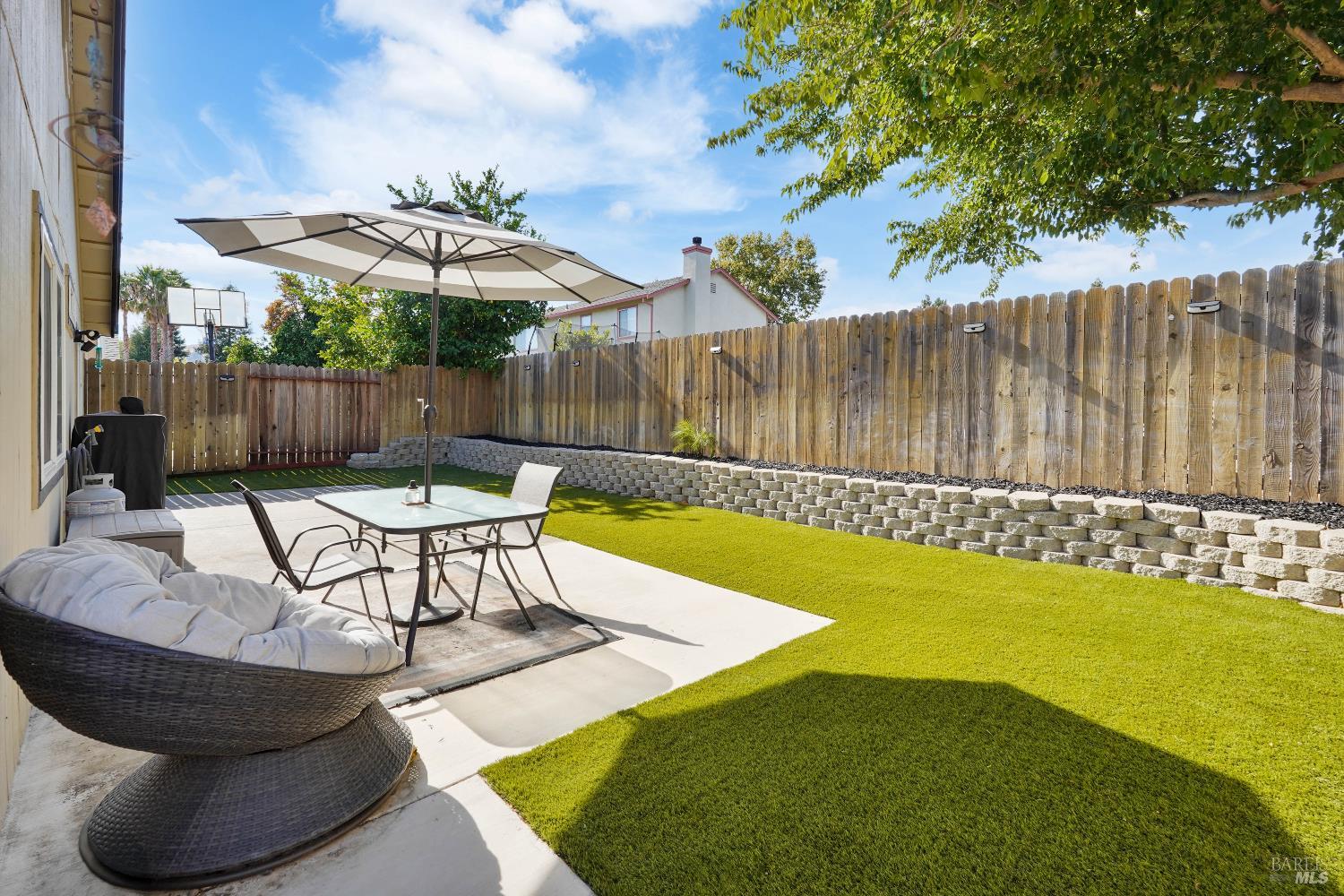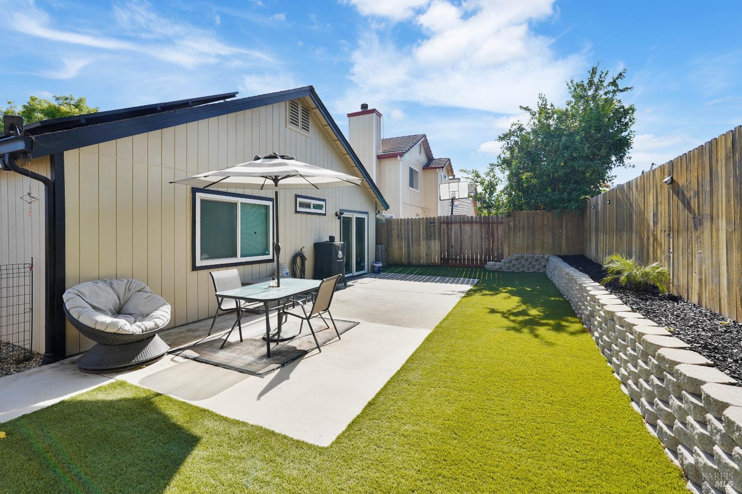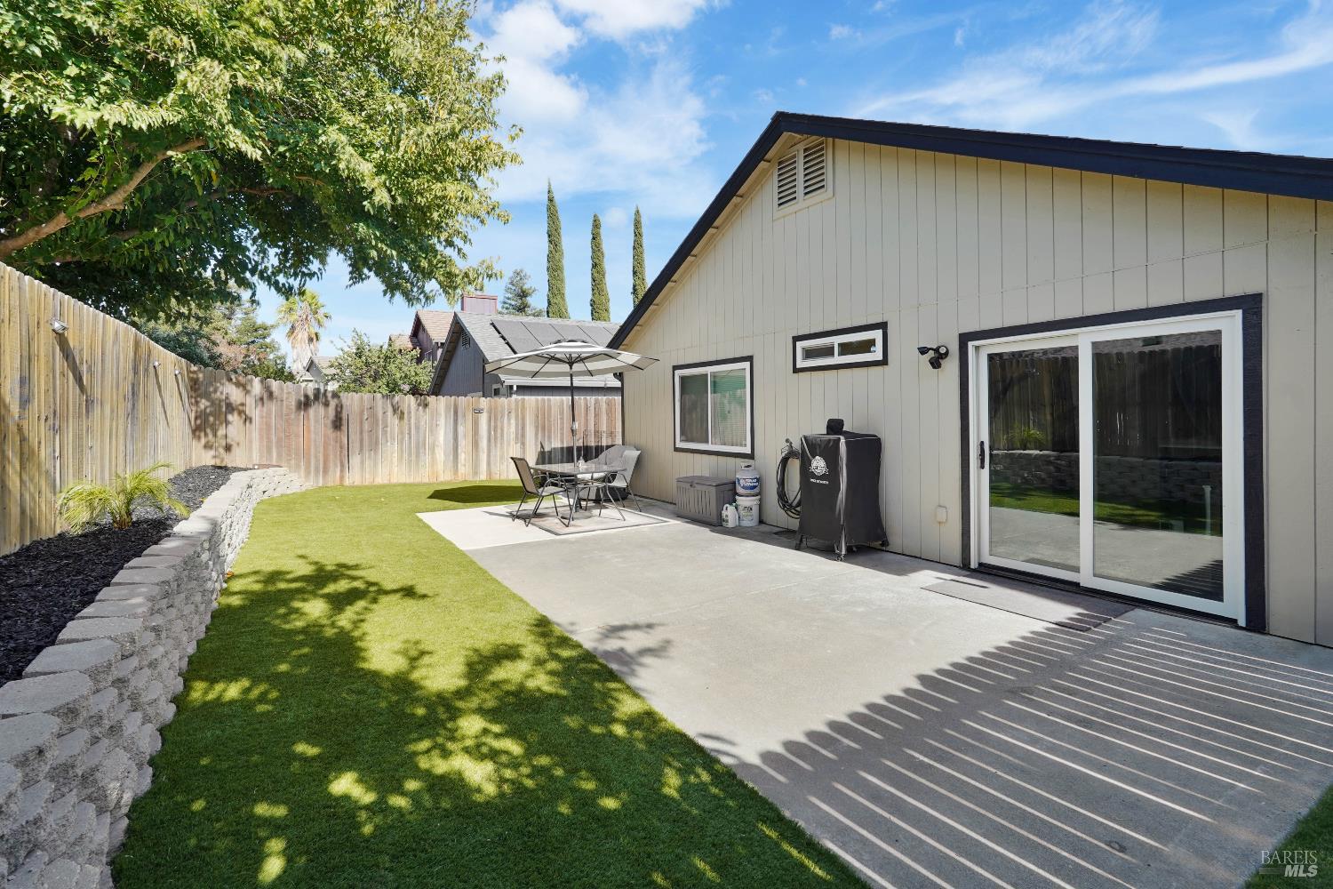 This Foxwood single story blends style, comfort, and smart efficiency. Inside, the kitchen shines with black stainless steel appliances while fresh ceiling fans, a whole house fan, and a brand new electric furnace and A/C system keep the space feeling just right. The primary suite has its own added vent for perfect airflow, and the new smart thermostat makes control effortless. Efficiency is the star here with 32 solar panels that keep the PG&E bill usually under ten dollars. A brand new water heater with warranty adds peace of mind, and every detail has been updated so you can move right in and start enjoying. Out back, the turf and extended concrete create a space made for summer BBQs, weekend projects, or just kicking back with friends. There's boat parking, a welcoming front porch, and side yard access for extra convenience. Set in a quiet neighborhood within Travis Unified School District, close to parks and schools, this home makes daily life easy and the weekends even better.