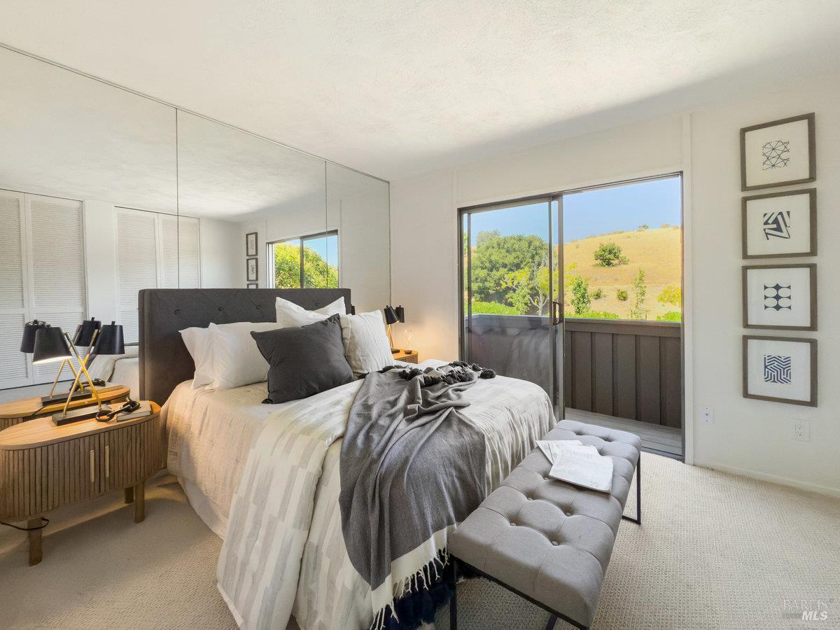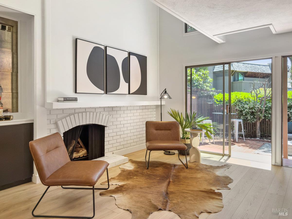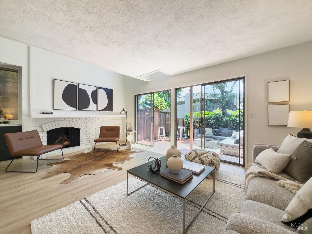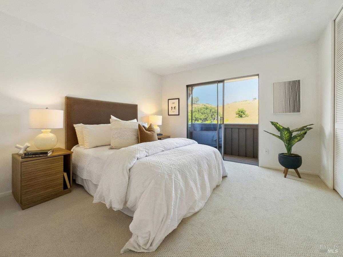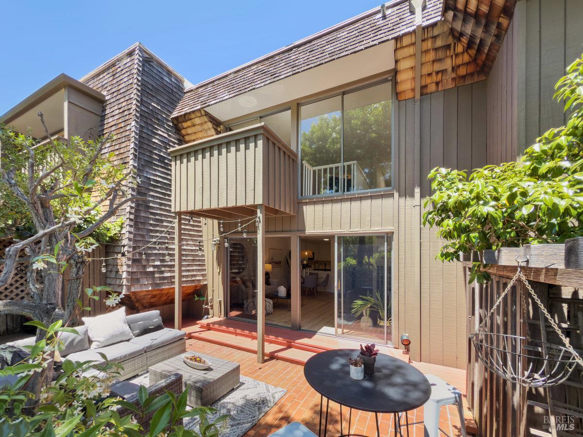 This sunlit townhouse offers resort-style living surrounded by open space and nature, creating a calm, low-key vibe that feels more like a peaceful getaway than an everyday home. A formal entry leads upstairs to the main living level, featuring a cozy fireplace and a kitchen with brand-new stainless steel appliances, plenty of storage, and an open flow to the dining and living areas. The living room features soaring ceilings and sliding glass doors that open to a private brick patio with gated access to a beautifully landscaped path leading directly to the pool and clubhouse. Also on this floor is a full bath and a flexible bedroom with a private balcony facing China Camp open spaceperfect as a guest room, home office, or gym. Upstairs, you'll find another bedroom with its own balcony, a full bath, and a spacious lofted primary suite with a large bathroom, generous closet space, and a third balcony overlooking the grounds. A two-car tandem garage with laundry and extra storage completes the home, along with guest parking and easy street parking nearby. Close to Andy's Market, Peacock Gap Golf Course, McNear's Beach, and miles of trails at China Camp - true indoor-outdoor Marin living!