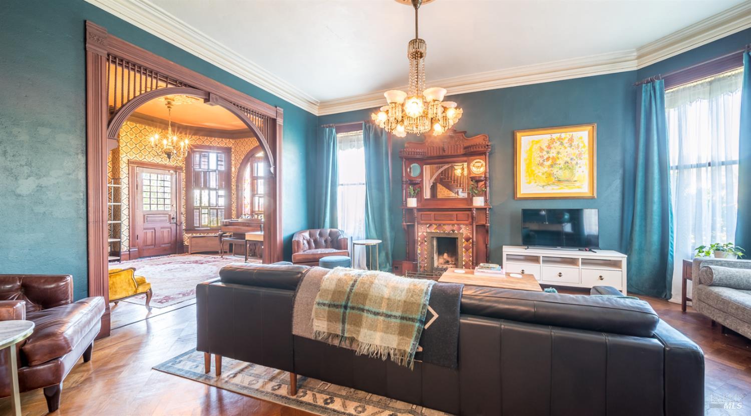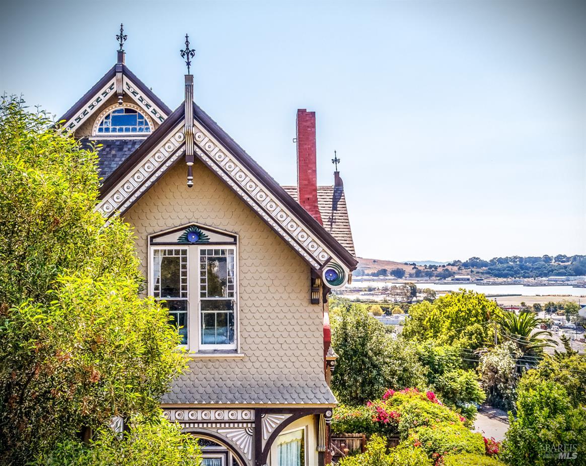 The Commodore Potts home, a two-story Queen Anne with Eastlake ornamentation, is Vallejo's shining example of Victorian architecture. With 4 bedrooms, 4 bathrooms, and 4 fireplaces, it features: carved doors with beveled crystal, 5 stained glass windows, 6 original chandeliers, Lincrusta Walton wainscoting, inlaid hardwood floors, and 11-foot ceilings. There is a 2 car garage & a basement for workspace and storage. The home is on the National Register of Historic Places. It is more impressive in person. The design suggests the work of San Francisco architects, the Newsom brothers. The home was built in 1891 for John Wilson, a well-to-do rancher. It is named after Commodore Potts, who bought it in 1908, as his retirement home from Mare Island Navy Base Command. A cement truck driver saved this home from a wrecking ball in 1972. The current owners have done major repairs and upgrades, including remodeling the kitchen and upstairs bath. The home is located in the Vallejo Architectural Heritage District, near the Napa River and the historic downtown. It is walking distance to a dozen restaurants, two pubs, one bar, and three coffee shops. Get ready to be impressed. It is rare to find a Victorian home like this. An in-depth history of the home is available on request.