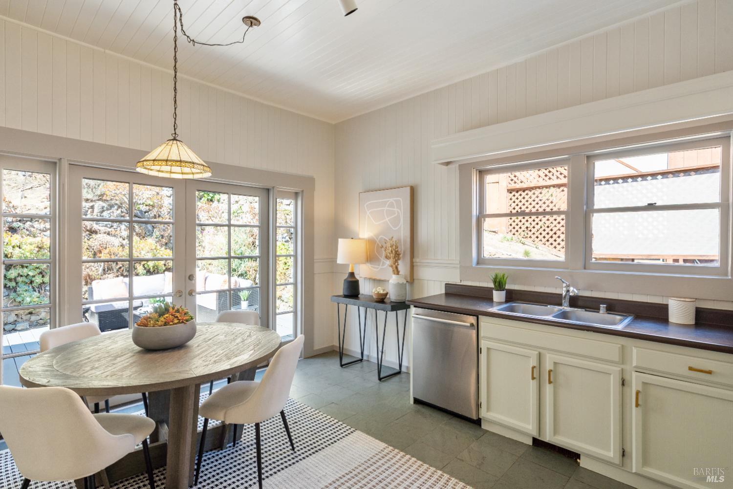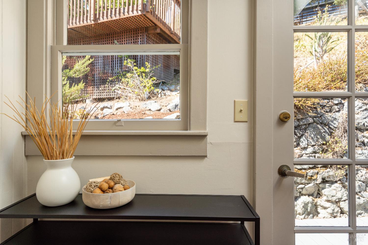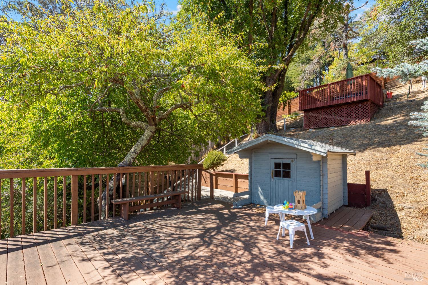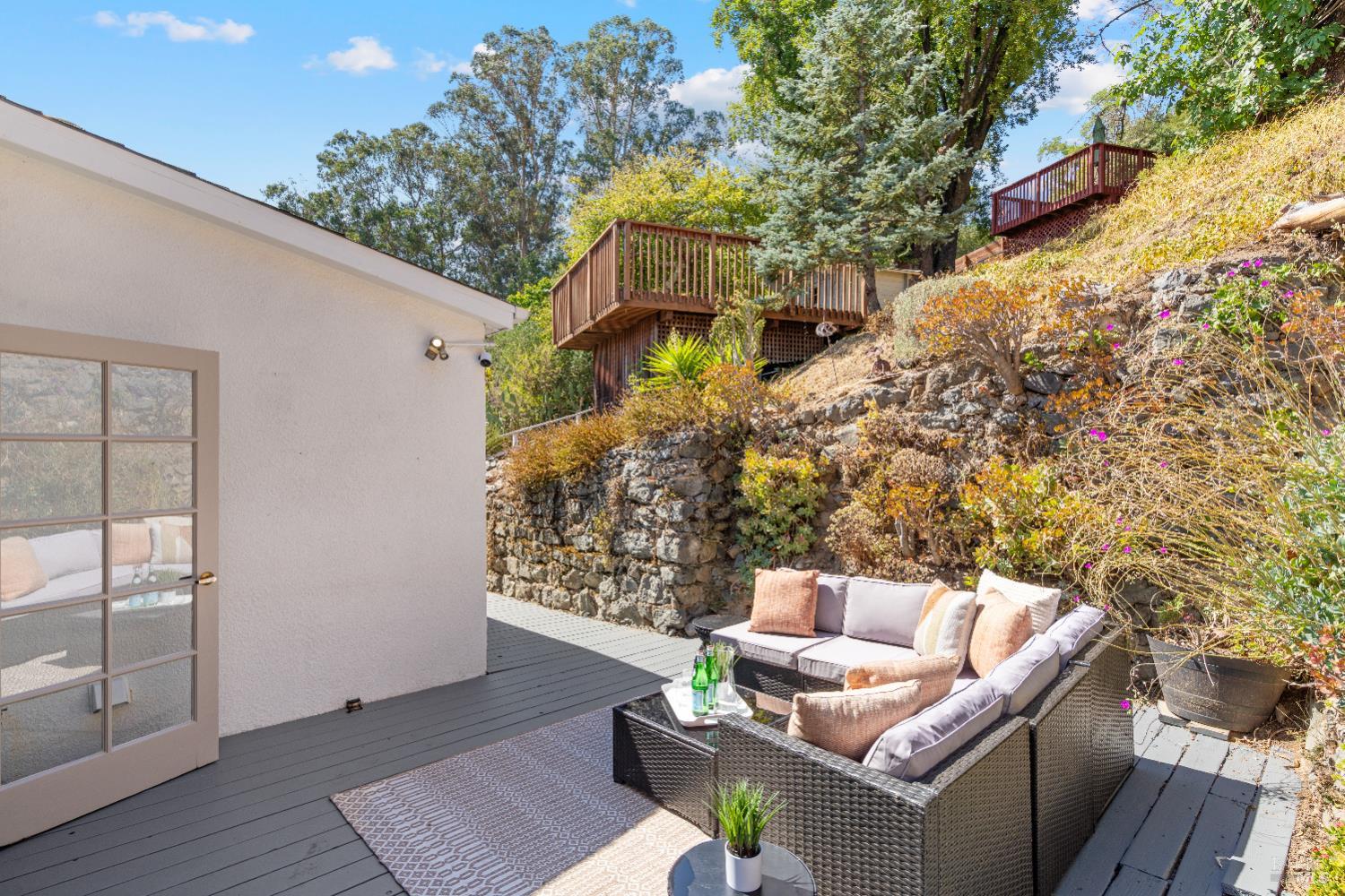 Designed in a classic shotgun-style, this circa 1920s home features high ceilings, timeless moldings, and some vintage light fixtures that highlight its enduring charm. With its southeast-facing front porch, the interiors are filled with natural light, enhancing the cozy living room with a welcoming fireplace flanked by bookcases. At the heart of the home, a spacious country kitchen opens directly to an inviting patio-deck perfect for gatherings and everyday enjoyment. 3 bedrooms, 1 full bathroom, and a laundry area complete the floor plan, while modern amenities like air conditioning, a newer furnace and ducting, and the modern-function gas fireplace add year-round comfort. Outdoors, the sunny upslope lot reveals two redwood view decks: first with a playhouse, and the upper one features a hot tub for relaxation under the stars. A 2-car garage provides ample space for storage or workshop, and the large lot invites gardening possibilities. Live in it as it is, or update to your liking.