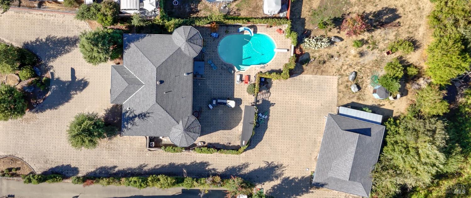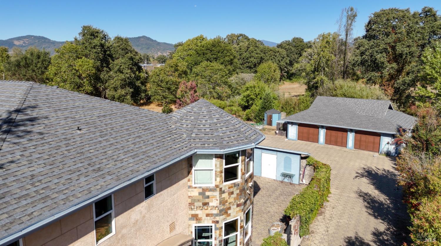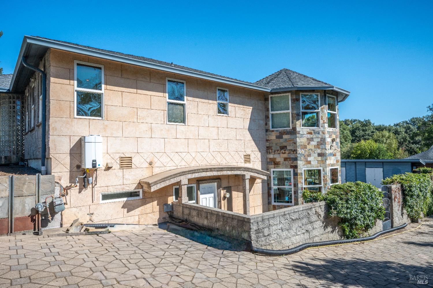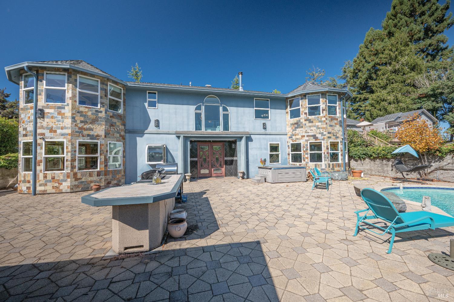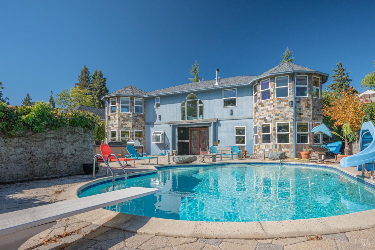 This distinctive luxury estate blends modern design with European chateau elegance, featuring twin turreted wings that give the home a castle-inspired presence. Spanning 3 parcels and over 2 acres, the property offers resort-style living with a salt water pool, hot tub, outdoor BBQ, and pizza oven. The large 3-car and RV/toy detached garages provide ample storage. Expansive paver driveways and open half-acre garden space add both beauty and function. Inside, a gourmet chef's kitchen with high-end appliances, a grand staircase, and formal office with pool views. The Home theater and pool table set the stage for fine living. This master suite boasts great natural lighting, enormous walk-in closet, and an oversized jetted tub. Stucco and stone exteriors, new LVP flooring throughout, 2 fireplaces, and an on-demand hot water enhance the comfort and style. Riparian water rights, a full backup generator, and Honeywell security system ensure peace of mind. With commercial zoning allowing mixed-use possibilities, this one-of-a-kind property offers the perfect balance of elegance, function, and opportunity. Live and work from home in style!