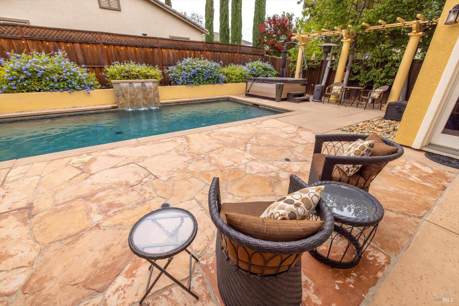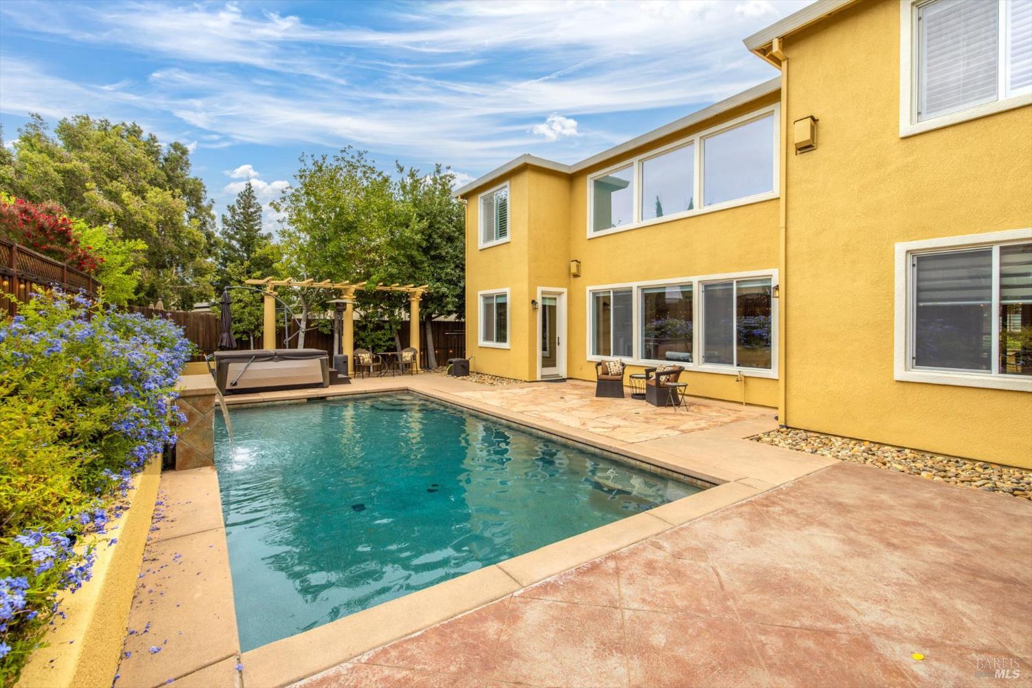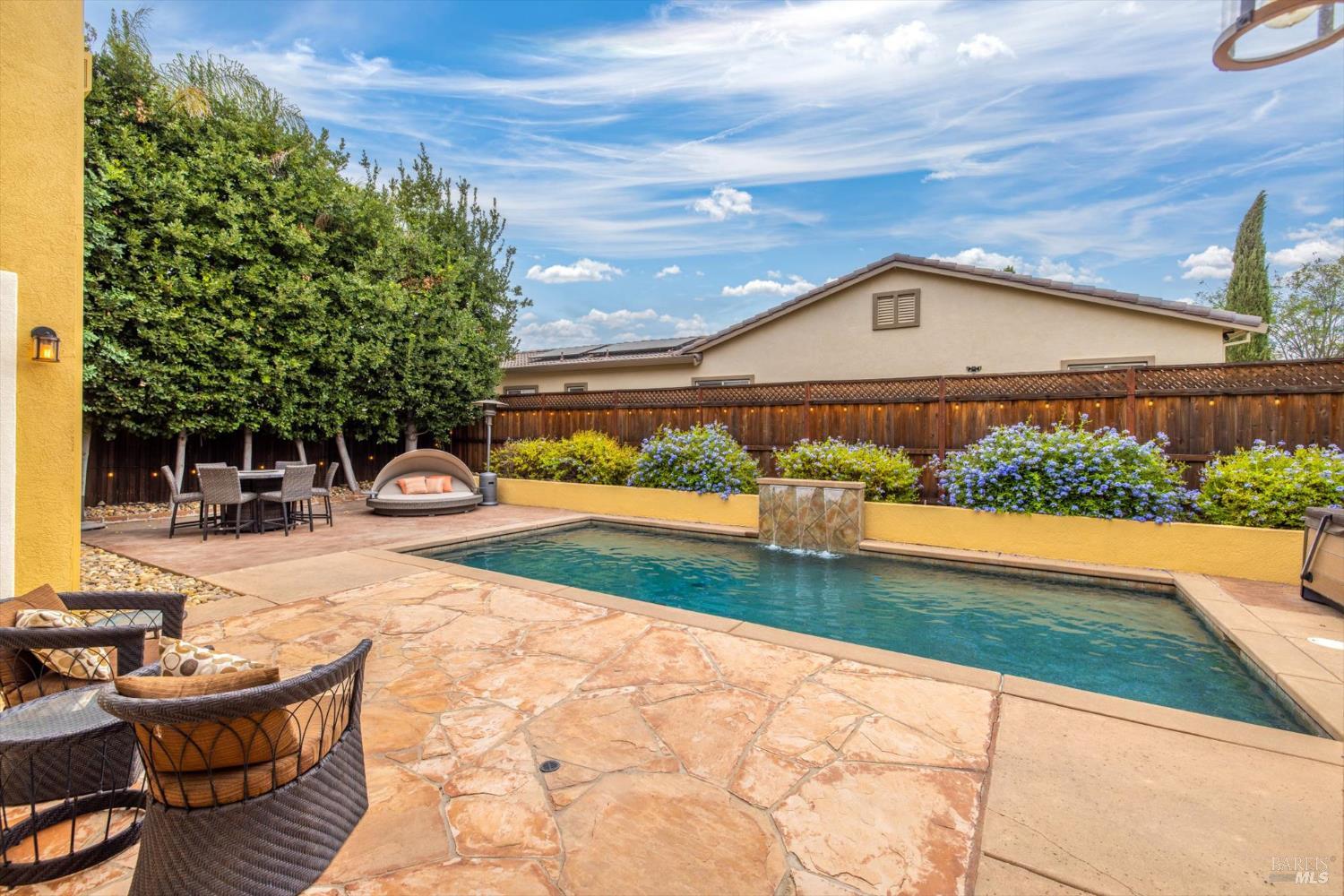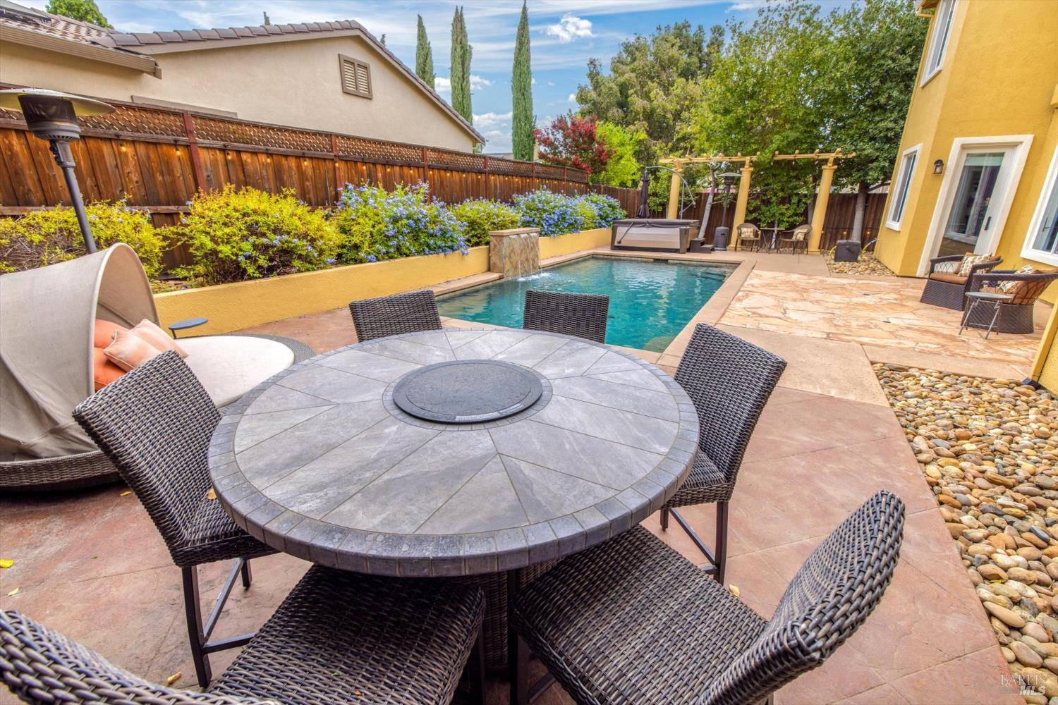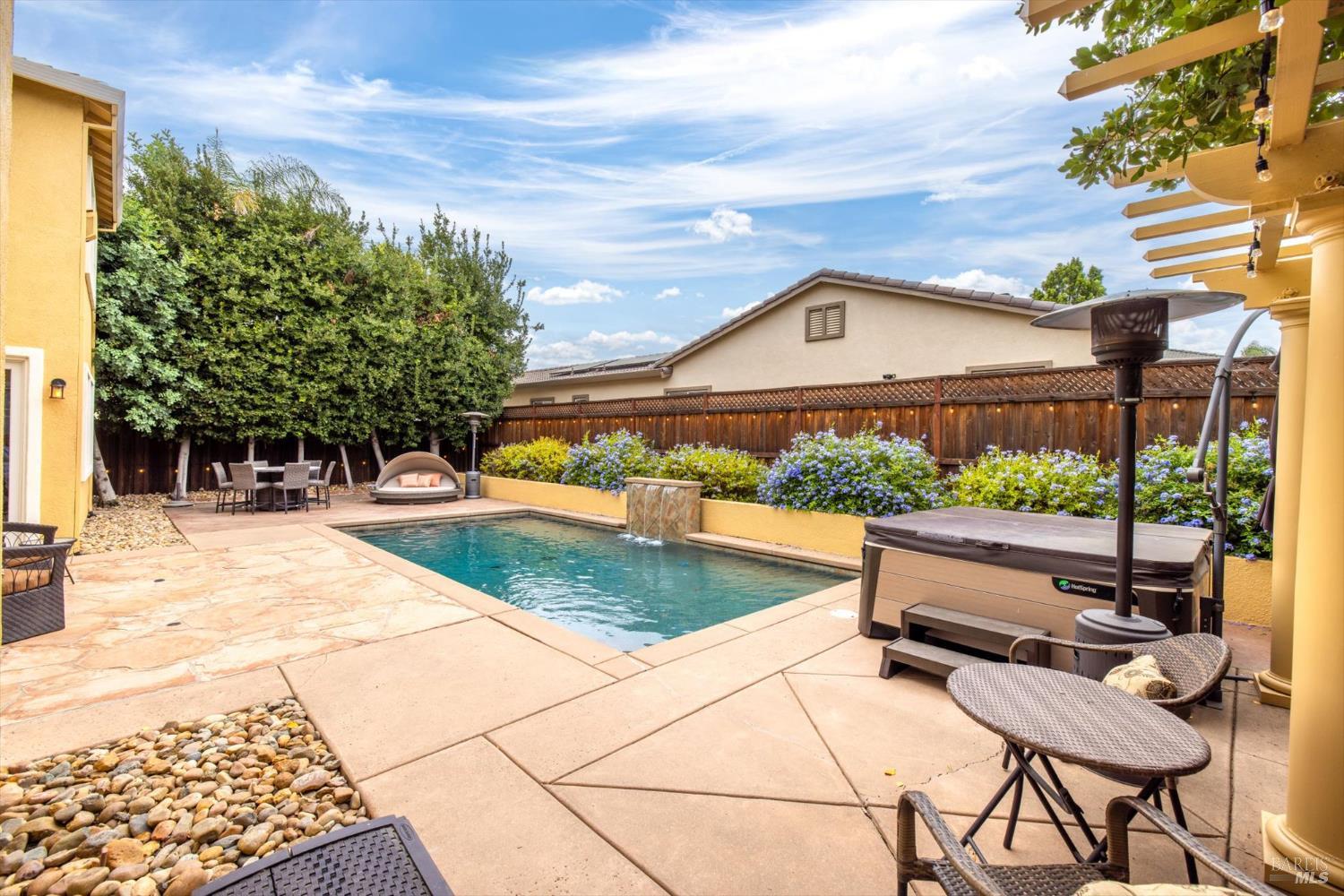 Former model home with style & comfort! Soaring open-beam ceilings, 3 gas fireplaces, and distressed hardwood floors set the tone. Gourmet kitchen with Monogram built-in appliances, beautiful birch cabinets throughout, large island, pantry & breakfast nook with custom built-ins. Downstairs bedroom with French doors to backyard plus den with front patio access. Expansive primary suite with 2 walk-in closets, fireplace & spa-like bath with jetted tub. Custom window coverings throughout. Resort-style backyard with pebble-bottom pool & waterfall, mature trees, pergola with lights, and low-maintenance landscaping. Dual-zone AC, organized closets, and thoughtful details throughout, plus a custom covered dog run on the side of the home complete this one-of-a-kind Vacaville gem!