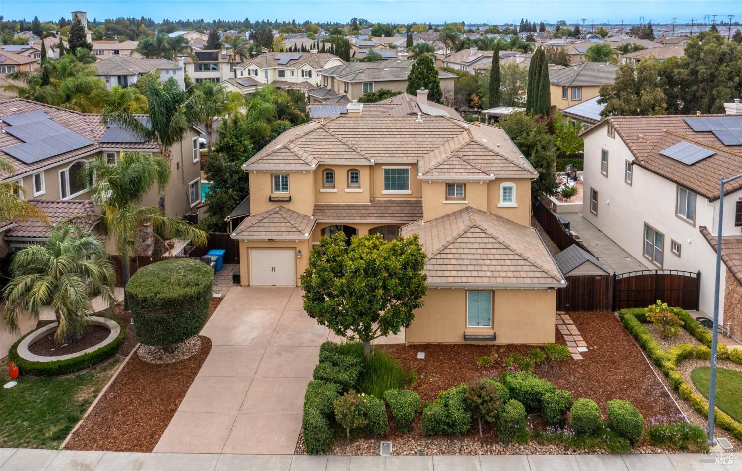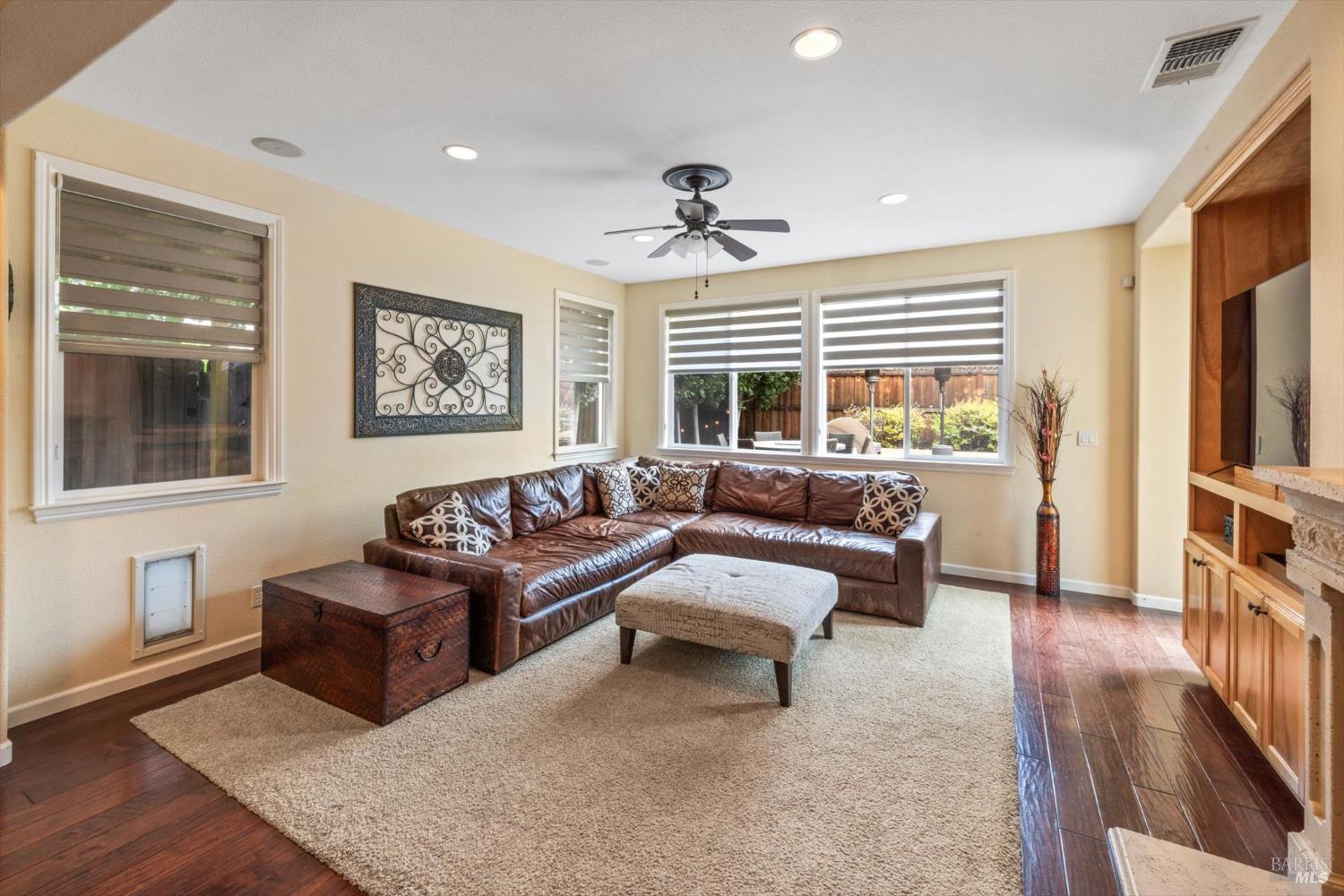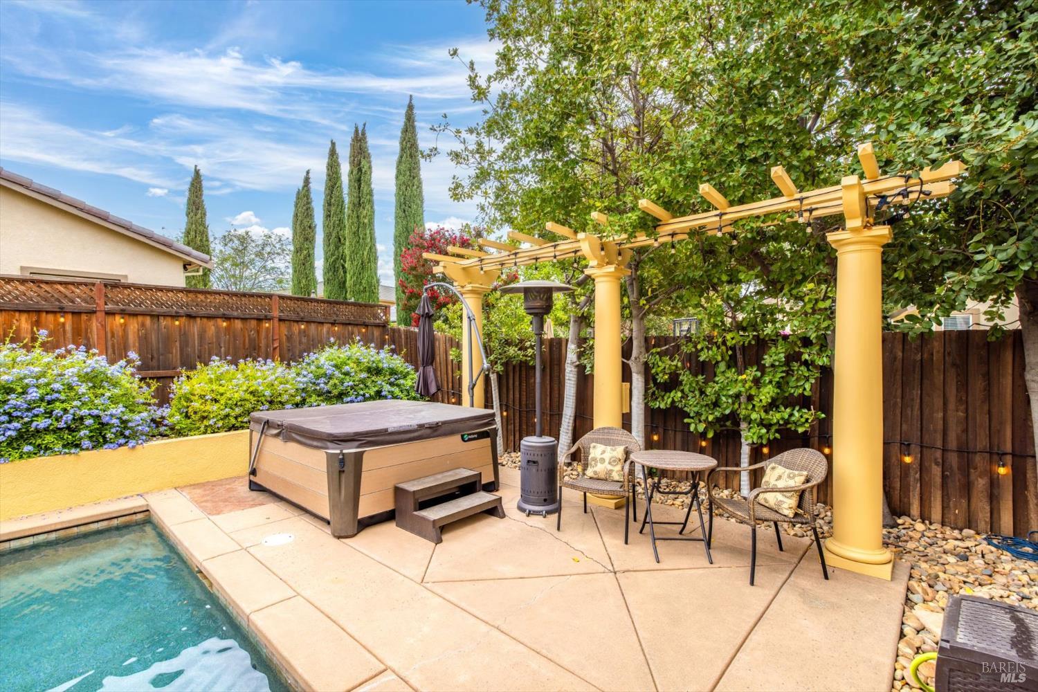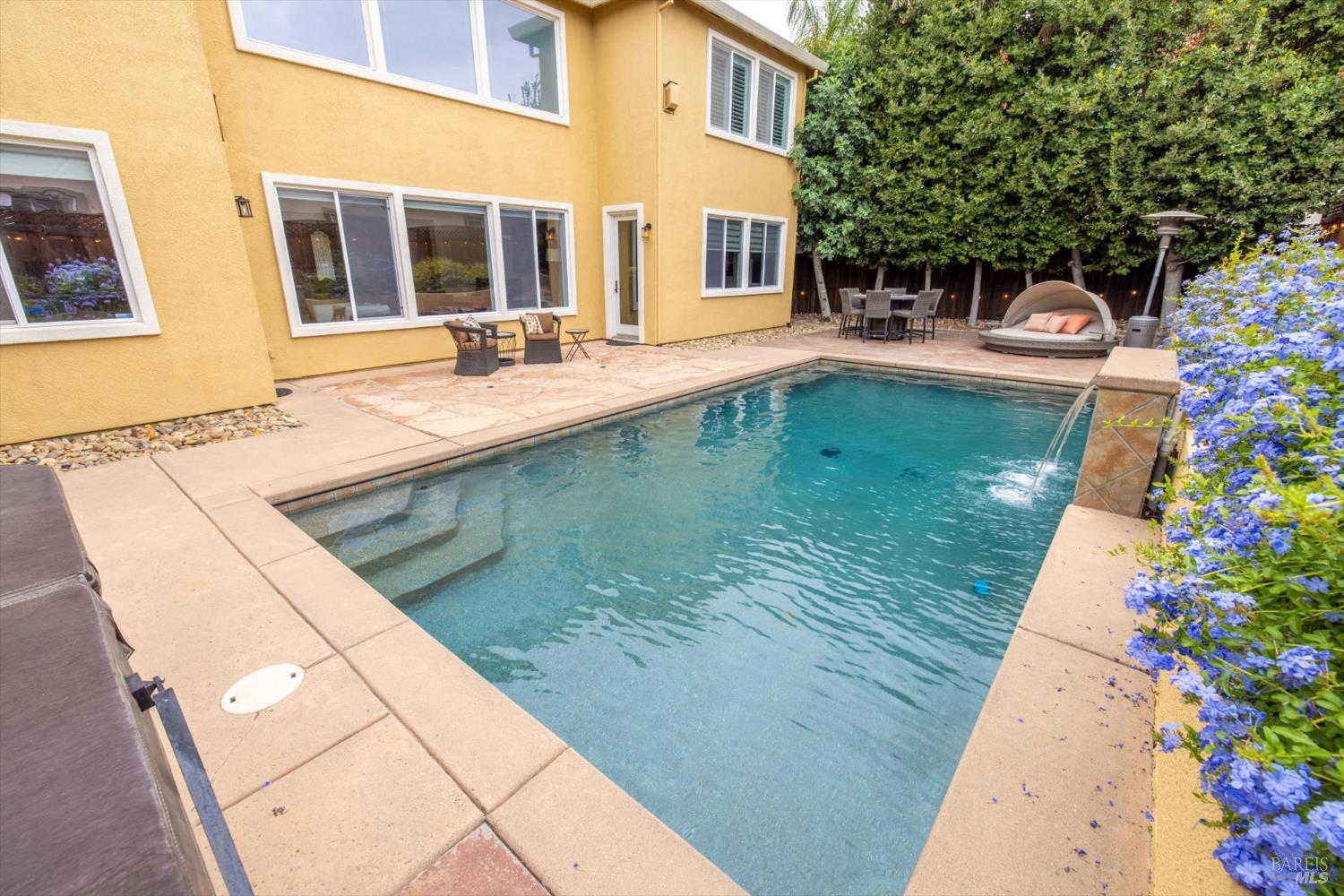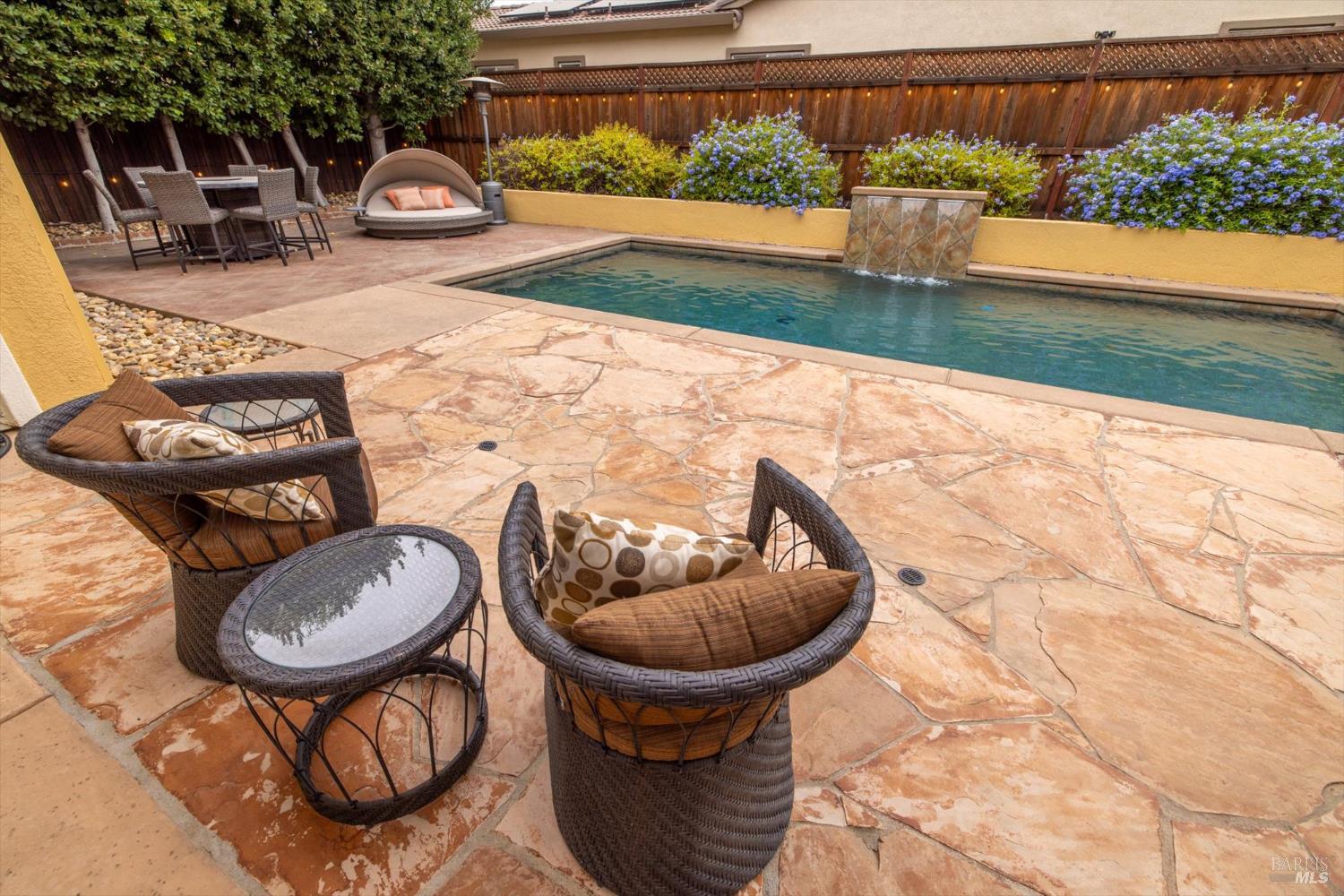 Former model home with style & comfort! Soaring open-beam ceilings, 3 gas fireplaces, and distressed hardwood floors set the tone. Gourmet kitchen with Monogram built-in appliances, beautiful birch cabinets throughout, large island, pantry & breakfast nook with custom built-ins. Downstairs bedroom with French doors to backyard plus den with front patio access. Expansive primary suite with 2 walk-in closets, fireplace & spa-like bath with jetted tub. Custom window coverings throughout. Resort-style backyard with pebble-bottom pool & waterfall, mature trees, pergola with lights, and low-maintenance landscaping. Dual-zone AC, organized closets, and thoughtful details throughout, plus a custom covered dog run on the side of the home complete this one-of-a-kind Vacaville gem!