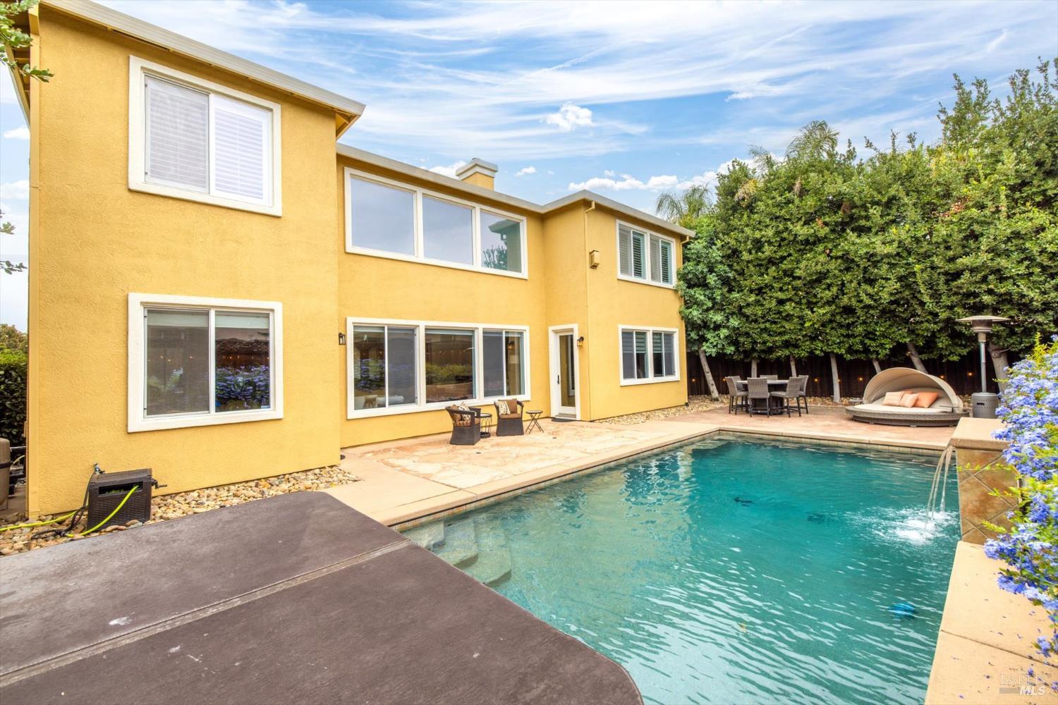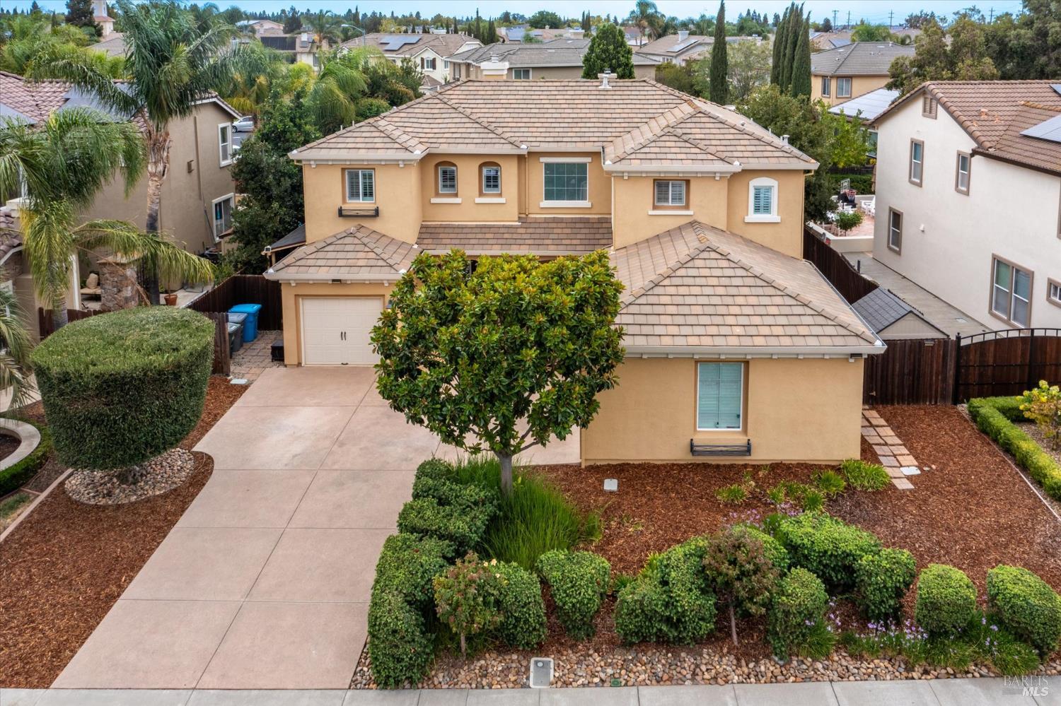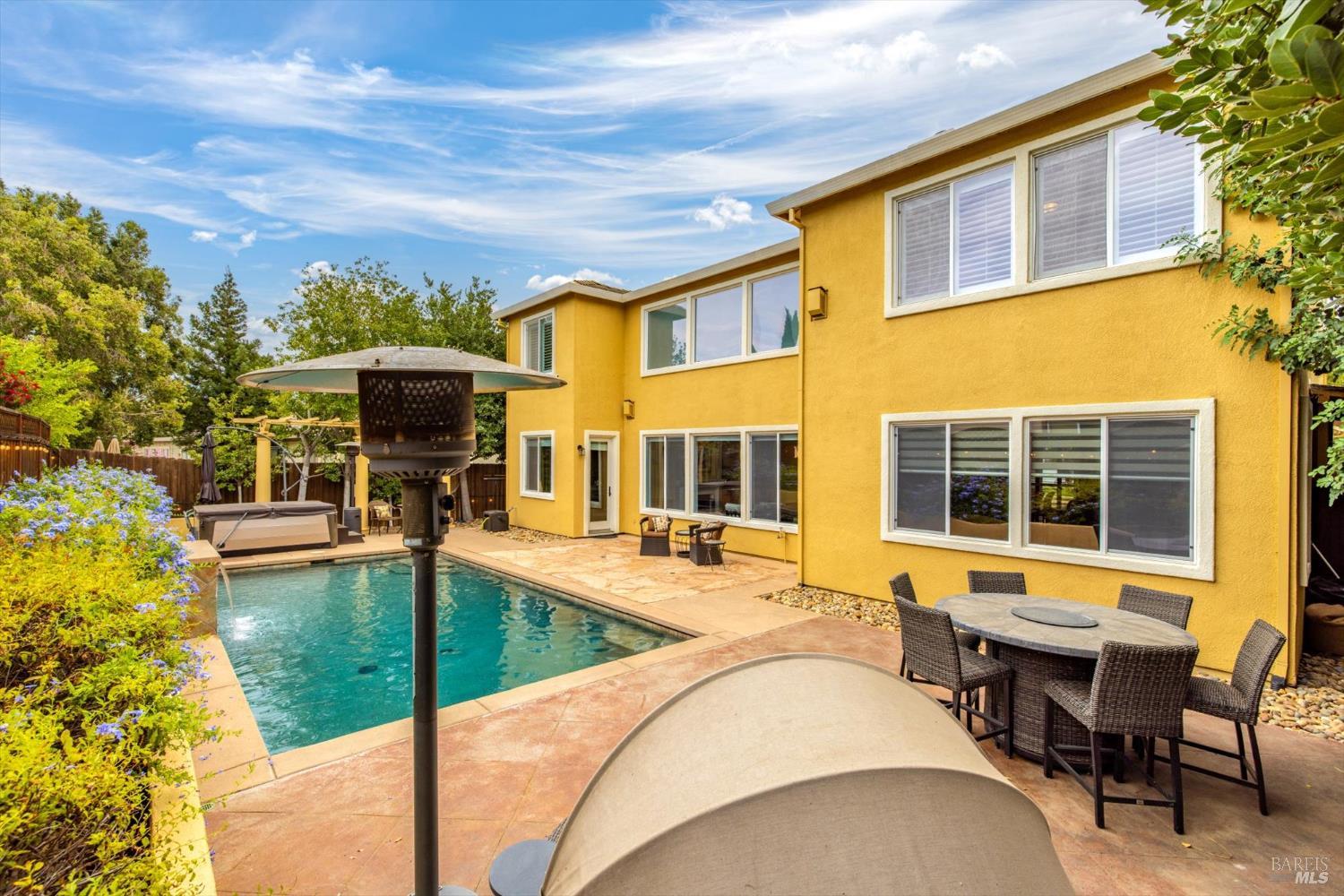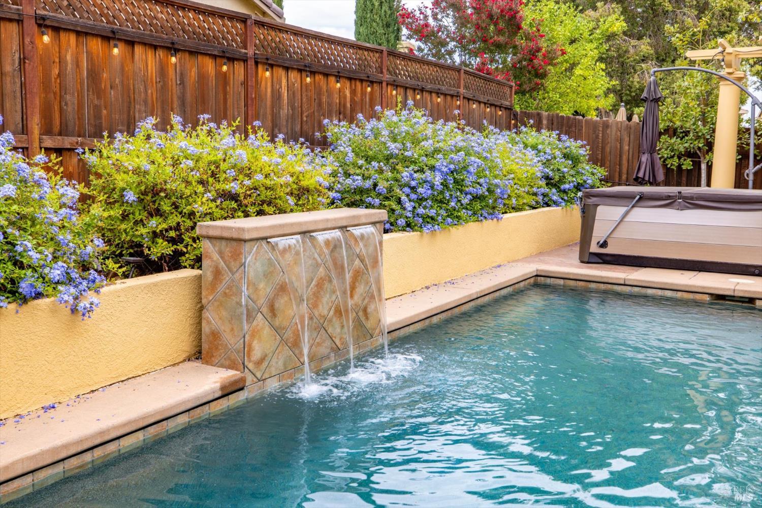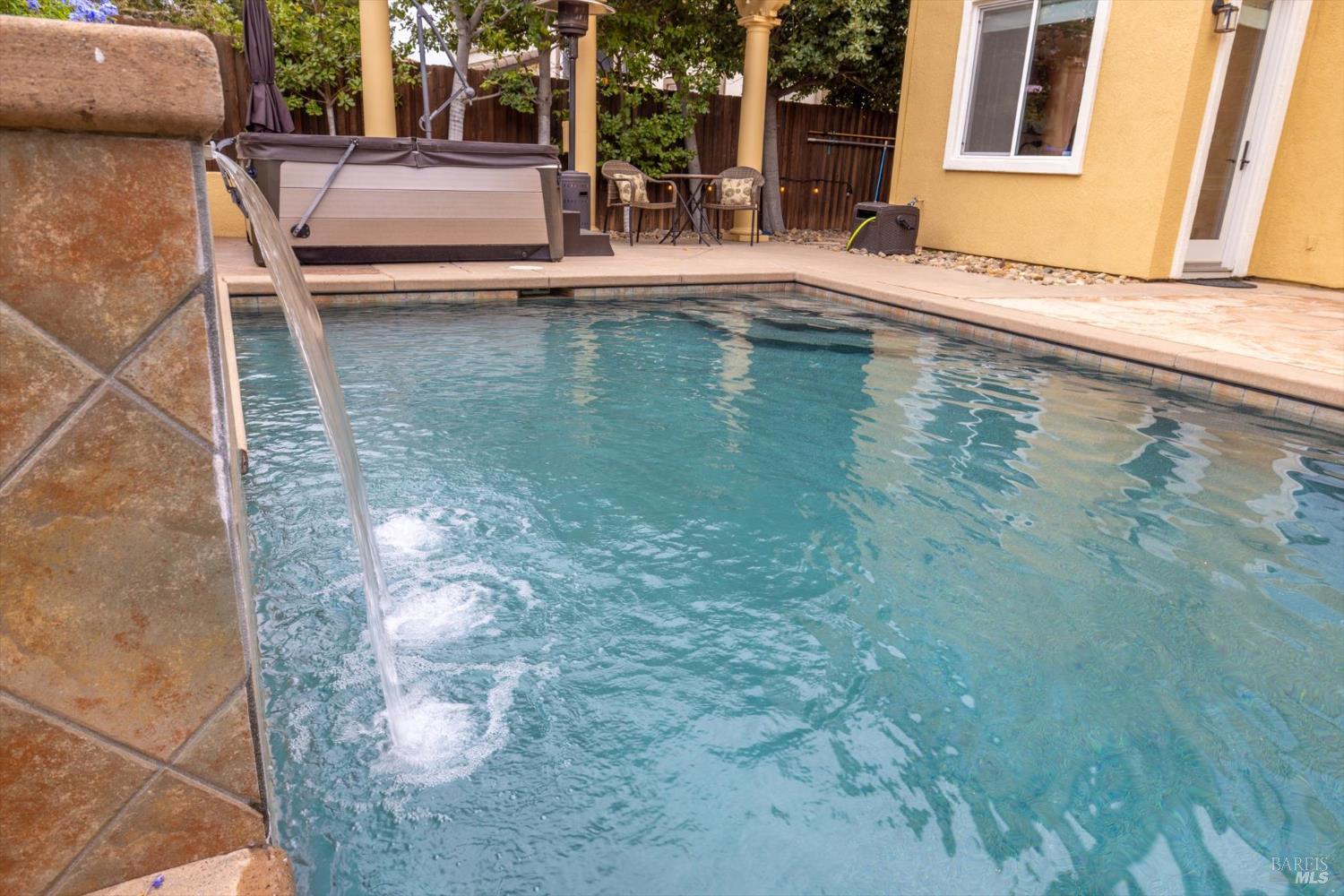 Former model home with style & comfort! Soaring open-beam ceilings, 3 gas fireplaces, and distressed hardwood floors set the tone. Gourmet kitchen with Monogram built-in appliances, beautiful birch cabinets throughout, large island, pantry & breakfast nook with custom built-ins. Downstairs bedroom with French doors to backyard plus den with front patio access. Expansive primary suite with 2 walk-in closets, fireplace & spa-like bath with jetted tub. Custom window coverings throughout. Resort-style backyard with pebble-bottom pool & waterfall, mature trees, pergola with lights, and low-maintenance landscaping. Dual-zone AC, organized closets, and thoughtful details throughout, plus a custom covered dog run on the side of the home complete this one-of-a-kind Vacaville gem!