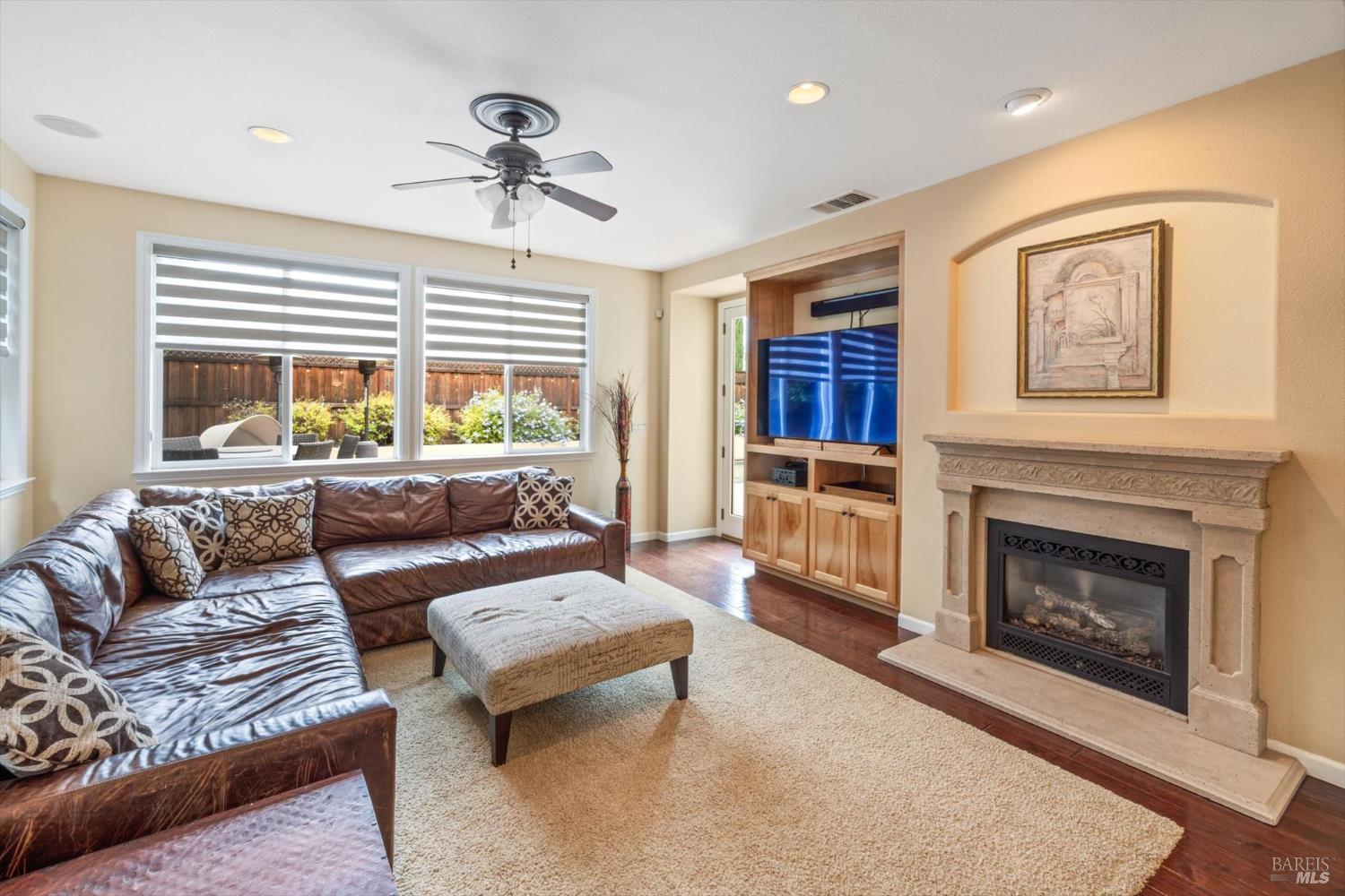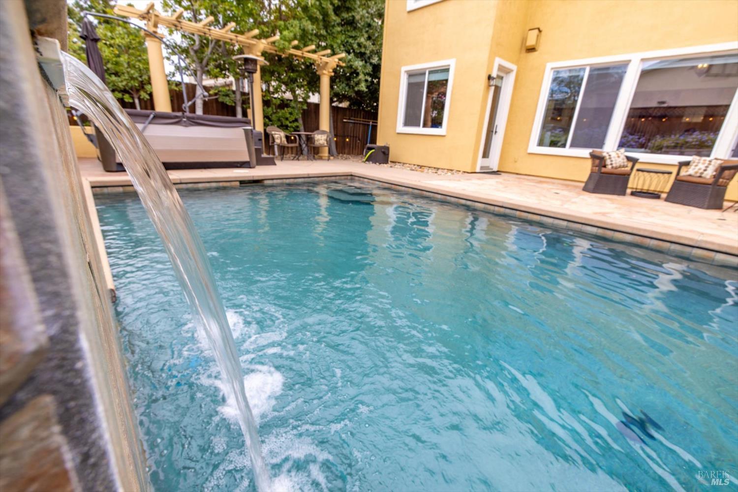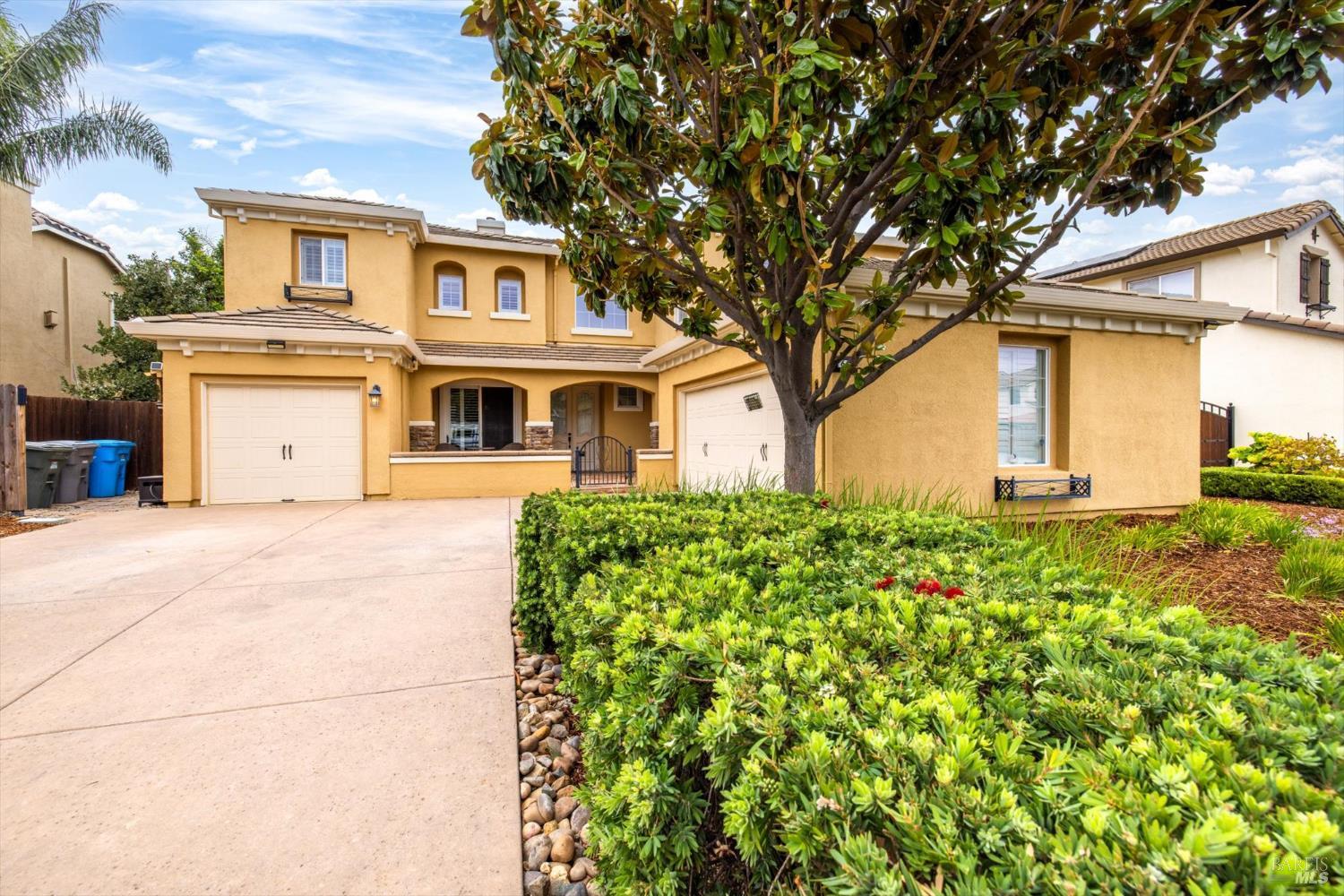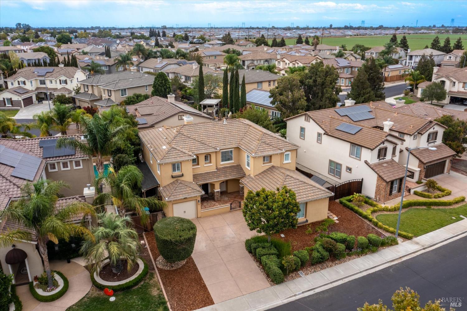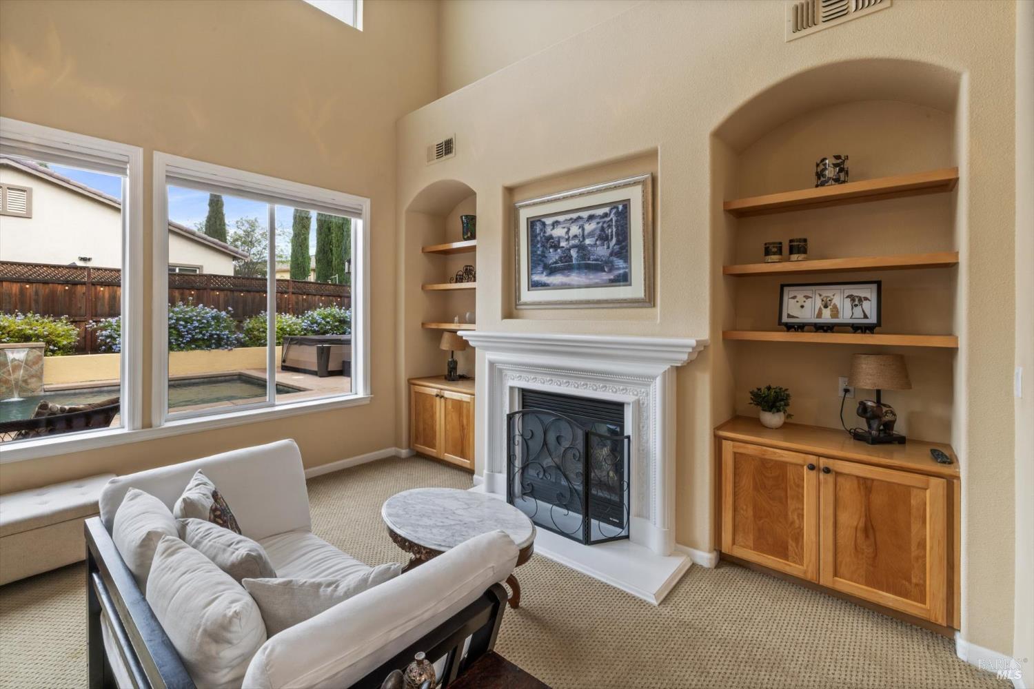 Former model home with style & comfort! Soaring open-beam ceilings, 3 gas fireplaces, and distressed hardwood floors set the tone. Gourmet kitchen with Monogram built-in appliances, beautiful birch cabinets throughout, large island, pantry & breakfast nook with custom built-ins. Downstairs bedroom with French doors to backyard plus den with front patio access. Expansive primary suite with 2 walk-in closets, fireplace & spa-like bath with jetted tub. Custom window coverings throughout. Resort-style backyard with pebble-bottom pool & waterfall, mature trees, pergola with lights, and low-maintenance landscaping. Dual-zone AC, organized closets, and thoughtful details throughout, plus a custom covered dog run on the side of the home complete this one-of-a-kind Vacaville gem!