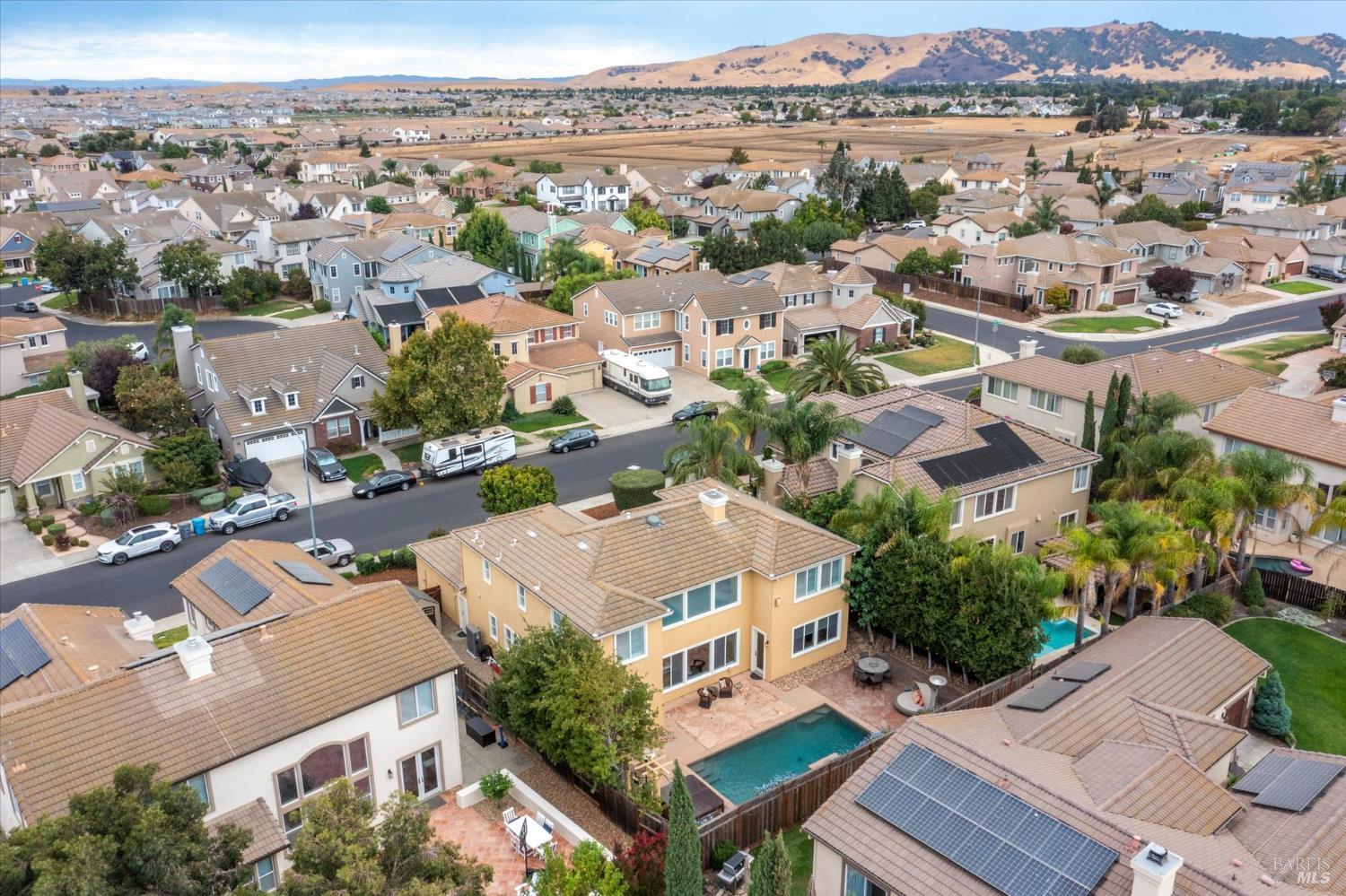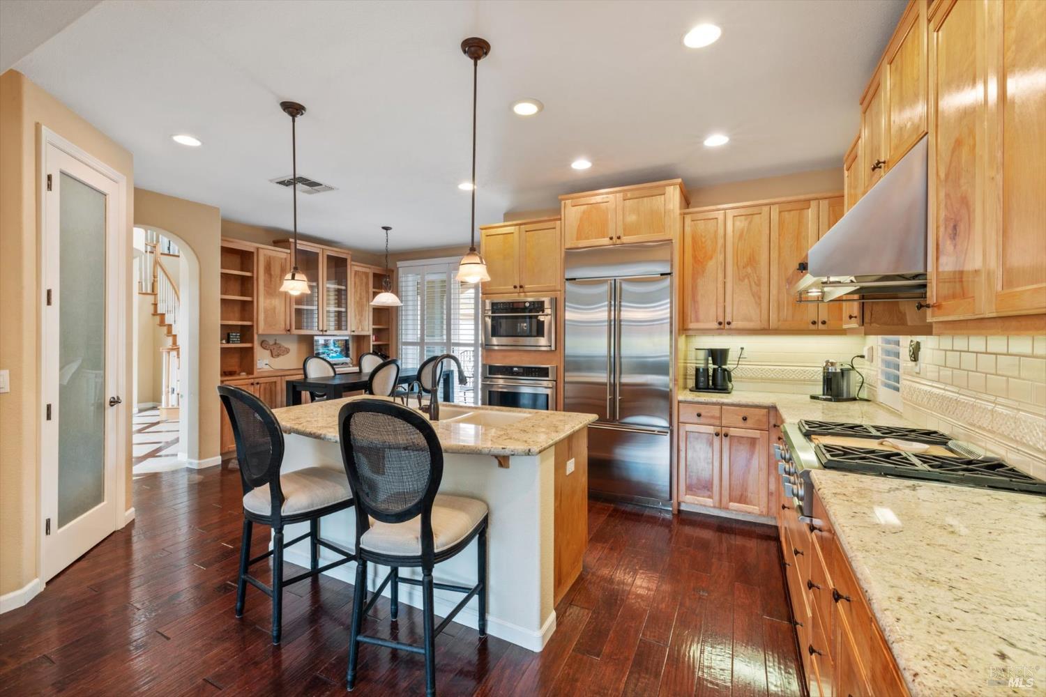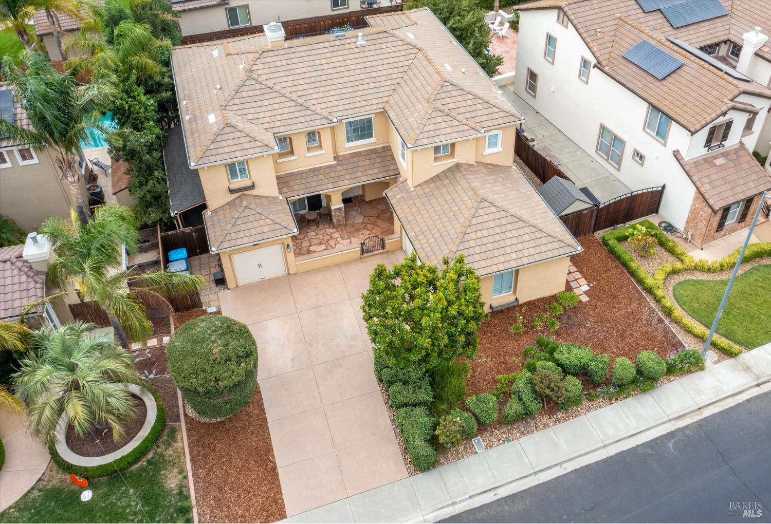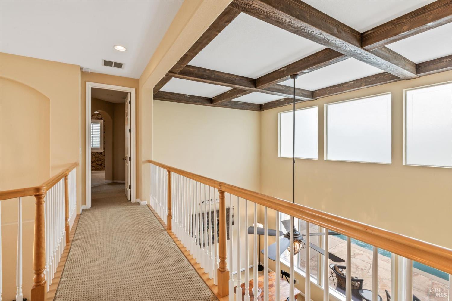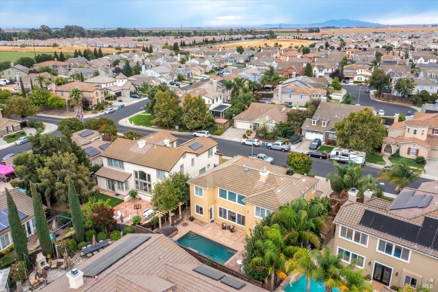Former model home with style & comfort! Soaring open-beam ceilings, 3 gas fireplaces, and distressed hardwood floors set the tone. Gourmet kitchen with Monogram built-in appliances, beautiful birch cabinets throughout, large island, pantry & breakfast nook with custom built-ins. Downstairs bedroom with French doors to backyard plus den with front patio access. Expansive primary suite with 2 walk-in closets, fireplace & spa-like bath with jetted tub. Custom window coverings throughout. Resort-style backyard with pebble-bottom pool & waterfall, mature trees, pergola with lights, and low-maintenance landscaping. Dual-zone AC, organized closets, and thoughtful details throughout, plus a custom covered dog run on the side of the home complete this one-of-a-kind Vacaville gem!