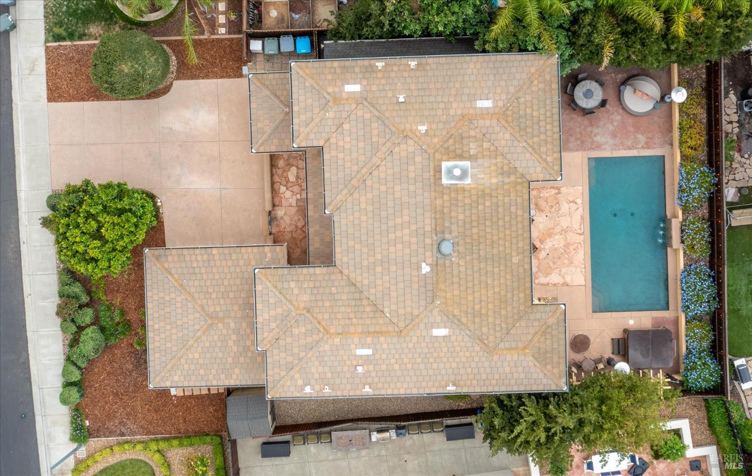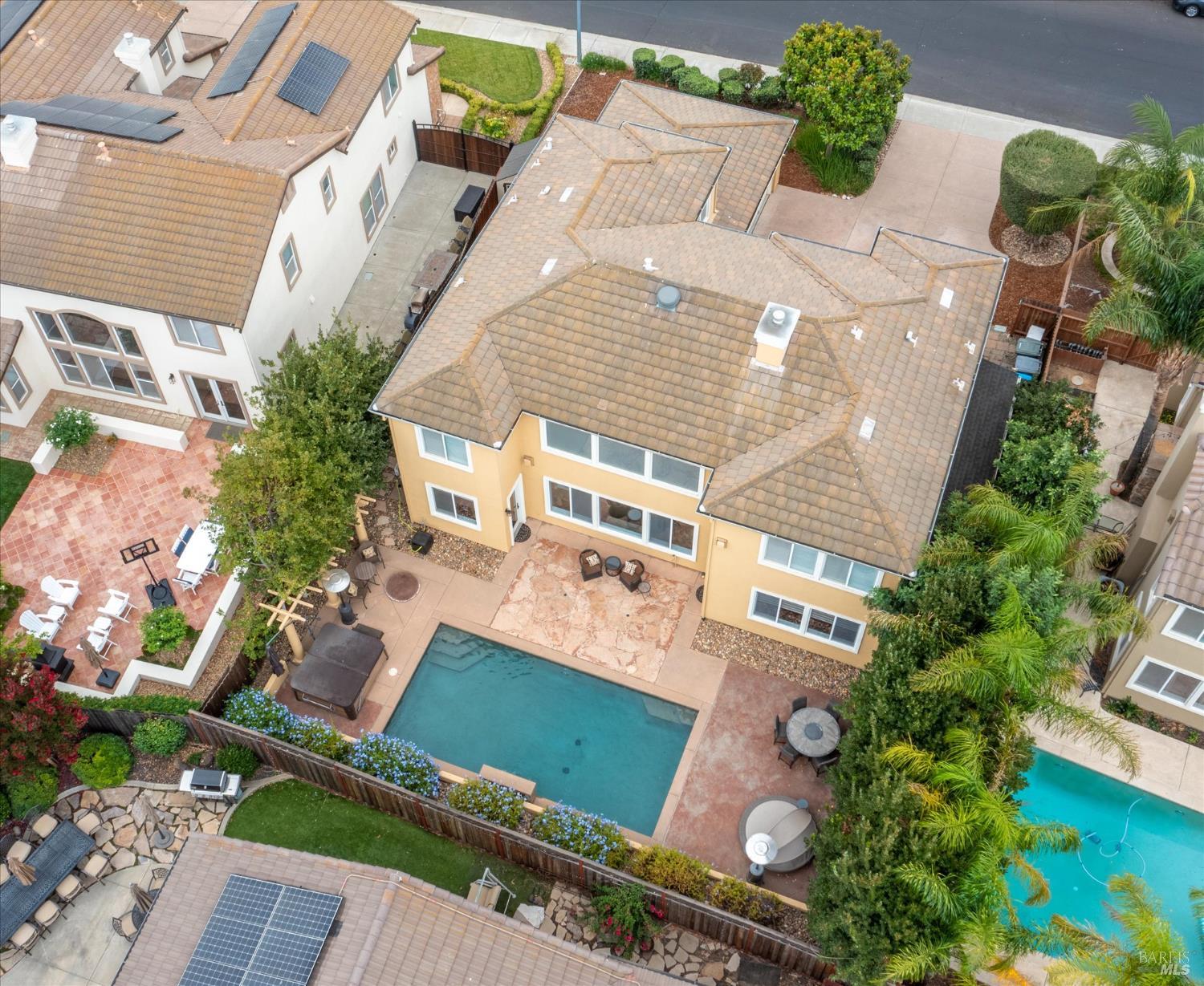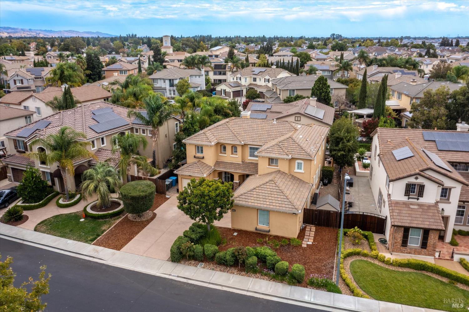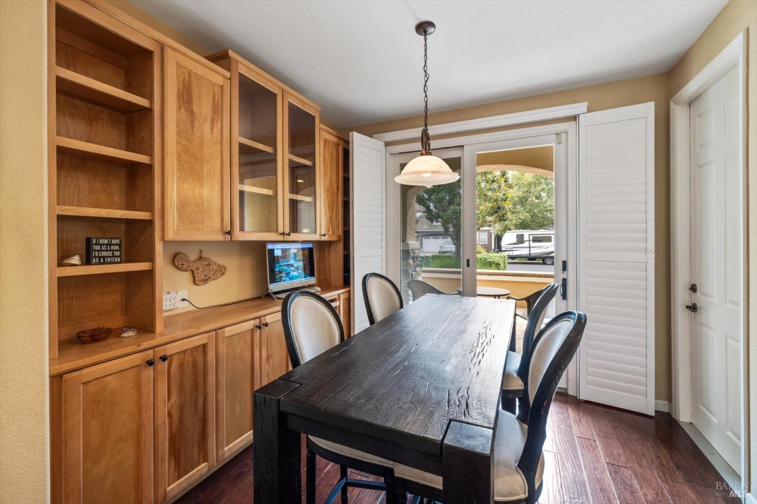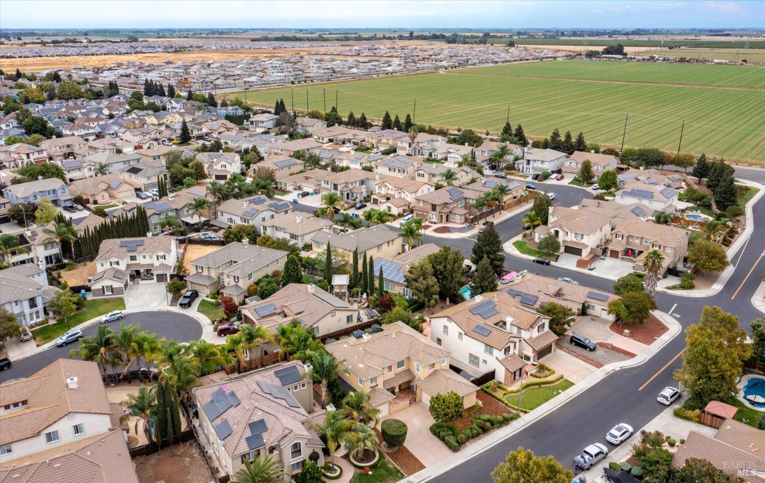 Former model home with style & comfort! Soaring open-beam ceilings, 3 gas fireplaces, and distressed hardwood floors set the tone. Gourmet kitchen with Monogram built-in appliances, beautiful birch cabinets throughout, large island, pantry & breakfast nook with custom built-ins. Downstairs bedroom with French doors to backyard plus den with front patio access. Expansive primary suite with 2 walk-in closets, fireplace & spa-like bath with jetted tub. Custom window coverings throughout. Resort-style backyard with pebble-bottom pool & waterfall, mature trees, pergola with lights, and low-maintenance landscaping. Dual-zone AC, organized closets, and thoughtful details throughout, plus a custom covered dog run on the side of the home complete this one-of-a-kind Vacaville gem!