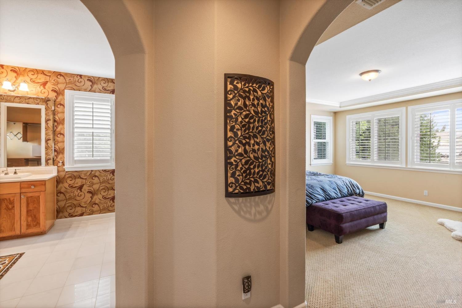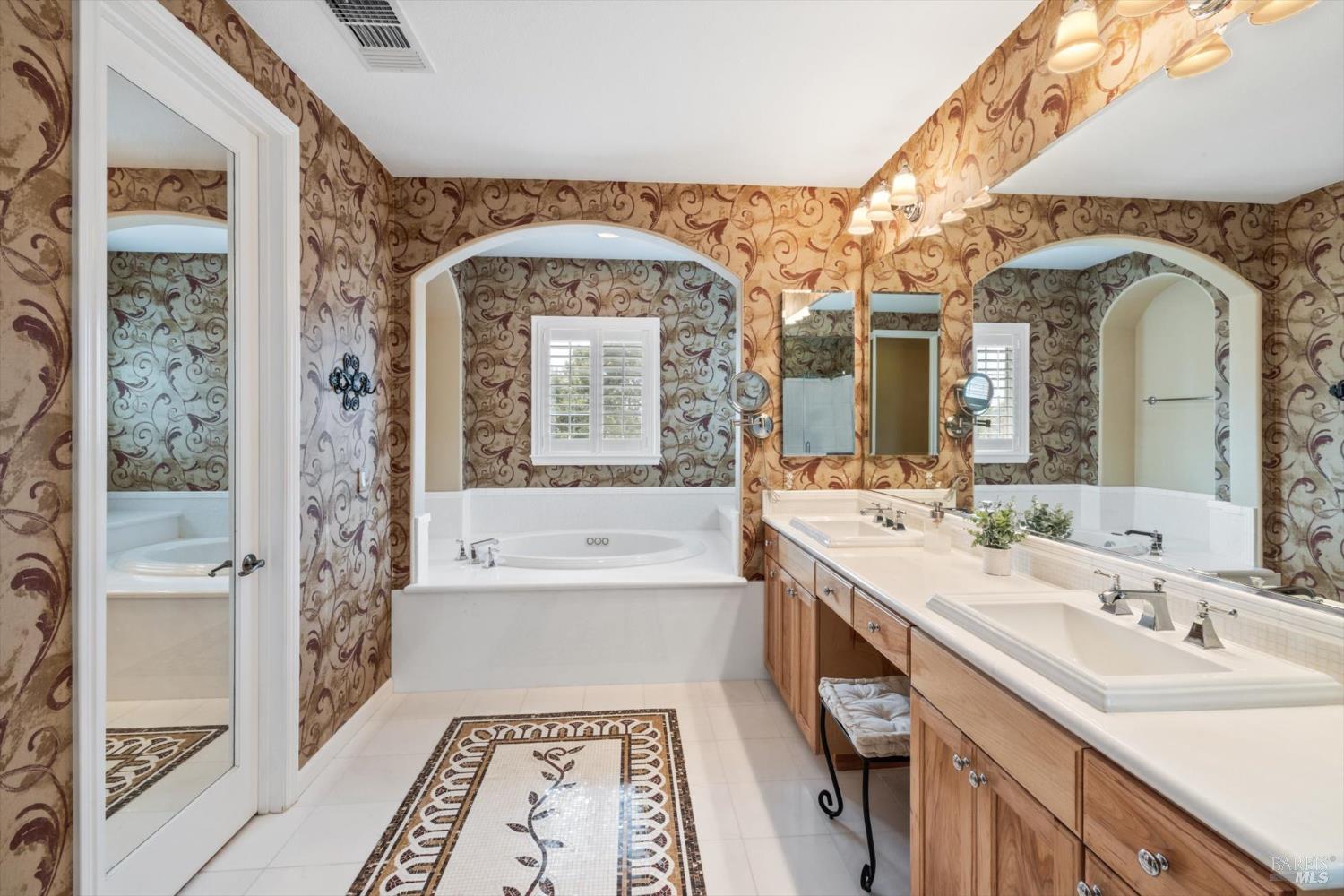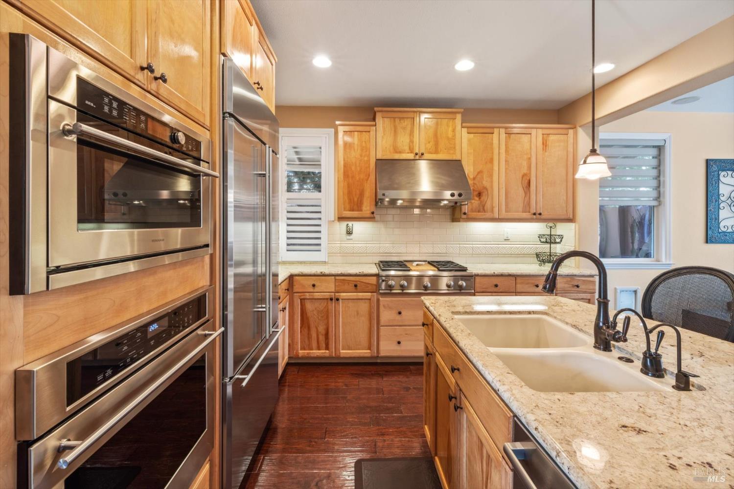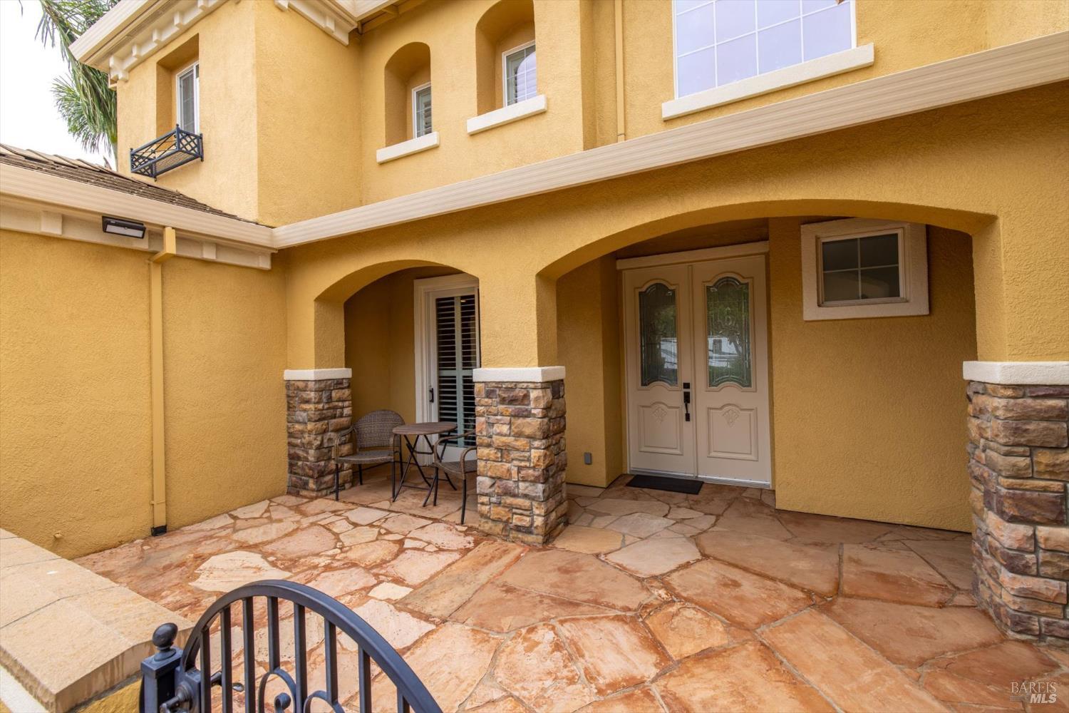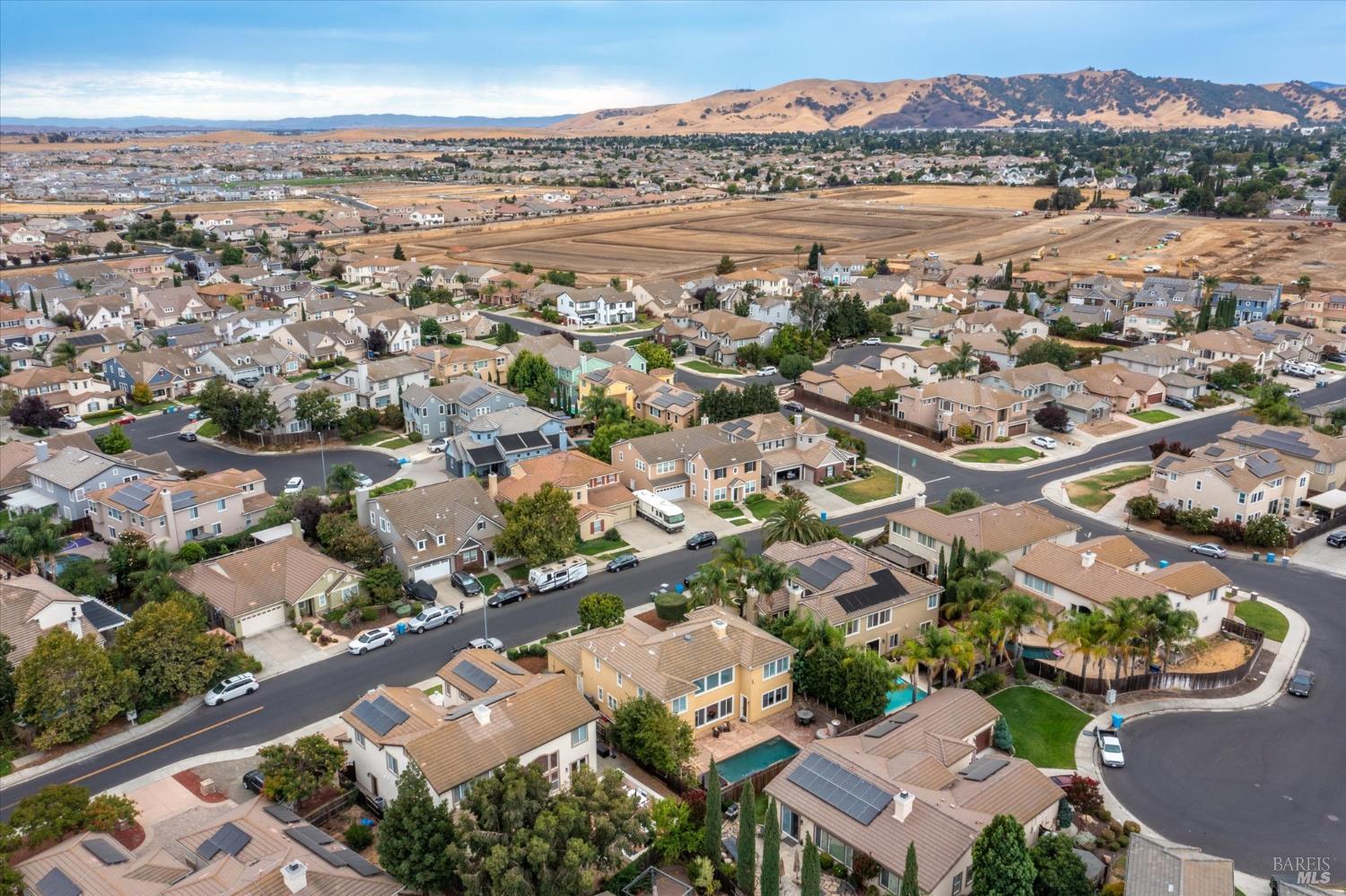 Former model home with style & comfort! Soaring open-beam ceilings, 3 gas fireplaces, and distressed hardwood floors set the tone. Gourmet kitchen with Monogram built-in appliances, beautiful birch cabinets throughout, large island, pantry & breakfast nook with custom built-ins. Downstairs bedroom with French doors to backyard plus den with front patio access. Expansive primary suite with 2 walk-in closets, fireplace & spa-like bath with jetted tub. Custom window coverings throughout. Resort-style backyard with pebble-bottom pool & waterfall, mature trees, pergola with lights, and low-maintenance landscaping. Dual-zone AC, organized closets, and thoughtful details throughout, plus a custom covered dog run on the side of the home complete this one-of-a-kind Vacaville gem!