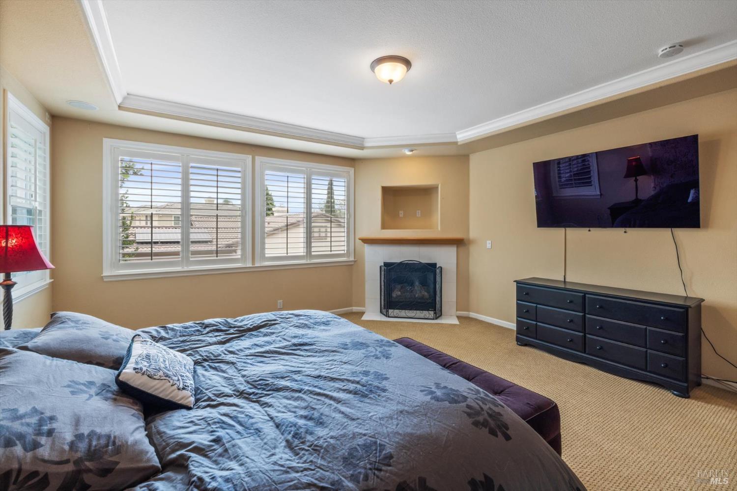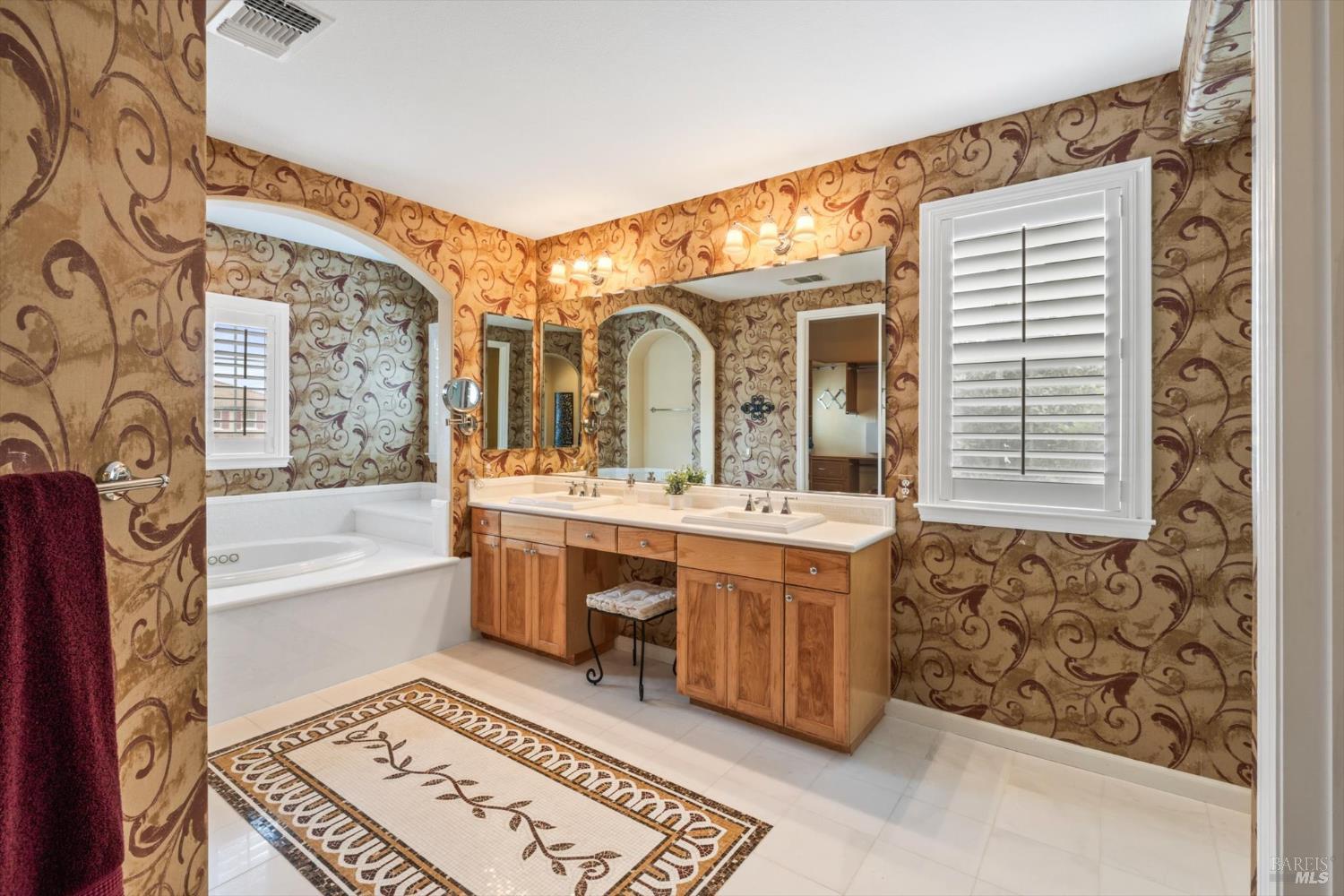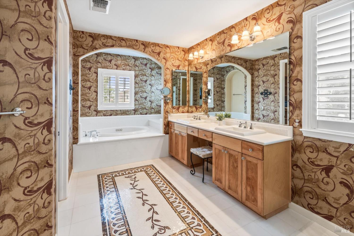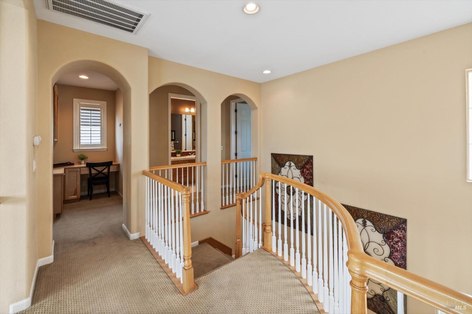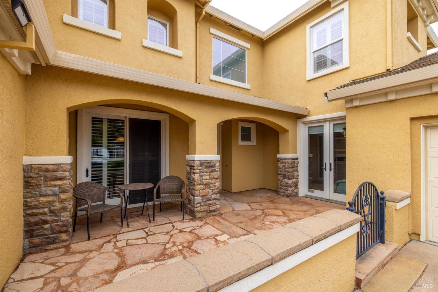 Former model home with style & comfort! Soaring open-beam ceilings, 3 gas fireplaces, and distressed hardwood floors set the tone. Gourmet kitchen with Monogram built-in appliances, beautiful birch cabinets throughout, large island, pantry & breakfast nook with custom built-ins. Downstairs bedroom with French doors to backyard plus den with front patio access. Expansive primary suite with 2 walk-in closets, fireplace & spa-like bath with jetted tub. Custom window coverings throughout. Resort-style backyard with pebble-bottom pool & waterfall, mature trees, pergola with lights, and low-maintenance landscaping. Dual-zone AC, organized closets, and thoughtful details throughout, plus a custom covered dog run on the side of the home complete this one-of-a-kind Vacaville gem!