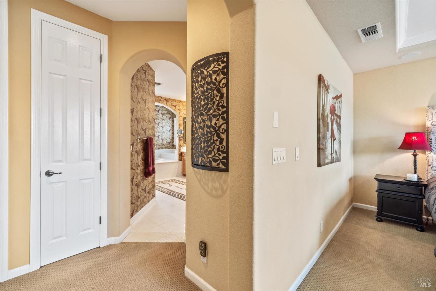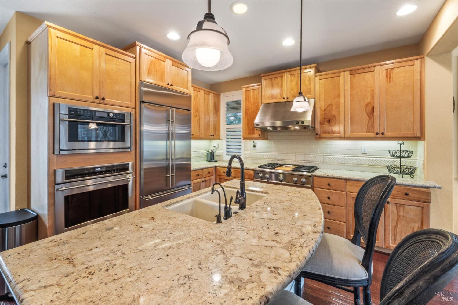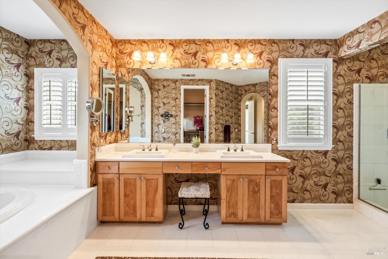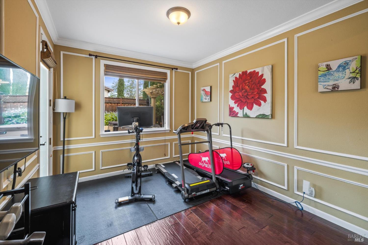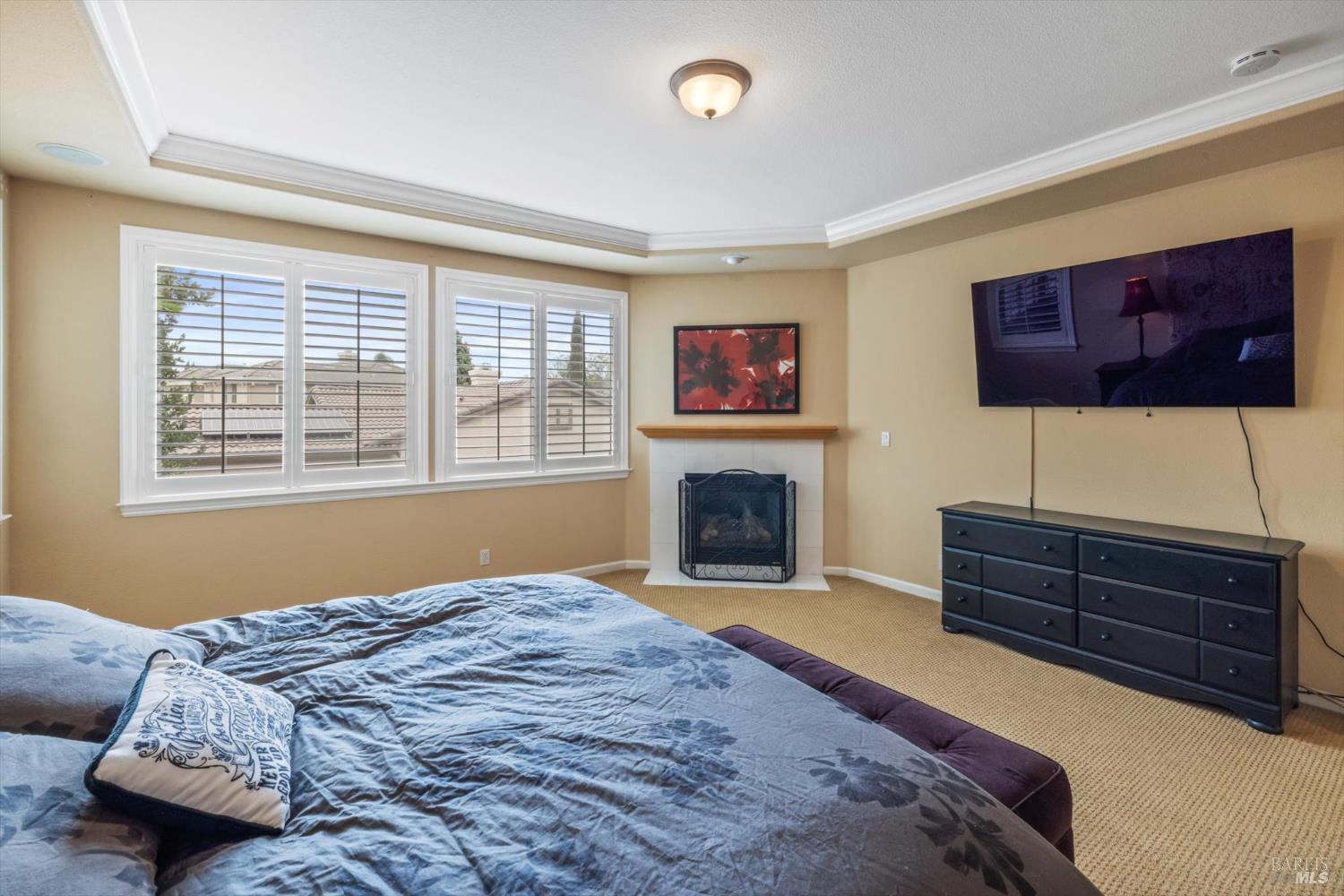 Former model home with style & comfort! Soaring open-beam ceilings, 3 gas fireplaces, and distressed hardwood floors set the tone. Gourmet kitchen with Monogram built-in appliances, beautiful birch cabinets throughout, large island, pantry & breakfast nook with custom built-ins. Downstairs bedroom with French doors to backyard plus den with front patio access. Expansive primary suite with 2 walk-in closets, fireplace & spa-like bath with jetted tub. Custom window coverings throughout. Resort-style backyard with pebble-bottom pool & waterfall, mature trees, pergola with lights, and low-maintenance landscaping. Dual-zone AC, organized closets, and thoughtful details throughout, plus a custom covered dog run on the side of the home complete this one-of-a-kind Vacaville gem!