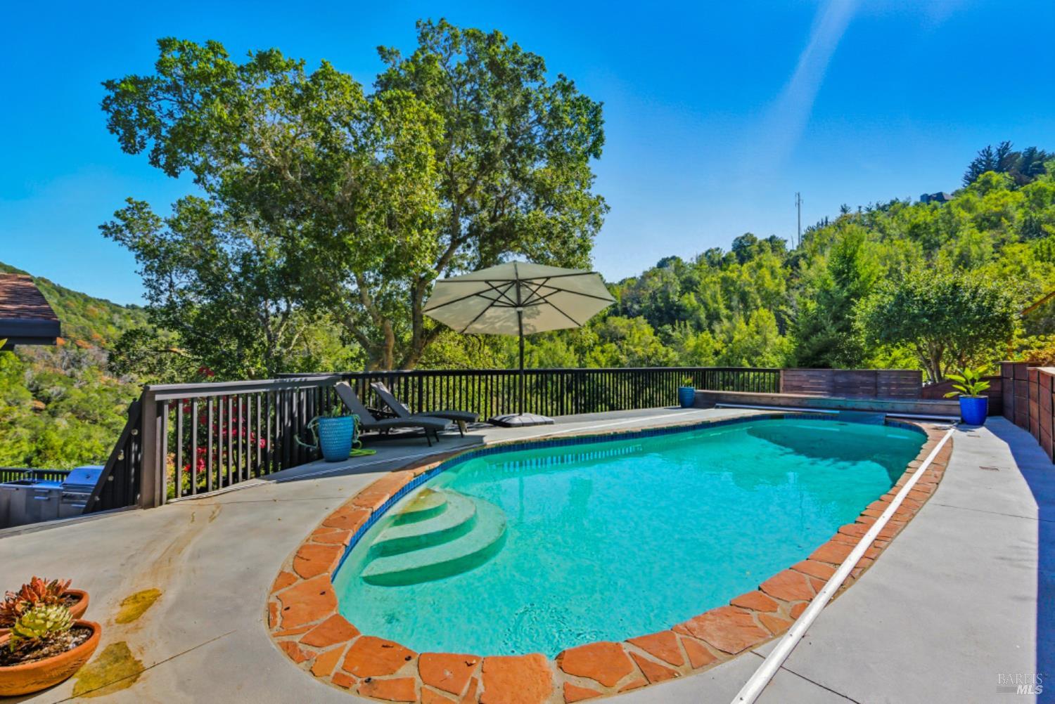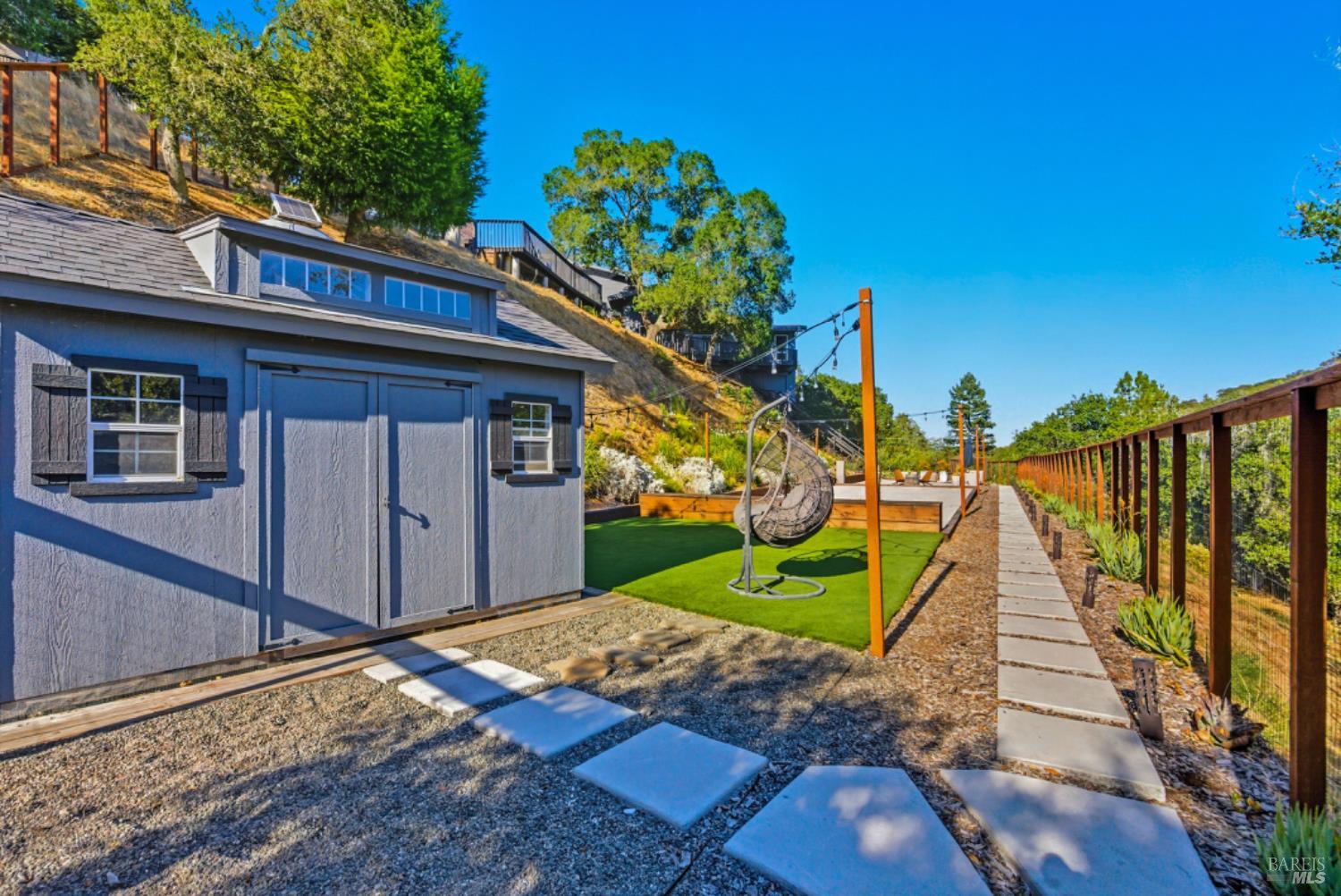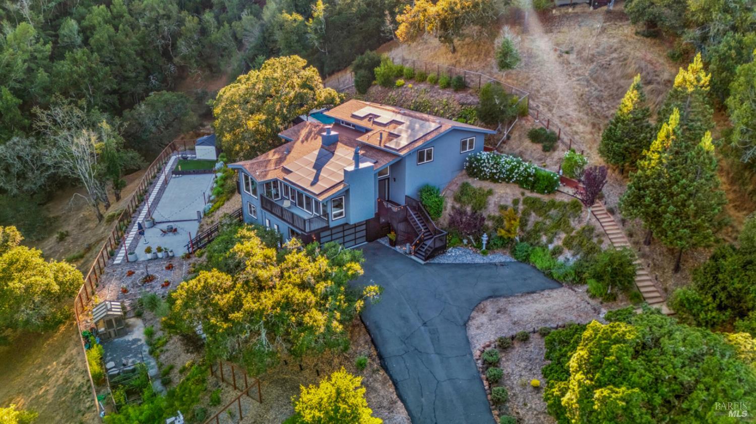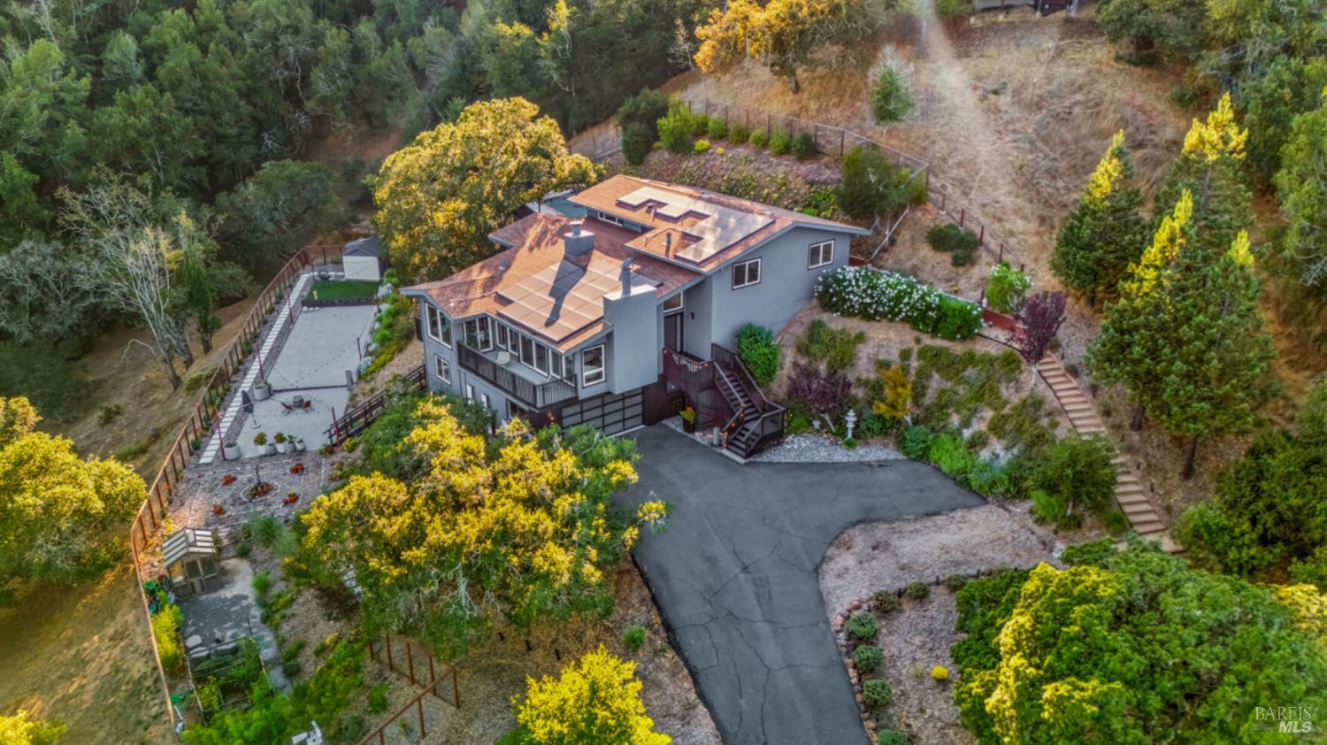 Set on a private acre at the end of a cul-de-sac, this extensively remodeled four-bedroom home blends modern design, resort-style amenities, and sweeping greenbelt views. Completed between 2020 and 2022, the renovation highlights wide-plank oak floors, a dramatic two-story smoked-glass wine room, a sleek wet bar, and a Venetian plaster fireplace. The chef's kitchen offers dual counters, custom cabinetry, a walk-in pantry, and an indoor grill, with effortless flow to the outdoor dining area, built-in BBQ, and view deck. The primary suite opens directly to a private outdoor shower and heated pool, while all bedrooms are conveniently located on one level. A ground-level office provides excellent work-from-home flexibility. The finished two-car garage features epoxy floors, full-height cabinets, a workbench, and integrated tool system. Professionally designed gardens are fire-wise, drought-tolerant, and low-maintenance, complemented by a mini orchard. The expansive lower yard is built for gatherings, complete with bocce court, powered greenhouse, raised vegetable beds. Located within the Wild Horse Valley Home Owners Association who's amenities include tennis courts, a community pool and clubhouse.