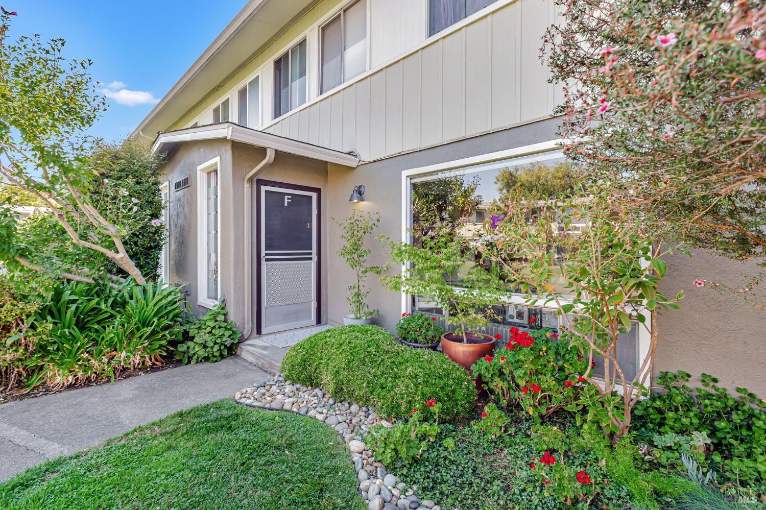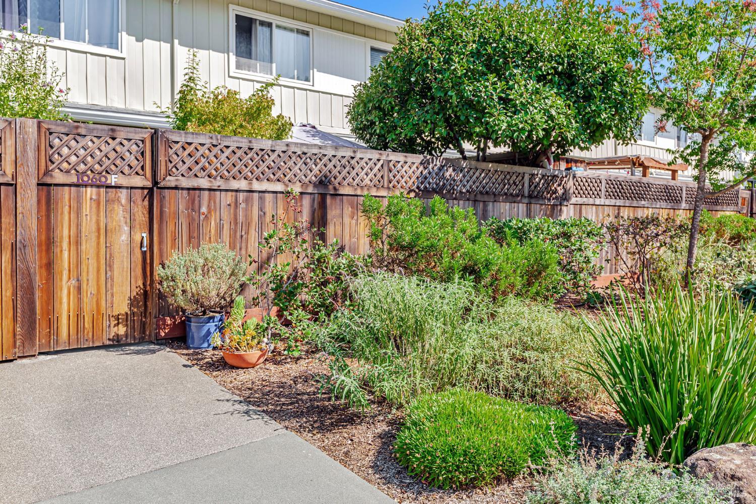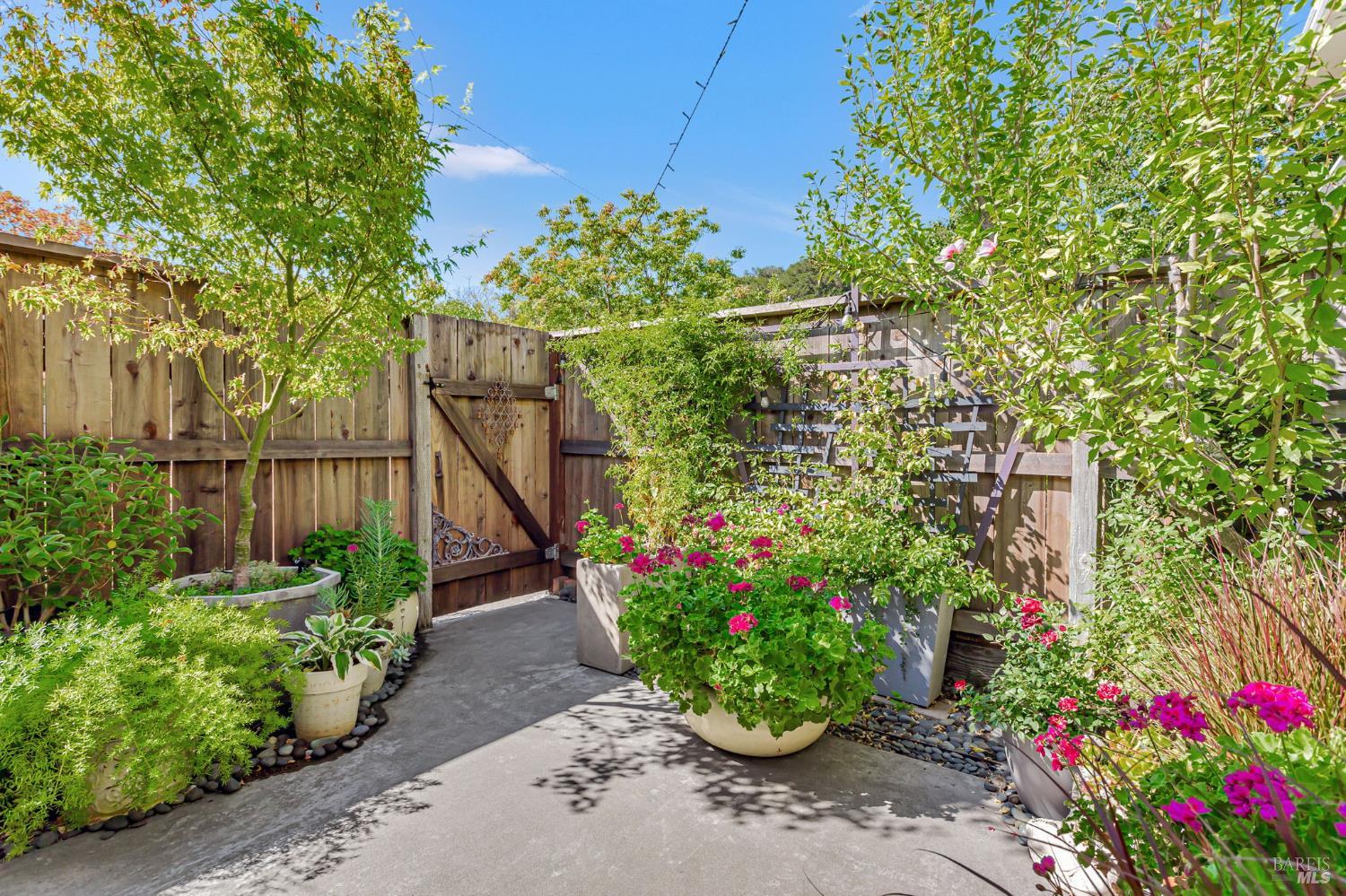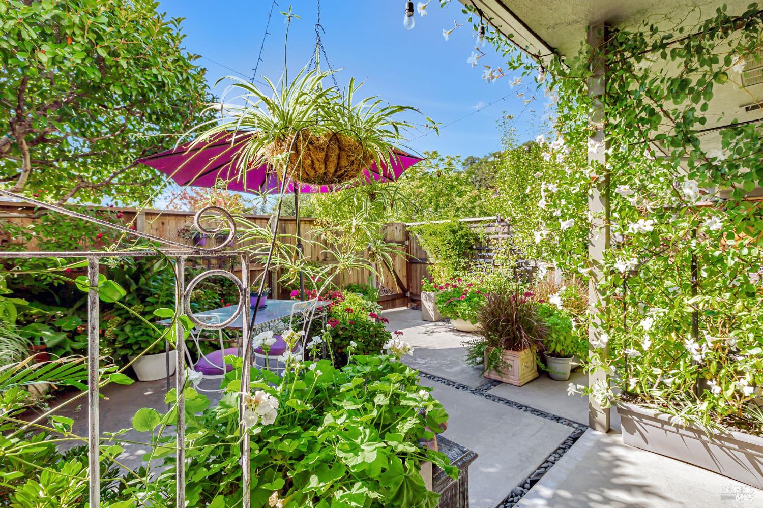 Rare opportunity to make this spacious 3-bedroom, 1.5-bath townhouse your home in a sought-after community. Enter through the garden gate to one of the highlights of this homean extraordinary private garden oasis. Lush landscaping, mature plantings, and a covered patio with ceiling fan and accent lighting create a serene retreat, perfect for morning coffee, dining al fresco, or entertaining under the stars. Inside, the living room includes custom built-ins with a wine rack and striking arched beam, while the dining room offers garden views and connects to the kitchen with newer appliances, painted cabinets, travertine tile floors, and double sink. Upstairs, the generous primary bedroom features a customized closet system and ceiling fan, with laundry just steps away. Additional highlights include open floor plan, hardwood floors, updated lighting, custom paint, newer blinds, and west-facing dual-paned windows. The community offers a pool, clubhouse, EV charging stations, and beautiful landscape grounds. Monthly HOA INCLUDES property tax, PG&E, garbage, water, exterior maintenance, select interior maintenance (furnace, water heater, plumbing, electrical), landscaping, and exterior insurance. Embrace carefree living this is San Rafael Manor living at its finest!
