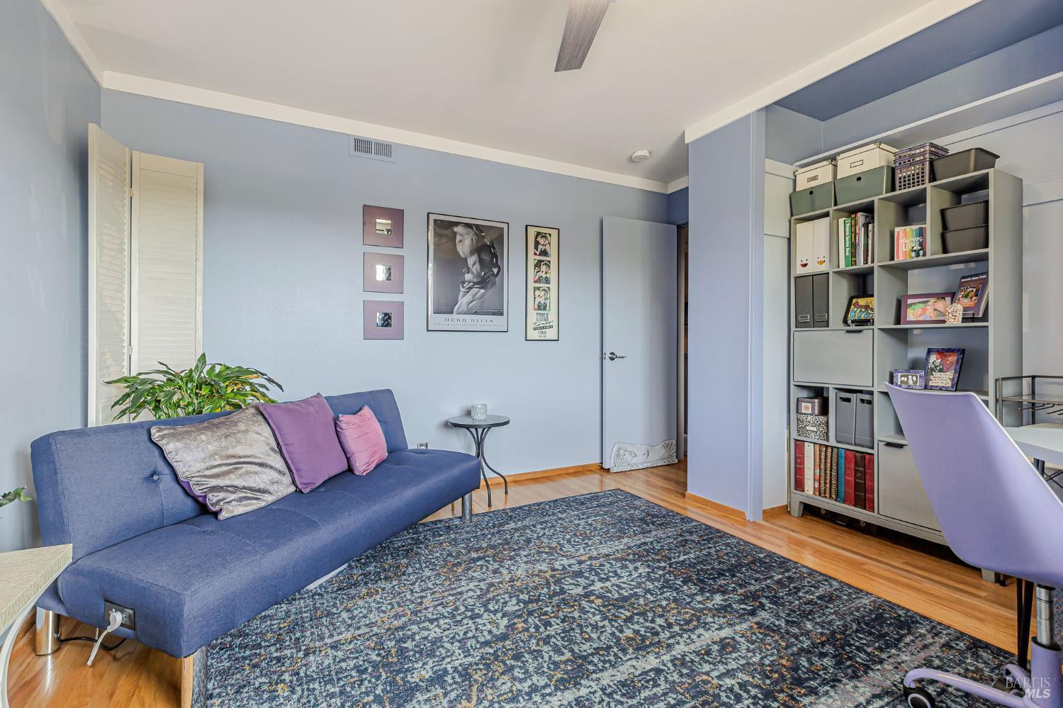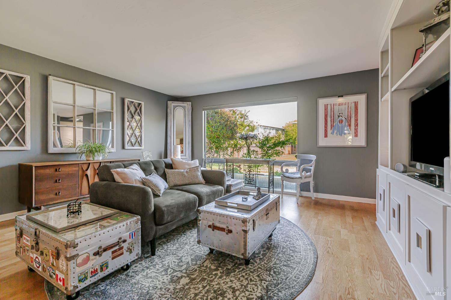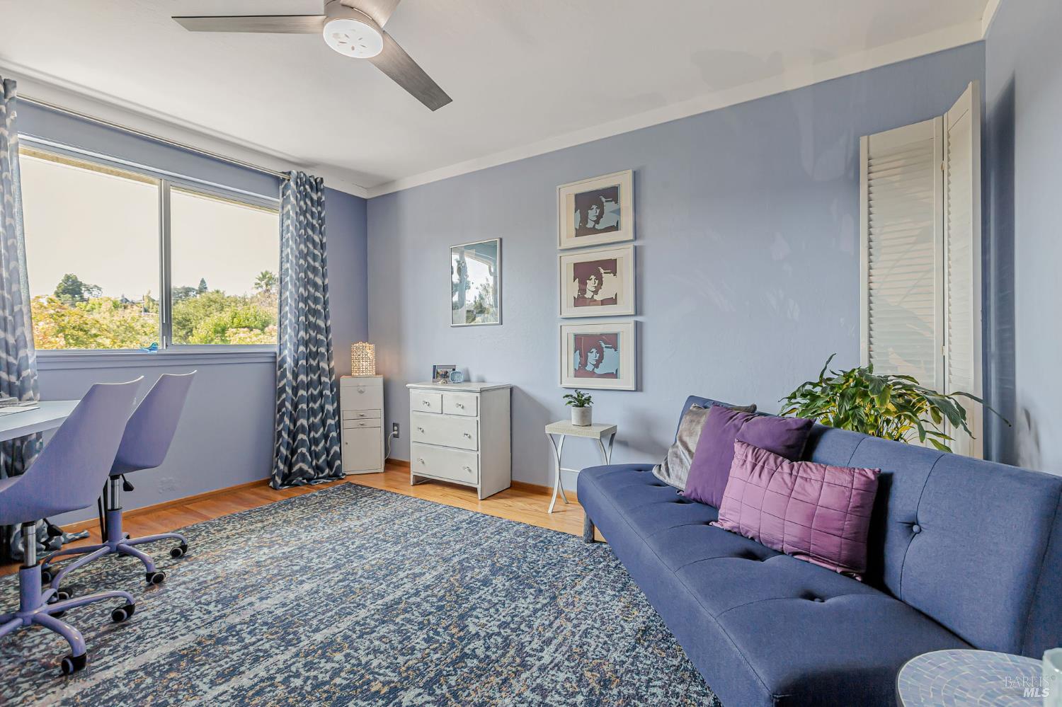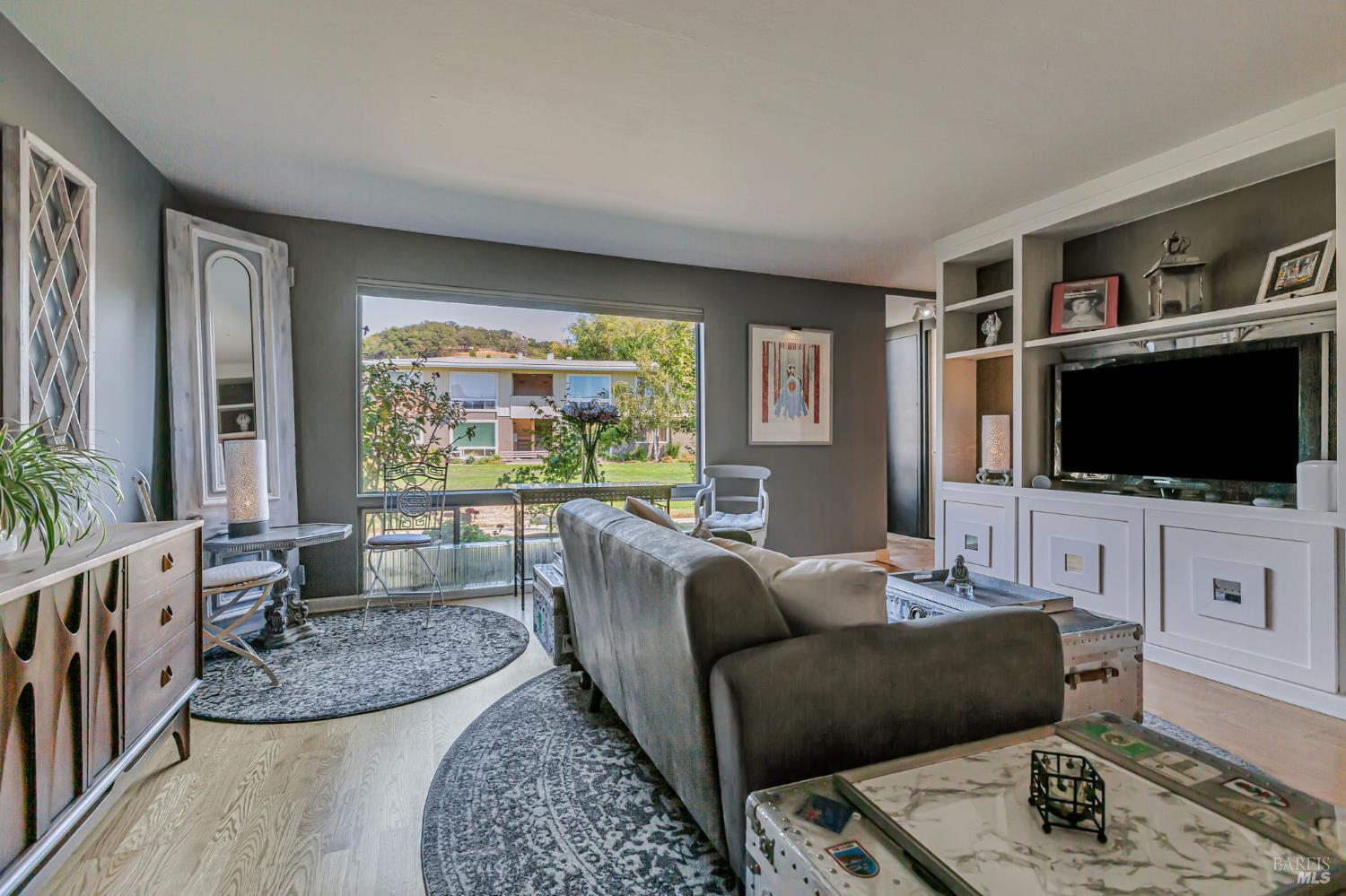 Rare opportunity to make this spacious 3-bedroom, 1.5-bath townhouse your home in a sought-after community. Enter through the garden gate to one of the highlights of this homean extraordinary private garden oasis. Lush landscaping, mature plantings, and a covered patio with ceiling fan and accent lighting create a serene retreat, perfect for morning coffee, dining al fresco, or entertaining under the stars. Inside, the living room includes custom built-ins with a wine rack and striking arched beam, while the dining room offers garden views and connects to the kitchen with newer appliances, painted cabinets, travertine tile floors, and double sink. Upstairs, the generous primary bedroom features a customized closet system and ceiling fan, with laundry just steps away. Additional highlights include open floor plan, hardwood floors, updated lighting, custom paint, newer blinds, and west-facing dual-paned windows. The community offers a pool, clubhouse, EV charging stations, and beautiful landscape grounds. Monthly HOA INCLUDES property tax, PG&E, garbage, water, exterior maintenance, select interior maintenance (furnace, water heater, plumbing, electrical), landscaping, and exterior insurance. Embrace carefree living this is San Rafael Manor living at its finest!
