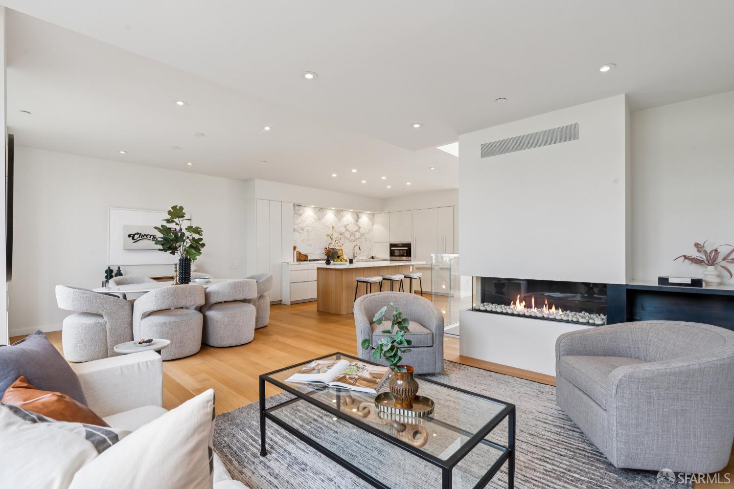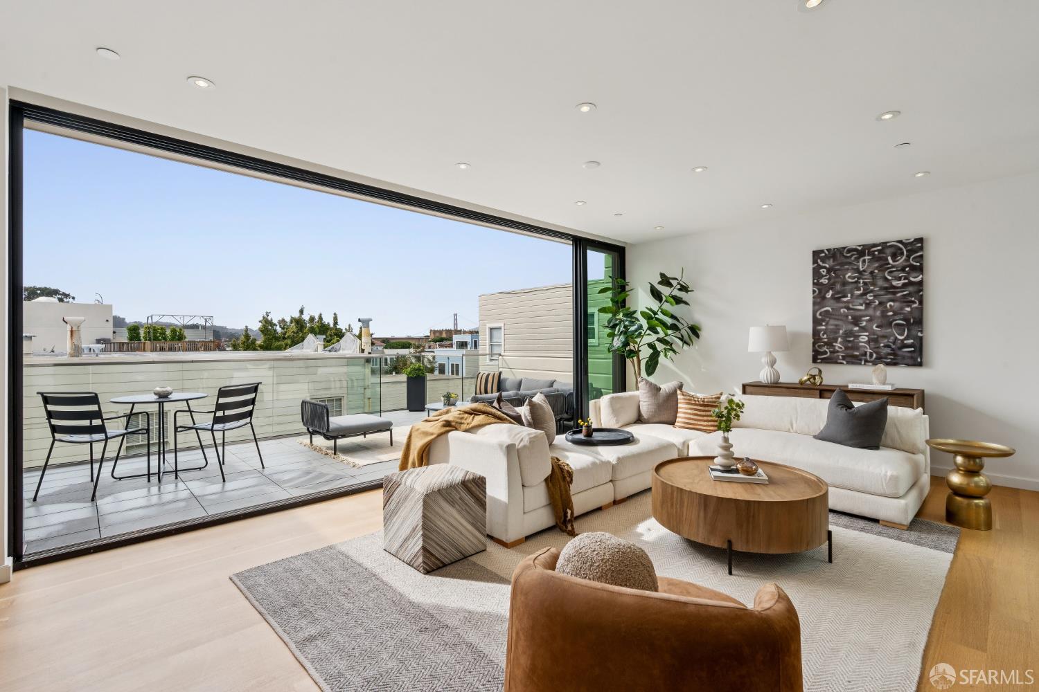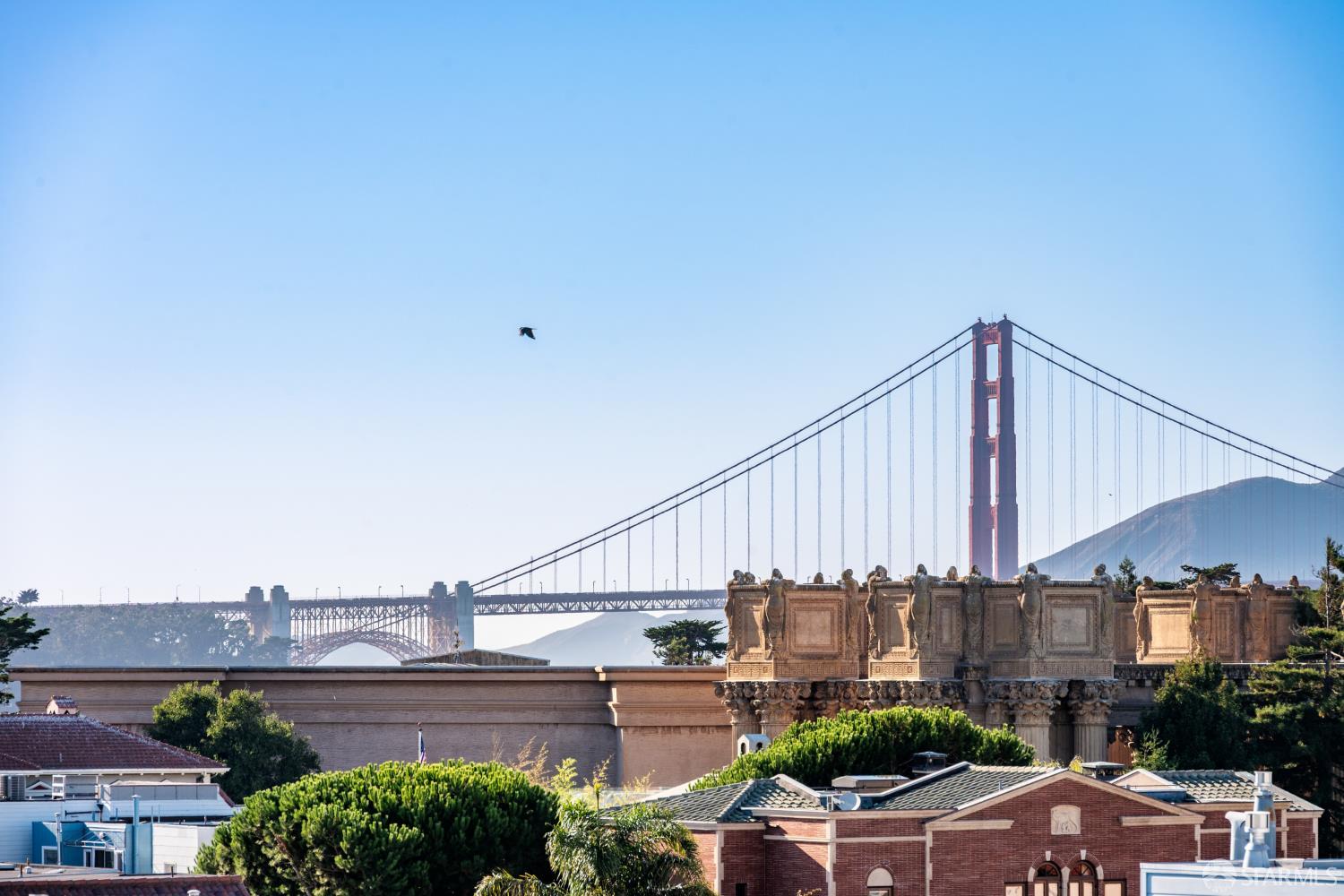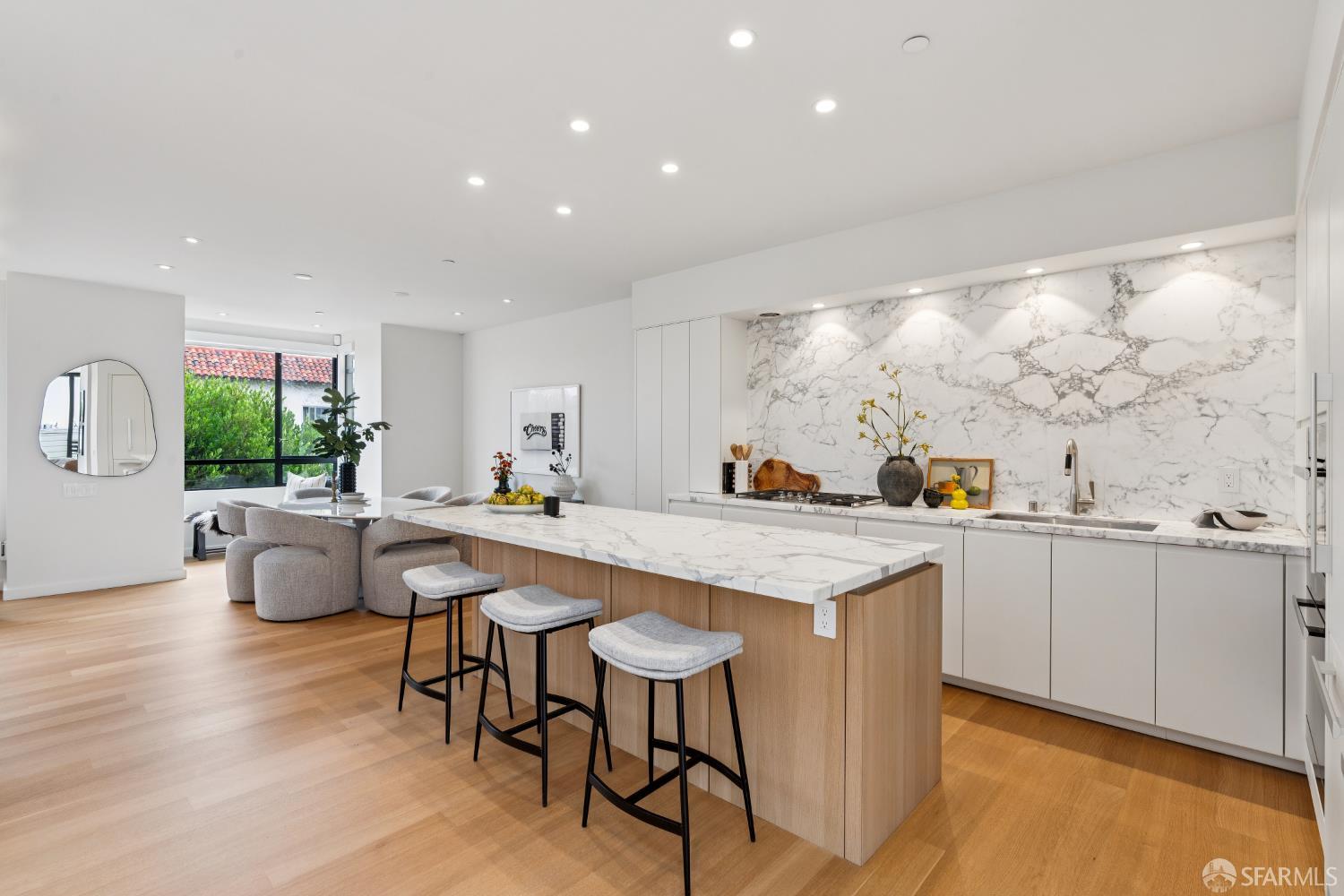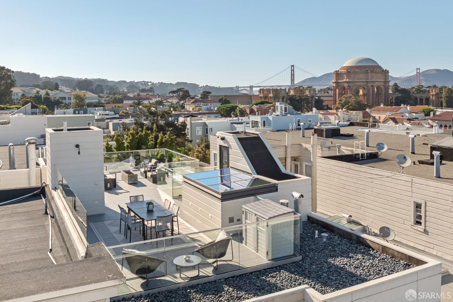 Perched atop the Marina, 3307 Broderick is a rare modern penthouse designed for effortless indoor/outdoor living. Completed in 2016 within an exclusive two-unit building and accessed by private elevator, this 4-bedroom, 3.5-bath home spans two levels and culminates in a deeded 690 sf private roof deck with a fire pit and sweeping 360 views of the Golden Gate Bridge, Palace of Fine Arts, and city skyline. The upper level offers a grand entertaining space where expansive Bonelli retractable doors open to a west-facing 285 sf terrace, perfect for dining al fresco or gathering with friends. The chef's kitchen boasts Miele appliances, a wine refrigerator, and a striking Statuario Carrara marble island. All bedrooms occupy one level, including a serene primary suite with spa-inspired bath, soaking tub, double vanity, and walk-in closet. High ceilings, radiant-heated oak floors, skylights, and integrated smart-home features complement deeded garage parking. Just steps from the Marina Green and Chestnut Street's vibrant shops and dining, this residence offers San Francisco luxury at its finest.