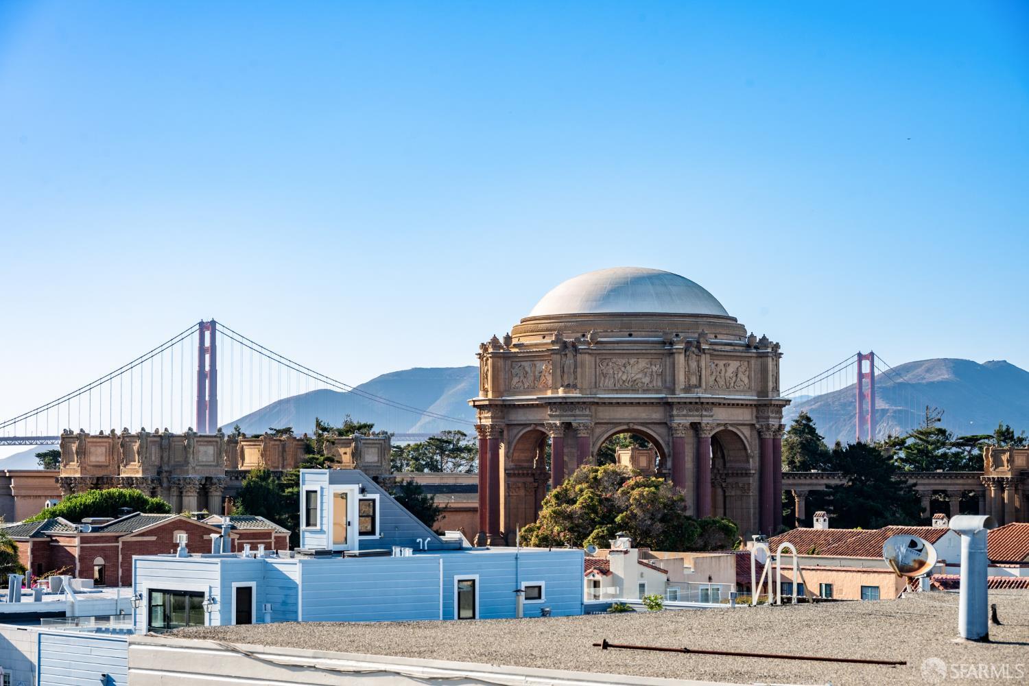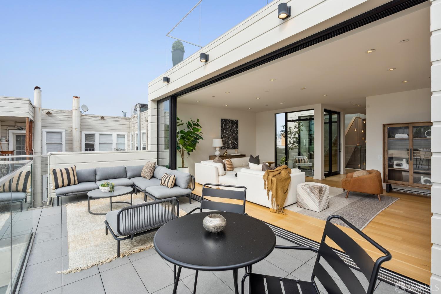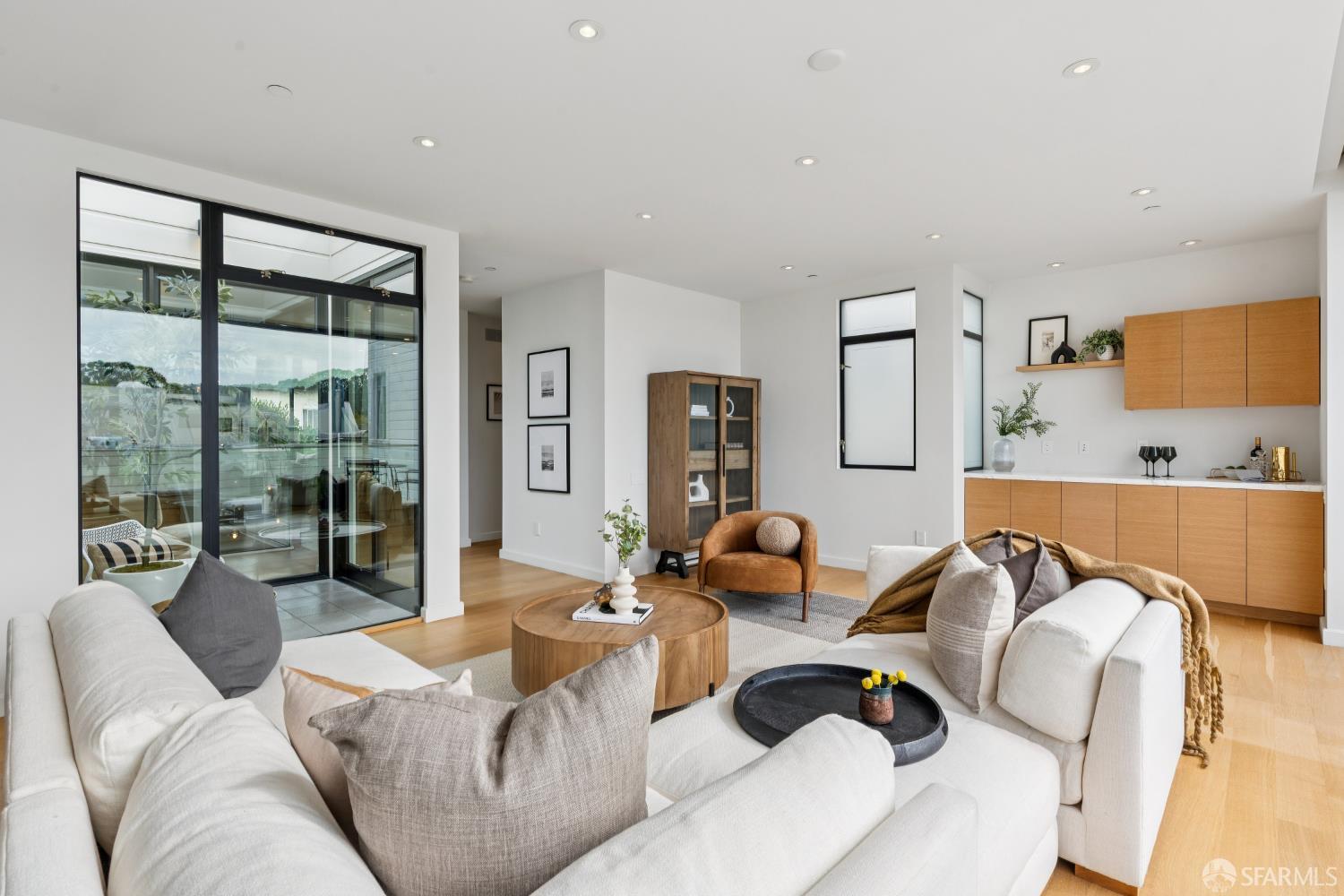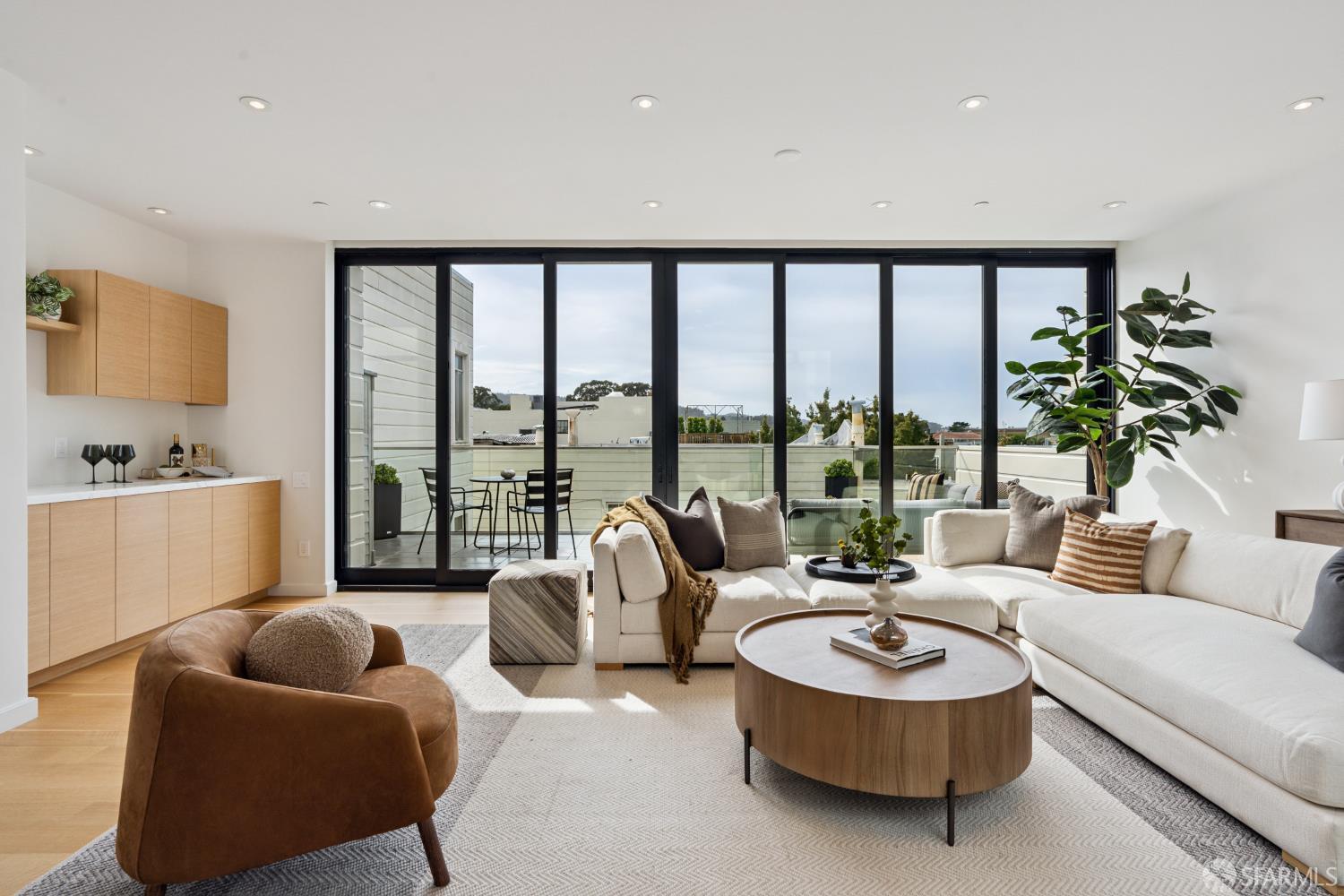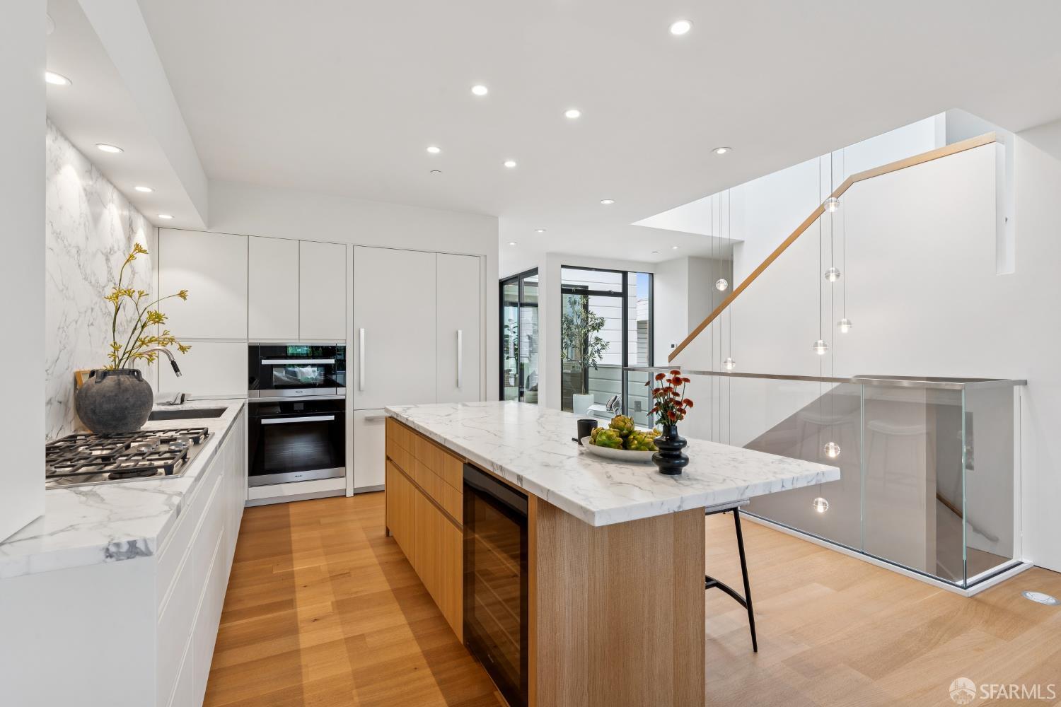 Perched atop the Marina, 3307 Broderick is a rare modern penthouse designed for effortless indoor/outdoor living. Completed in 2016 within an exclusive two-unit building and accessed by private elevator, this 4-bedroom, 3.5-bath home spans two levels and culminates in a deeded 690 sf private roof deck with a fire pit and sweeping 360 views of the Golden Gate Bridge, Palace of Fine Arts, and city skyline. The upper level offers a grand entertaining space where expansive Bonelli retractable doors open to a west-facing 285 sf terrace, perfect for dining al fresco or gathering with friends. The chef's kitchen boasts Miele appliances, a wine refrigerator, and a striking Statuario Carrara marble island. All bedrooms occupy one level, including a serene primary suite with spa-inspired bath, soaking tub, double vanity, and walk-in closet. High ceilings, radiant-heated oak floors, skylights, and integrated smart-home features complement deeded garage parking. Just steps from the Marina Green and Chestnut Street's vibrant shops and dining, this residence offers San Francisco luxury at its finest.