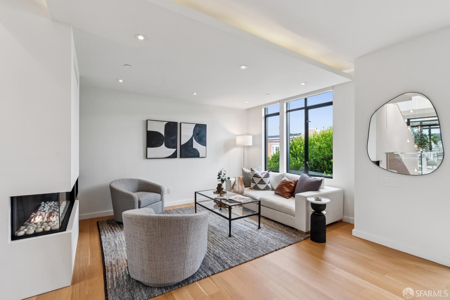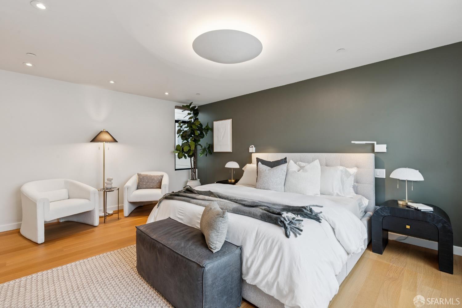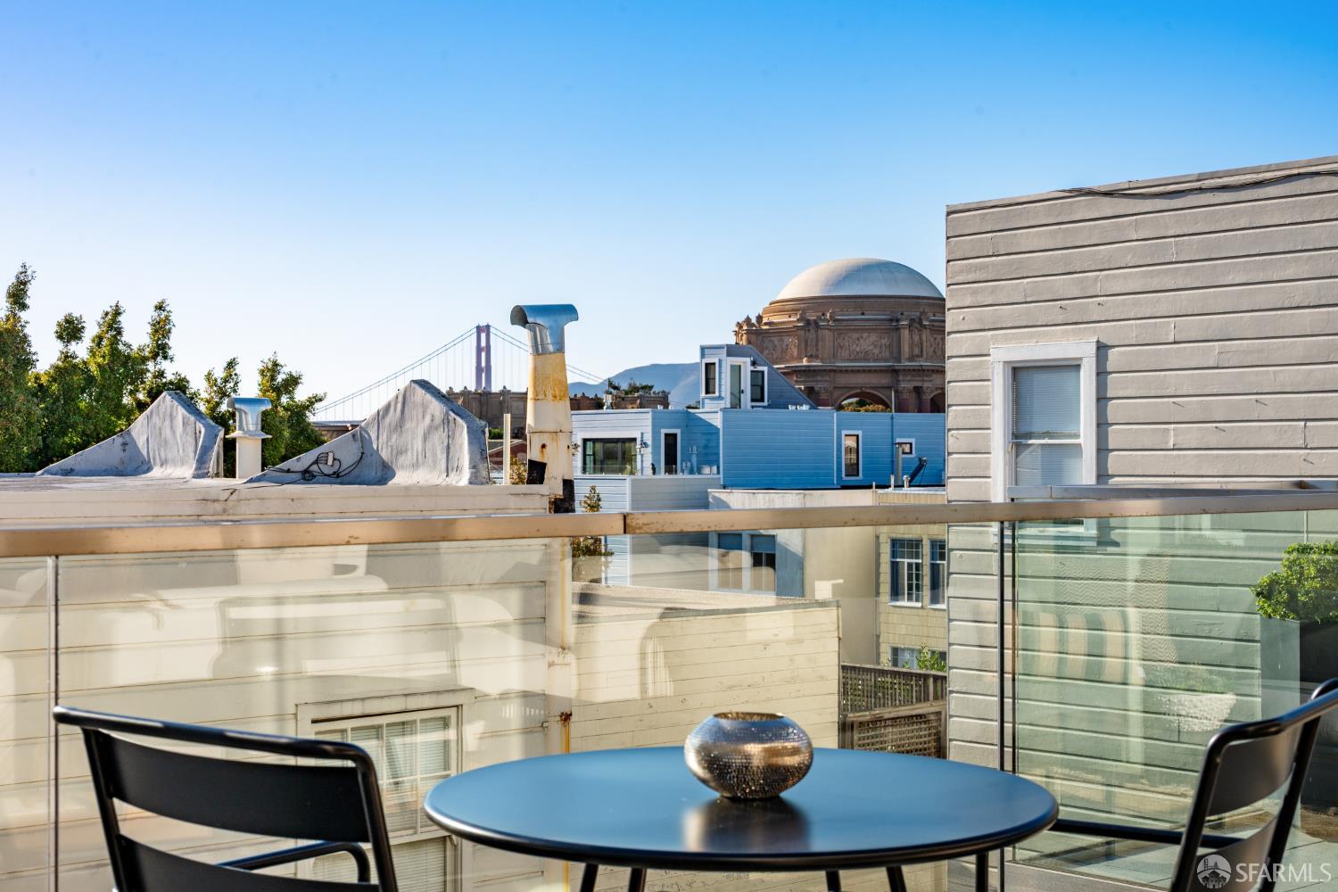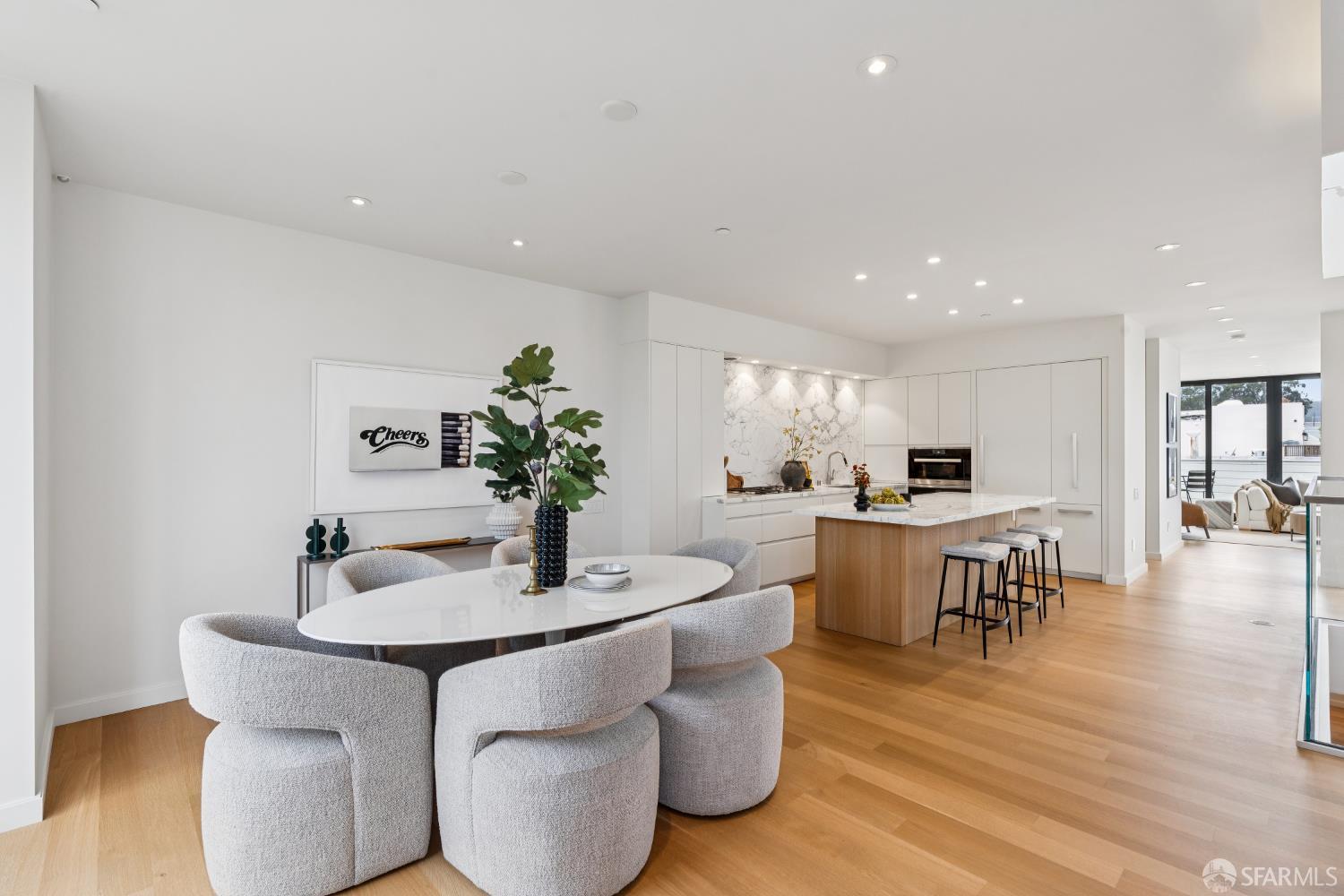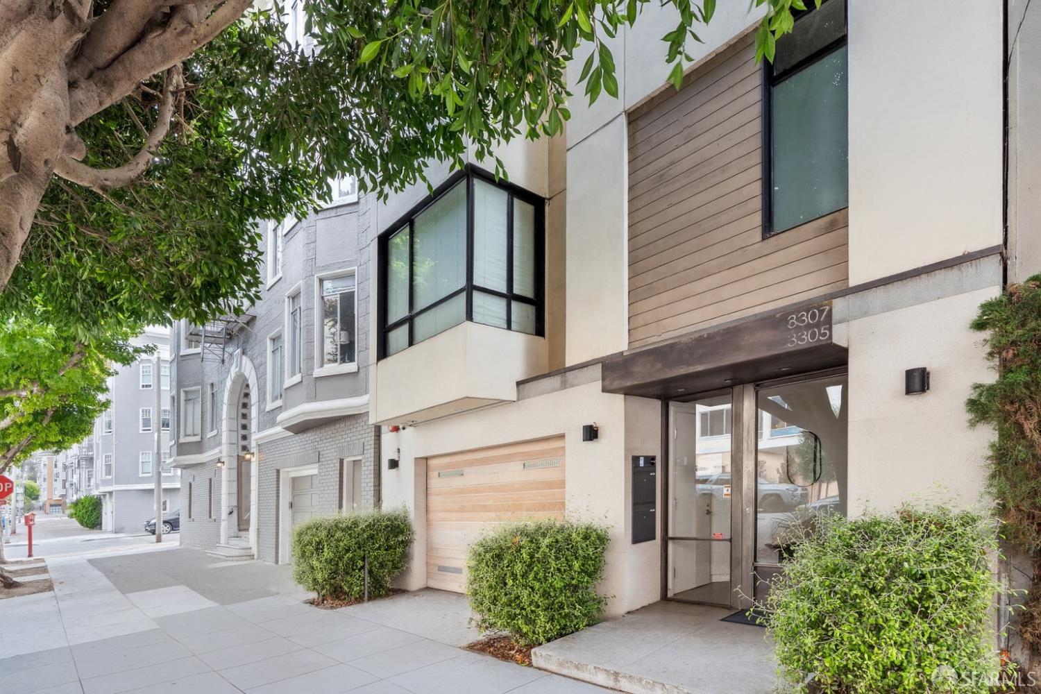 Perched atop the Marina, 3307 Broderick is a rare modern penthouse designed for effortless indoor/outdoor living. Completed in 2016 within an exclusive two-unit building and accessed by private elevator, this 4-bedroom, 3.5-bath home spans two levels and culminates in a deeded 690 sf private roof deck with a fire pit and sweeping 360 views of the Golden Gate Bridge, Palace of Fine Arts, and city skyline. The upper level offers a grand entertaining space where expansive Bonelli retractable doors open to a west-facing 285 sf terrace, perfect for dining al fresco or gathering with friends. The chef's kitchen boasts Miele appliances, a wine refrigerator, and a striking Statuario Carrara marble island. All bedrooms occupy one level, including a serene primary suite with spa-inspired bath, soaking tub, double vanity, and walk-in closet. High ceilings, radiant-heated oak floors, skylights, and integrated smart-home features complement deeded garage parking. Just steps from the Marina Green and Chestnut Street's vibrant shops and dining, this residence offers San Francisco luxury at its finest.