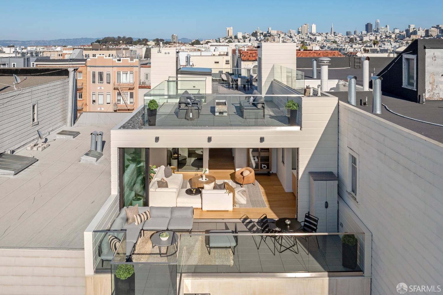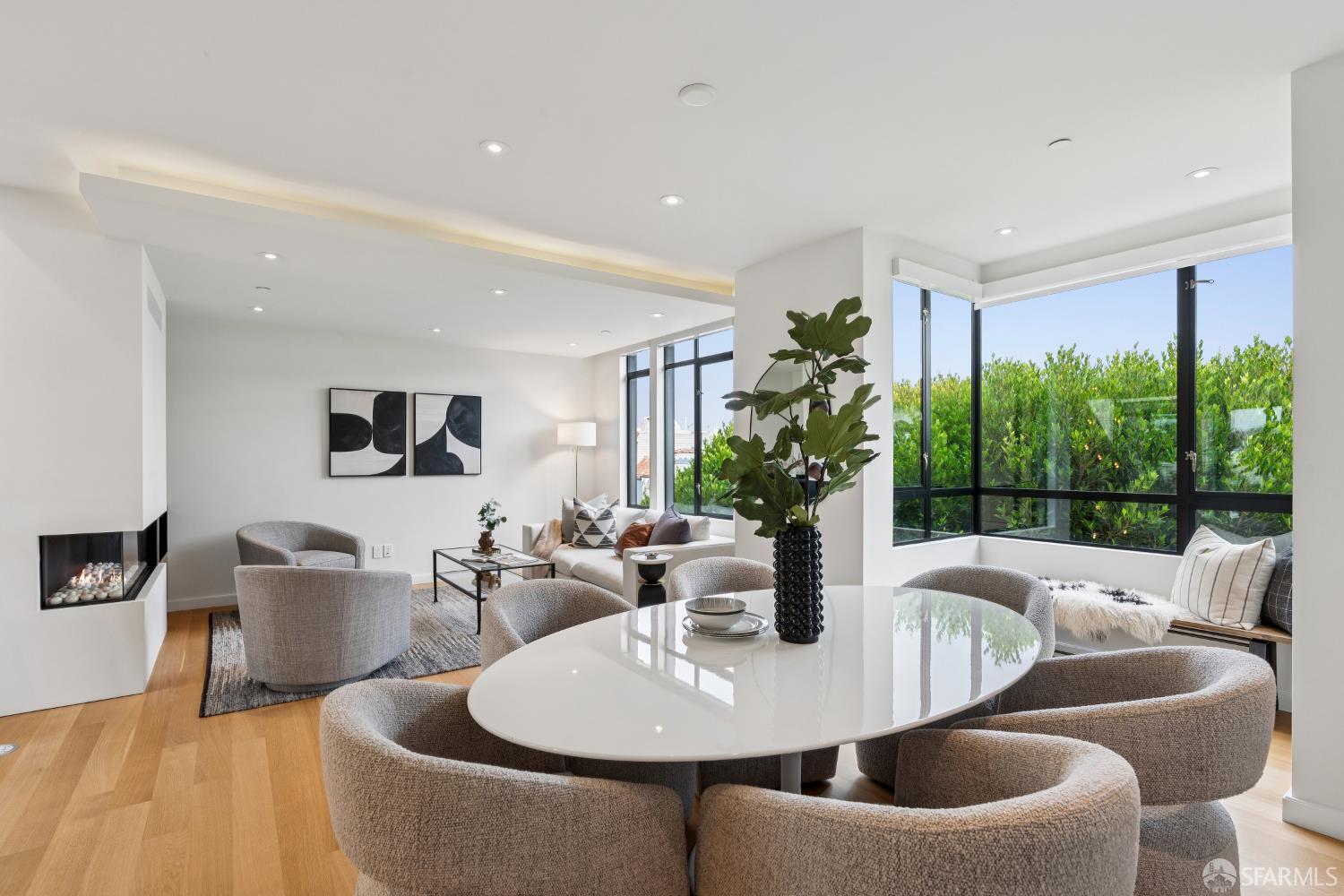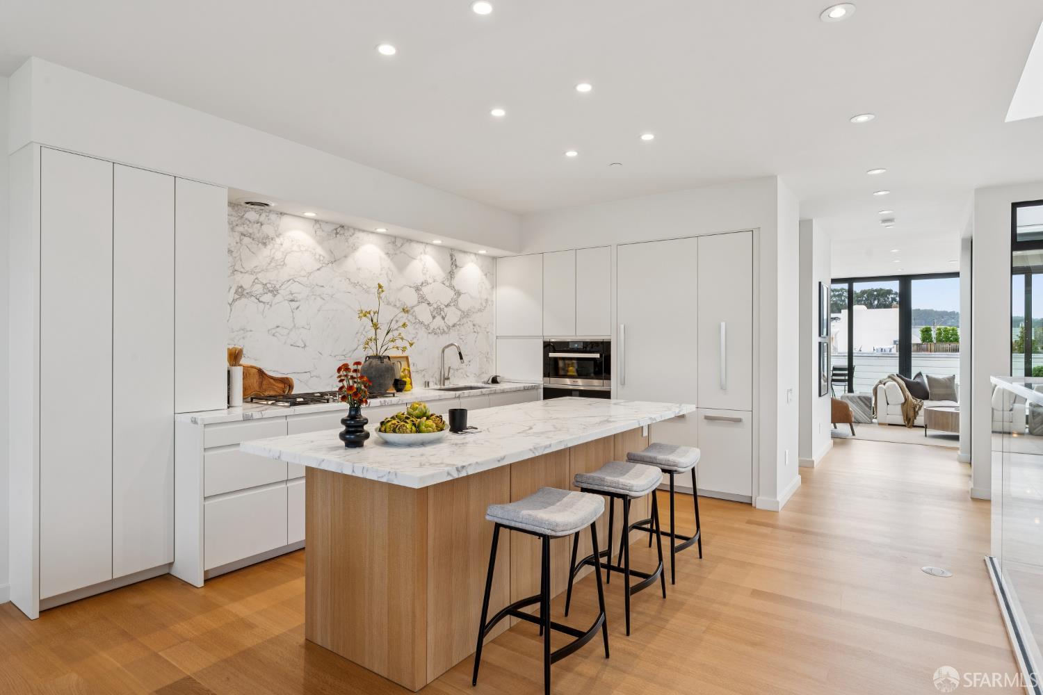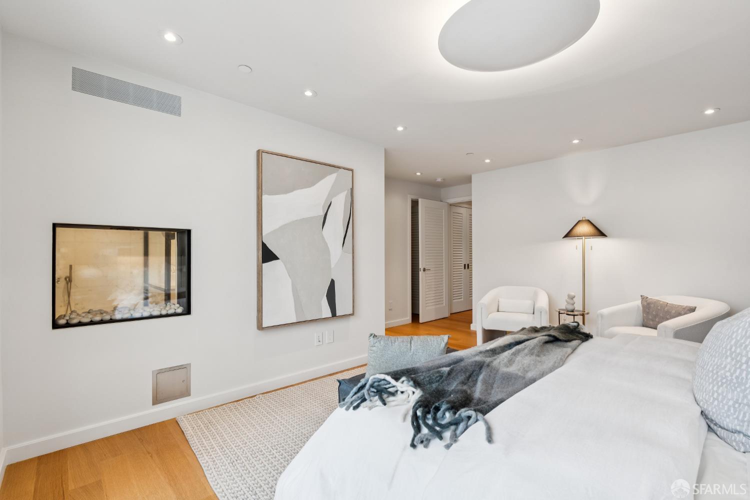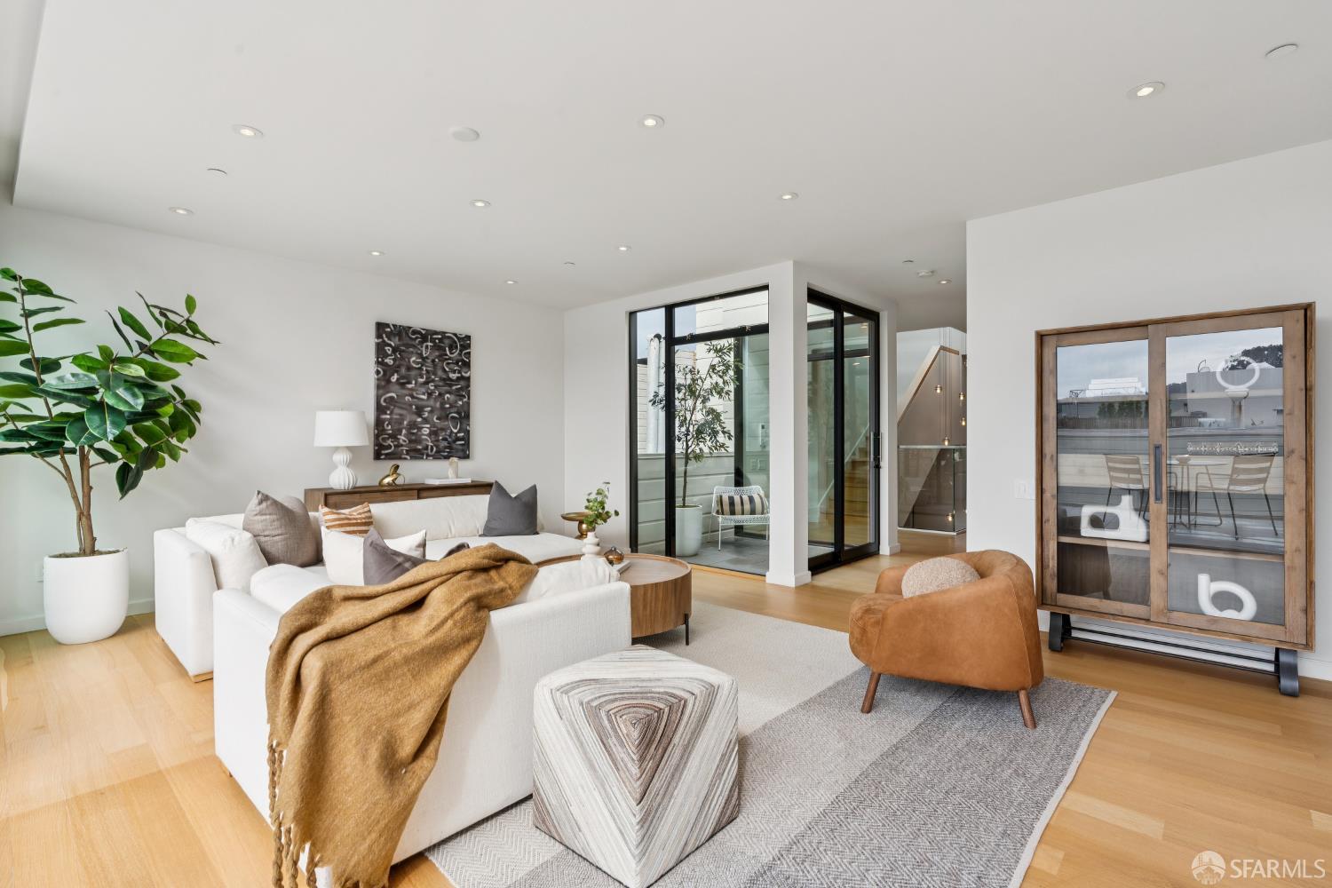 Perched atop the Marina, 3307 Broderick is a rare modern penthouse designed for effortless indoor/outdoor living. Completed in 2016 within an exclusive two-unit building and accessed by private elevator, this 4-bedroom, 3.5-bath home spans two levels and culminates in a deeded 690 sf private roof deck with a fire pit and sweeping 360 views of the Golden Gate Bridge, Palace of Fine Arts, and city skyline. The upper level offers a grand entertaining space where expansive Bonelli retractable doors open to a west-facing 285 sf terrace, perfect for dining al fresco or gathering with friends. The chef's kitchen boasts Miele appliances, a wine refrigerator, and a striking Statuario Carrara marble island. All bedrooms occupy one level, including a serene primary suite with spa-inspired bath, soaking tub, double vanity, and walk-in closet. High ceilings, radiant-heated oak floors, skylights, and integrated smart-home features complement deeded garage parking. Just steps from the Marina Green and Chestnut Street's vibrant shops and dining, this residence offers San Francisco luxury at its finest.