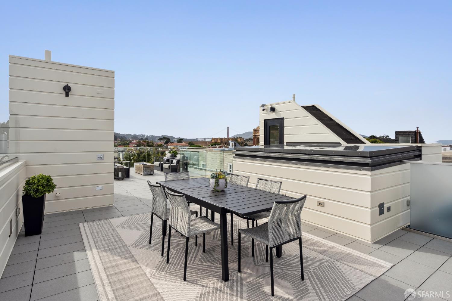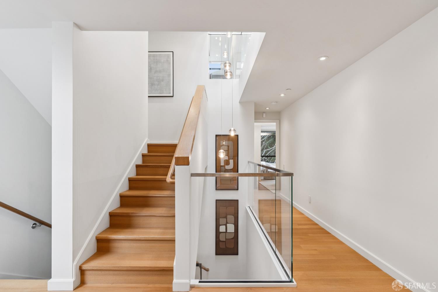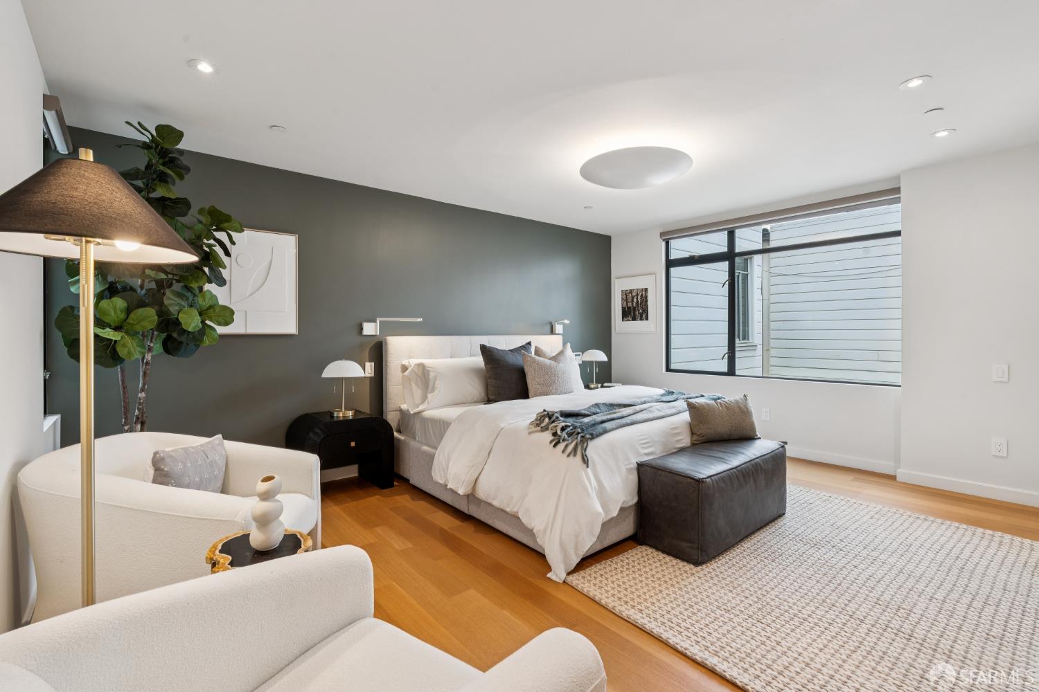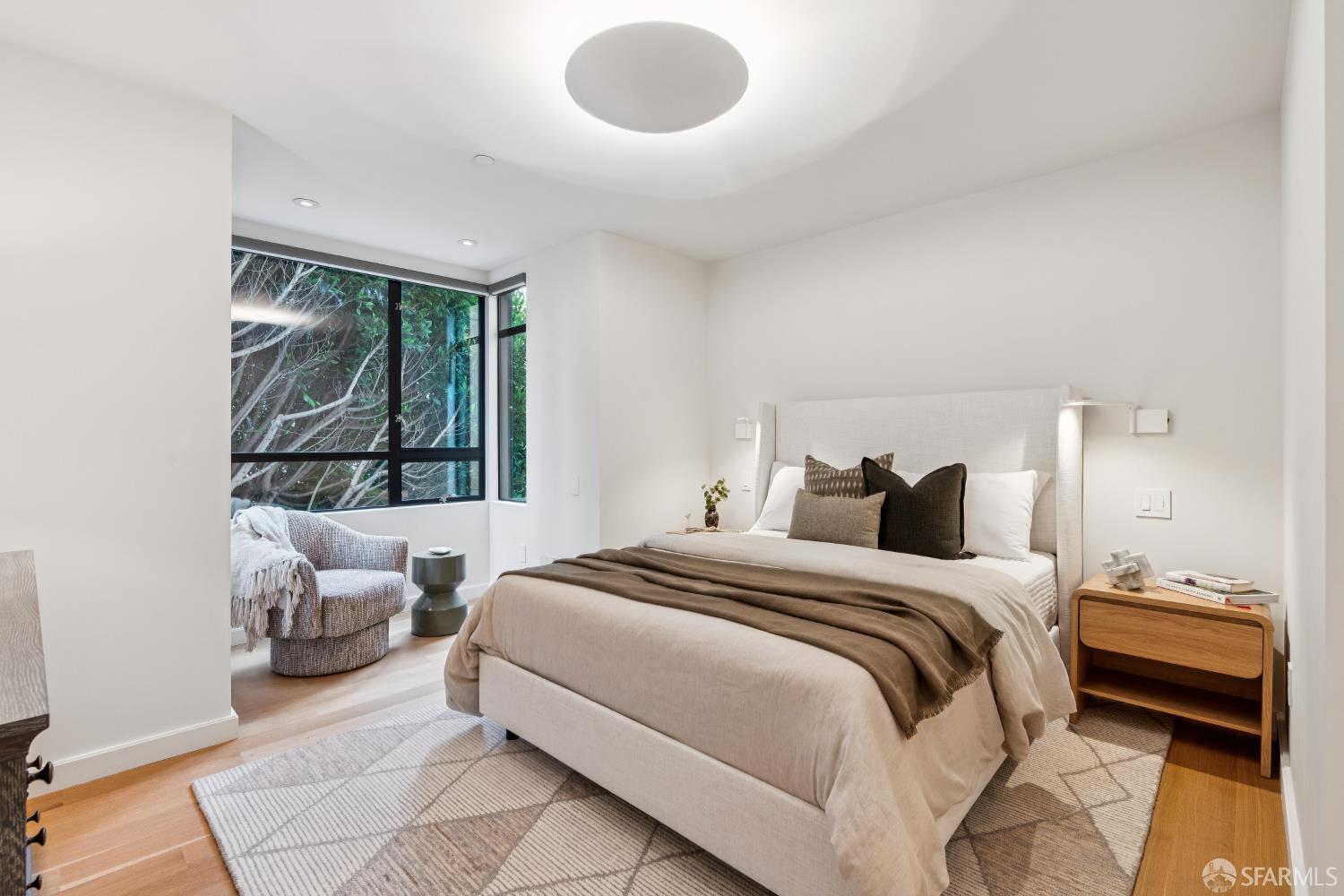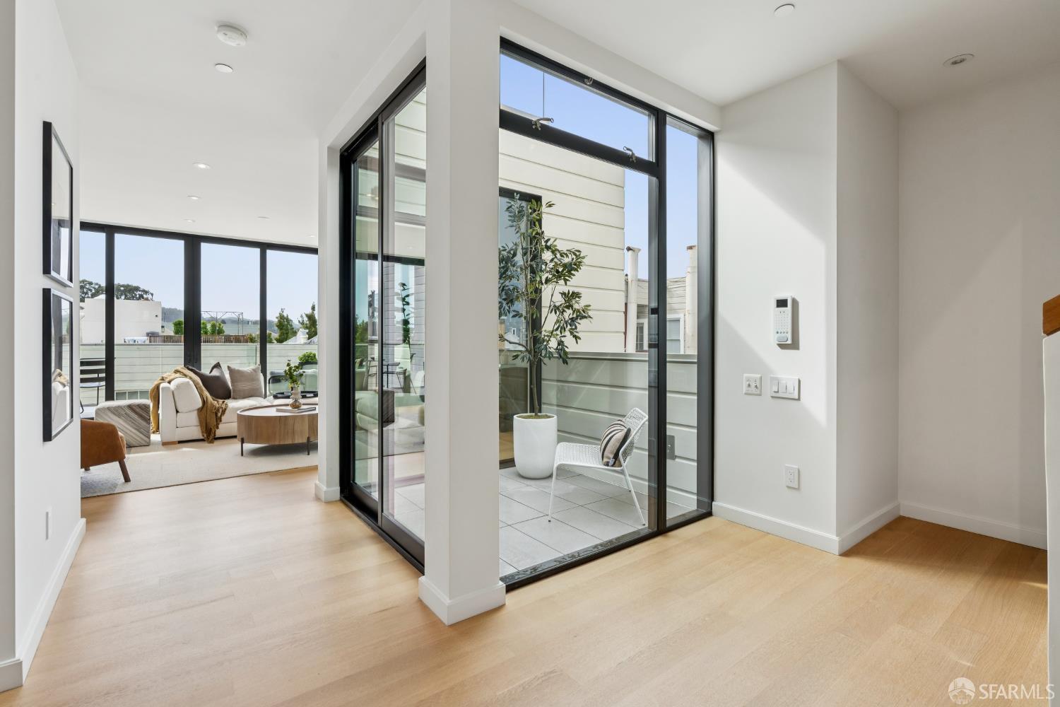 Perched atop the Marina, 3307 Broderick is a rare modern penthouse designed for effortless indoor/outdoor living. Completed in 2016 within an exclusive two-unit building and accessed by private elevator, this 4-bedroom, 3.5-bath home spans two levels and culminates in a deeded 690 sf private roof deck with a fire pit and sweeping 360 views of the Golden Gate Bridge, Palace of Fine Arts, and city skyline. The upper level offers a grand entertaining space where expansive Bonelli retractable doors open to a west-facing 285 sf terrace, perfect for dining al fresco or gathering with friends. The chef's kitchen boasts Miele appliances, a wine refrigerator, and a striking Statuario Carrara marble island. All bedrooms occupy one level, including a serene primary suite with spa-inspired bath, soaking tub, double vanity, and walk-in closet. High ceilings, radiant-heated oak floors, skylights, and integrated smart-home features complement deeded garage parking. Just steps from the Marina Green and Chestnut Street's vibrant shops and dining, this residence offers San Francisco luxury at its finest.