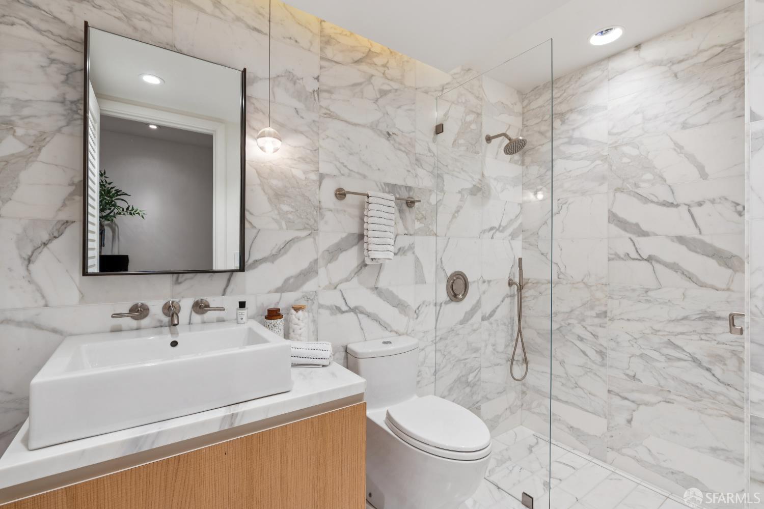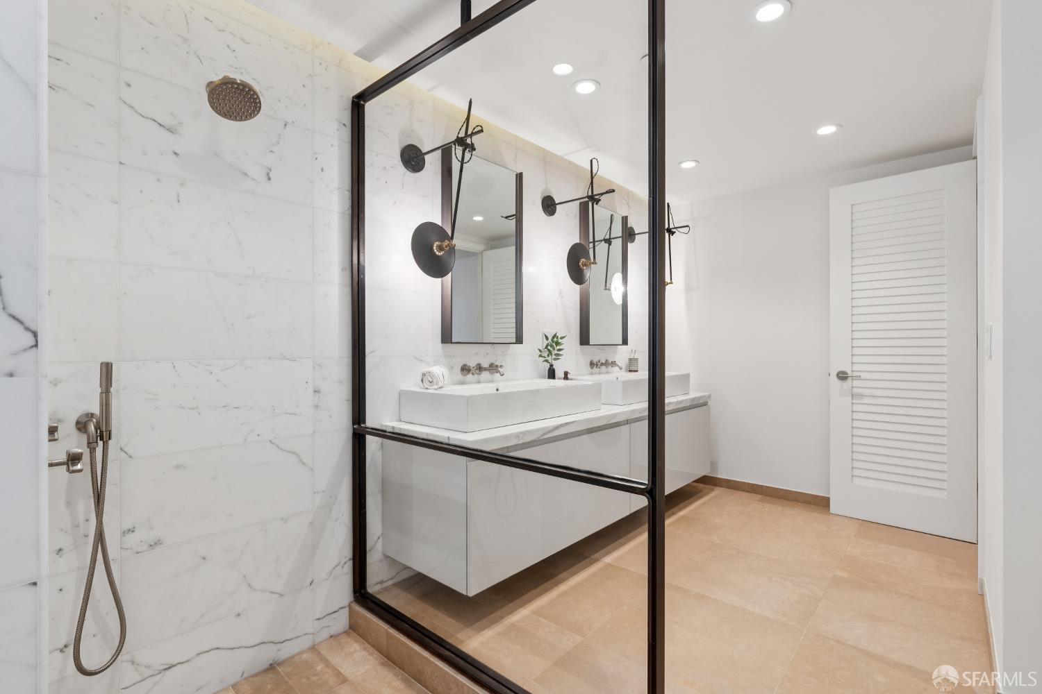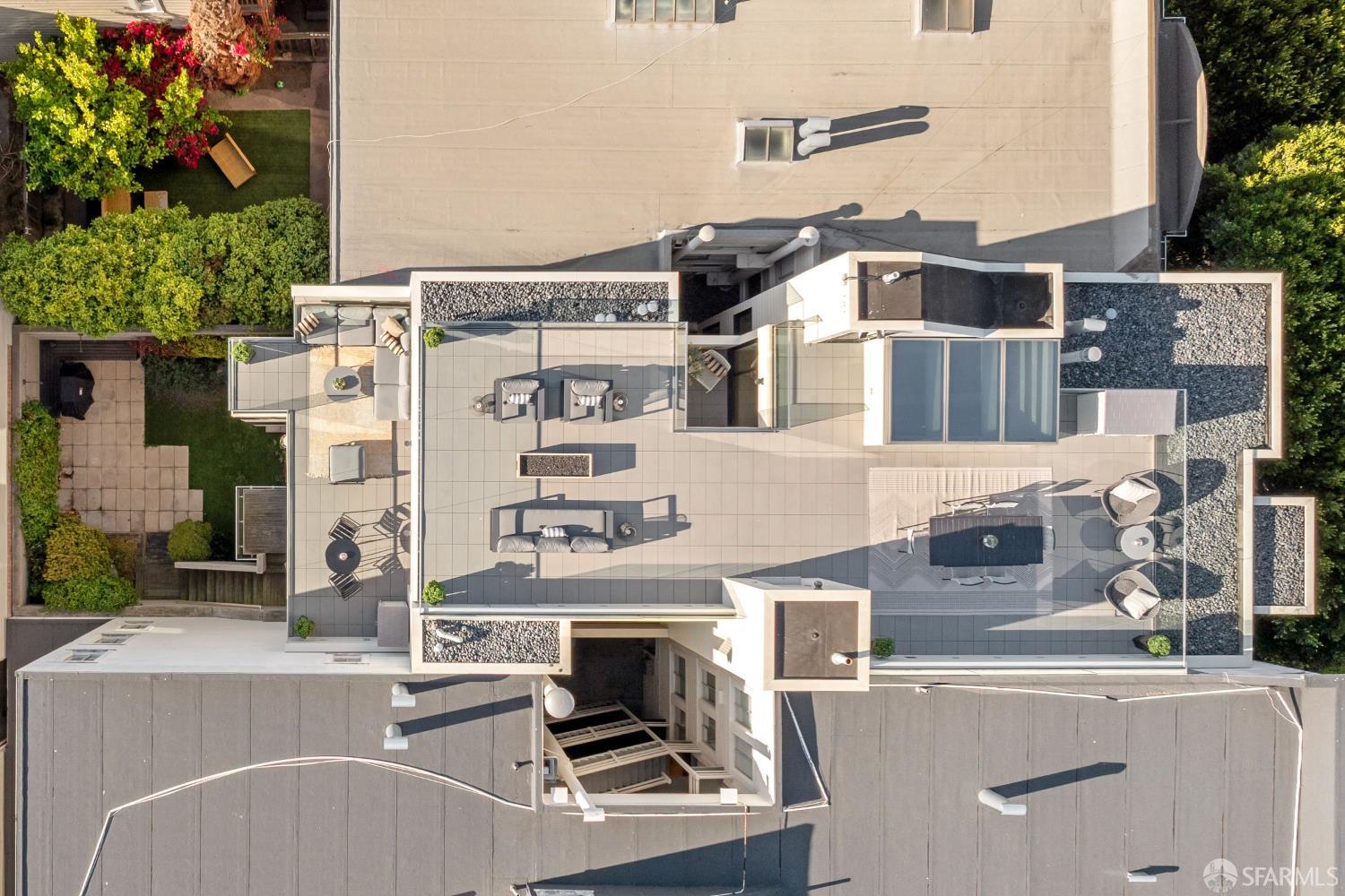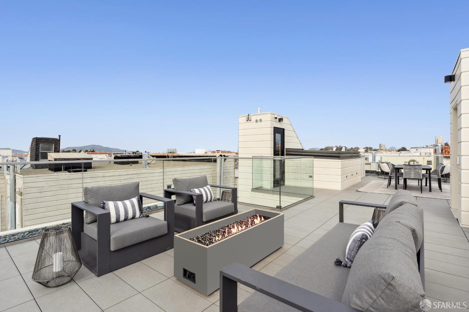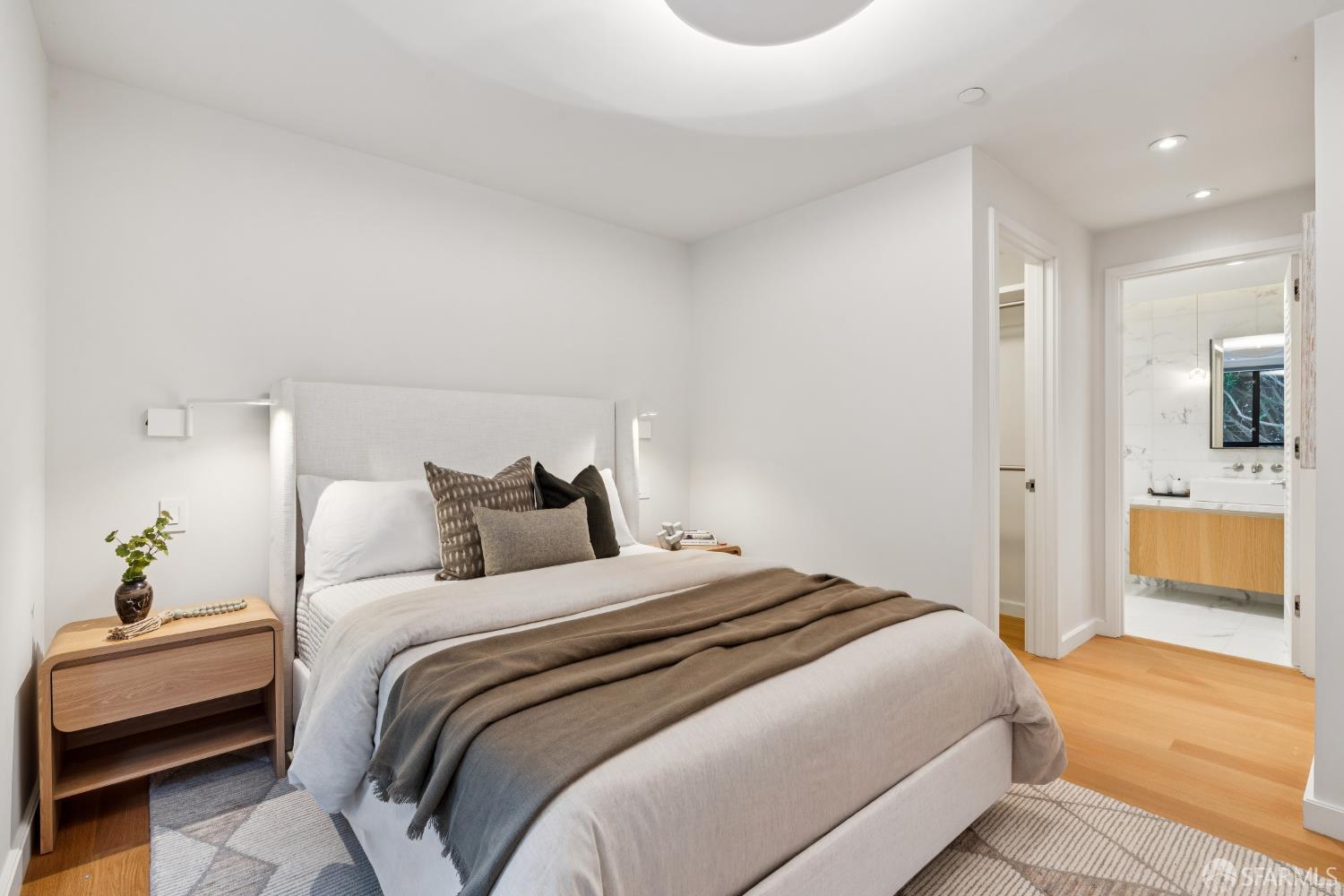 Perched atop the Marina, 3307 Broderick is a rare modern penthouse designed for effortless indoor/outdoor living. Completed in 2016 within an exclusive two-unit building and accessed by private elevator, this 4-bedroom, 3.5-bath home spans two levels and culminates in a deeded 690 sf private roof deck with a fire pit and sweeping 360 views of the Golden Gate Bridge, Palace of Fine Arts, and city skyline. The upper level offers a grand entertaining space where expansive Bonelli retractable doors open to a west-facing 285 sf terrace, perfect for dining al fresco or gathering with friends. The chef's kitchen boasts Miele appliances, a wine refrigerator, and a striking Statuario Carrara marble island. All bedrooms occupy one level, including a serene primary suite with spa-inspired bath, soaking tub, double vanity, and walk-in closet. High ceilings, radiant-heated oak floors, skylights, and integrated smart-home features complement deeded garage parking. Just steps from the Marina Green and Chestnut Street's vibrant shops and dining, this residence offers San Francisco luxury at its finest.