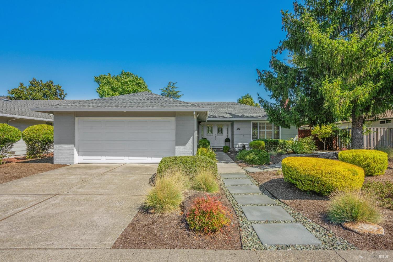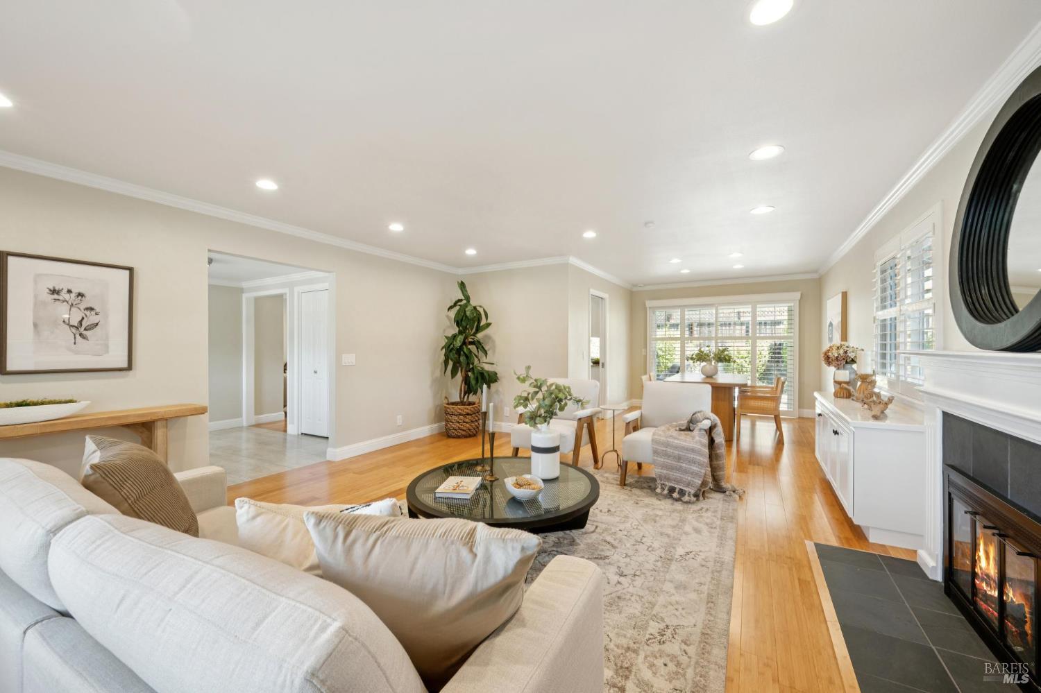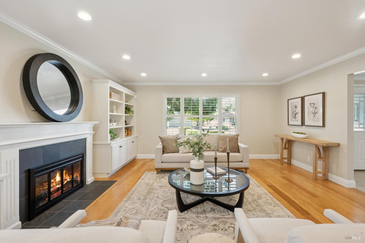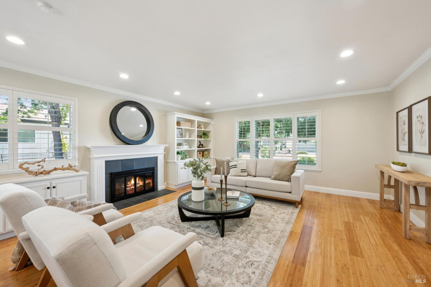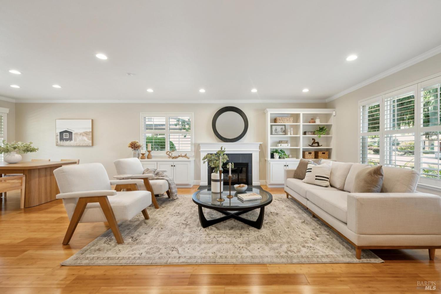 Pristine home with classic beauty and thoughtful updates throughout. This 2-bedroom, 2-bath residence with an additional den features gleaming bamboo flooring and abundant natural light. The spacious living room offers crown molding, plantation shutters, a gas fireplace with timeless surround, and built-in bookcases for charm and function. The bright kitchen includes granite countertops and white cabinetry, opening to a cozy den or dining area. Updated baths feature a tub/shower combo in one and dual sinks with a walk-in shower in the primary suite. Additional upgrades include a new electrical panel and a whole-house generator. Lovely gardens surround the expansive back patio, where a covered outdoor seating area provides year-round living space, perfect for entertaining friends and family. Nestled in Oakmont, a 55+ community in Sonoma County offering golf courses, clubhouses, swimming pools, and scenic trails. Enjoy the wide, quiet street and surrounding hills in this move-in ready home!