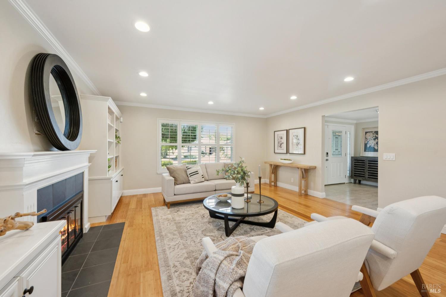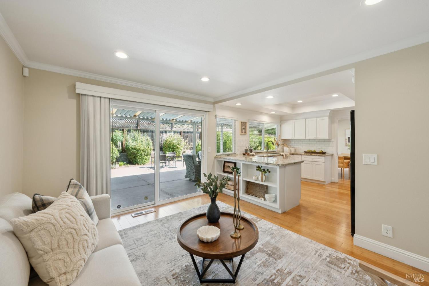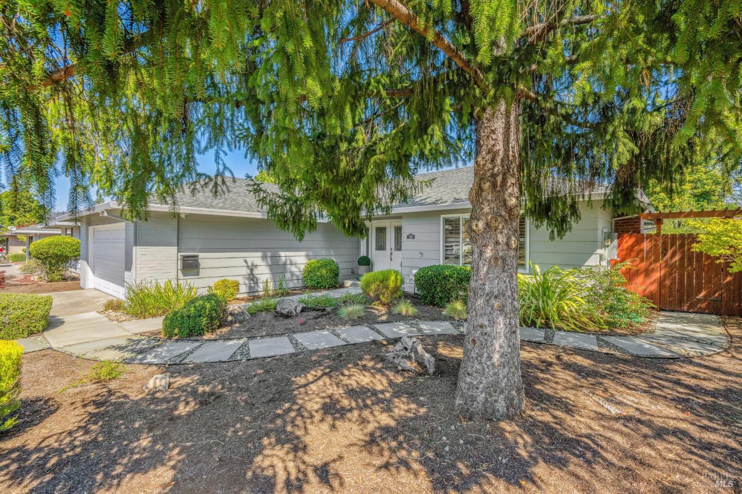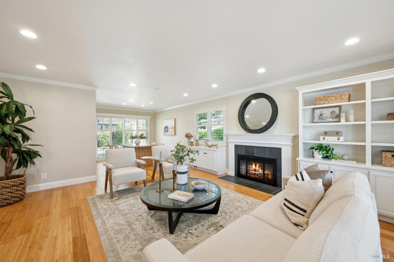 Pristine home with classic beauty and thoughtful updates throughout. This 2-bedroom, 2-bath residence with an additional den features gleaming bamboo flooring and abundant natural light. The spacious living room offers crown molding, plantation shutters, a gas fireplace with timeless surround, and built-in bookcases for charm and function. The bright kitchen includes granite countertops and white cabinetry, opening to a cozy den or dining area. Updated baths feature a tub/shower combo in one and dual sinks with a walk-in shower in the primary suite. Additional upgrades include a new electrical panel and a whole-house generator. Lovely gardens surround the expansive back patio, where a covered outdoor seating area provides year-round living space, perfect for entertaining friends and family. Nestled in Oakmont, a 55+ community in Sonoma County offering golf courses, clubhouses, swimming pools, and scenic trails. Enjoy the wide, quiet street and surrounding hills in this move-in ready home!