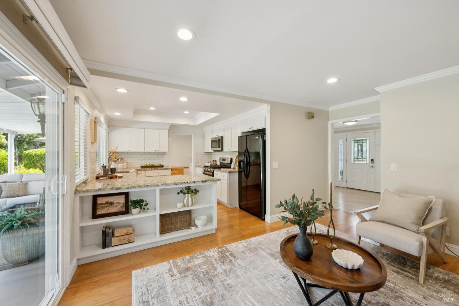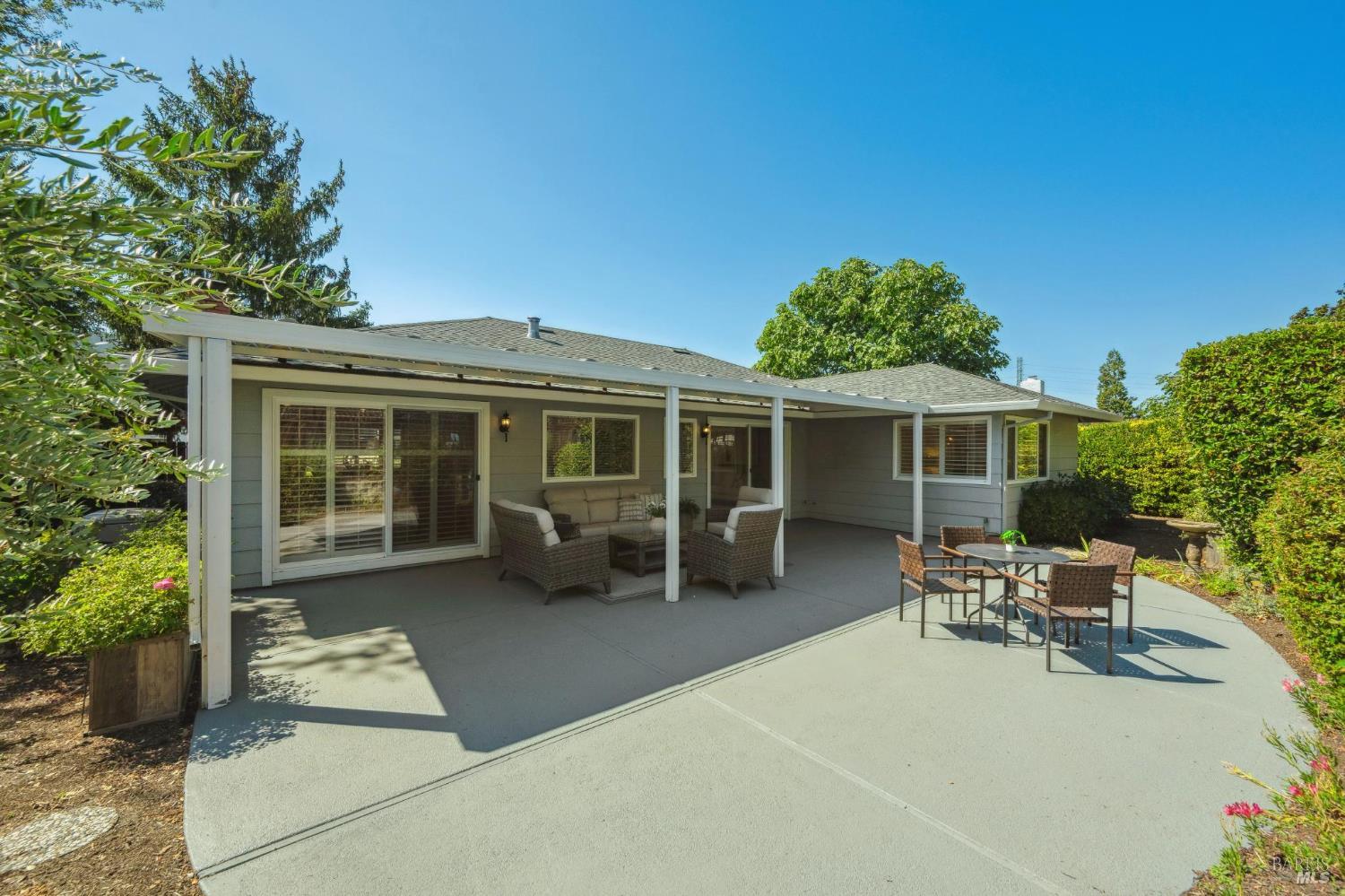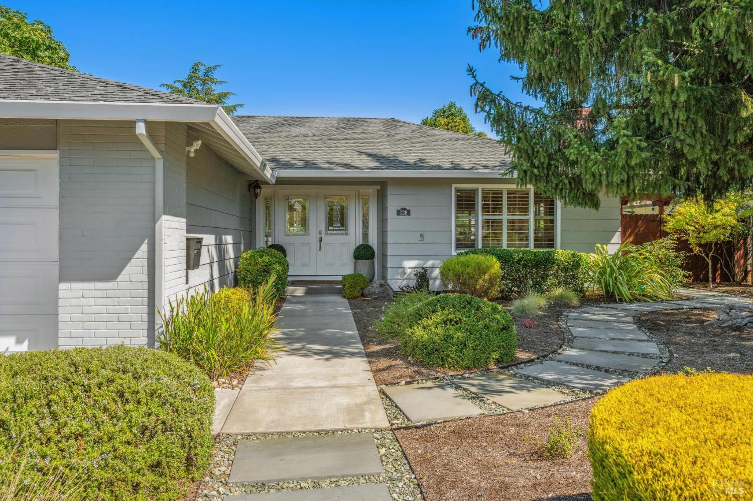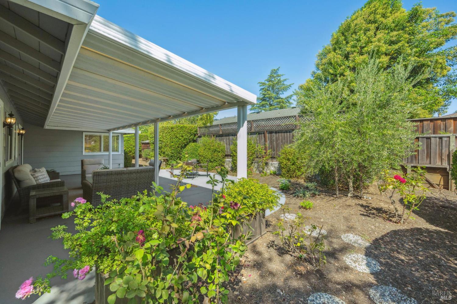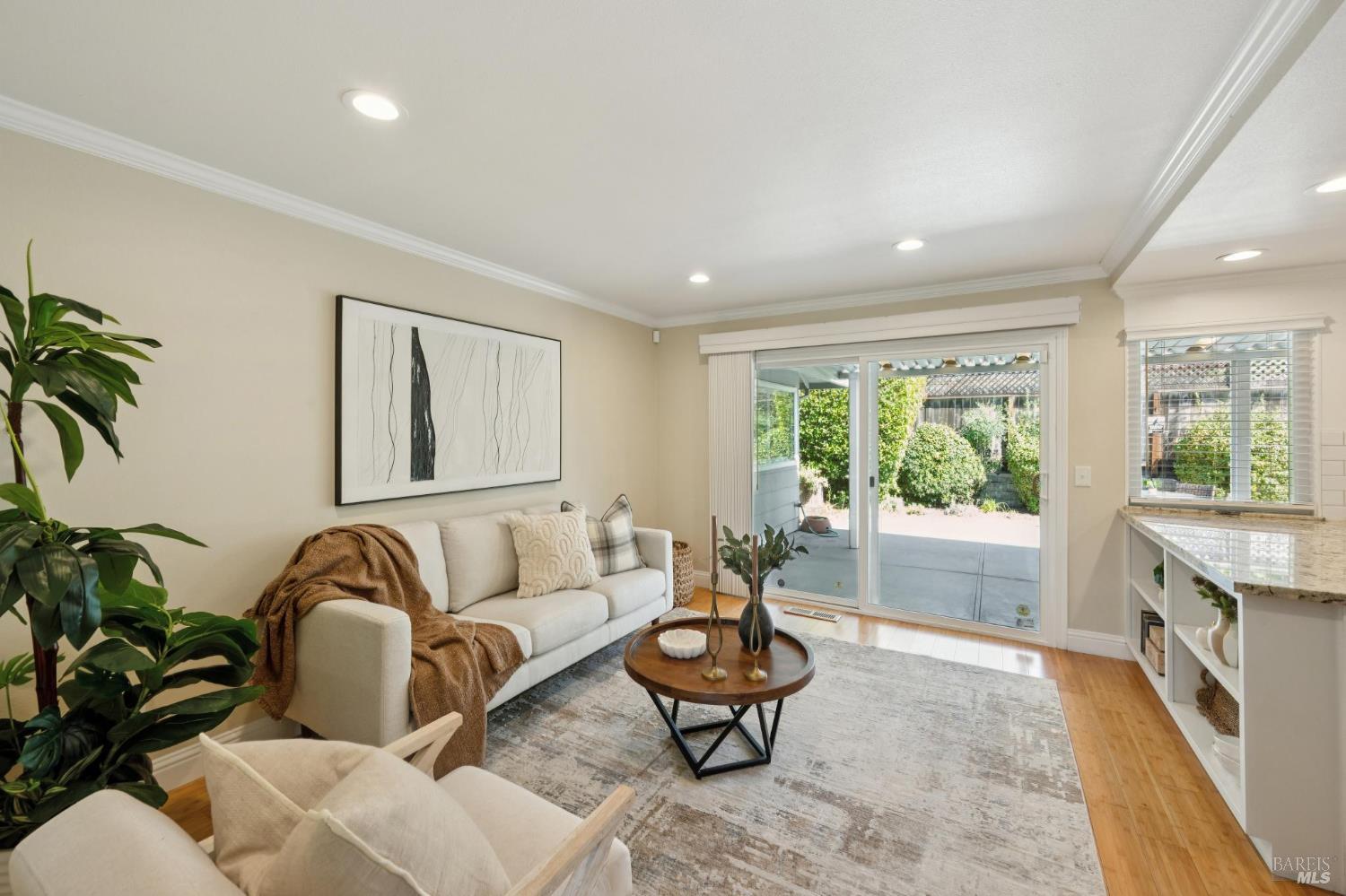 Pristine home with classic beauty and thoughtful updates throughout. This 2-bedroom, 2-bath residence with an additional den features gleaming bamboo flooring and abundant natural light. The spacious living room offers crown molding, plantation shutters, a gas fireplace with timeless surround, and built-in bookcases for charm and function. The bright kitchen includes granite countertops and white cabinetry, opening to a cozy den or dining area. Updated baths feature a tub/shower combo in one and dual sinks with a walk-in shower in the primary suite. Additional upgrades include a new electrical panel and a whole-house generator. Lovely gardens surround the expansive back patio, where a covered outdoor seating area provides year-round living space, perfect for entertaining friends and family. Nestled in Oakmont, a 55+ community in Sonoma County offering golf courses, clubhouses, swimming pools, and scenic trails. Enjoy the wide, quiet street and surrounding hills in this move-in ready home!