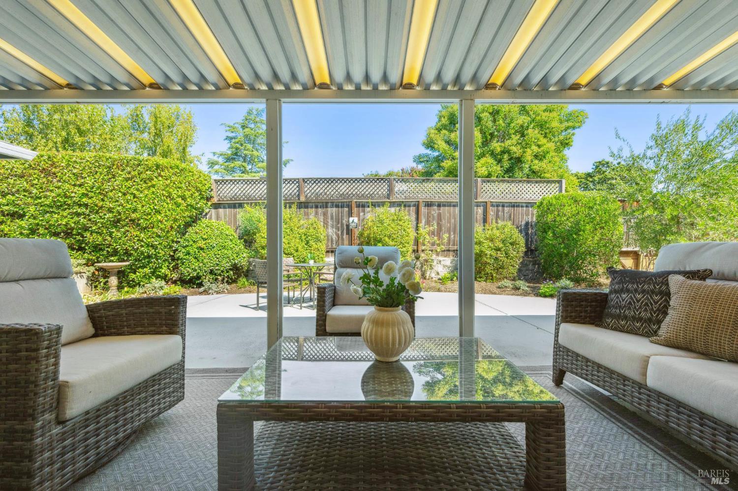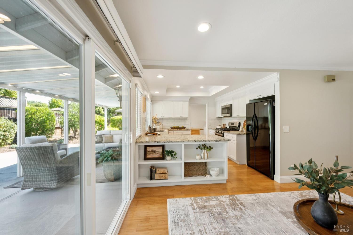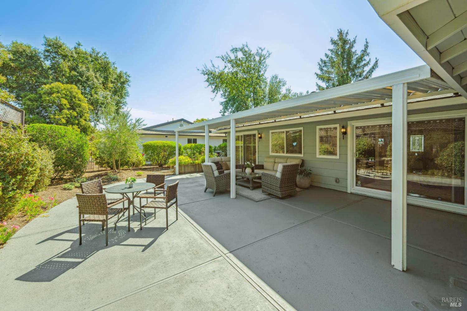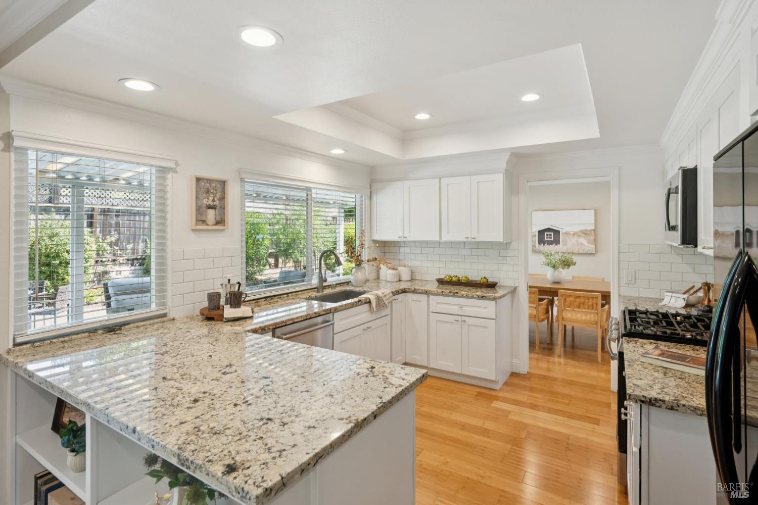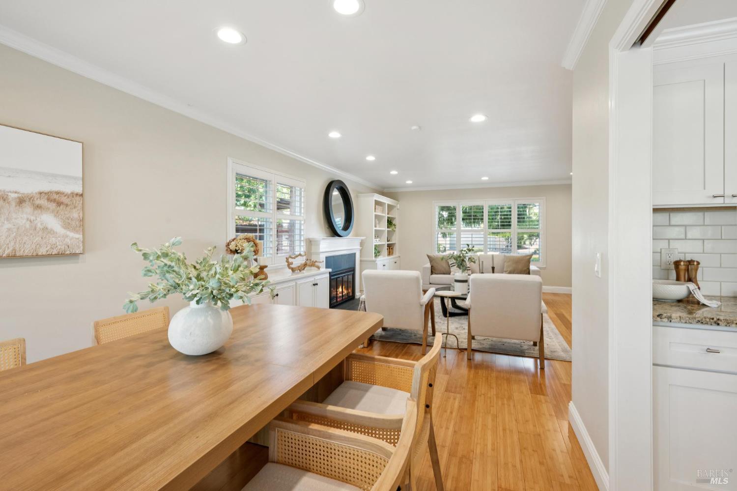 Pristine home with classic beauty and thoughtful updates throughout. This 2-bedroom, 2-bath residence with an additional den features gleaming bamboo flooring and abundant natural light. The spacious living room offers crown molding, plantation shutters, a gas fireplace with timeless surround, and built-in bookcases for charm and function. The bright kitchen includes granite countertops and white cabinetry, opening to a cozy den or dining area. Updated baths feature a tub/shower combo in one and dual sinks with a walk-in shower in the primary suite. Additional upgrades include a new electrical panel and a whole-house generator. Lovely gardens surround the expansive back patio, where a covered outdoor seating area provides year-round living space, perfect for entertaining friends and family. Nestled in Oakmont, a 55+ community in Sonoma County offering golf courses, clubhouses, swimming pools, and scenic trails. Enjoy the wide, quiet street and surrounding hills in this move-in ready home!