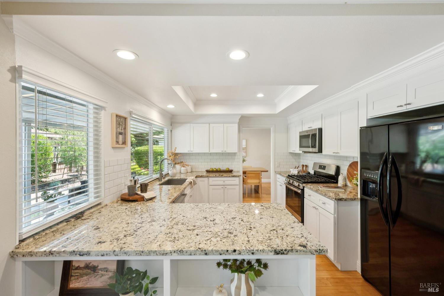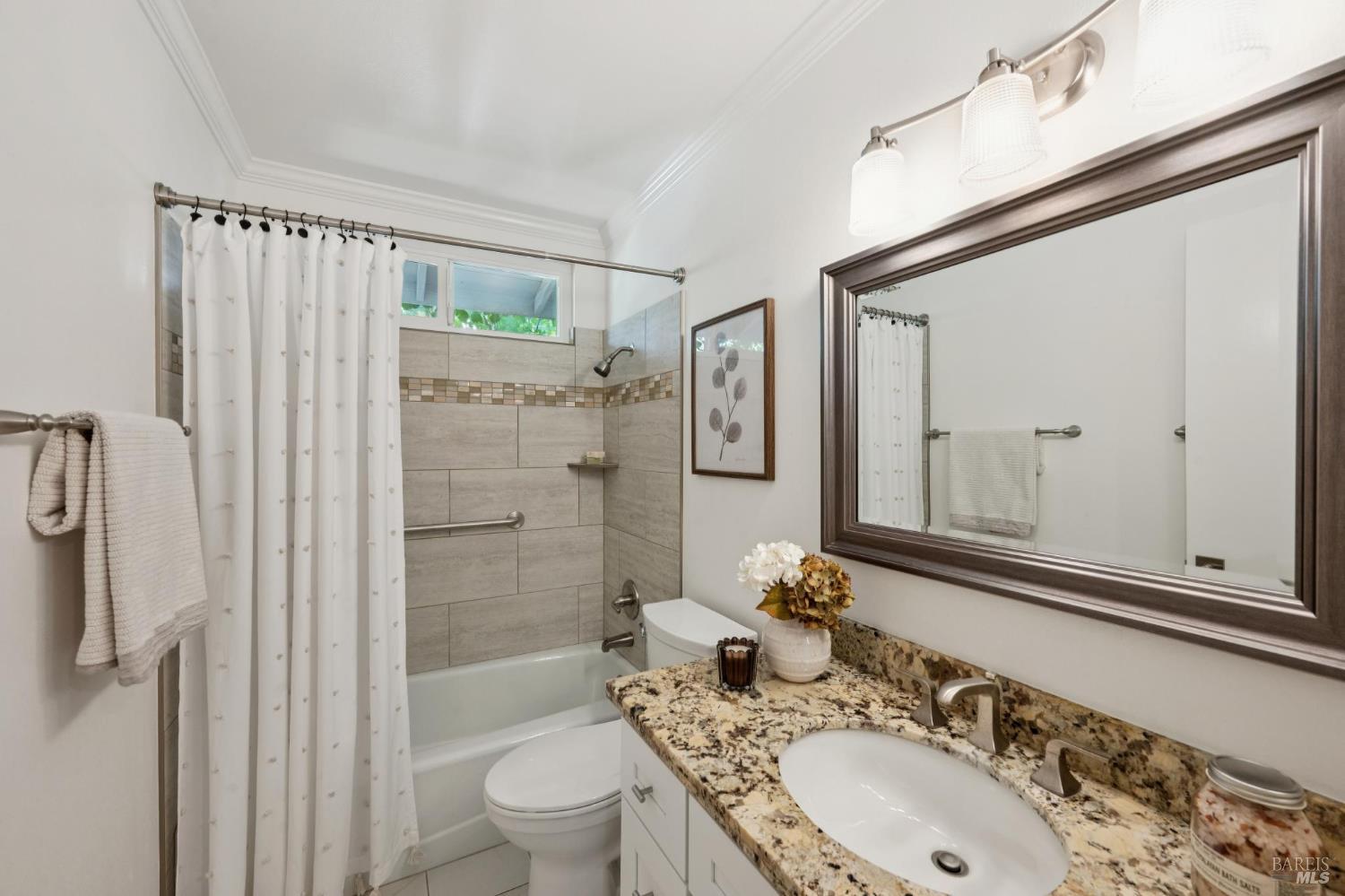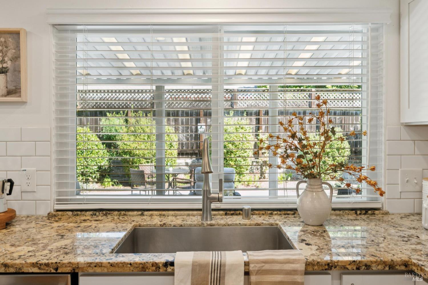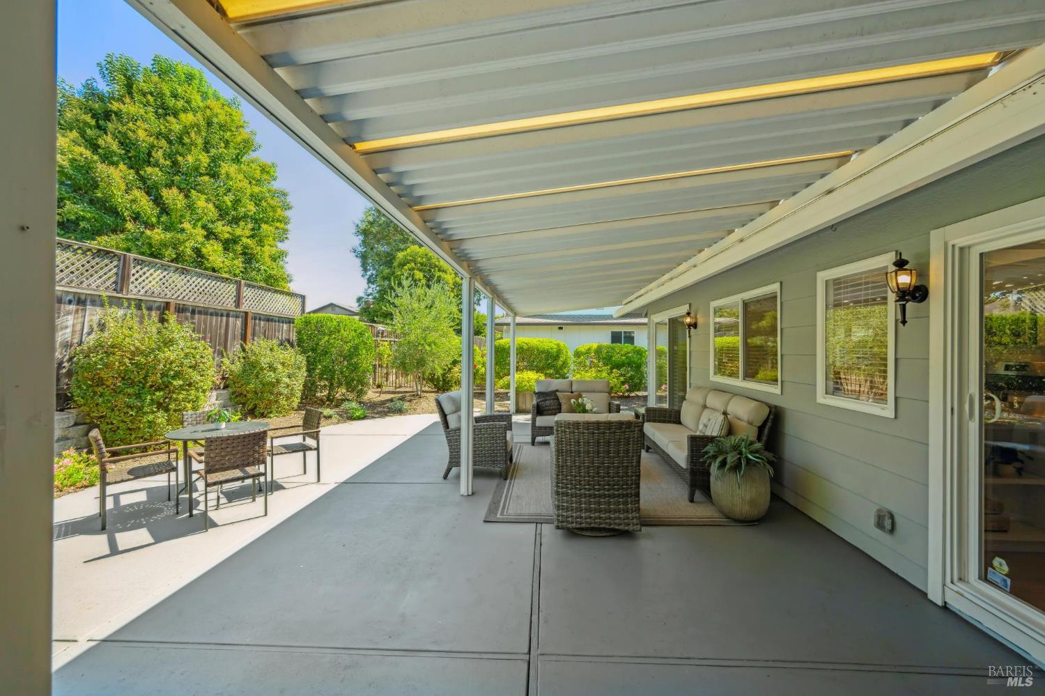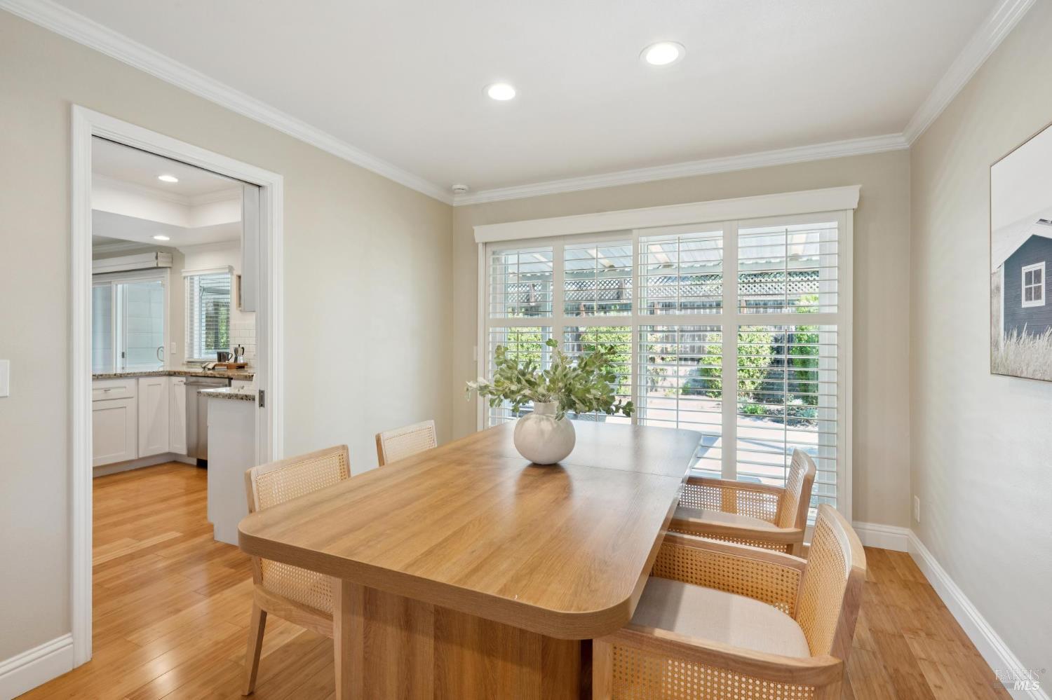 Pristine home with classic beauty and thoughtful updates throughout. This 2-bedroom, 2-bath residence with an additional den features gleaming bamboo flooring and abundant natural light. The spacious living room offers crown molding, plantation shutters, a gas fireplace with timeless surround, and built-in bookcases for charm and function. The bright kitchen includes granite countertops and white cabinetry, opening to a cozy den or dining area. Updated baths feature a tub/shower combo in one and dual sinks with a walk-in shower in the primary suite. Additional upgrades include a new electrical panel and a whole-house generator. Lovely gardens surround the expansive back patio, where a covered outdoor seating area provides year-round living space, perfect for entertaining friends and family. Nestled in Oakmont, a 55+ community in Sonoma County offering golf courses, clubhouses, swimming pools, and scenic trails. Enjoy the wide, quiet street and surrounding hills in this move-in ready home!