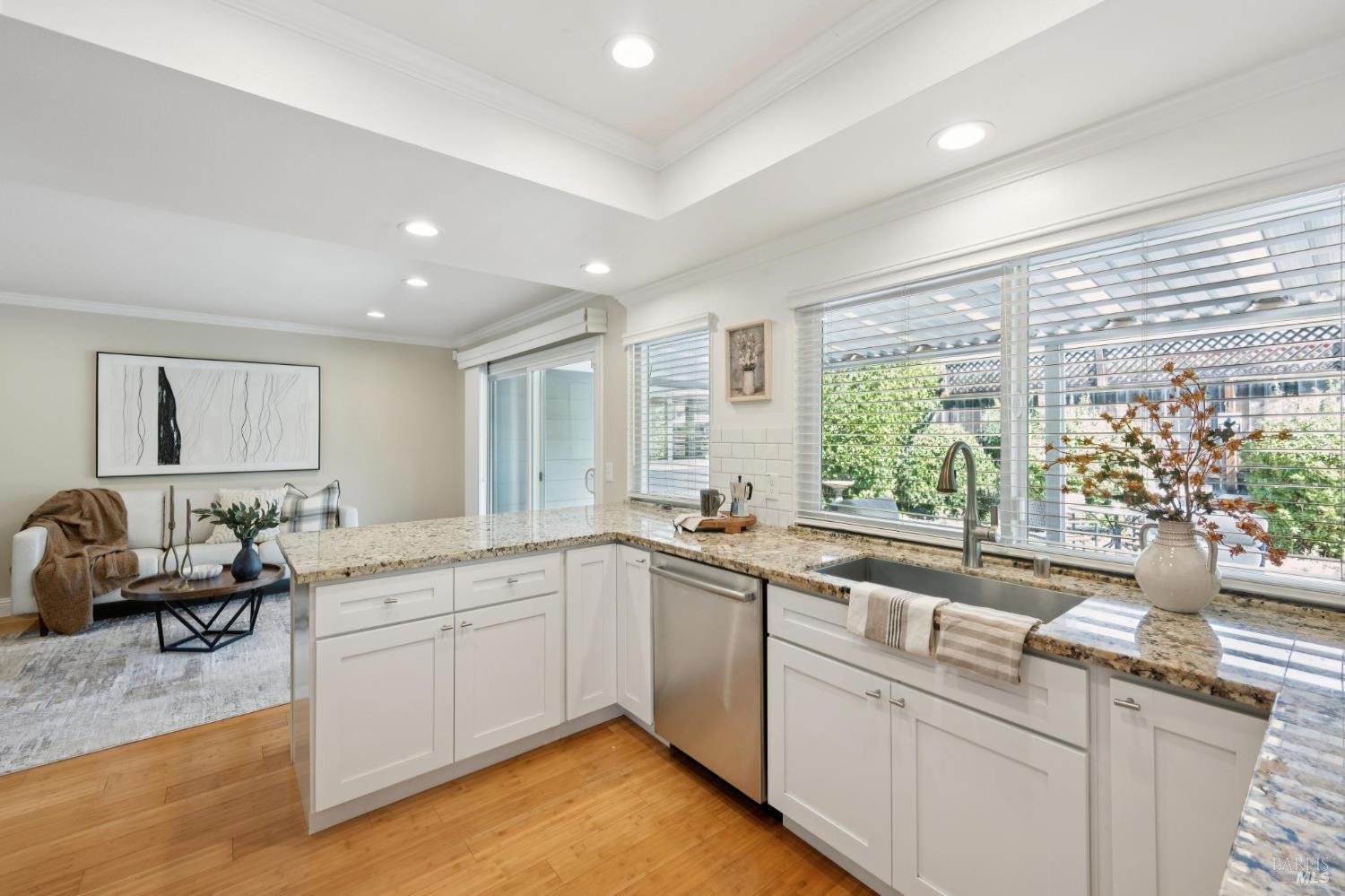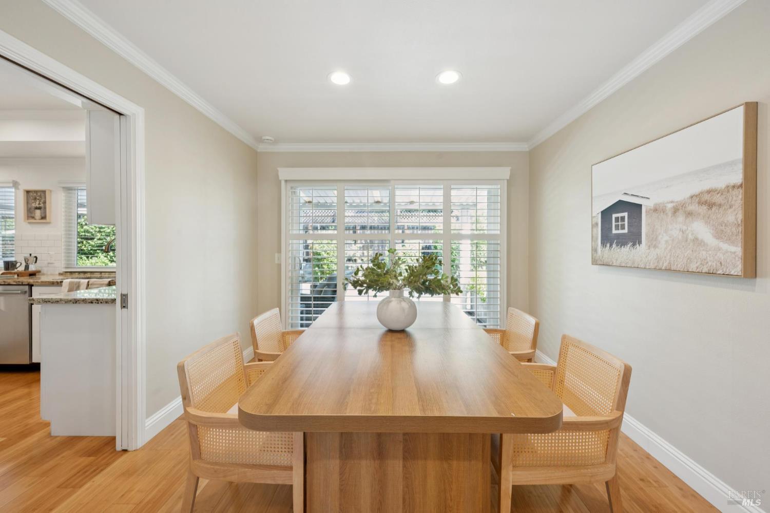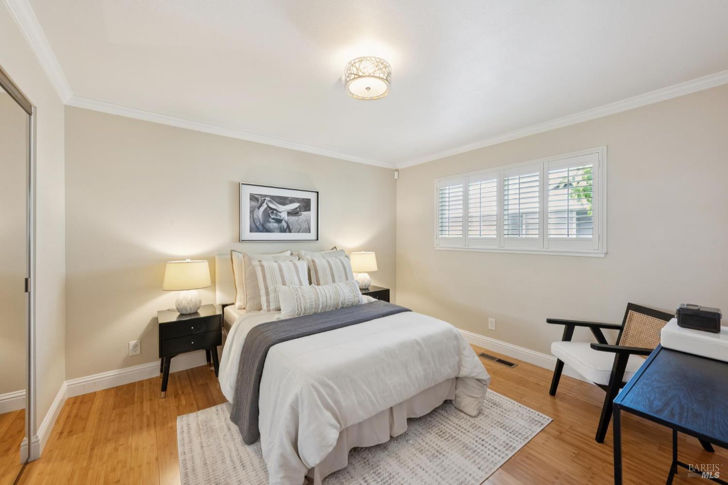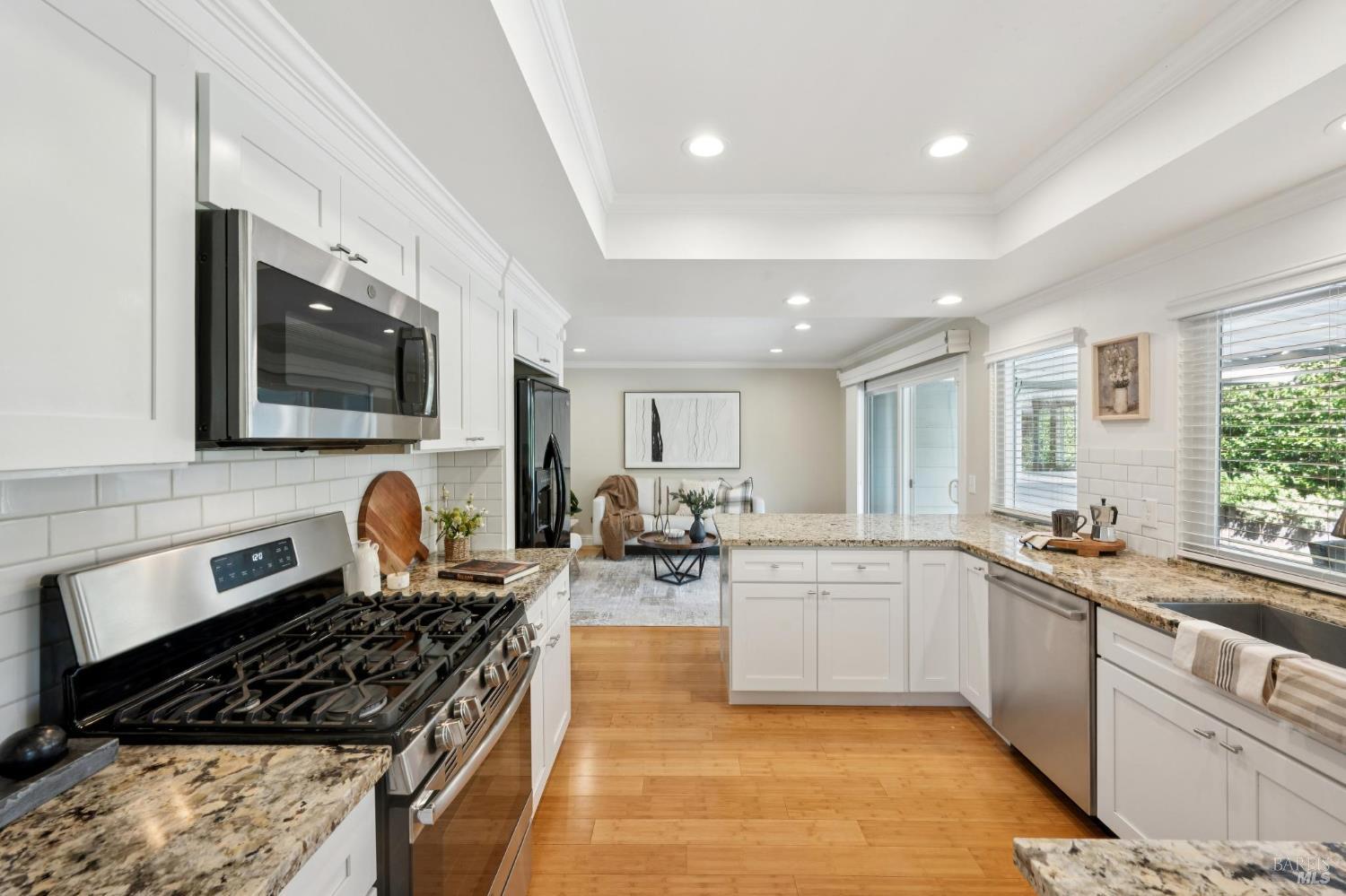 Pristine home with classic beauty and thoughtful updates throughout. This 2-bedroom, 2-bath residence with an additional den features gleaming bamboo flooring and abundant natural light. The spacious living room offers crown molding, plantation shutters, a gas fireplace with timeless surround, and built-in bookcases for charm and function. The bright kitchen includes granite countertops and white cabinetry, opening to a cozy den or dining area. Updated baths feature a tub/shower combo in one and dual sinks with a walk-in shower in the primary suite. Additional upgrades include a new electrical panel and a whole-house generator. Lovely gardens surround the expansive back patio, where a covered outdoor seating area provides year-round living space, perfect for entertaining friends and family. Nestled in Oakmont, a 55+ community in Sonoma County offering golf courses, clubhouses, swimming pools, and scenic trails. Enjoy the wide, quiet street and surrounding hills in this move-in ready home!