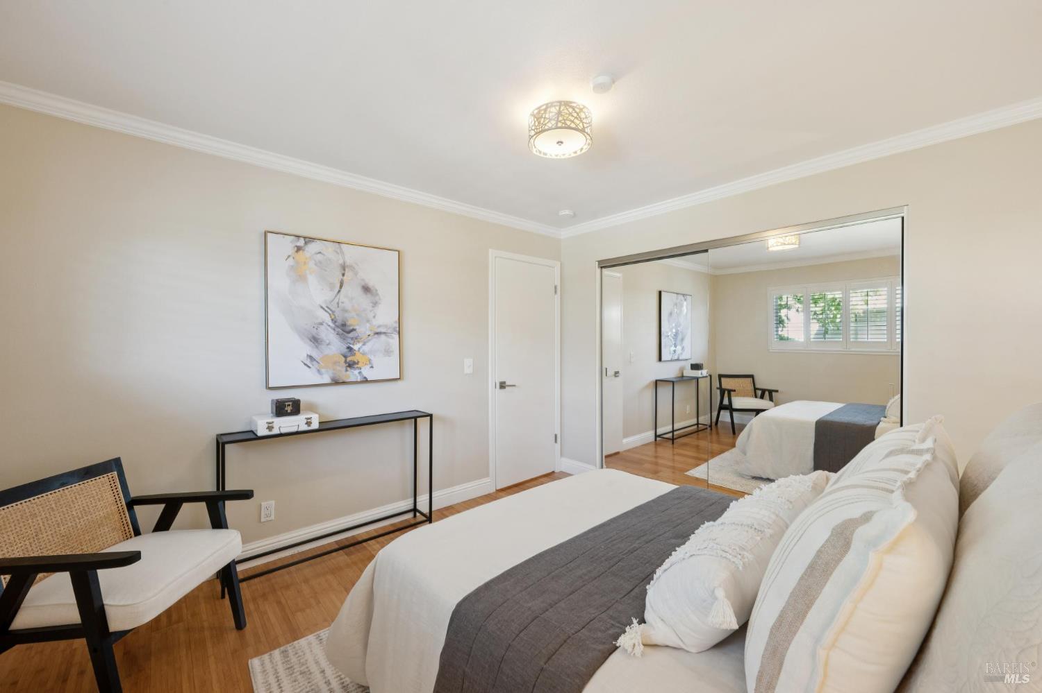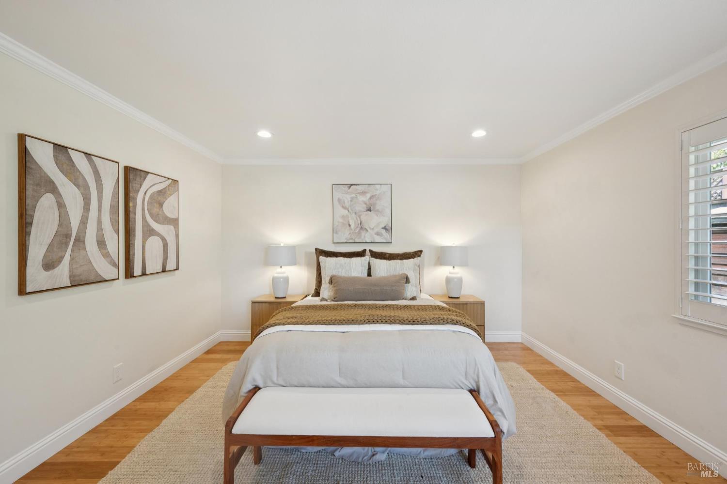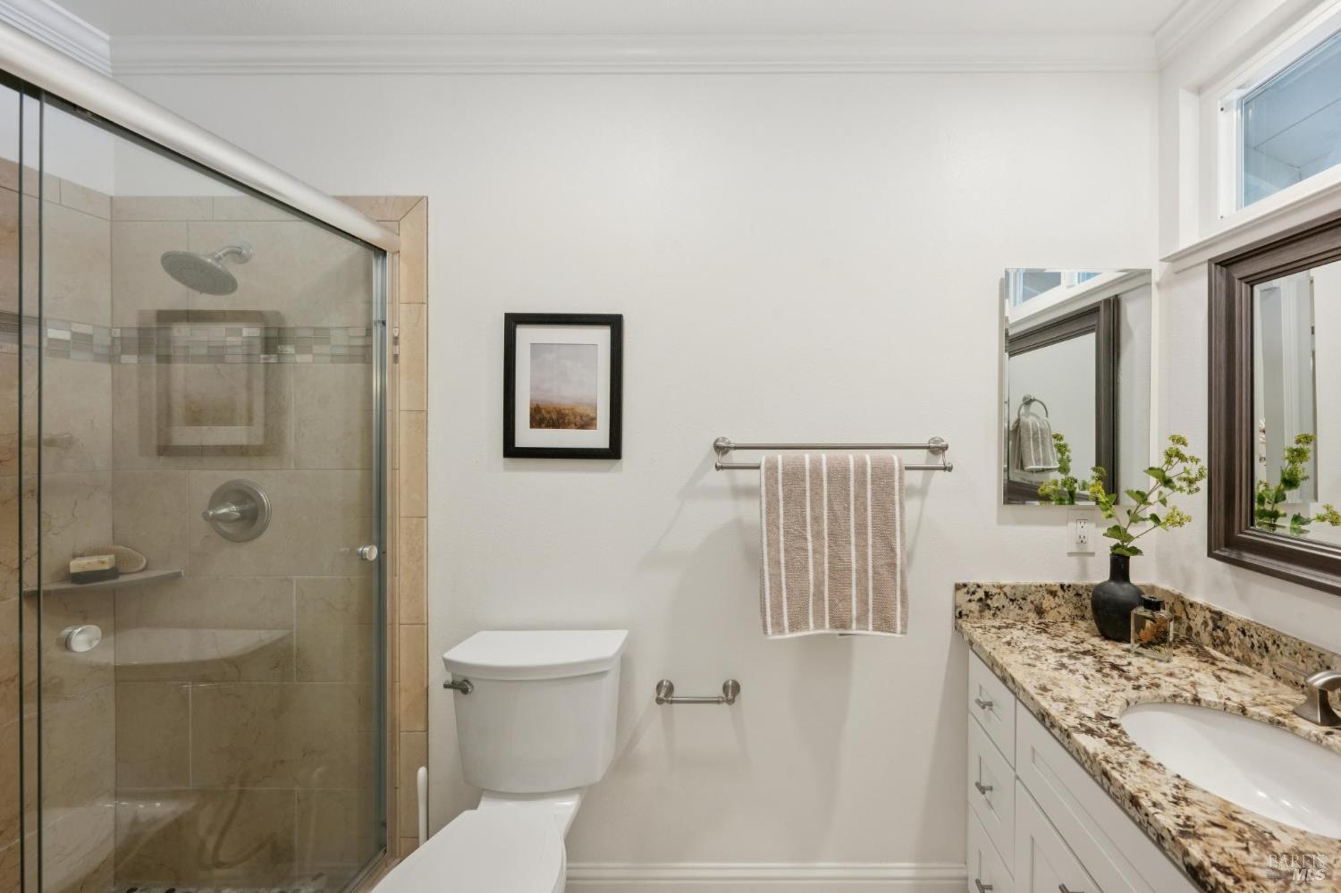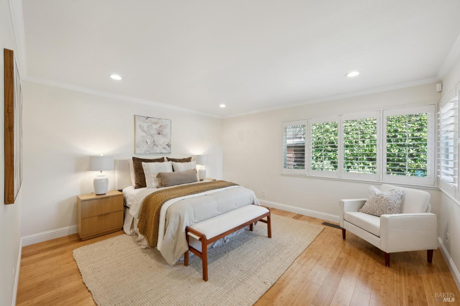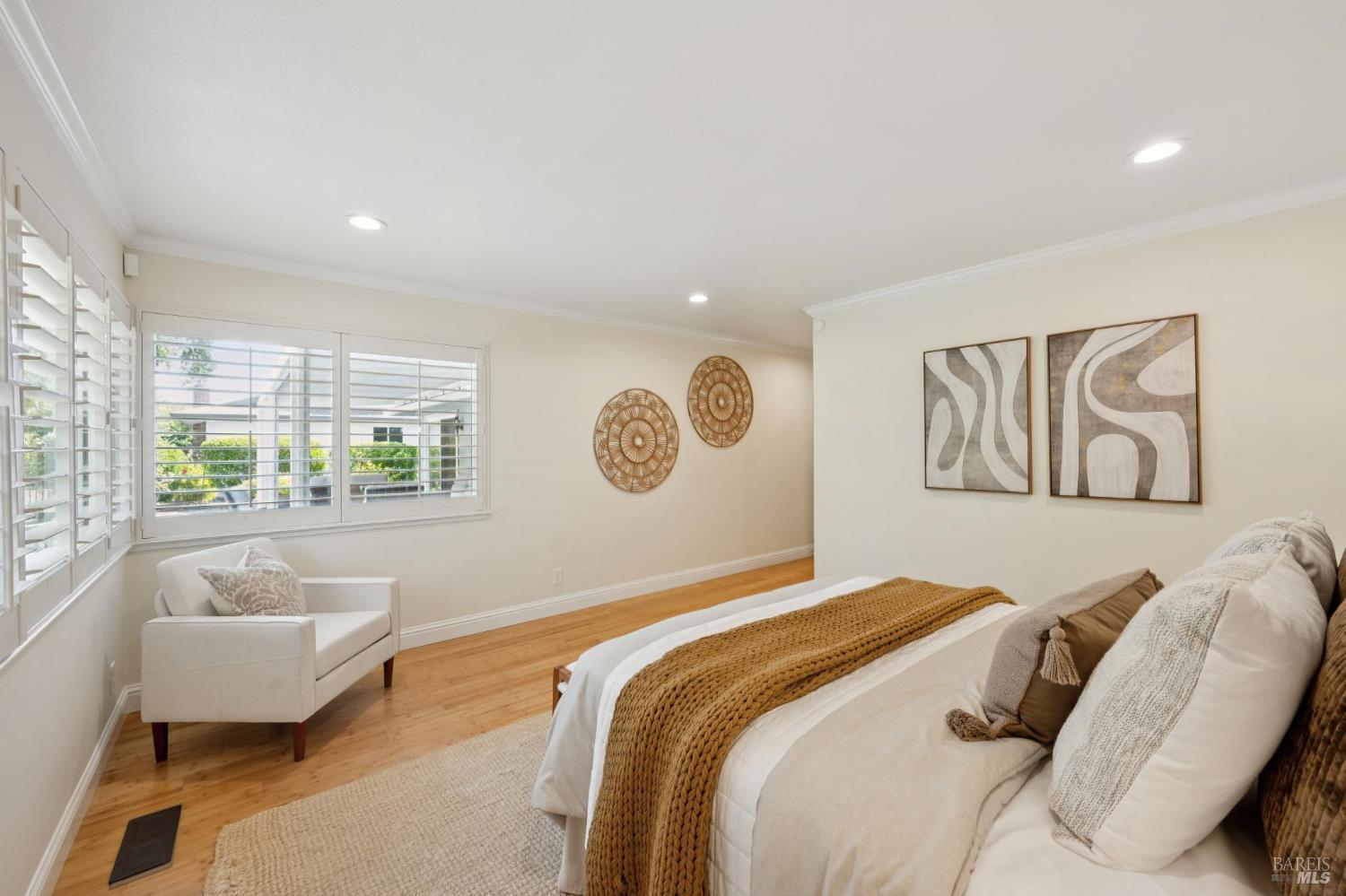 Pristine home with classic beauty and thoughtful updates throughout. This 2-bedroom, 2-bath residence with an additional den features gleaming bamboo flooring and abundant natural light. The spacious living room offers crown molding, plantation shutters, a gas fireplace with timeless surround, and built-in bookcases for charm and function. The bright kitchen includes granite countertops and white cabinetry, opening to a cozy den or dining area. Updated baths feature a tub/shower combo in one and dual sinks with a walk-in shower in the primary suite. Additional upgrades include a new electrical panel and a whole-house generator. Lovely gardens surround the expansive back patio, where a covered outdoor seating area provides year-round living space, perfect for entertaining friends and family. Nestled in Oakmont, a 55+ community in Sonoma County offering golf courses, clubhouses, swimming pools, and scenic trails. Enjoy the wide, quiet street and surrounding hills in this move-in ready home!