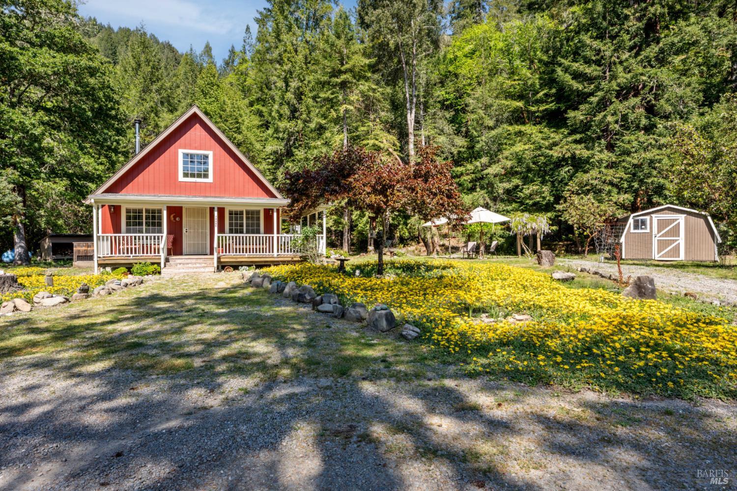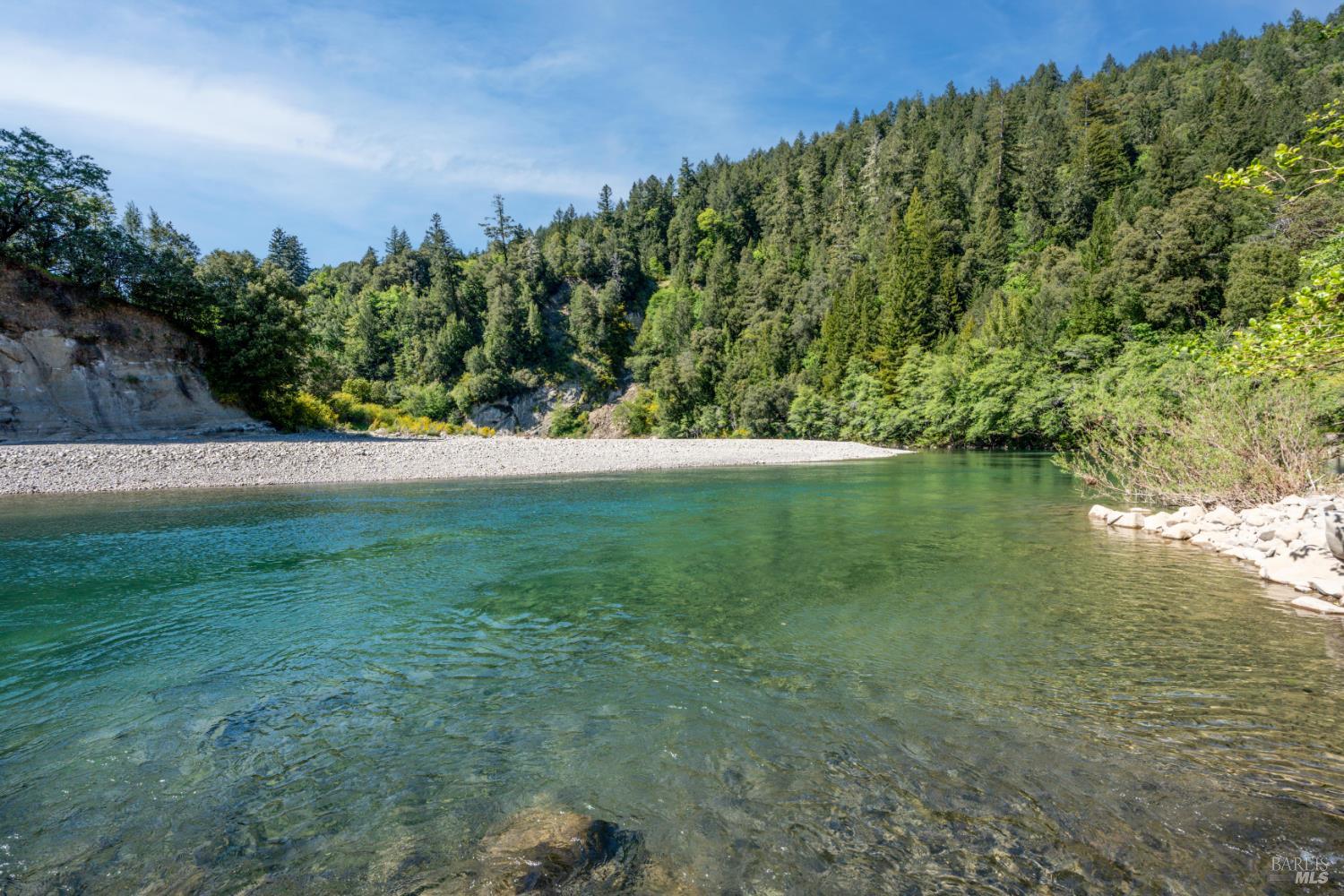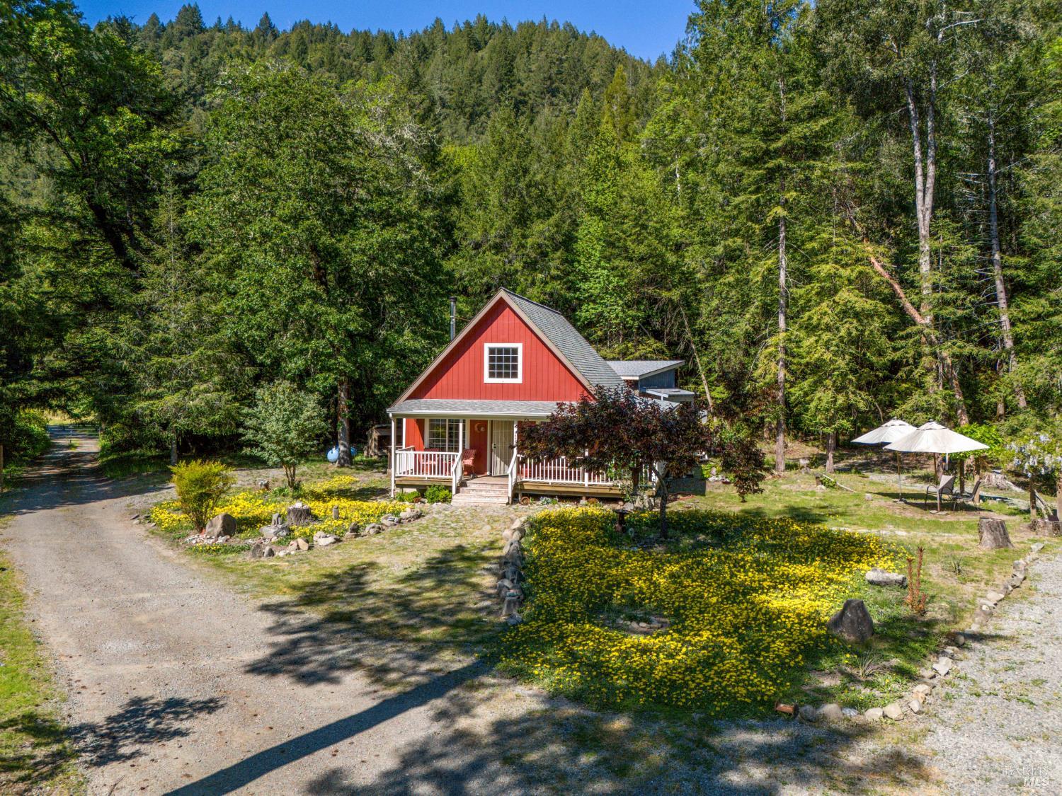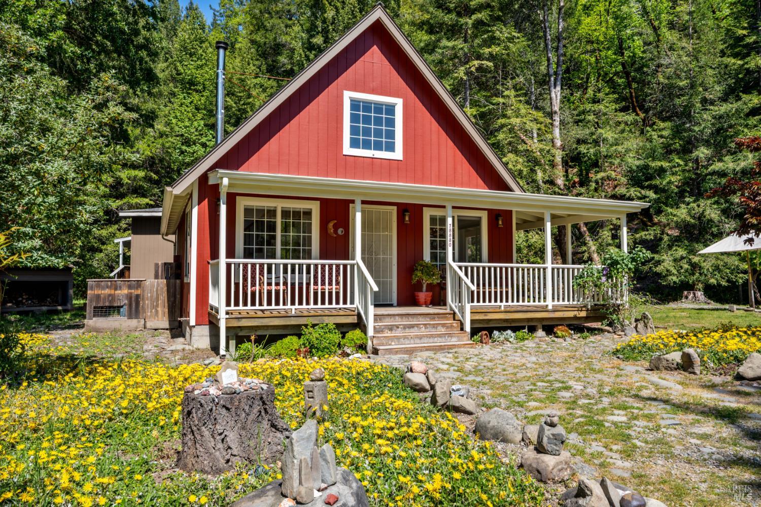 Seldom does any waterfront property on the Eel River become available on the market that is this accessible and turn-key. This is a place which can be perfect for vacation rentals or a family compound amongst the majestic redwoods. Discover your private paradise on 4.92 flat, usable acres with direct beachfront access to the stunning Eel River. This exceptional gated property offers a serene escape, complete with a year-round creek that meanders through the land, creating a natural swimming hole and providing ample water with Riparian rights. The property features the main house which is an adorable A-Frame cabin, a cozy detached studio which can be perfect for guests or family and an additional unit that can be used as a game room or gym... the possibilities are endless. Enjoy the abundant space for gardening with established garden beds and room to expand. New water spigots and lines have been installed throughout the property, supported by two wells, 5,000 gallons of water storage, and an additional 2,000 gallons reserved for fire suppression, complete with a 2-inch hose connection. Enjoy peaceful walks along established trails beside the creek that flows directly into the river. Spend your days swimming, kayaking, or simply relaxing by the water. Make this your get-a-way!