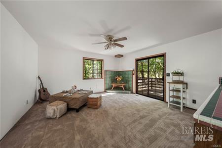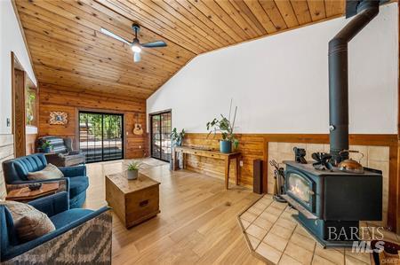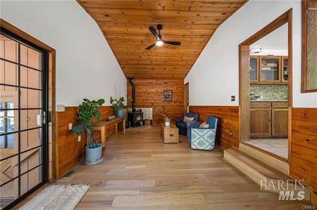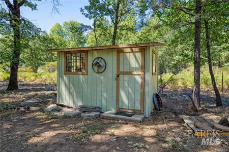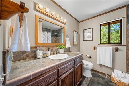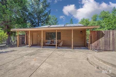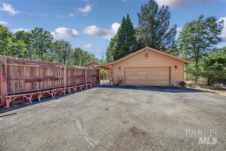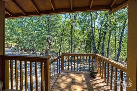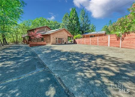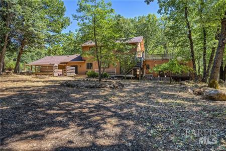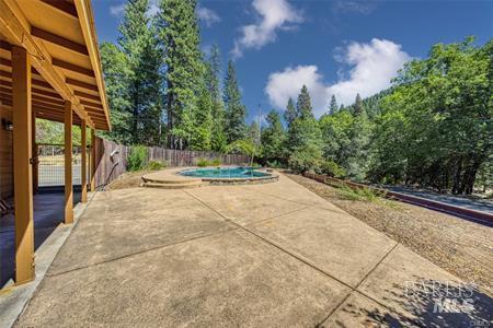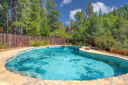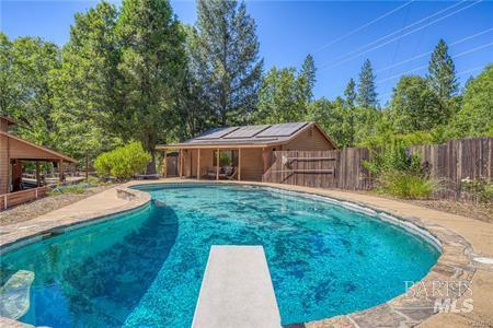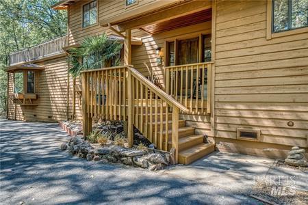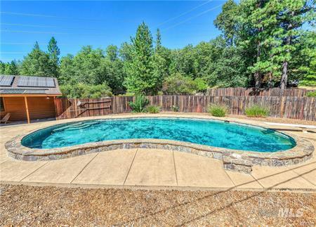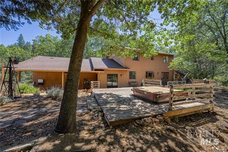 This inviting, custom mountain-style home is situated on almost 2.5 well-maintained acres and offers approximately 3,000 square feet of living space with 3 bedrooms and 4 bathrooms. The property includes two garages, with an oversized detached garage conveniently located next to a lovely in-ground pool and surrounding patios. The home itself boasts rustic character with a boho finish, creating a unique and warm atmosphere. On the main floor, you'll find a large living room adjacent to a formal dining area that leads to a granite kitchen with a breakfast nook and buffet serving cabinet. The cozy lower family room features a knotty pine vaulted ceiling, a wood stove, and sliding doors that open to the forested backyard. There's also a ground-floor bedroom with a private bath offering a custom tiled walk-in shower and a convenient coffee bar. Upstairs, there are three additional rooms plus an office. This includes the upper primary bedroom with an en-suite bath and a tiled walk-in shower. A slider door from this room connects to an outside upper deck overlooking the forest below. The Hall Bath offers a tiled tub shower combo. The property comes with two owned solar systems (5.2KW & 2.5KW) and a well producing 20 GPM. This estate provides everything you need to live a peaceful life.