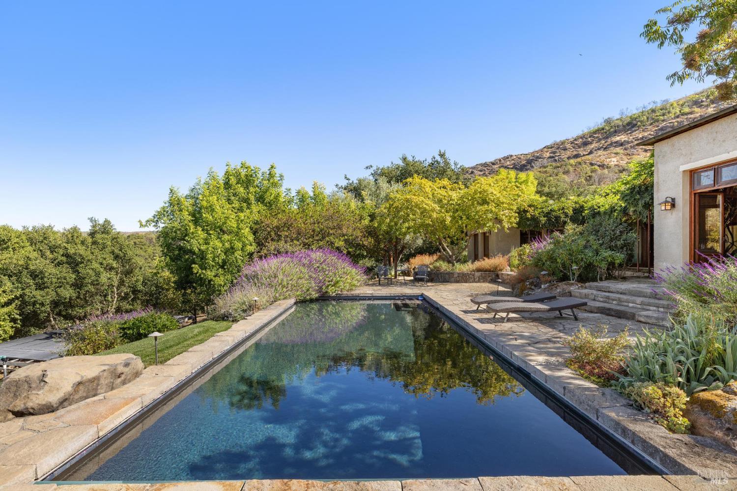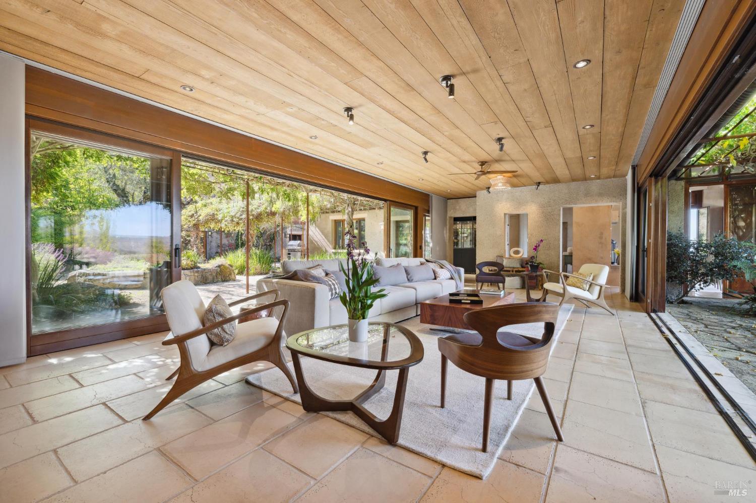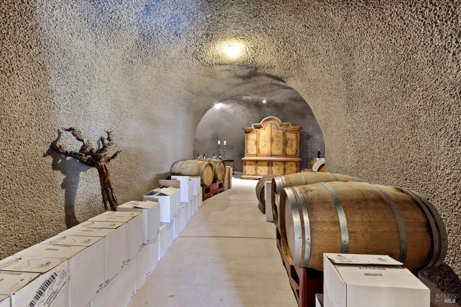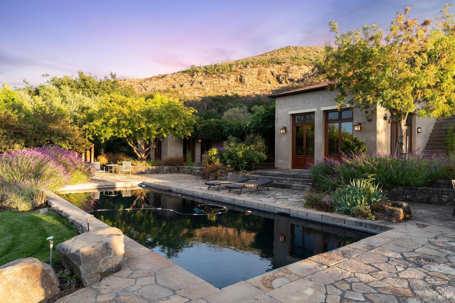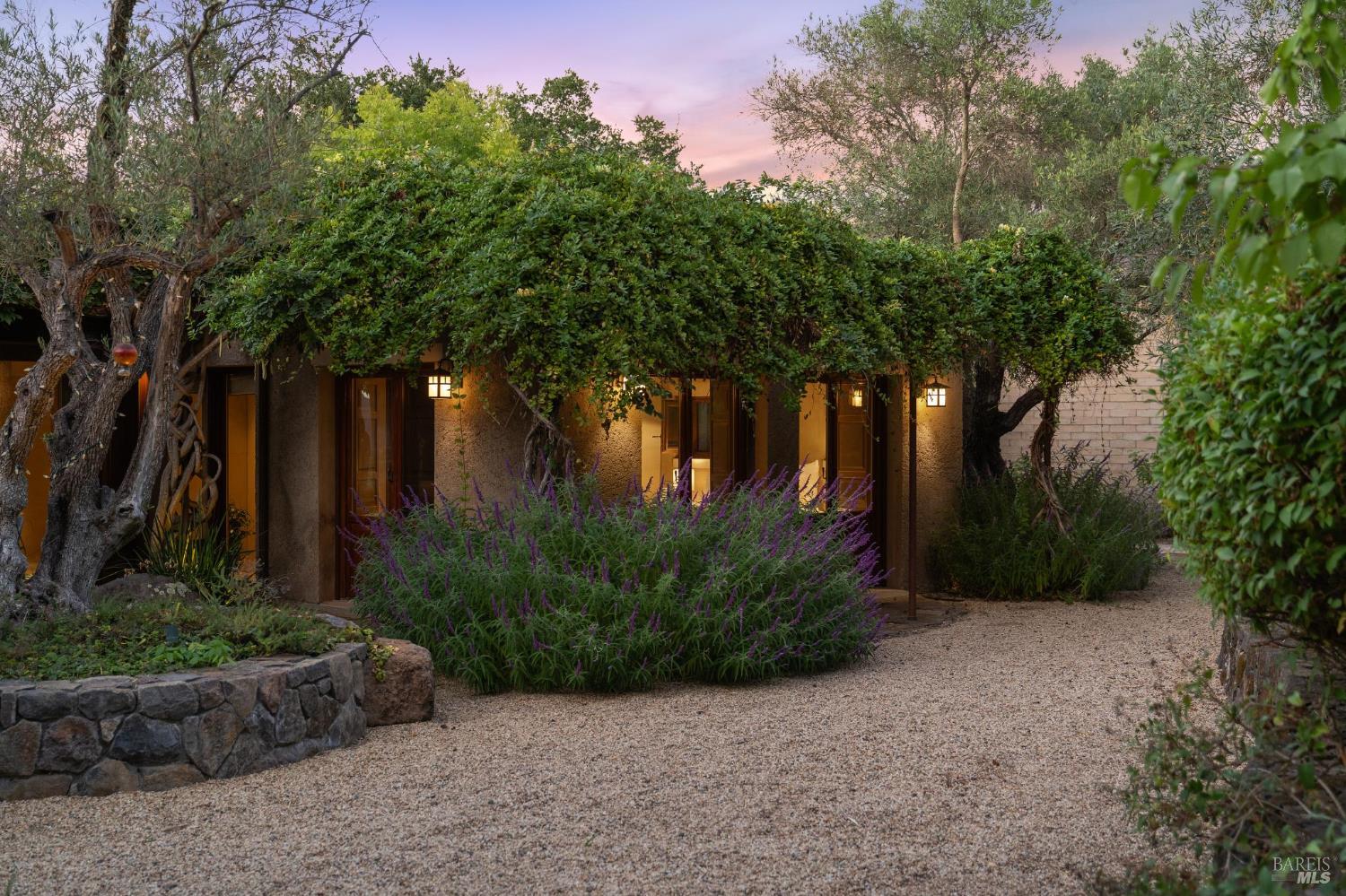 Wall Street Journal Winner: House of the Week. House of the Month and Nominee for 2025 House of the Year. (House of the year voting begins December 2025) Designed to blend in with the landscape, not dominate. This tranquil Zen influenced home, embodies peace and tranquility yet is only 7 minutes from Silverado Country Club . All homes have kitchens, bedrooms & baths, but few have rammed earth construction (designed by Michael Baushke & built by David Easton) which fold seamlessly into the rocky contours of the Palisades high above the Valley in eastern Napa. Adjacent to iconic wineries Kenzo and Jarvis. It has over 4,000 sqft, 3 ensuites artfully designed and a great room with custom floor to ceiling windows & doors that open to outdoor seating & entertaining areas capitalizing on Napa's famed indoor/outdoor living. This Zen masterpiece comes with 8-24 steel-reinforced earth walls and custom floor to ceiling windows & doors. The primary bedroom features a built-in media center with wet bar, fireplace, spacious walk-in closet, spa-like bath and access to outdoor shower & private courtyard with views. To add to the Napa Valley feel, there are expansive wine caves, 70 acres of land, a 2-acre cabernet vineyard, an olive grove and a horse barn.