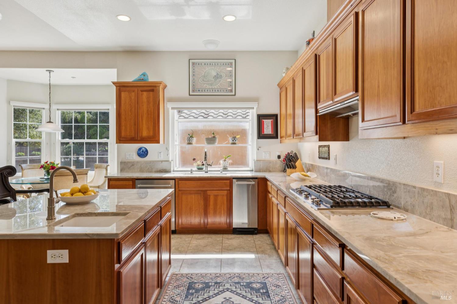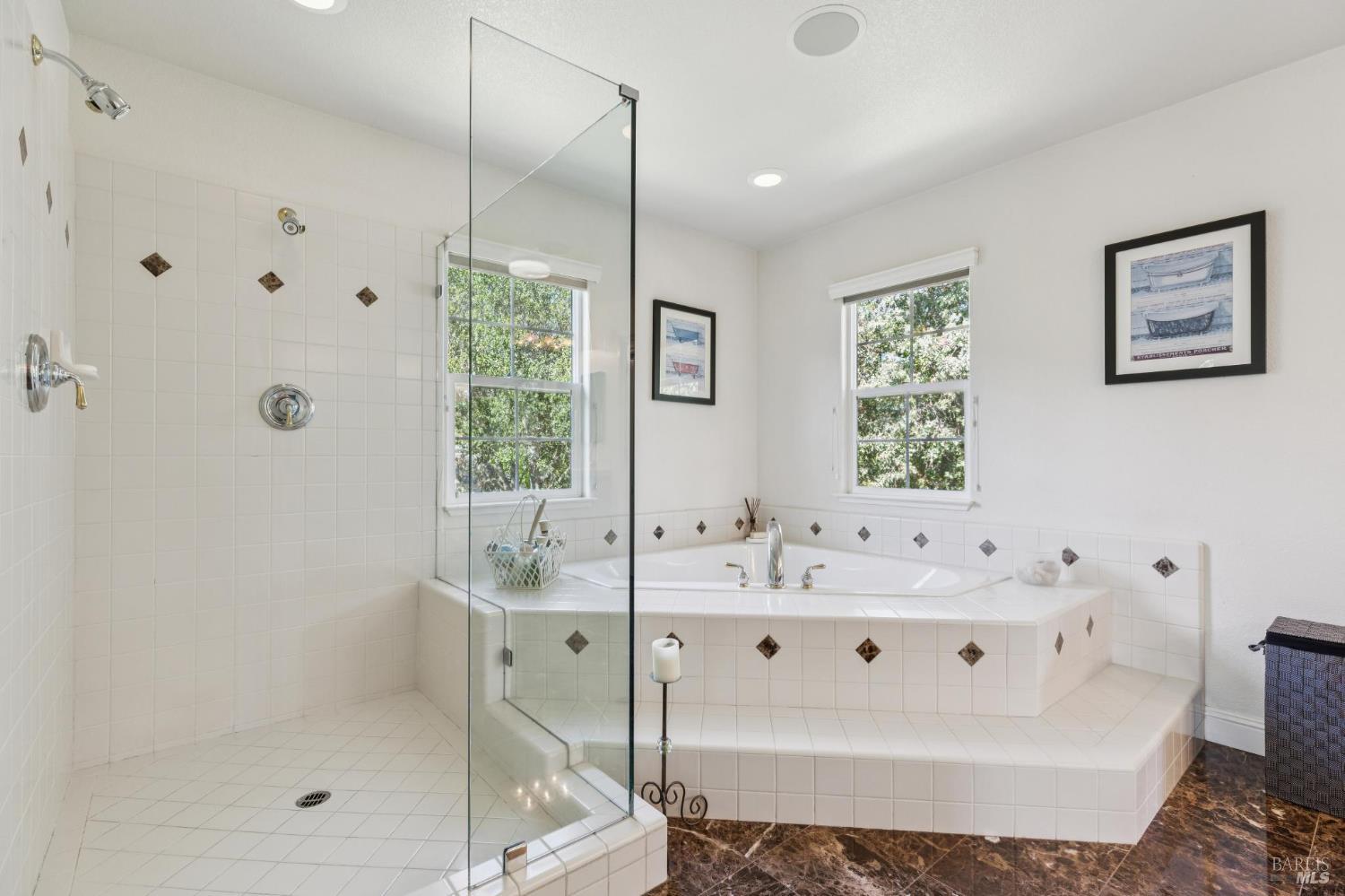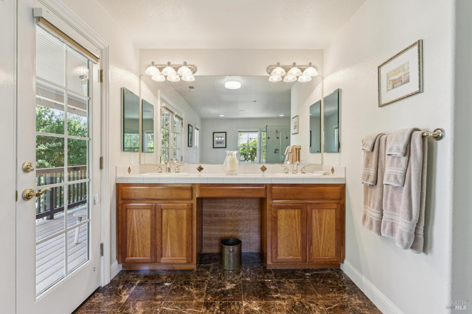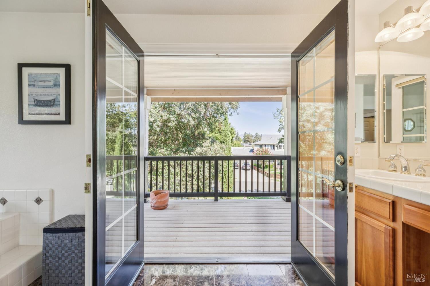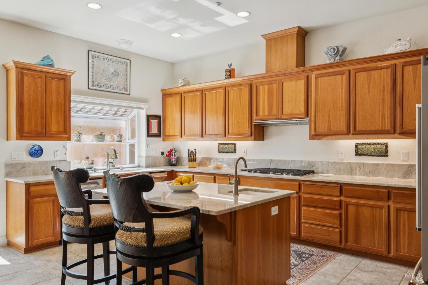 Located in desirable Browns Valley minutes to downtown Napa in an enclave of semi-custom homes, this bespoke home offers a fantastic floor plan designed with entertaining and relaxation in mind. Great room style living features gourmet kitchen with stunning quartzite countertops, center island with counter seating, stainless KitchenAid appliances & Wine Enthusiast wine refrigerator, walk-in pantry, wine cellar & informal dining area with bay window that showcases the abundance of natural light. Family room with beautiful hardwood flooring & gas fireplace offers French doors that open to private outdoor entertaining area with built-in BBQ & views of the verdant grounds. This 4 BDR 3.5 BA well-built home features 2 ensuite BDRs with one on main level. Spacious & luxurious main ensuite offers 2 walk-in closets & spa-like bath with marble flooring & French doors that open to balcony with seating area & views of hot air balloons & hills. Loft currently used as office also features French doors that open to expansive balcony. Living rm with gas fireplace & dining rm both feature views of the beautiful grounds. Tankless water heater, central air & heat, dual pane windows & doors, detached 2 car garage with built-in cabinetry, garden beds & 2 natural water features (seasonal creeks)!