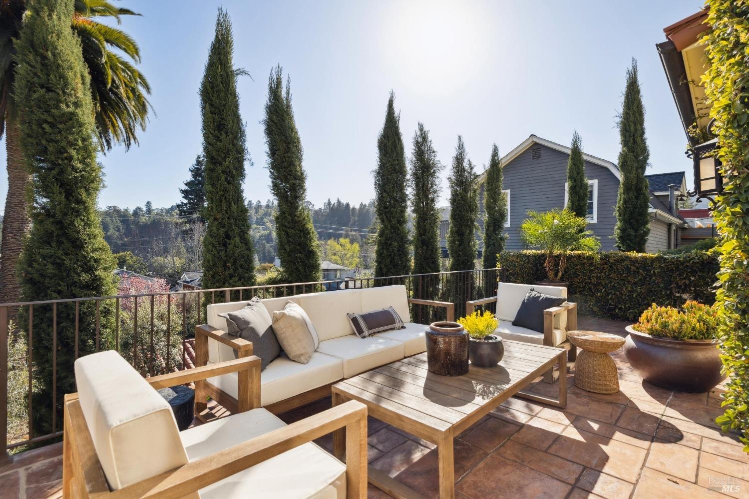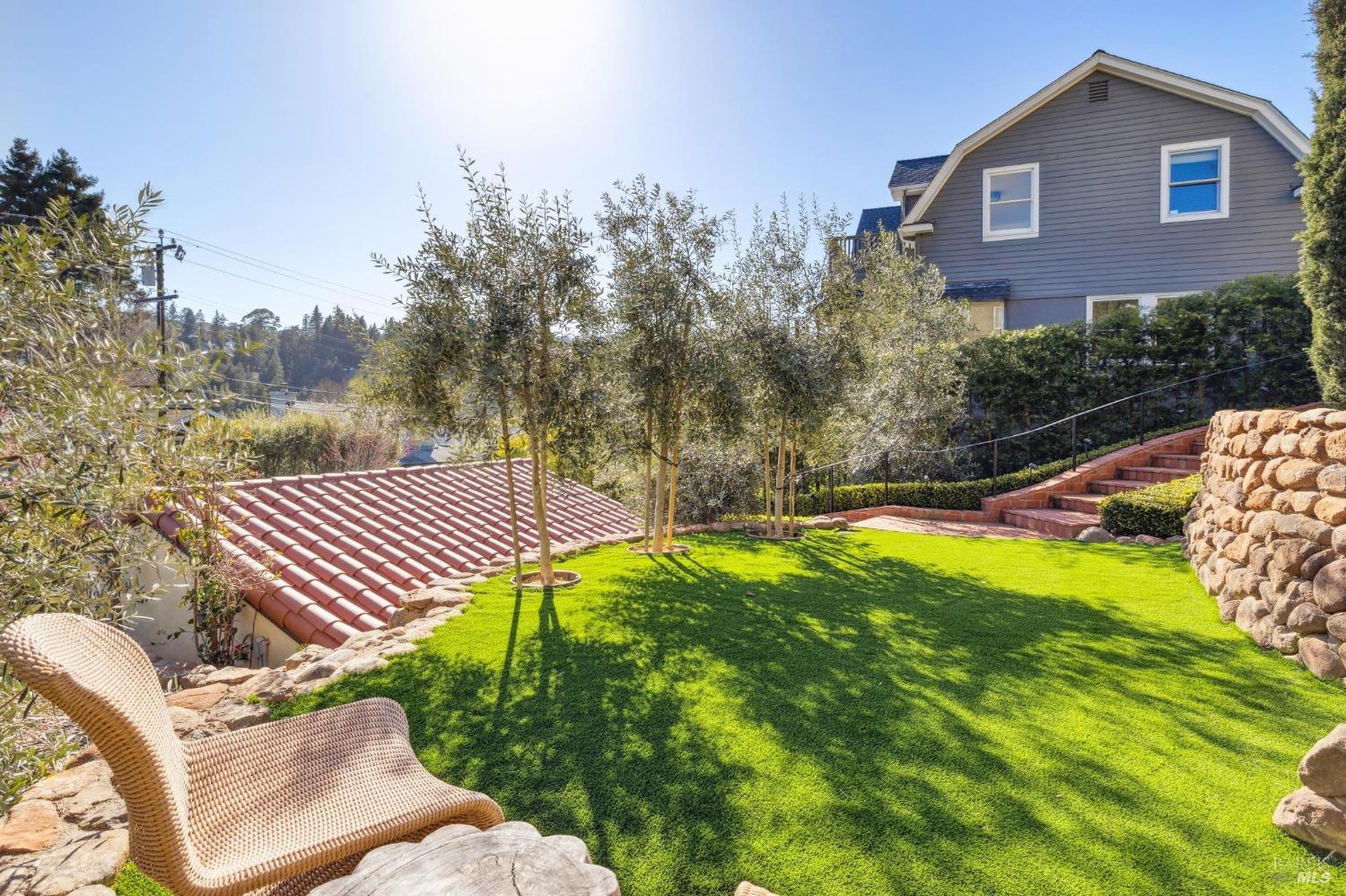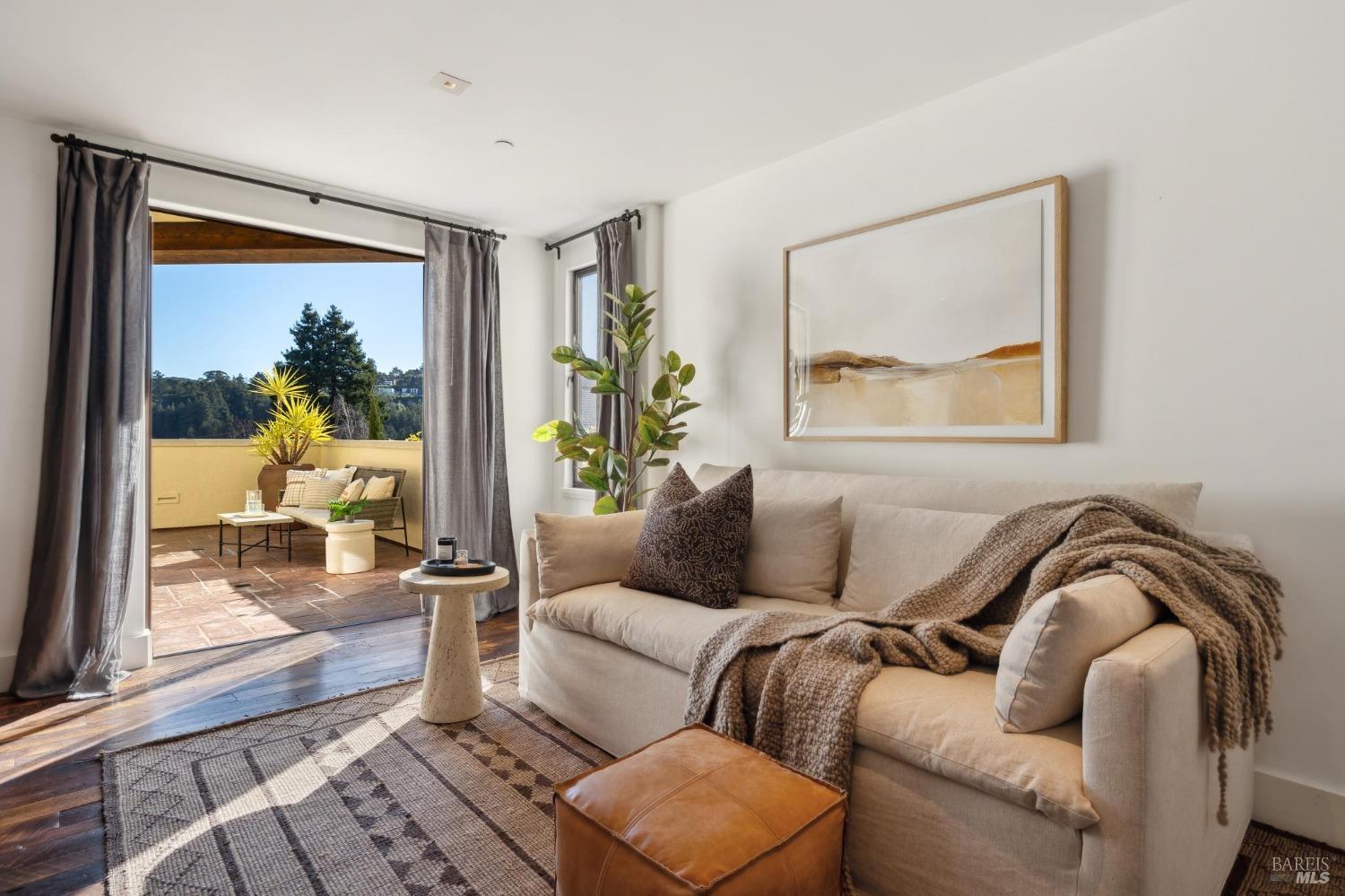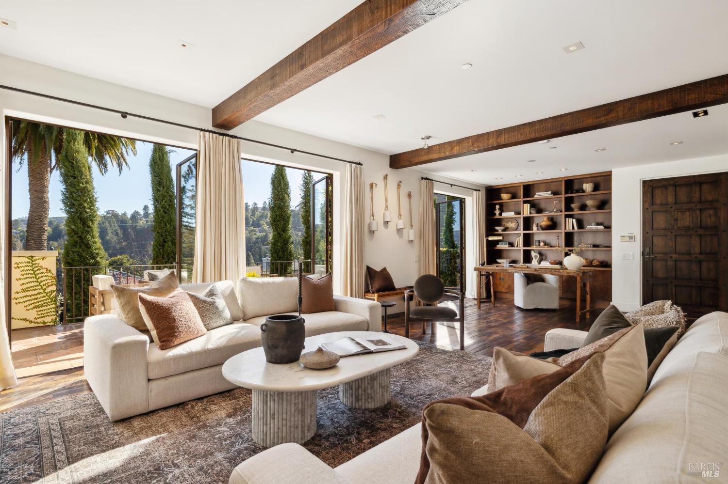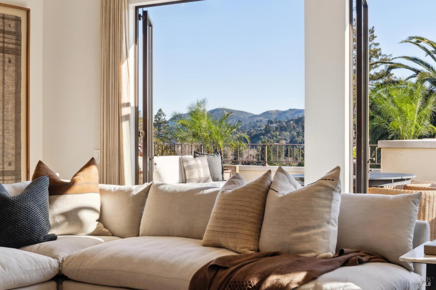 Located just one flat block from thriving downtown Mill Valley, this exceptional south-facing property offers rare street-to-street stair-less access to the main level and inspiring views of San Francisco, the Bay, and surrounding valleys. With over 4,000 sq. ft. of living space, this 4-bedroom, 4-bathroom residence is defined by craftsmanship and sophisticated design. Custom reclaimed wood floors pair with industrial steel plate details, while bespoke leather cabinetry and designer fixtures add luxury. Inspired by Santa Barbara architecture, the home blends grandeur with intimacyideal for entertaining or private living. The main level features a chef's kitchen, formal living and dining areas, all opening to an expansive patio. The primary suite is a true retreat, with a spa-inspired bath, generous walk-in closet, and private patio. The lower level offers a dramatic entry foyer and family room flowing to another large patio. Recent upgrades include solar panels with Tesla walls, a newly built 2 car garage, new turf, and mature landscaping. This rare combination of elegance, scale, and locationsteps from downtownembodies California village living at its finest.