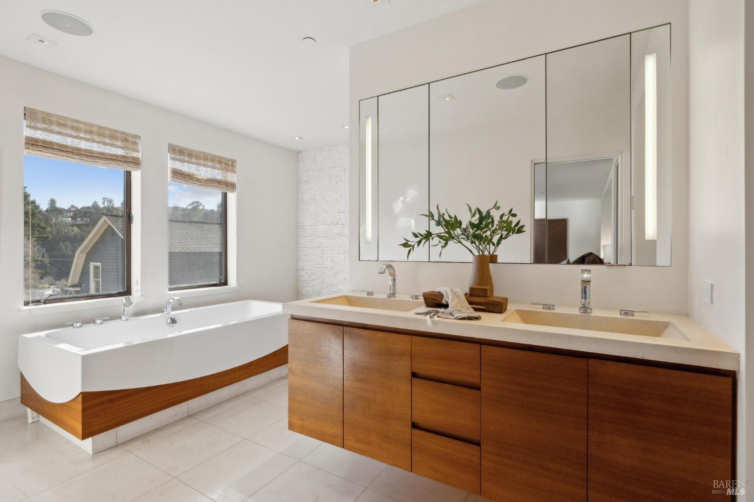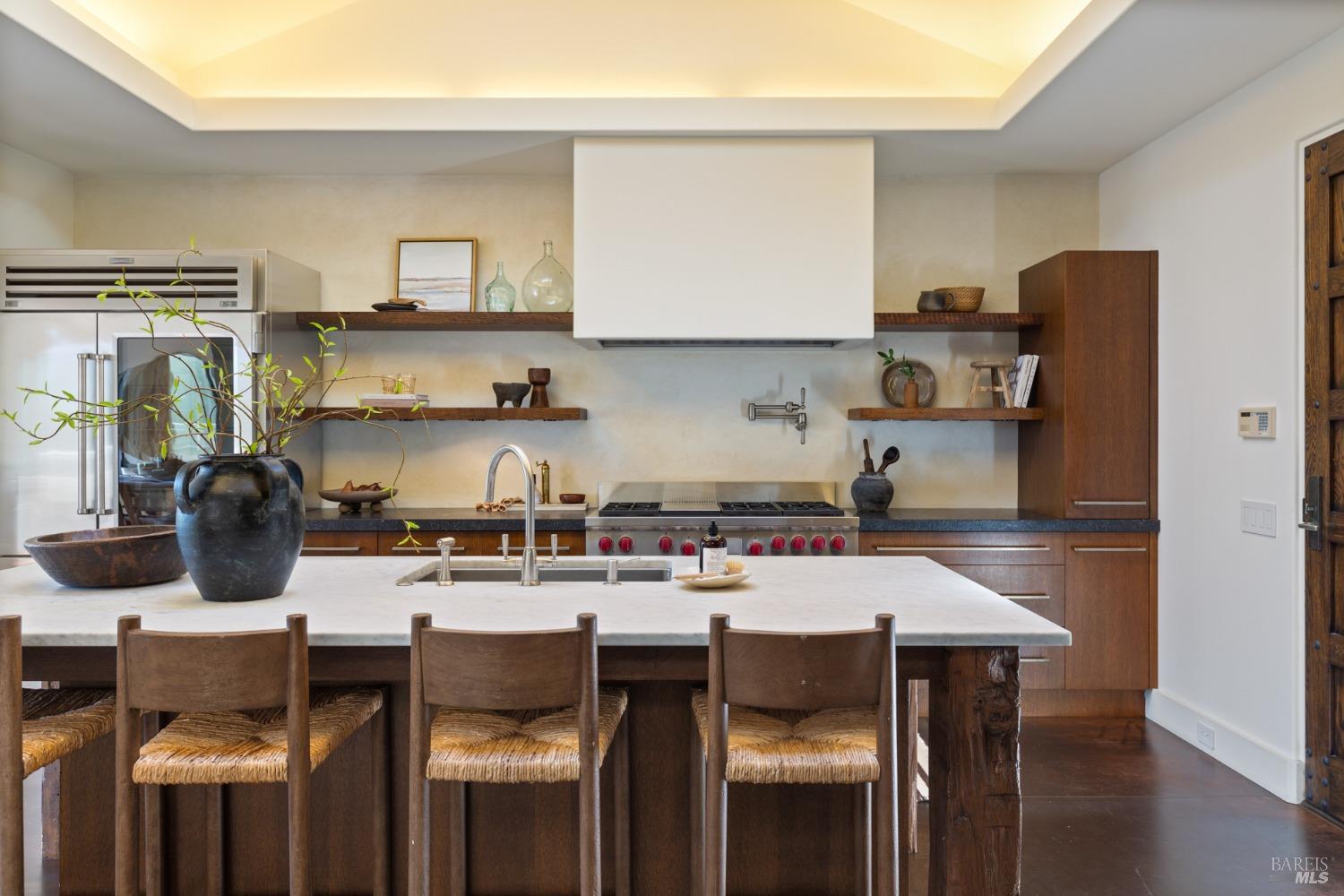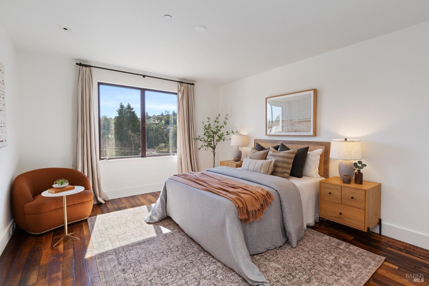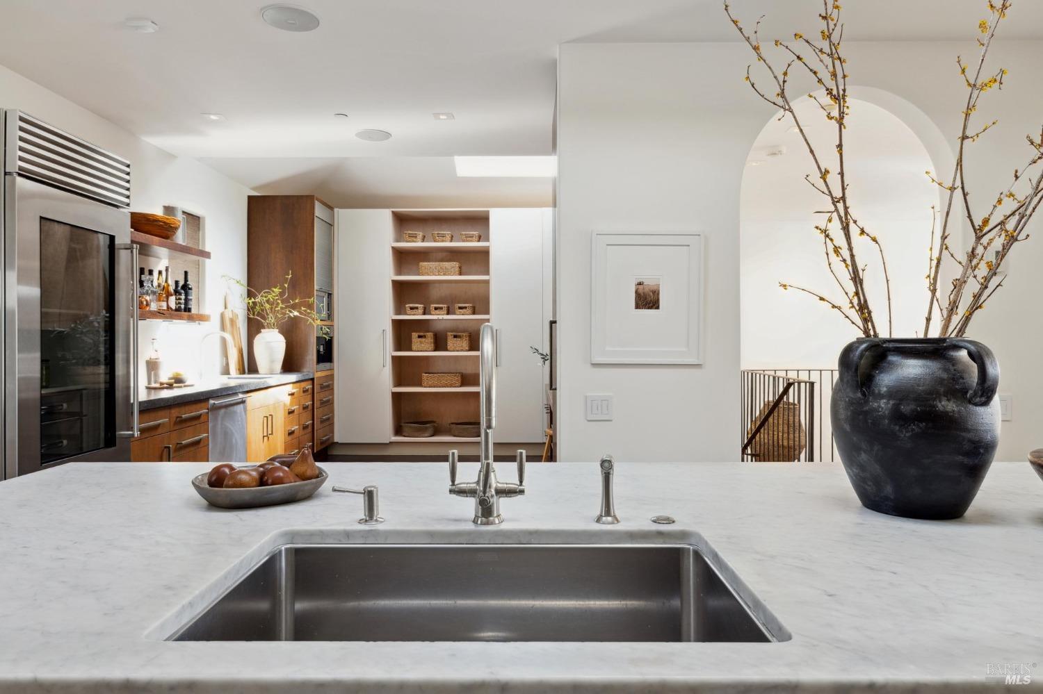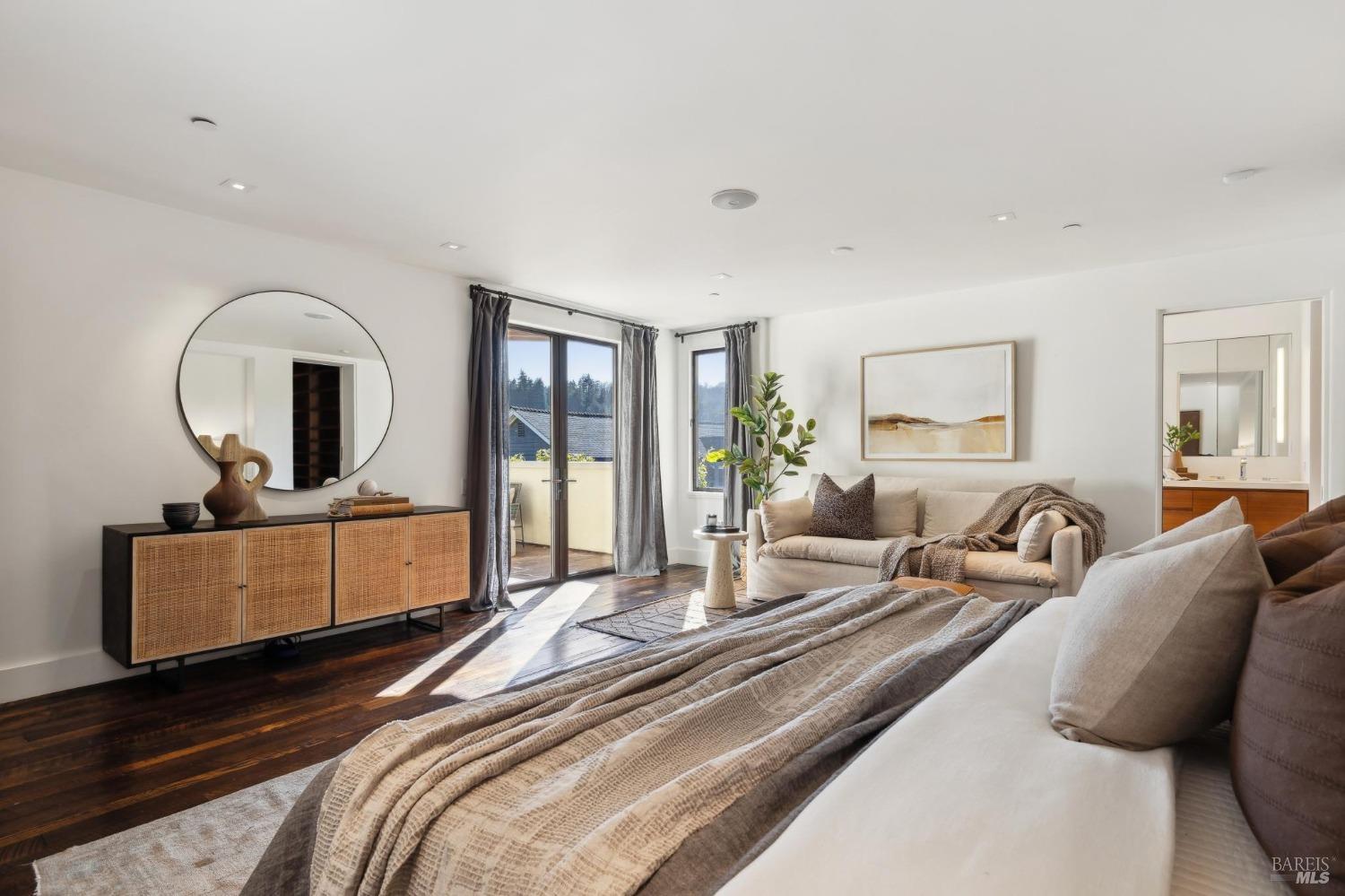 Located just one flat block from thriving downtown Mill Valley, this exceptional south-facing property offers rare street-to-street stair-less access to the main level and inspiring views of San Francisco, the Bay, and surrounding valleys. With over 4,000 sq. ft. of living space, this 4-bedroom, 4-bathroom residence is defined by craftsmanship and sophisticated design. Custom reclaimed wood floors pair with industrial steel plate details, while bespoke leather cabinetry and designer fixtures add luxury. Inspired by Santa Barbara architecture, the home blends grandeur with intimacyideal for entertaining or private living. The main level features a chef's kitchen, formal living and dining areas, all opening to an expansive patio. The primary suite is a true retreat, with a spa-inspired bath, generous walk-in closet, and private patio. The lower level offers a dramatic entry foyer and family room flowing to another large patio. Recent upgrades include solar panels with Tesla walls, a newly built 2 car garage, new turf, and mature landscaping. This rare combination of elegance, scale, and locationsteps from downtownembodies California village living at its finest.