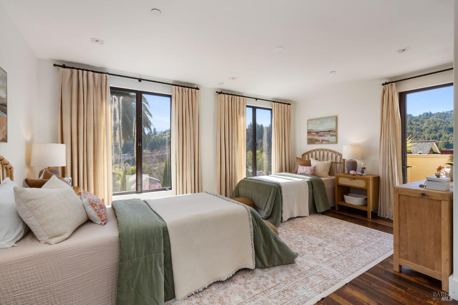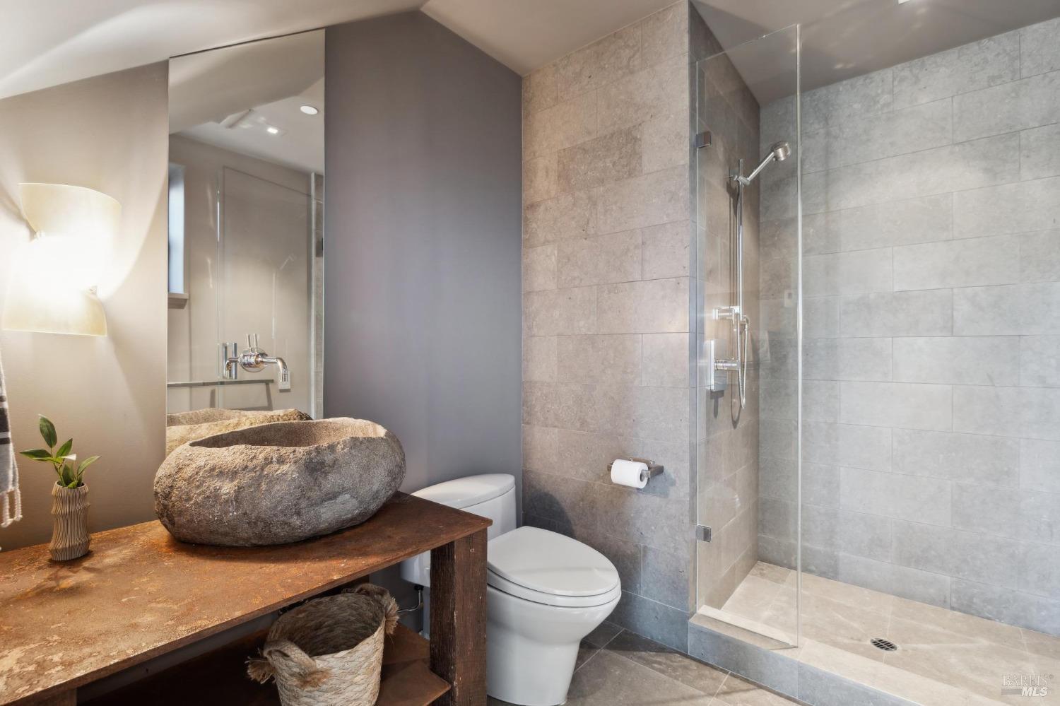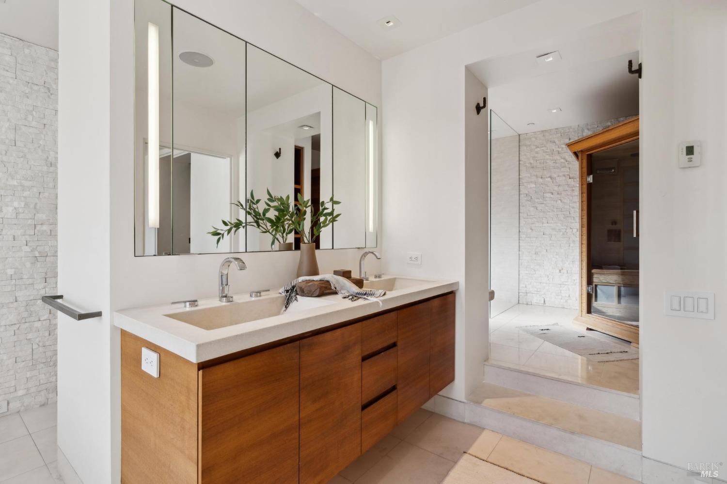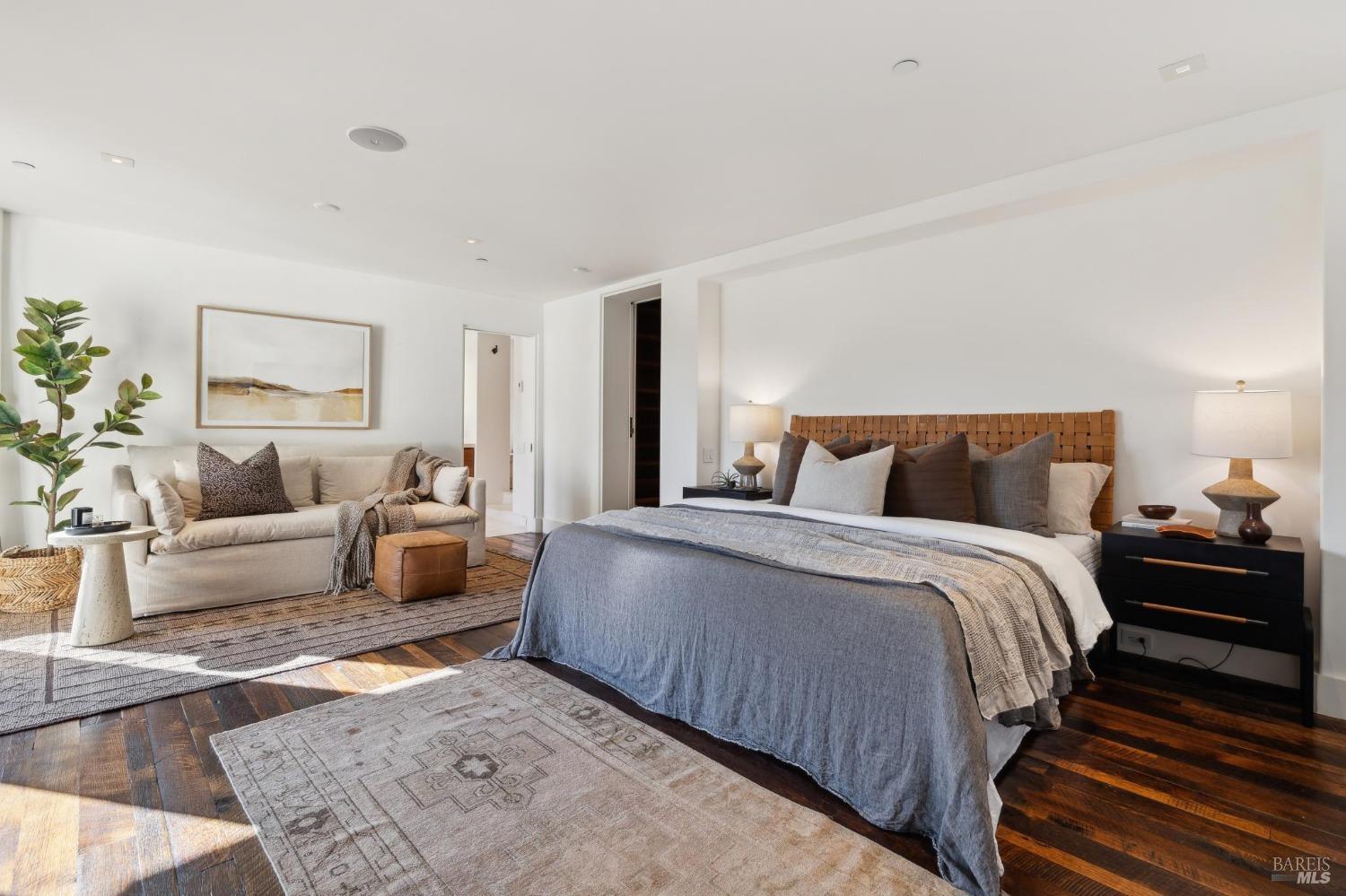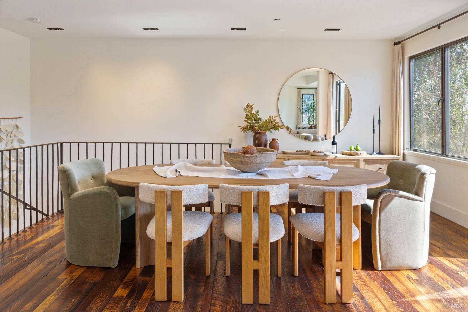 Located just one flat block from thriving downtown Mill Valley, this exceptional south-facing property offers rare street-to-street stair-less access to the main level and inspiring views of San Francisco, the Bay, and surrounding valleys. With over 4,000 sq. ft. of living space, this 4-bedroom, 4-bathroom residence is defined by craftsmanship and sophisticated design. Custom reclaimed wood floors pair with industrial steel plate details, while bespoke leather cabinetry and designer fixtures add luxury. Inspired by Santa Barbara architecture, the home blends grandeur with intimacyideal for entertaining or private living. The main level features a chef's kitchen, formal living and dining areas, all opening to an expansive patio. The primary suite is a true retreat, with a spa-inspired bath, generous walk-in closet, and private patio. The lower level offers a dramatic entry foyer and family room flowing to another large patio. Recent upgrades include solar panels with Tesla walls, a newly built 2 car garage, new turf, and mature landscaping. This rare combination of elegance, scale, and locationsteps from downtownembodies California village living at its finest.