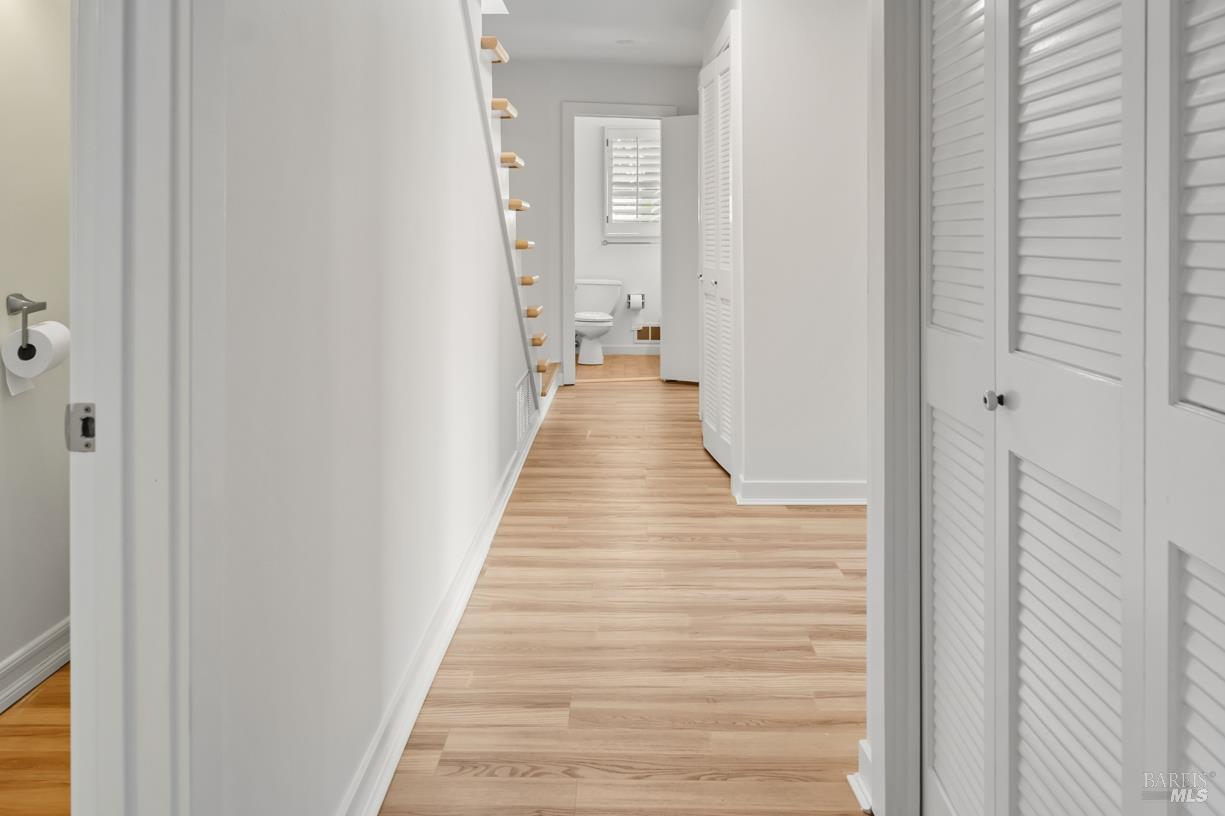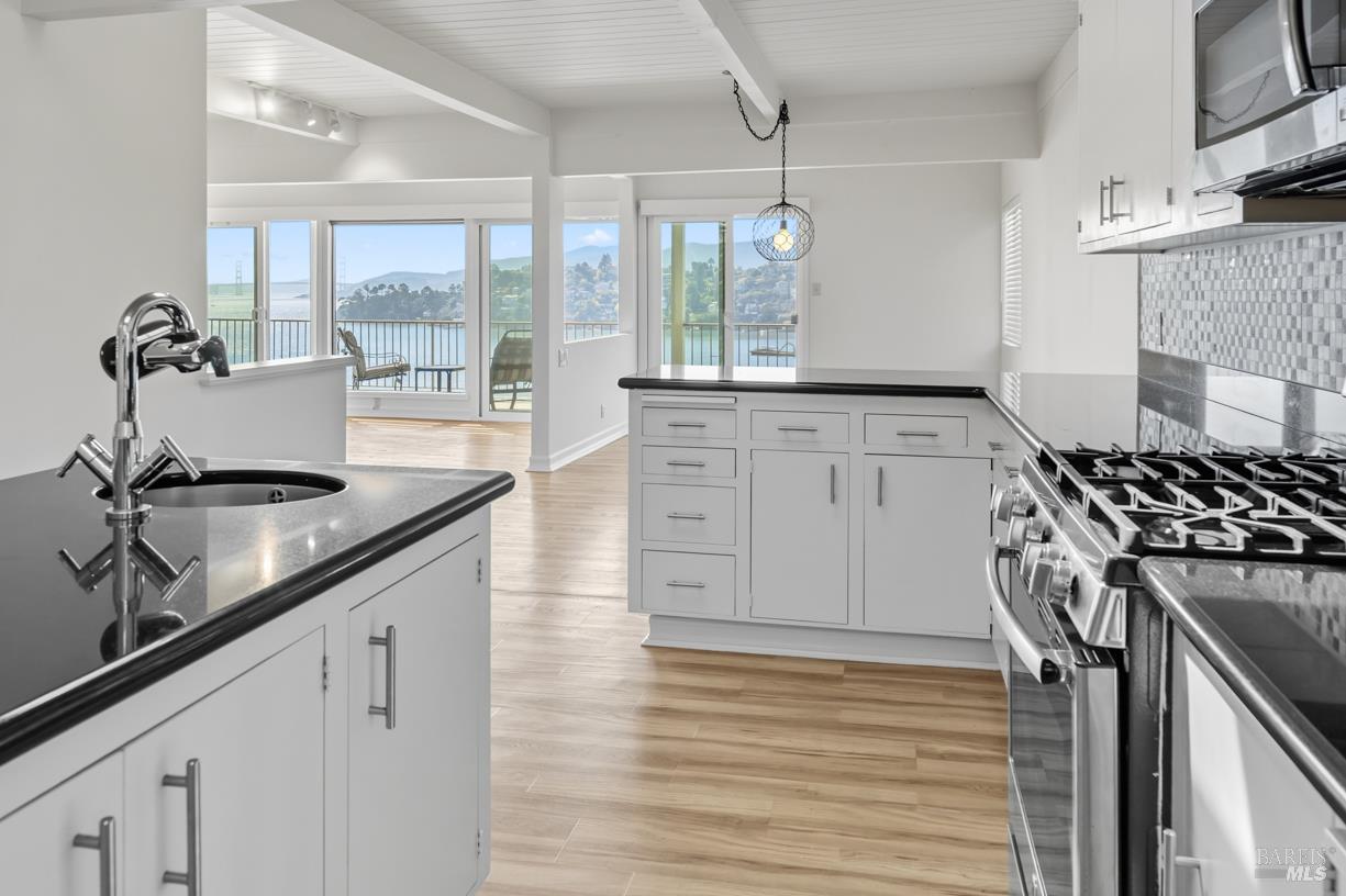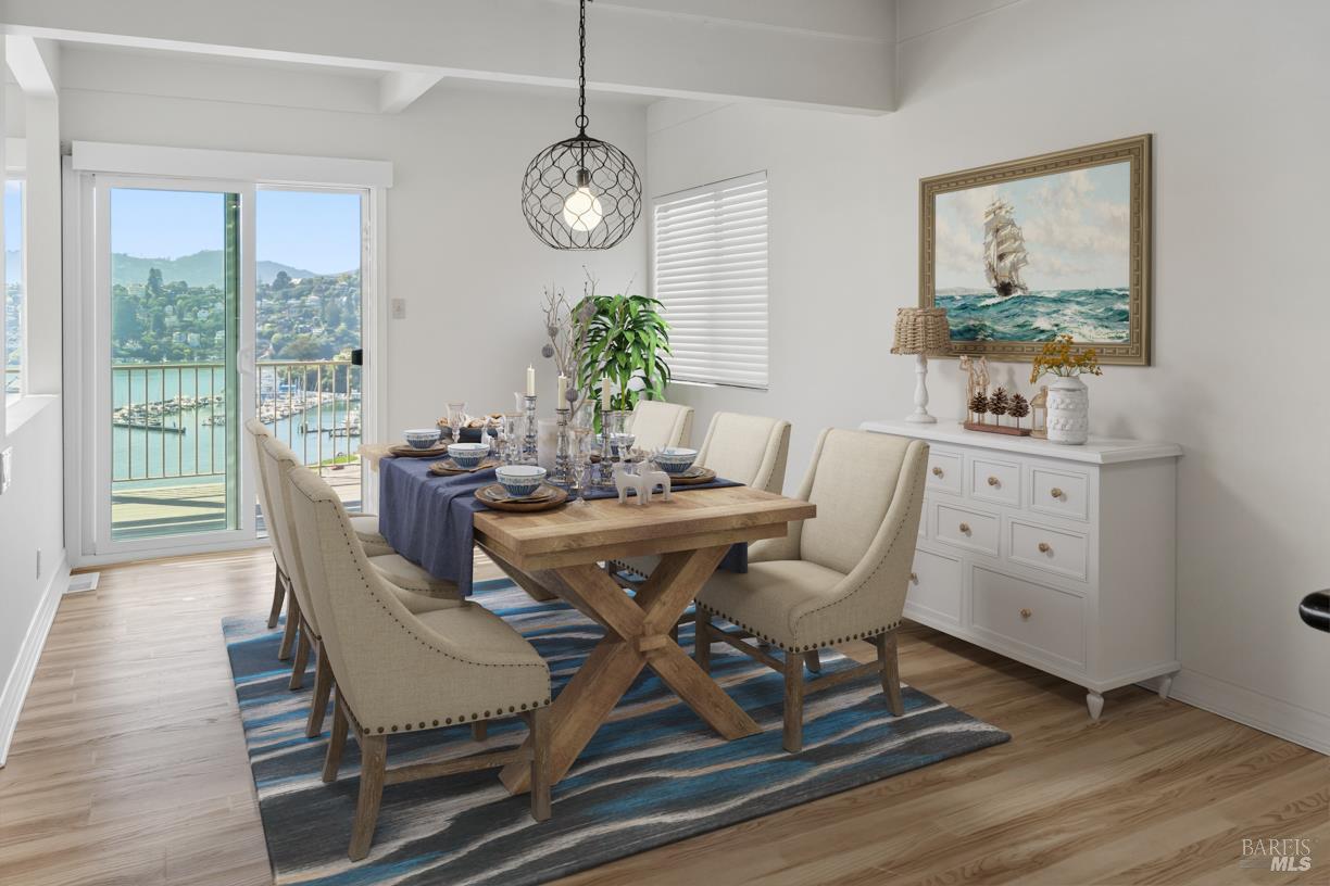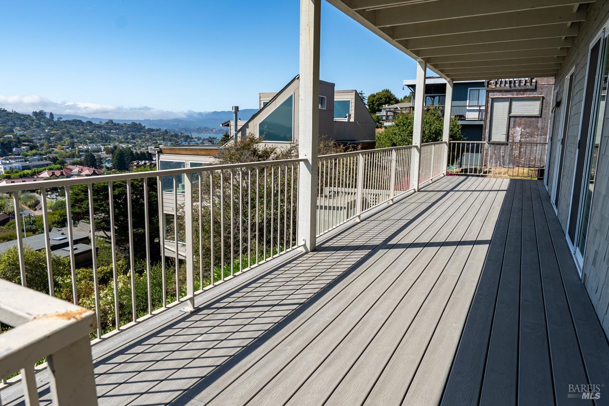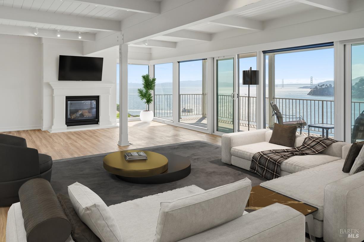 Enjoy stunning sunsets and some of the most prized vistas in all of Tiburon. Easy walk to town via the adjacent staircase on Centro West. This home offers a lovely open living plan with floor to ceiling windows on both levels. The upper (entry) floor includes the kitchen, living and dining rooms, as well the primary bedroom suite. The main rooms of the home and the three lower bedrooms open to an attached deck, offering plenty of outdoor living. There is a great room and office space on the lower level. Two car covered parking with adjacent storage areas.