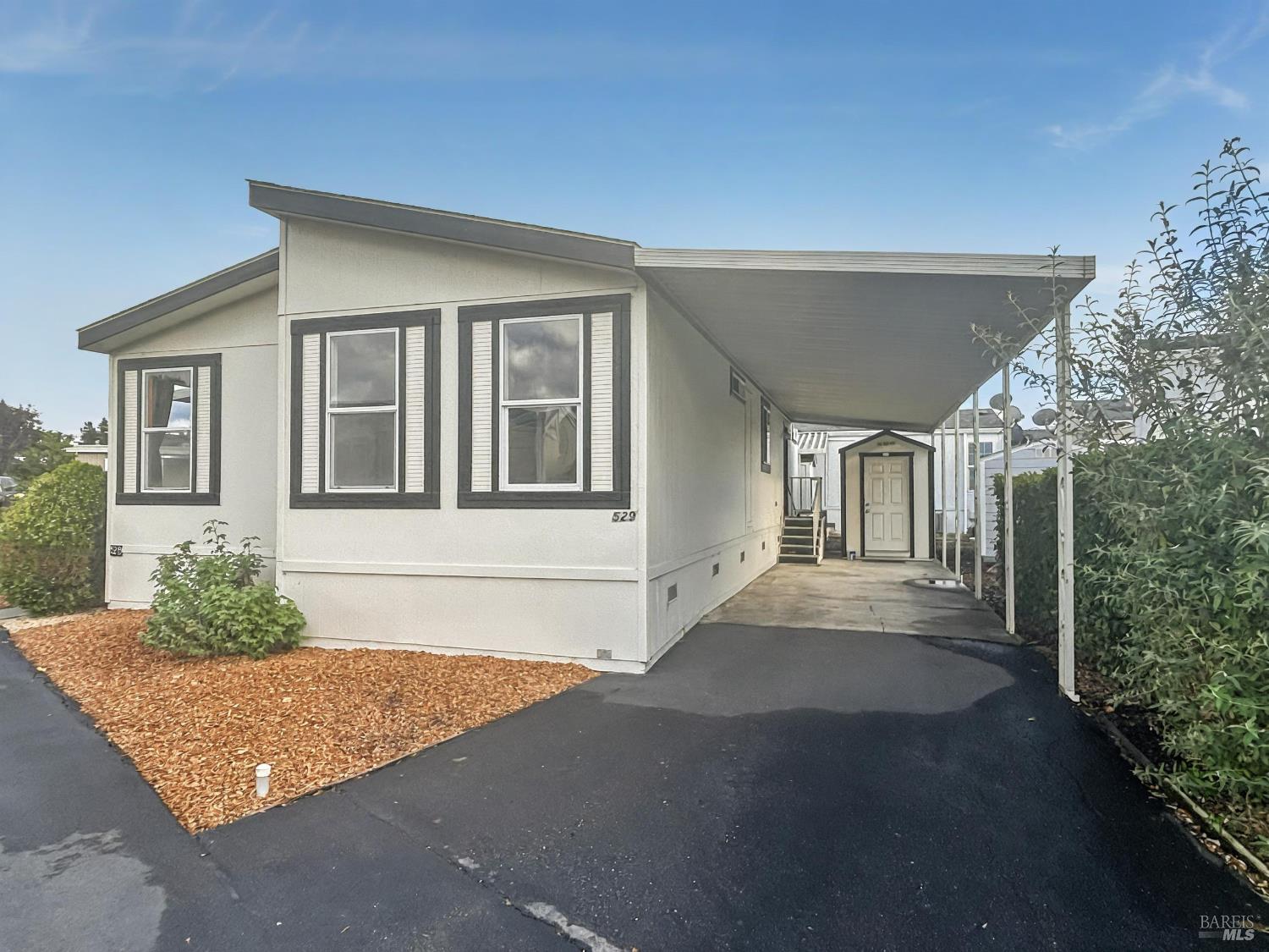Located in the highly desirable Cottages of Petaluma, this charming 2001 modular home sits on a prime corner lot near guest parking and open green space. The home features a bright and open floor plan, thoughtfully designed for comfort and convenience. Recently refreshed with new carpet, fresh interior paint, and updated landscaping, this beautifully maintained property is truly move-in ready. Enjoy a spacious living area, a welcoming front porch for relaxing, and a manicured landscaping. Additional highlights include vaulted ceiling, a covered carport for two vehicles, a spacious storage shed, paver patio. The community provides wonderful amenities including a clubhouse with activities, a swimming pool, and a BBQ area perfect for socializing and enjoying the Petaluma lifestyle. Ideally located close to shopping, restaurants, and hiking, biking and more, this home offers the perfect balance of comfort, convenience, and community living. Situated in a well-maintained 55+ community, 529 Rosewood Circle is ready to welcome its next owner.