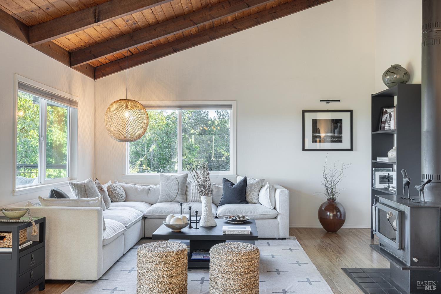 Perched on 6 peaceful acres, this 1,908 sq ft home captures the essence of Wine Country living with sweeping panoramas of rolling hills and the distant majesty of Mount Saint Helena. Hardwood floors, vaulted wood ceilings, and walls of windows create a warm and inviting atmosphere that connects seamlessly to the outdoors. The remodeled kitchen, new bathroom, and thoughtful updates throughout provide modern comfort while maintaining the home's natural charm. Multiple decks and paver patios invite gatherings or quiet moments in nature, while the spacious office offers an ideal setting for remote work or creative pursuits. Downstairs, the primary suite serves as a private retreat, complemented by an additional bedroom and flexible space that make the 2-bedroom, 2-bath layout live more like a 3-bedroom, 3-bath. The generous swim spa adds year-round enjoyment whether swimming against the jets or relaxing with the views. Gardeners paradise fruit trees peach orange lemon apple plum persimmon and concord grapes. Practical features include a new roof,inside laundry, and a detached two-car garage with EV charger. Tucked at the end of a private lane, this serene property offers both privacy and convenience a rare opportunity to live where every day begins and ends with awe-inspiring beauty.