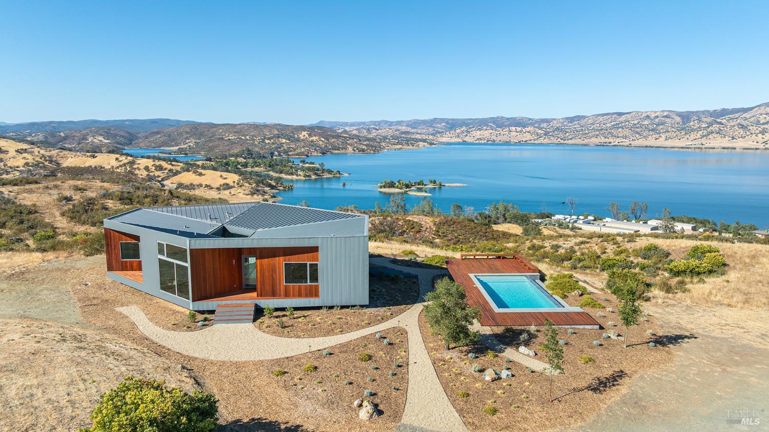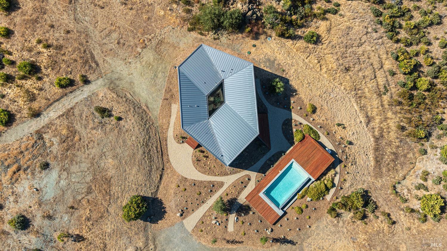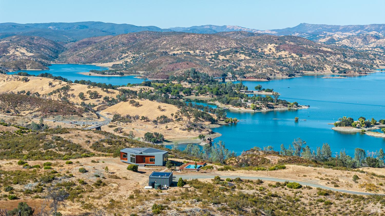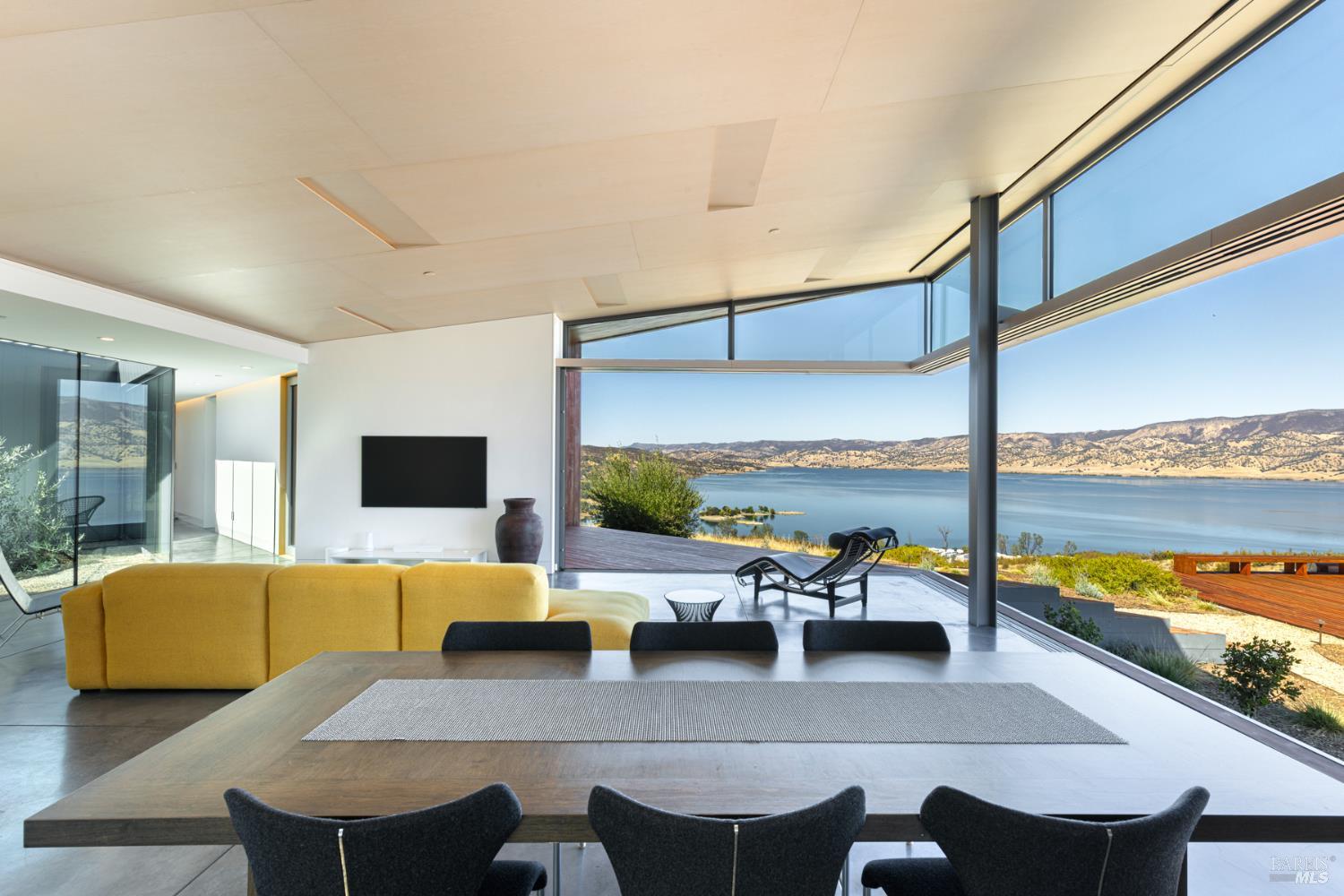 The Berryessa Lake House is a breathtaking fusion of architectural innovation and engineering precision. Situated on 95 acres in Napa County, this award-winning, IwamotoScott-designed residence is a steel & glass marvel offering panoramic views of Lake Berryessa & the surrounding valley landscape. The home's bold hexagonal design and cantilevered concrete foundation appear to hover above the natural terrain. Massive European glass doors slide seamlessly into wall pockets, opening the living area to the outdoors. While the exterior boasts a dramatic silhouette, the interior is thoughtfully designed with rectangular living areas, prioritizing comfort and functionality. The home includes three bedrooms, an office, two full baths, and a dramatic great room surrounding a central glass courtyard, a serene focal point that brings natural light deep into the home. The detached garage, with aircraft hangar doors, serves as the command center for the property's infrastructure. Designed to be fully self-sufficient with its own solar energy system, spring-fed water supply and commercial generator. The vast acreage offers several potential building sites for expansion. This one-of-a-kind property is ideal for a discerning buyer seeking privacy, sustainability, and impeccable modern design.