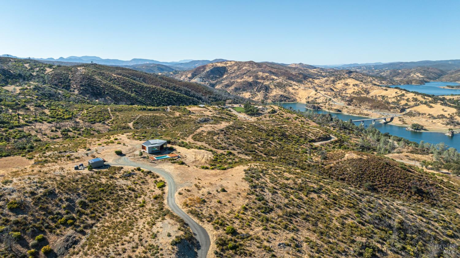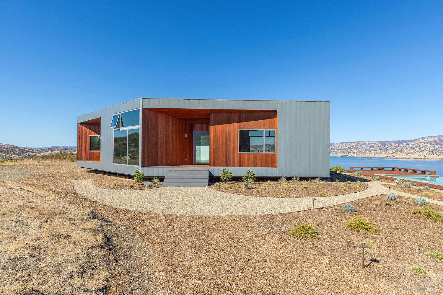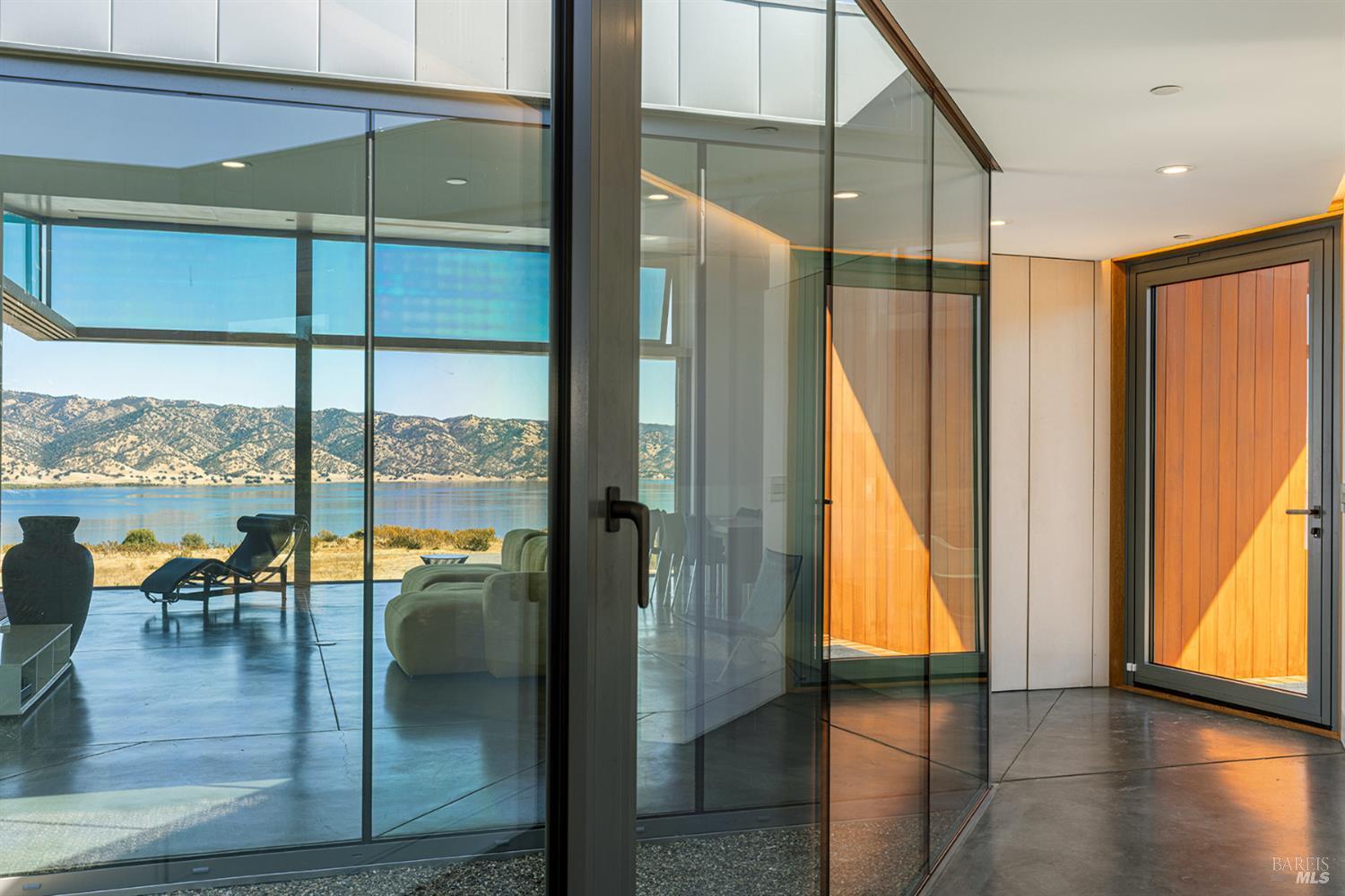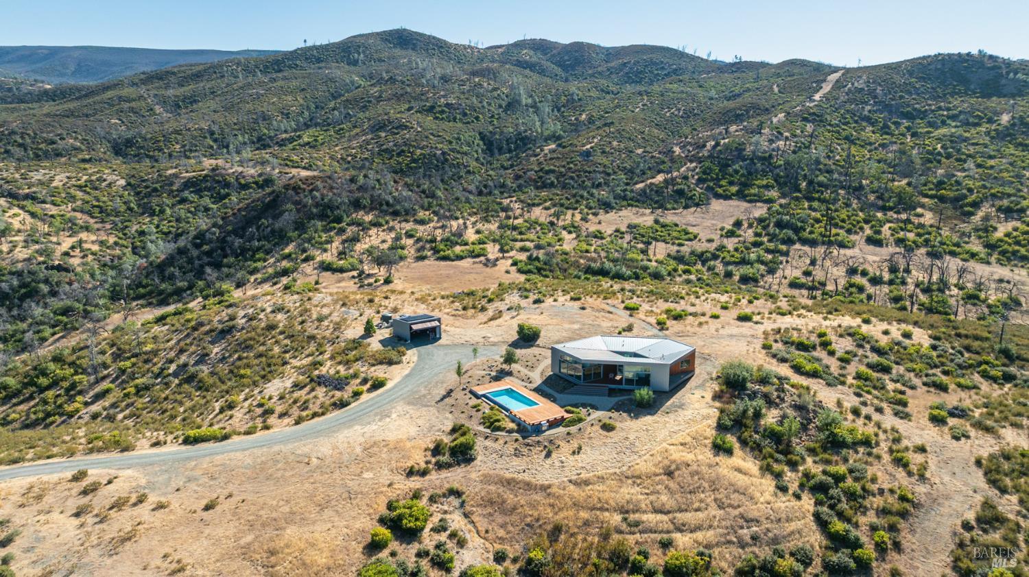The Berryessa Lake House is a breathtaking fusion of architectural innovation and engineering precision. Situated on 95 acres in Napa County, this award-winning, IwamotoScott-designed residence is a steel & glass marvel offering panoramic views of Lake Berryessa & the surrounding valley landscape. The home's bold hexagonal design and cantilevered concrete foundation appear to hover above the natural terrain. Massive European glass doors slide seamlessly into wall pockets, opening the living area to the outdoors. While the exterior boasts a dramatic silhouette, the interior is thoughtfully designed with rectangular living areas, prioritizing comfort and functionality. The home includes three bedrooms, an office, two full baths, and a dramatic great room surrounding a central glass courtyard, a serene focal point that brings natural light deep into the home. The detached garage, with aircraft hangar doors, serves as the command center for the property's infrastructure. Designed to be fully self-sufficient with its own solar energy system, spring-fed water supply and commercial generator. The vast acreage offers several potential building sites for expansion. This one-of-a-kind property is ideal for a discerning buyer seeking privacy, sustainability, and impeccable modern design.