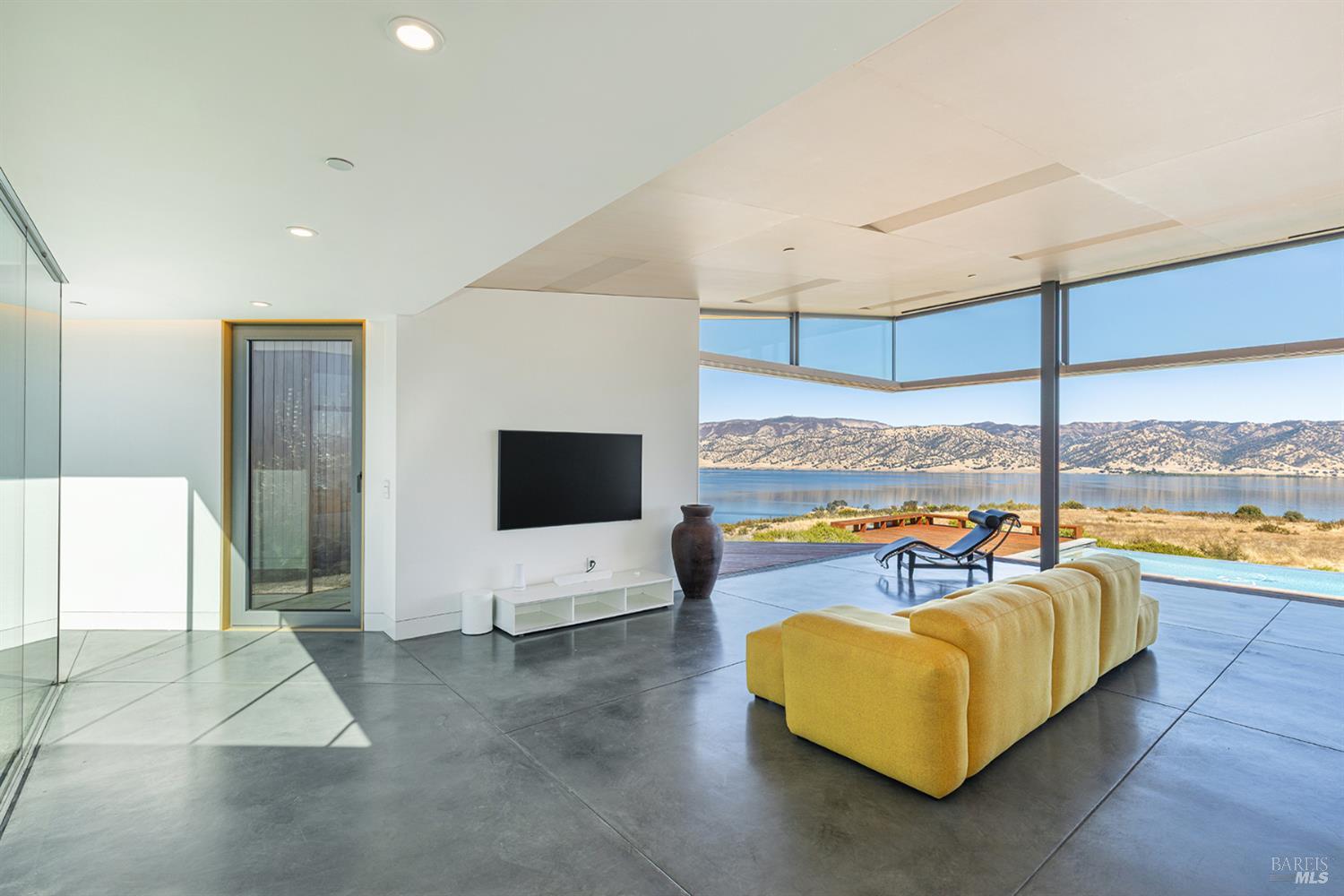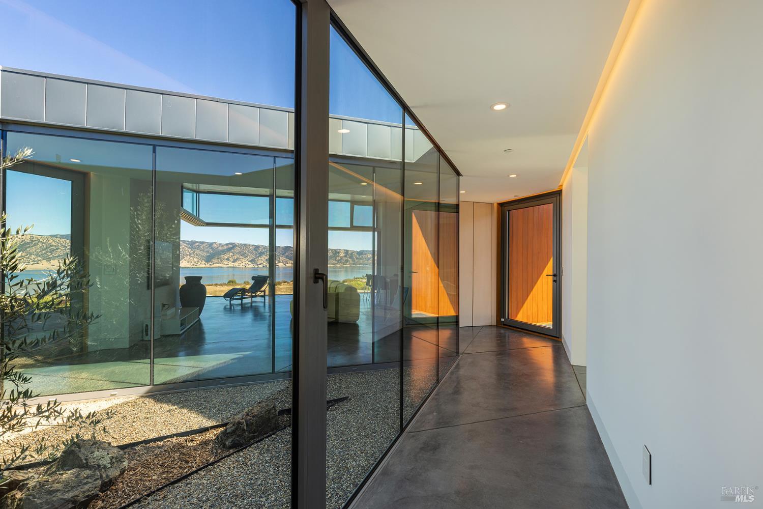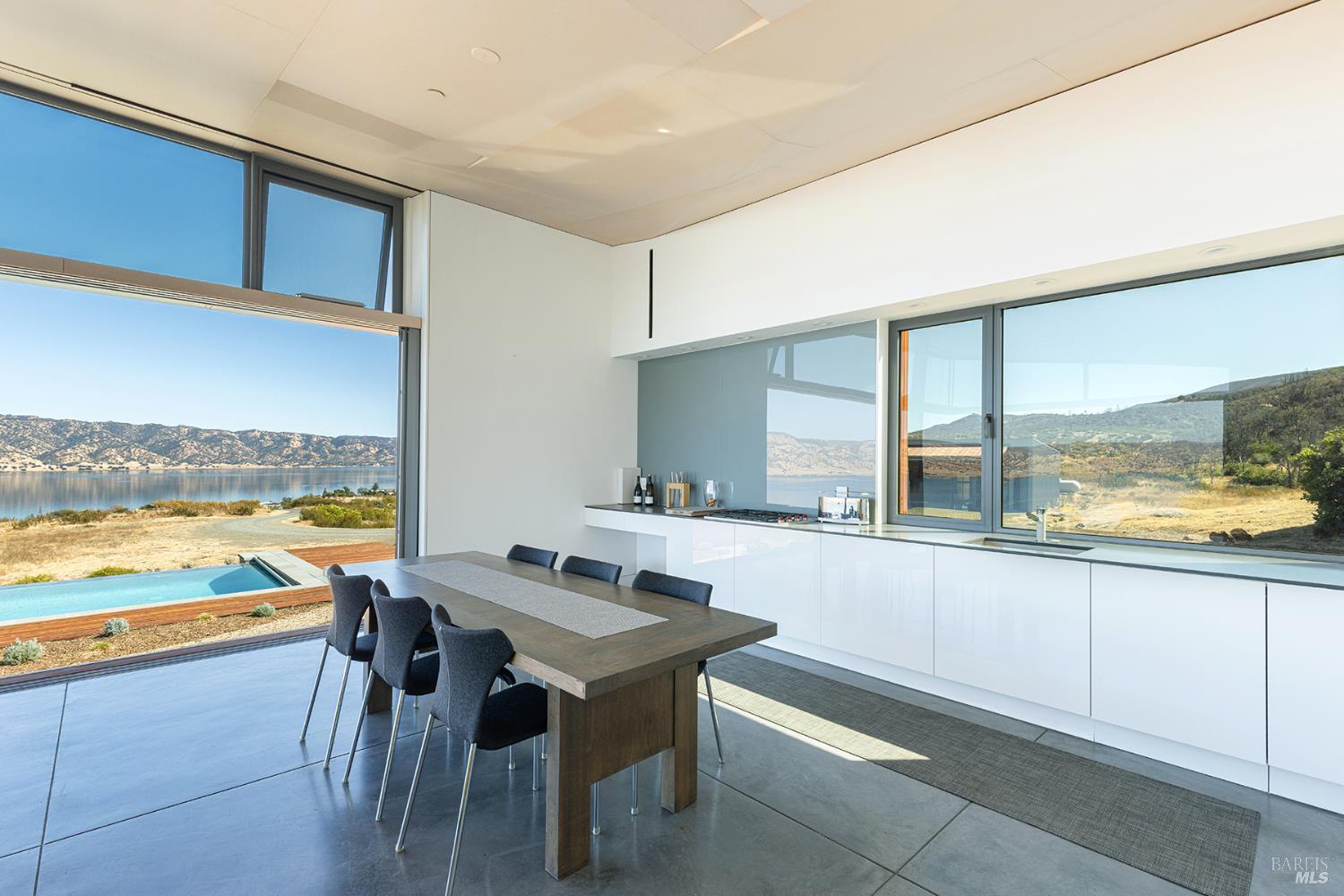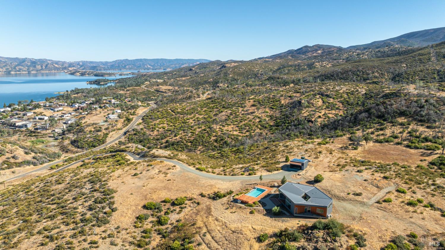 The Berryessa Lake House is a breathtaking fusion of architectural innovation and engineering precision. Situated on 95 acres in Napa County, this award-winning, IwamotoScott-designed residence is a steel & glass marvel offering panoramic views of Lake Berryessa & the surrounding valley landscape. The home's bold hexagonal design and cantilevered concrete foundation appear to hover above the natural terrain. Massive European glass doors slide seamlessly into wall pockets, opening the living area to the outdoors. While the exterior boasts a dramatic silhouette, the interior is thoughtfully designed with rectangular living areas, prioritizing comfort and functionality. The home includes three bedrooms, an office, two full baths, and a dramatic great room surrounding a central glass courtyard, a serene focal point that brings natural light deep into the home. The detached garage, with aircraft hangar doors, serves as the command center for the property's infrastructure. Designed to be fully self-sufficient with its own solar energy system, spring-fed water supply and commercial generator. The vast acreage offers several potential building sites for expansion. This one-of-a-kind property is ideal for a discerning buyer seeking privacy, sustainability, and impeccable modern design.