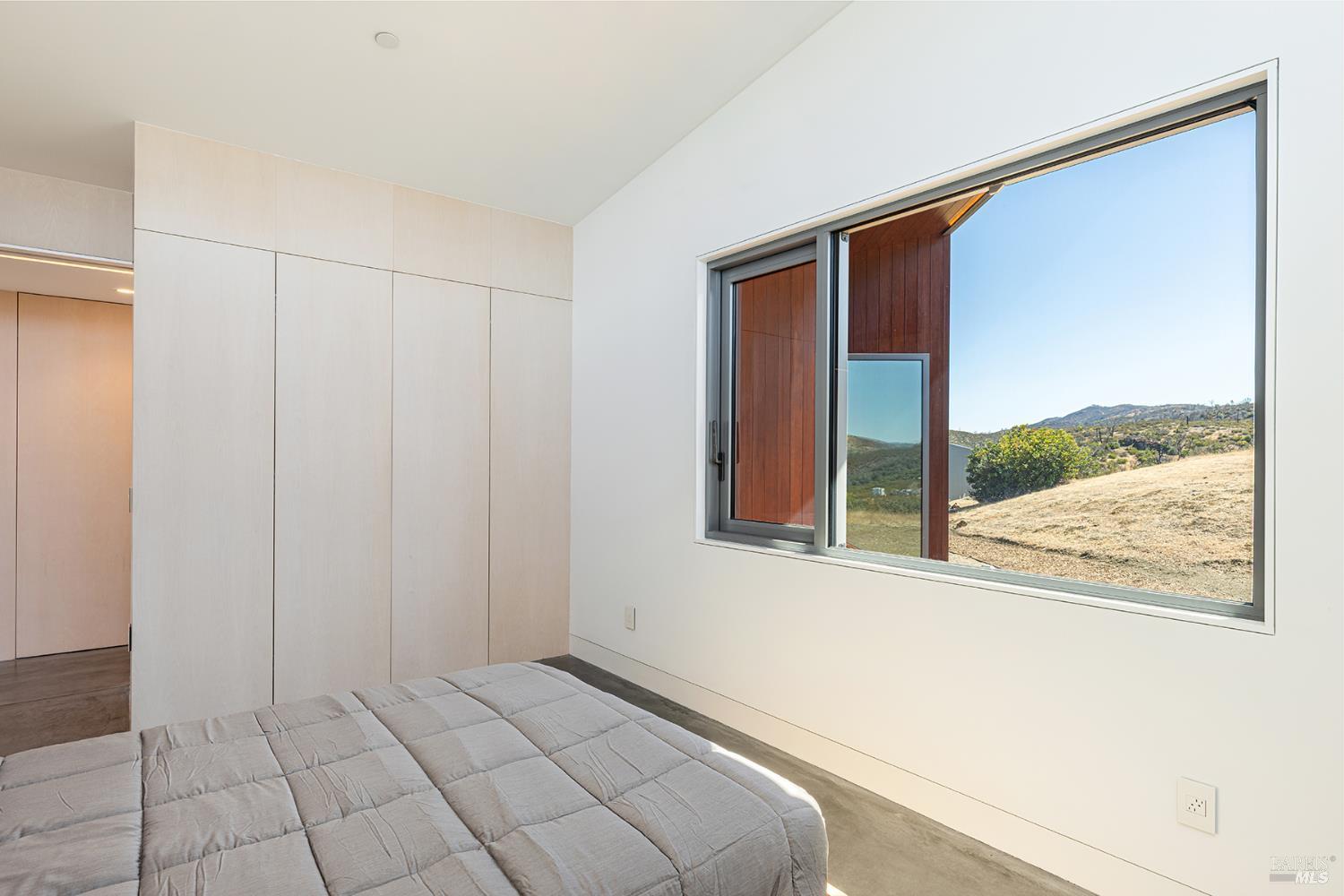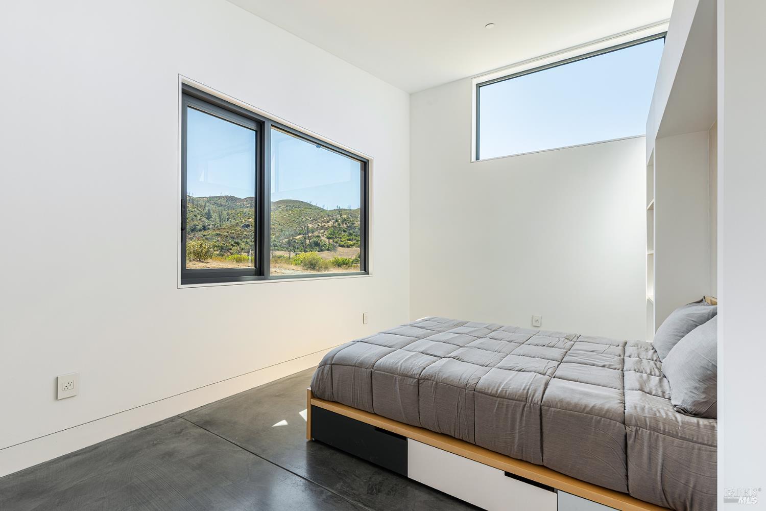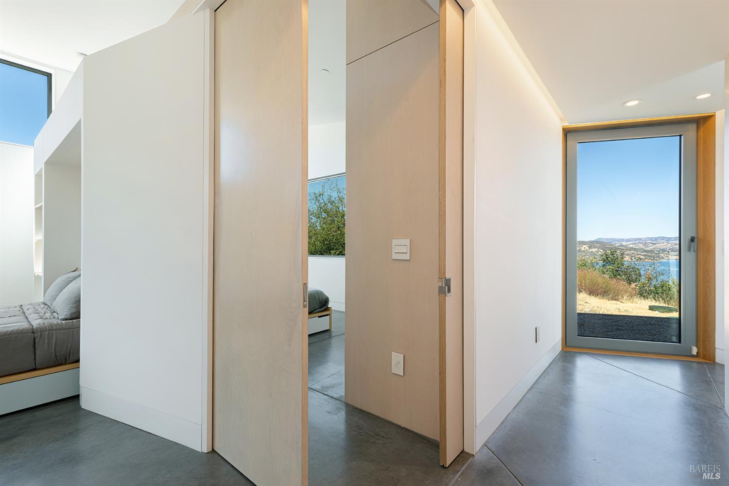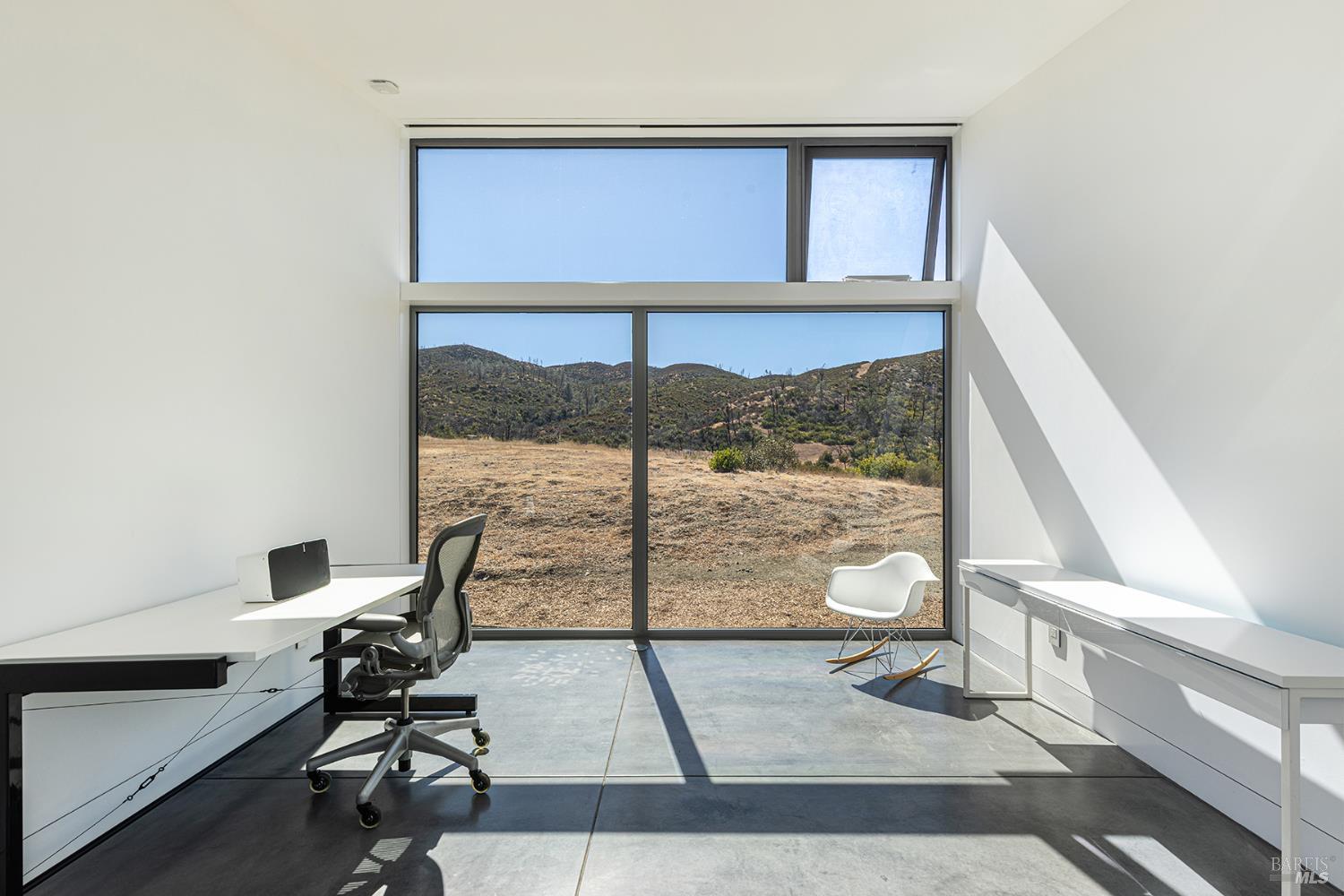 The Berryessa Lake House is a breathtaking fusion of architectural innovation and engineering precision. Situated on 95 acres in Napa County, this award-winning, IwamotoScott-designed residence is a steel & glass marvel offering panoramic views of Lake Berryessa & the surrounding valley landscape. The home's bold hexagonal design and cantilevered concrete foundation appear to hover above the natural terrain. Massive European glass doors slide seamlessly into wall pockets, opening the living area to the outdoors. While the exterior boasts a dramatic silhouette, the interior is thoughtfully designed with rectangular living areas, prioritizing comfort and functionality. The home includes three bedrooms, an office, two full baths, and a dramatic great room surrounding a central glass courtyard, a serene focal point that brings natural light deep into the home. The detached garage, with aircraft hangar doors, serves as the command center for the property's infrastructure. Designed to be fully self-sufficient with its own solar energy system, spring-fed water supply and commercial generator. The vast acreage offers several potential building sites for expansion. This one-of-a-kind property is ideal for a discerning buyer seeking privacy, sustainability, and impeccable modern design.