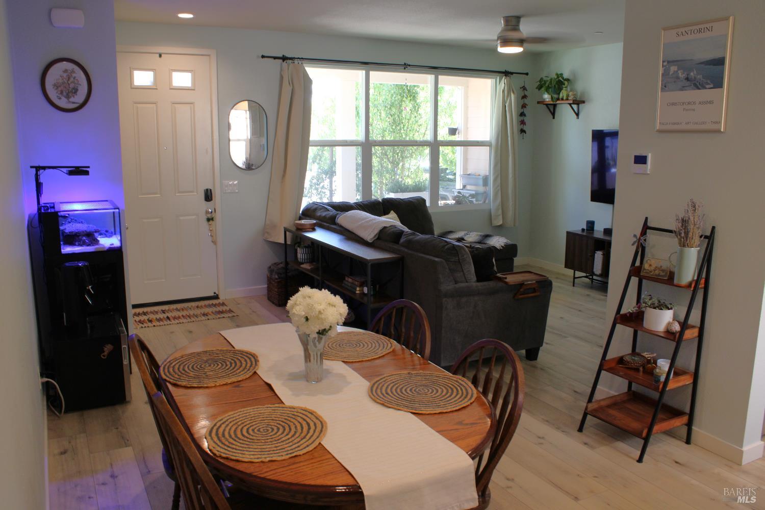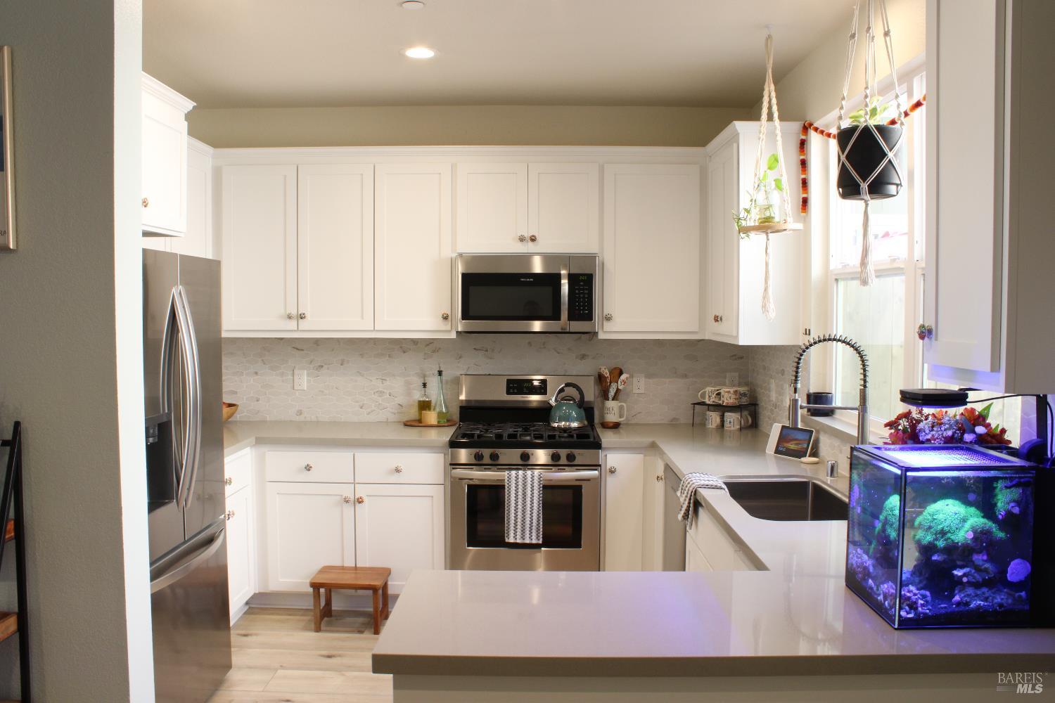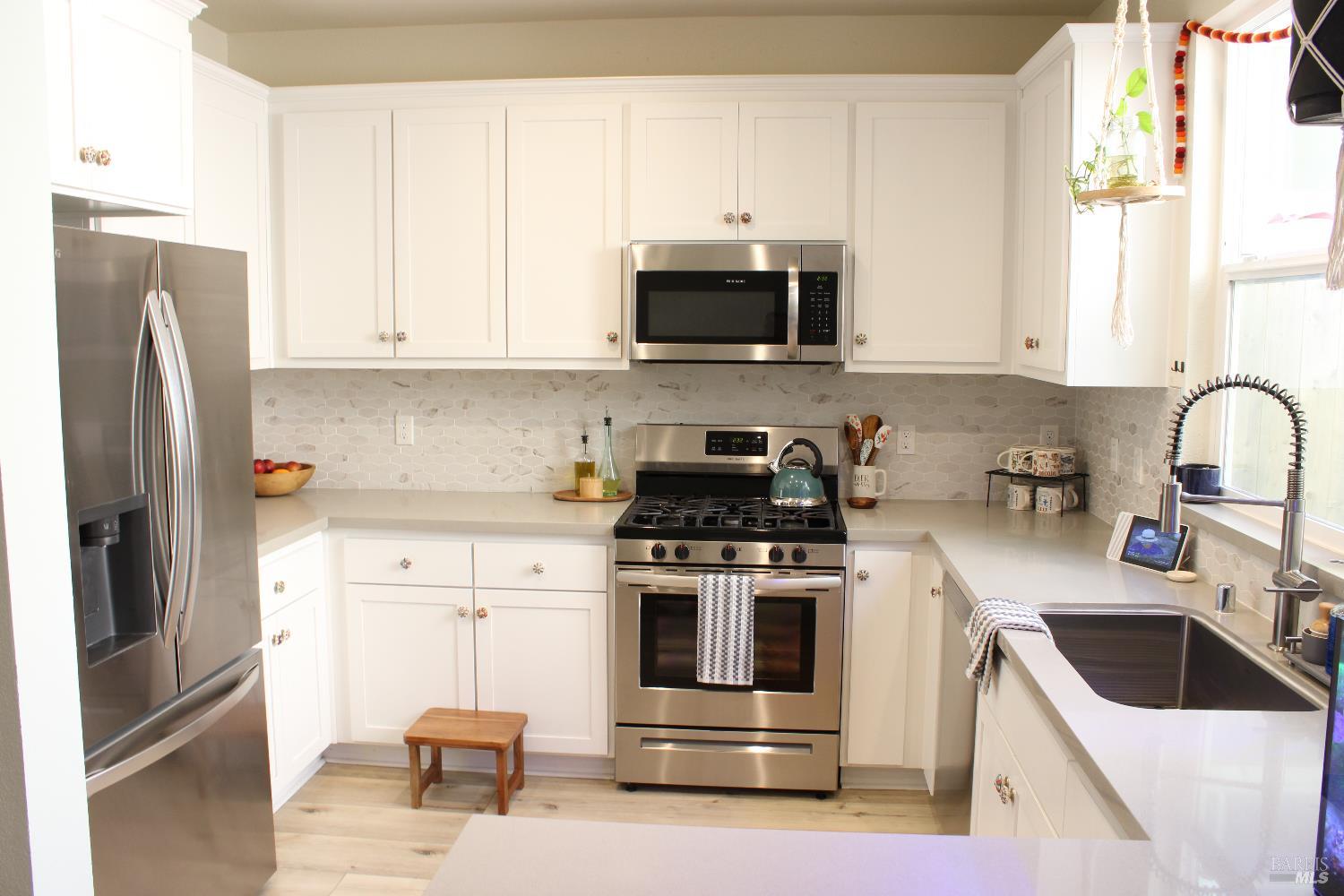 This stylish and energy-efficient 4-bedroom, 2.5 bath Santa Rosa home was built in 2021 and features luxury vinyl plank flooring, a modern kitchen with quartz countertops, designer tile backsplash, shaker style cabinetry and stainless-steel appliances. The spacious primary suite includes coved ceiling with ceiling fan, ensuite bathroom, and ample closet space. Other features include 3-zone heating/cooling, Ceiling fans, and a cozy patio style back yard perfect for barbecues and entertaining, direct access to an oversized 1-car garage with storage, and room for two additional cars to park in the driveway. Conveniently located near schools, parks, shopping centers, and commuter routes.