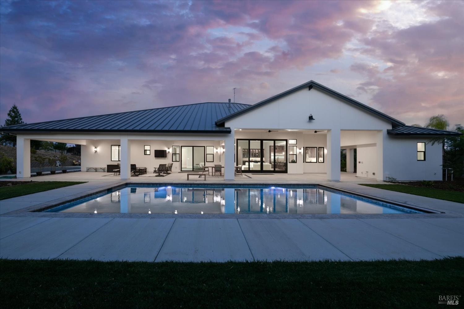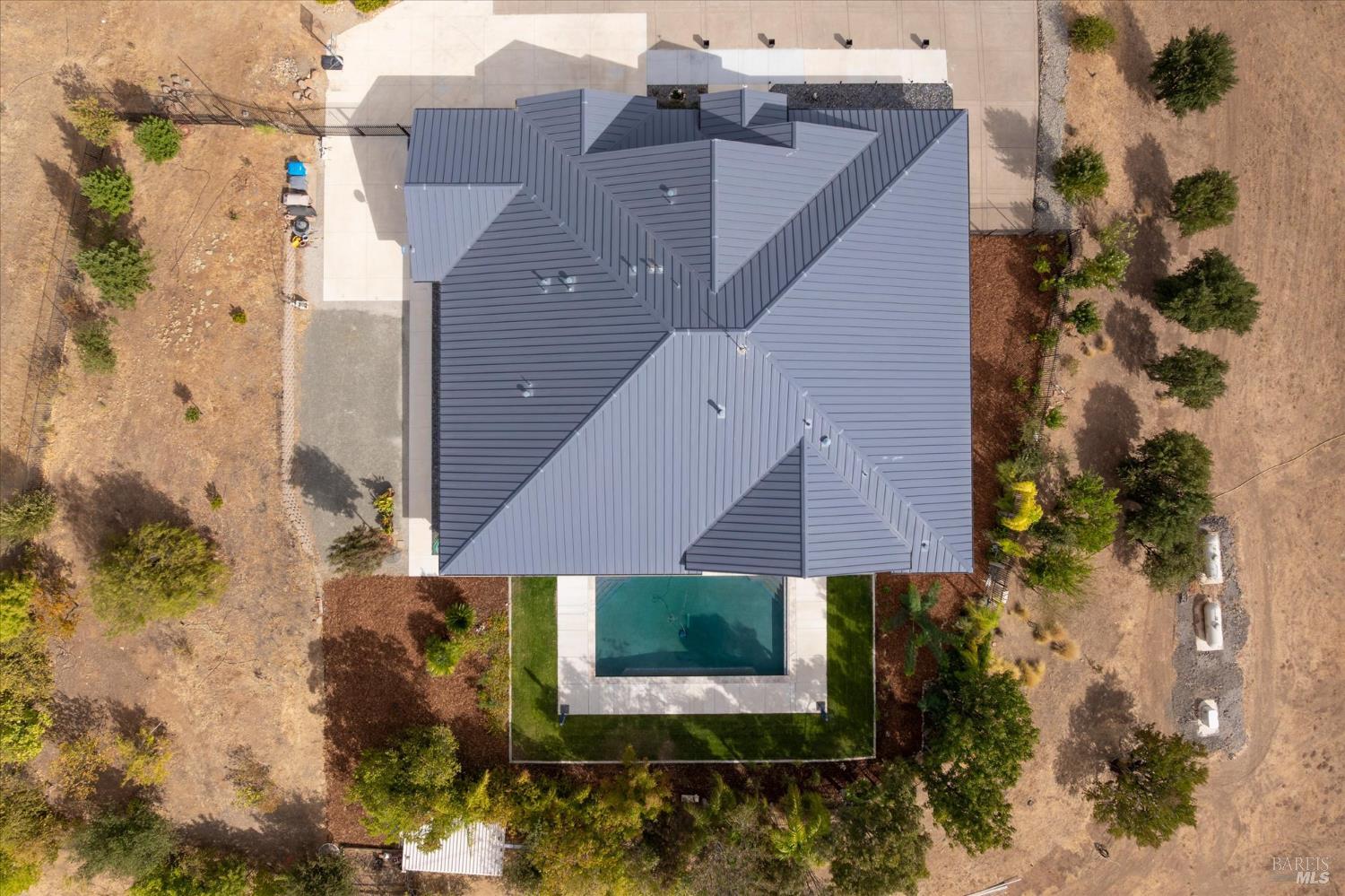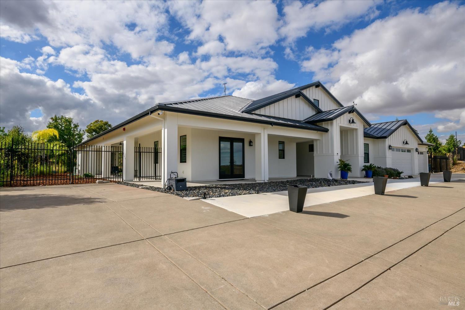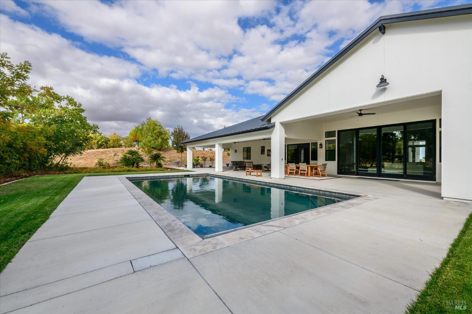 Welcome to your dream retreat, a stunning 4,098 sq ft modern masterpiece completed in 2023, perfectly positioned on a private 5-acre parcel designed for both comfort and resilience. This 5-bedroom, 5 1/2-bathroom home was built to impress, combining elegant design with high-end finishes and WUI-compliant fire-resistant construction, offering peace of mind in today's climate. Step inside to soaring 10- and 12-foot ceilings, expansive open living areas, and a seamless indoor-outdoor flow that defines luxury living. The heart of the home is the gourmet kitchen and spacious great room, opening out to an incredible 2,669 sq ft of covered patios ideal for year-round entertaining or quiet evenings under the stars. Outside, enjoy a custom sports pool built for fun and fitness, surrounded by sweeping views and open skies. The estate also features a versatile shop with three 14-ft roll-up doors, perfect for RVs, boats, or hobbyists needing serious workspace. Every detail has been thoughtfully crafted for modern living with the spacious layout that effortlessly blends luxury and functionality. Owned 15KW AC 60 Solar panel Nem-2 system and a 24,000KW Generac generator. Annual net ZERO cost for electricity. Located in the RNVWD public water district just a few miles outside of Vacaville.