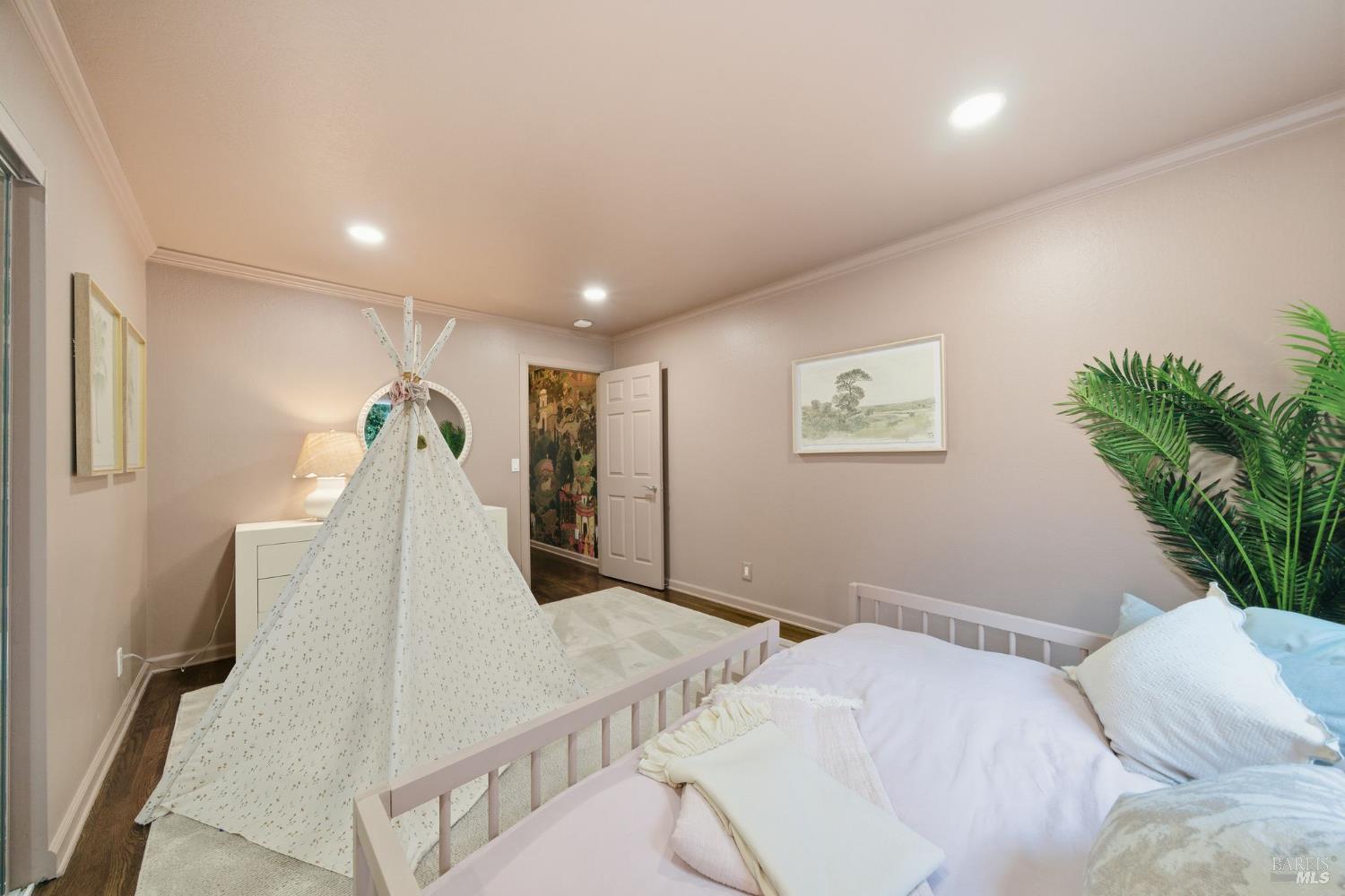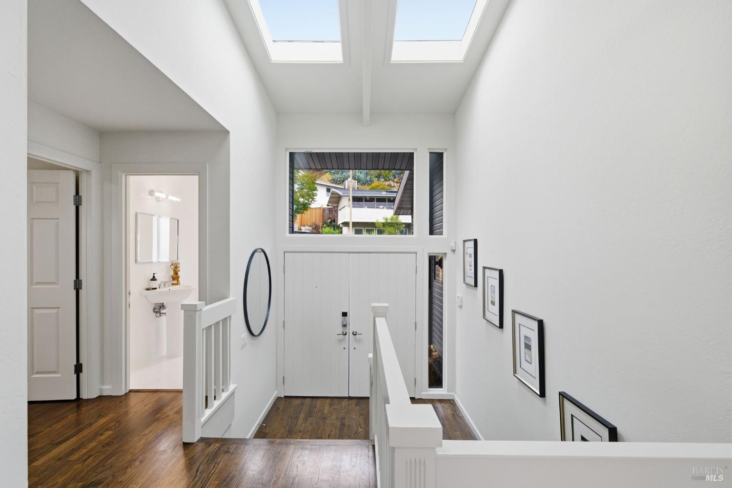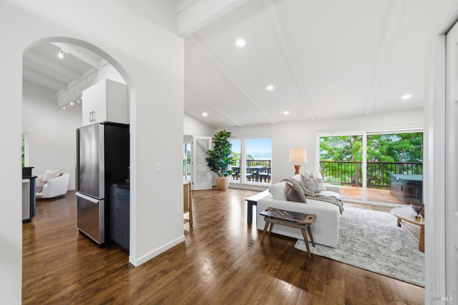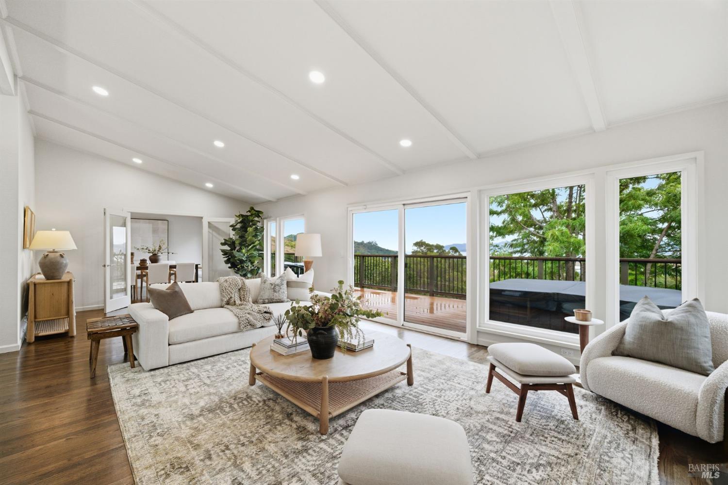 Welcome to 370 Via La Cumbre, Greenbrae. This bright, contemporary home offers 2,712 sq. ft. with sweeping Bay views and a flexible floor plan. The main level features a sun-filled living and dining room with vaulted ceilings and a wall of windows, a chef's kitchen with skylights and stainless steel appliances, a view deck with spa,and a spacious primary suite with a walk-in closet, an ensuite bath, and a powder room. Downstairs includes a large family room with built-ins, three bedrooms, a full bath, laundry, and access to the level yard with turf, a putting green, a cabana, and fruit trees. Additional highlights: Tesla solar roof with Powerwall + charger, oversized 2-car garage, and private gated courtyard. Minutes to Bon Air shops, Larkspur Ferry, Hwy 101, and Bacich/Kentfield schools.