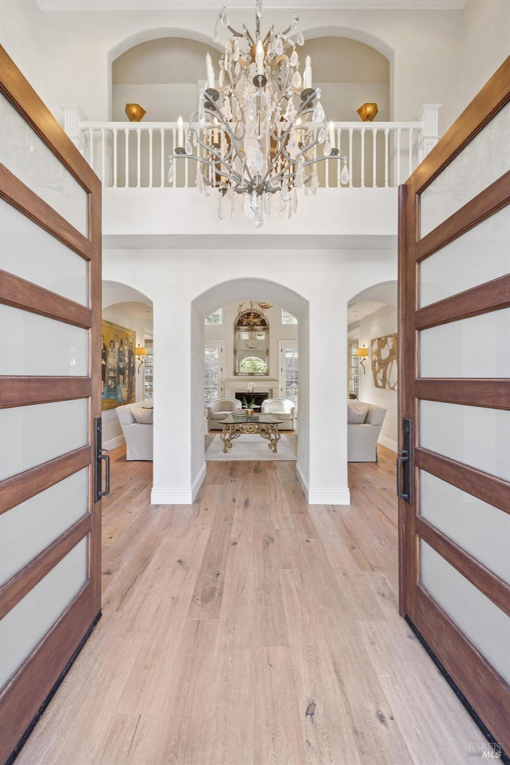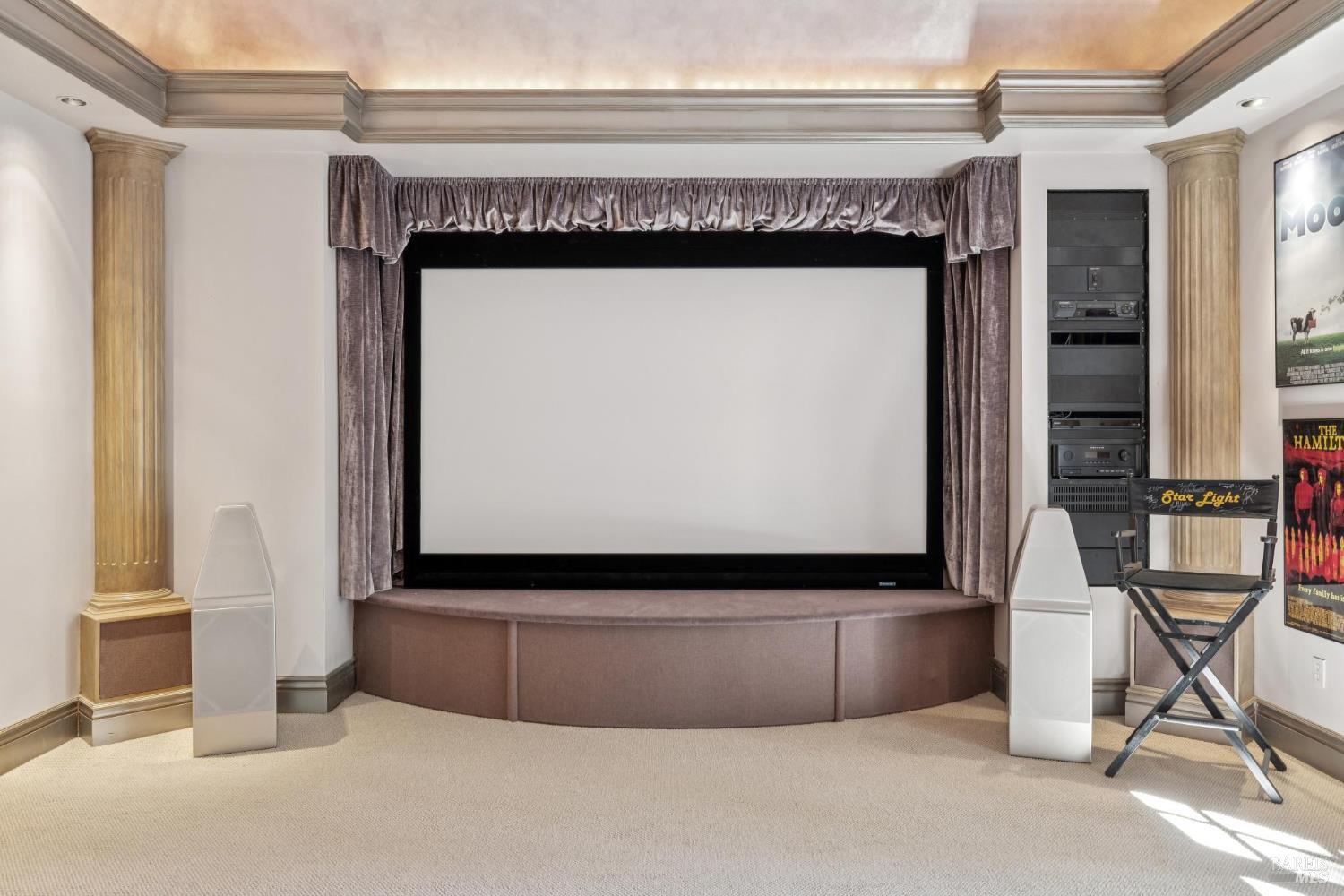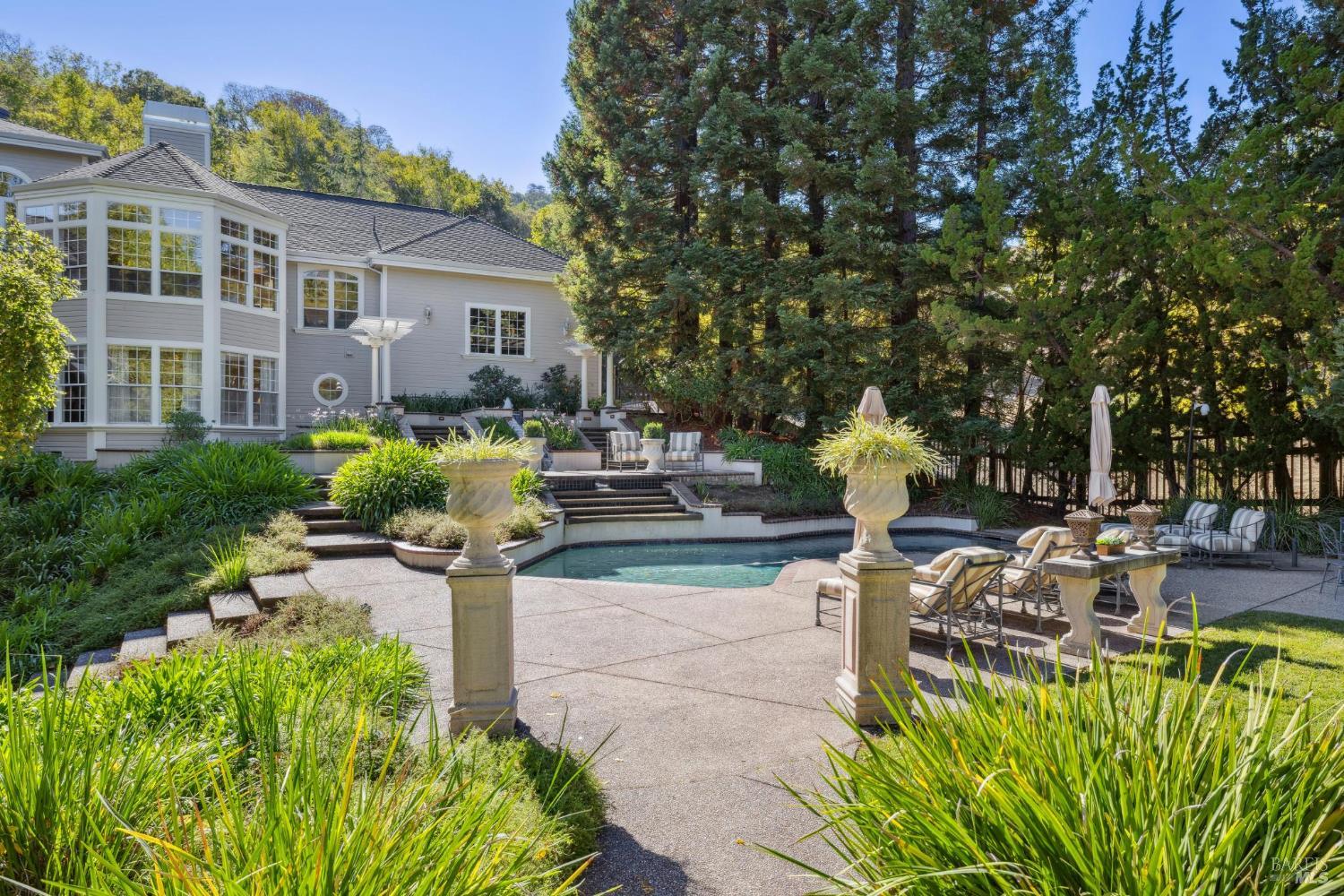 Located on coveted Vineyard Road, this gated 2.1 acre estate combines privacy, refined design, resort-style living, and equestrian amenities in one of Marin's premier settings. Designed by Martin Kobus and extensively renovated, the expansive 6,415 sq. ft. residence features DuChteau wide-plank wood floors, integral plaster walls, soaring ceilings, and abundant natural light. A dramatic double-height living room anchors the home, complemented by a state-of-the-art theater, custom chef's kitchen and wet bar open to the family room, elegant dining room, home office, four fireplaces, and multiple French doors opening to the outdoors. The main-level primary suite includes a spa-like limestone and Calacatta marble bath with Hansgrohe fixtures. Each of the guest bedrooms enjoys its own bath. Outdoors, the property unfolds like a private retreat - pool, fountains, BBQ gazebo, level lawns, travertine terrace, hot tub, basketball half court, and direct trail access for hiking and horseback riding. The lighted corral and stall/tack area will delight equestrians. Modern amenities include a newer roof, dual-zone heat/AC, generators, security system, and 3-car garage. Experience an elevated lifestyle connected to nature and community in this exquisite equestrian estate.
