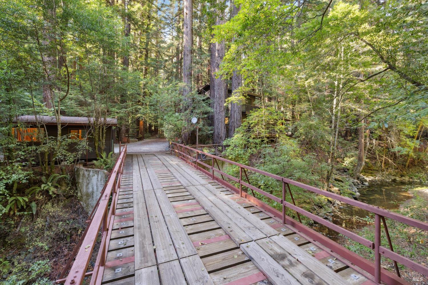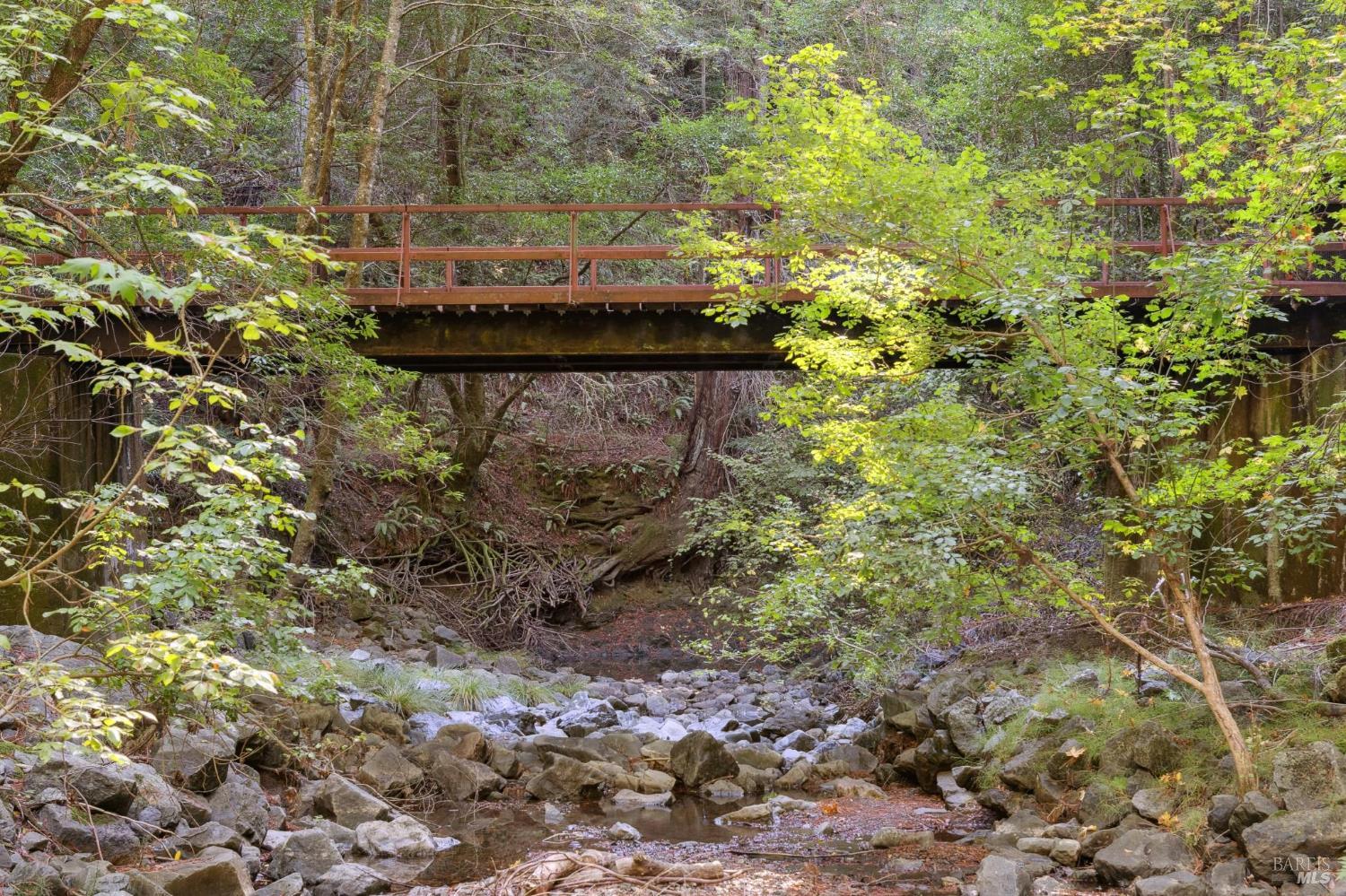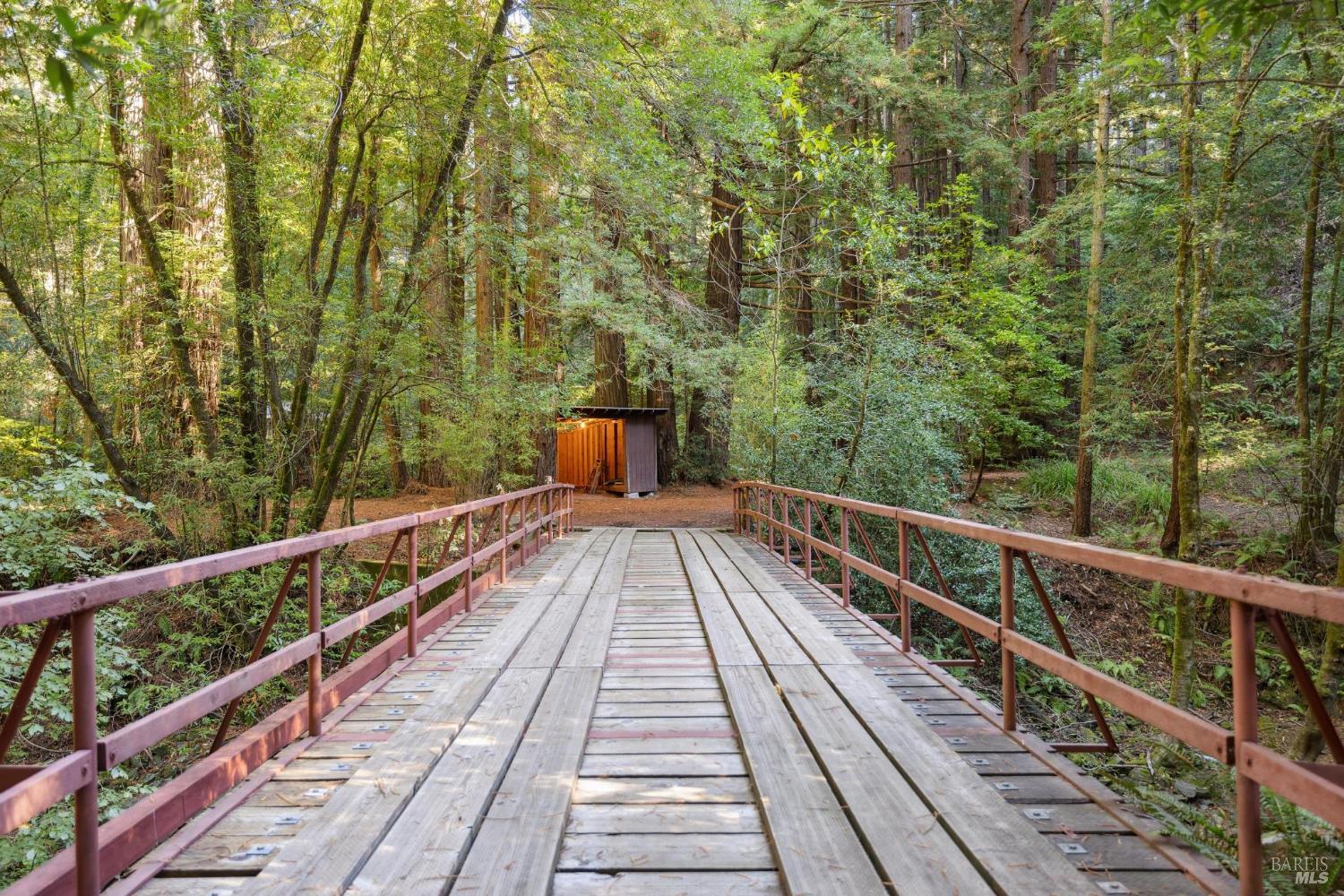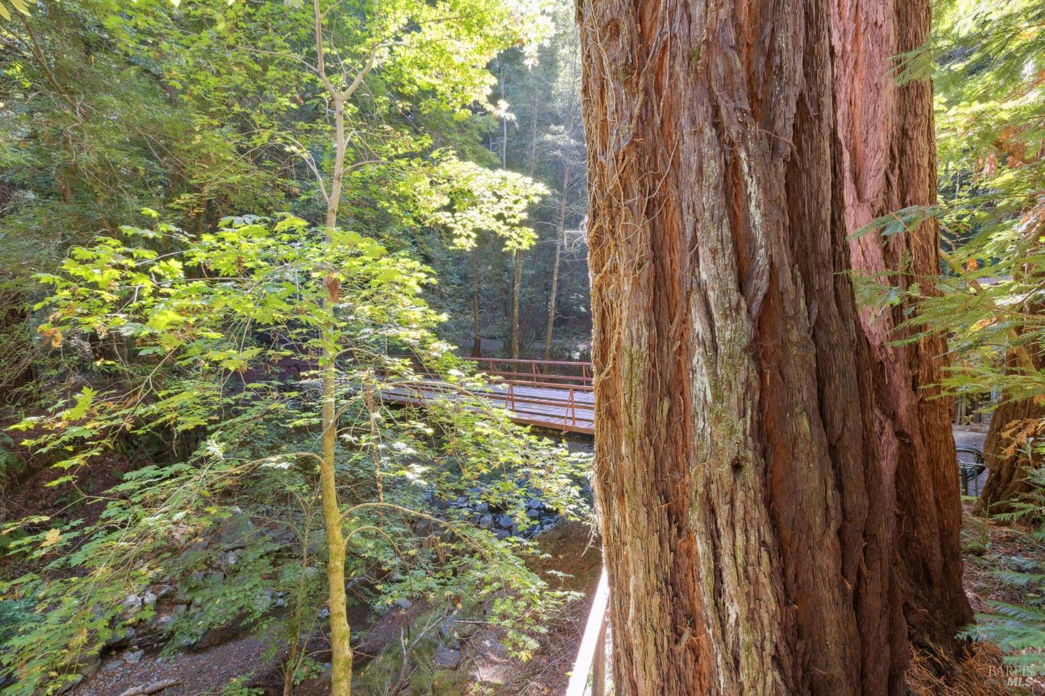 Surrounded by towering redwoods, this architecturally distinct home captures the essence of tranquility and design in a natural setting. Resting on approximately 9.8 acres with a year-round creek, this private retreat combines timeless mid-century style with the serenity of Marin's redwood forest. The two-story residence offers 2,047 sq ft of living space and an additional 1,297 sq ft of versatile structures including a detached workshop, cabin, and shed. Vaulted open-beam ceilings, warm wood paneling, and expansive windows create a stunning focal point in the main living area where natural light floods the space and glass doors open to an inviting wraparound deck. The kitchen offers custom wood cabinetry, tiled counters, and direct deck access for seamless indoor-outdoor living. Upstairs, the primary suite features a private balcony overlooking the forest, while additional bedrooms and an office provide flexible living or workspace options. The property includes a private bridge over the creek, a workshop with skylights, and multiple trails that weave through the redwoods. Offering both peace and inspiration, this nearly 9.8-acre sanctuary feels worlds away yet remains just minutes from Nicasio, West Marin, and Lucas Valley conveniences.