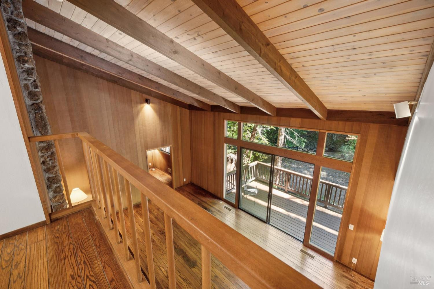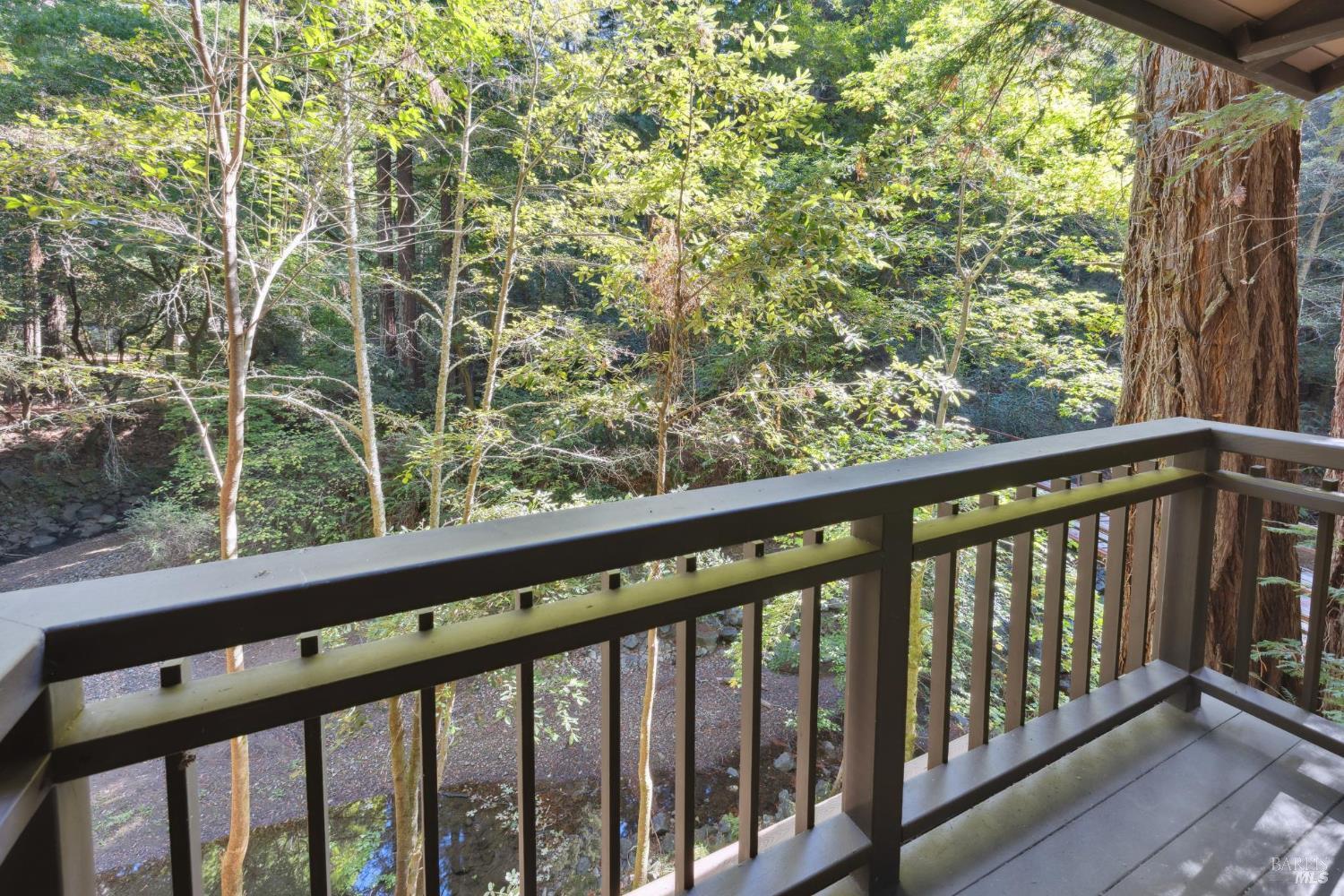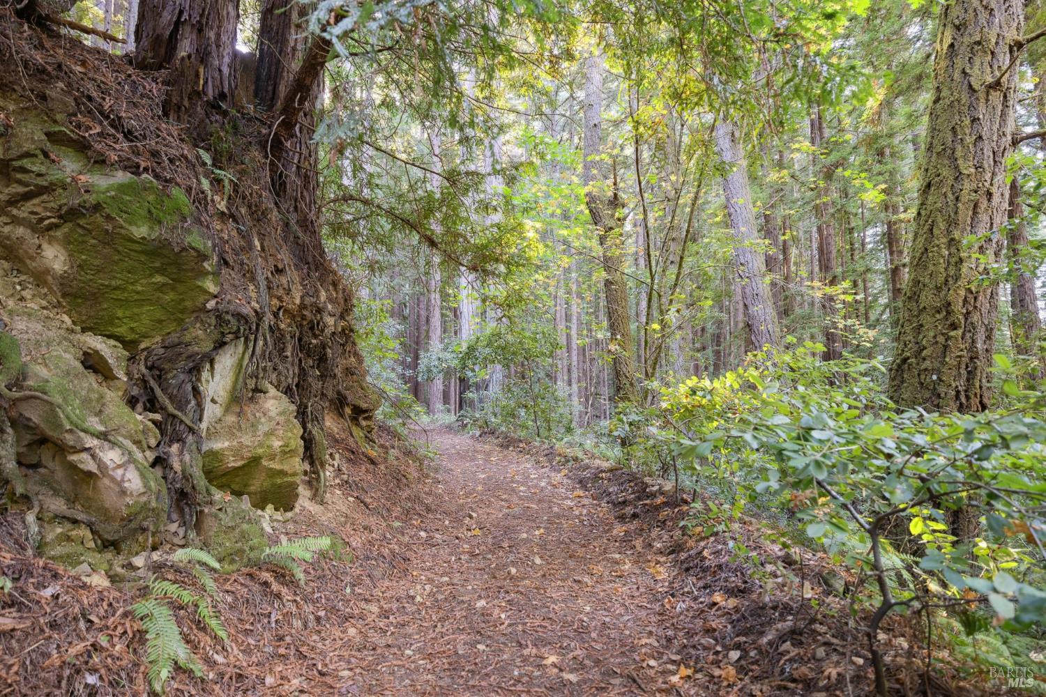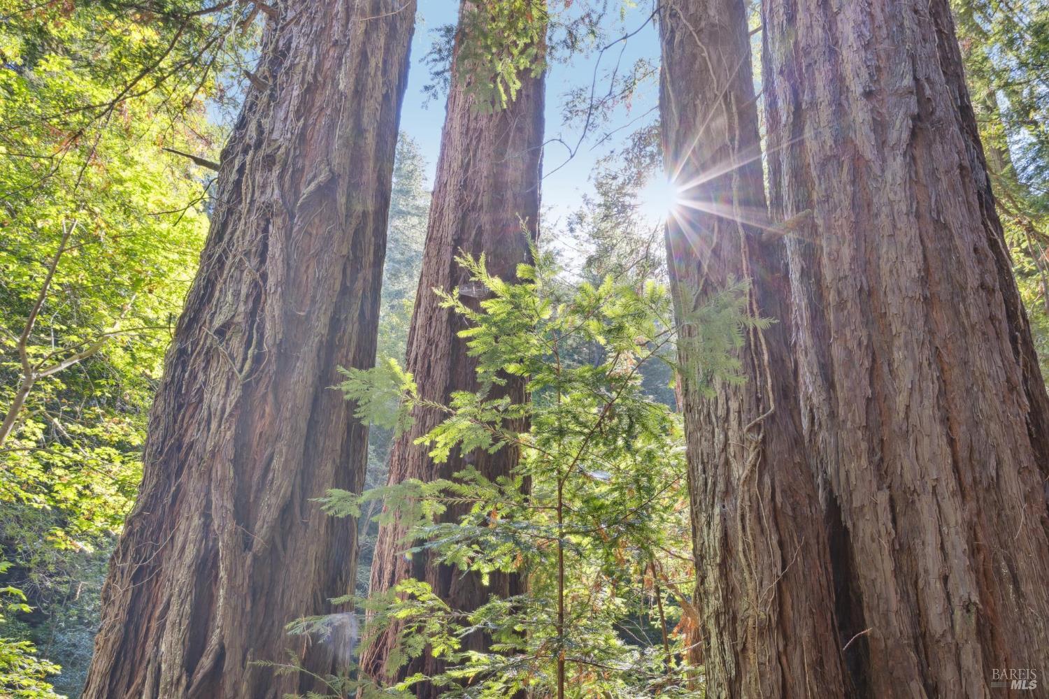 Surrounded by towering redwoods, this architecturally distinct home captures the essence of tranquility and design in a natural setting. Resting on approximately 9.8 acres with a year-round creek, this private retreat combines timeless mid-century style with the serenity of Marin's redwood forest. The two-story residence offers 2,047 sq ft of living space and an additional 1,297 sq ft of versatile structures including a detached workshop, cabin, and shed. Vaulted open-beam ceilings, warm wood paneling, and expansive windows create a stunning focal point in the main living area where natural light floods the space and glass doors open to an inviting wraparound deck. The kitchen offers custom wood cabinetry, tiled counters, and direct deck access for seamless indoor-outdoor living. Upstairs, the primary suite features a private balcony overlooking the forest, while additional bedrooms and an office provide flexible living or workspace options. The property includes a private bridge over the creek, a workshop with skylights, and multiple trails that weave through the redwoods. Offering both peace and inspiration, this nearly 9.8-acre sanctuary feels worlds away yet remains just minutes from Nicasio, West Marin, and Lucas Valley conveniences.